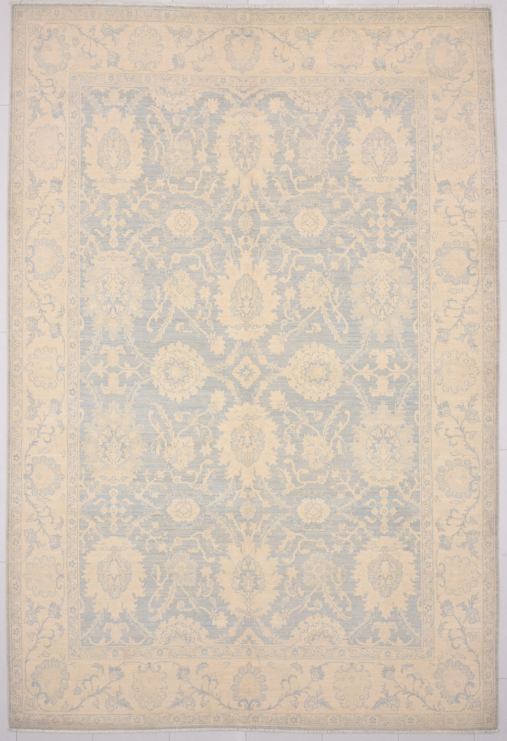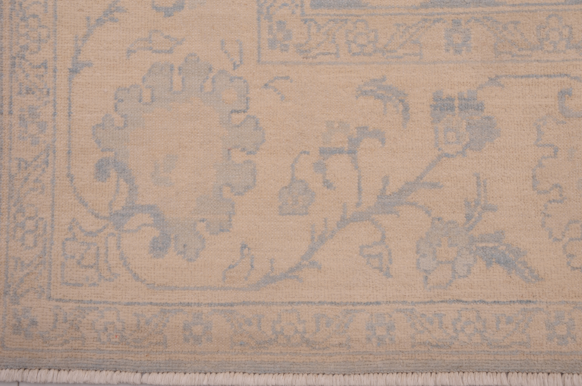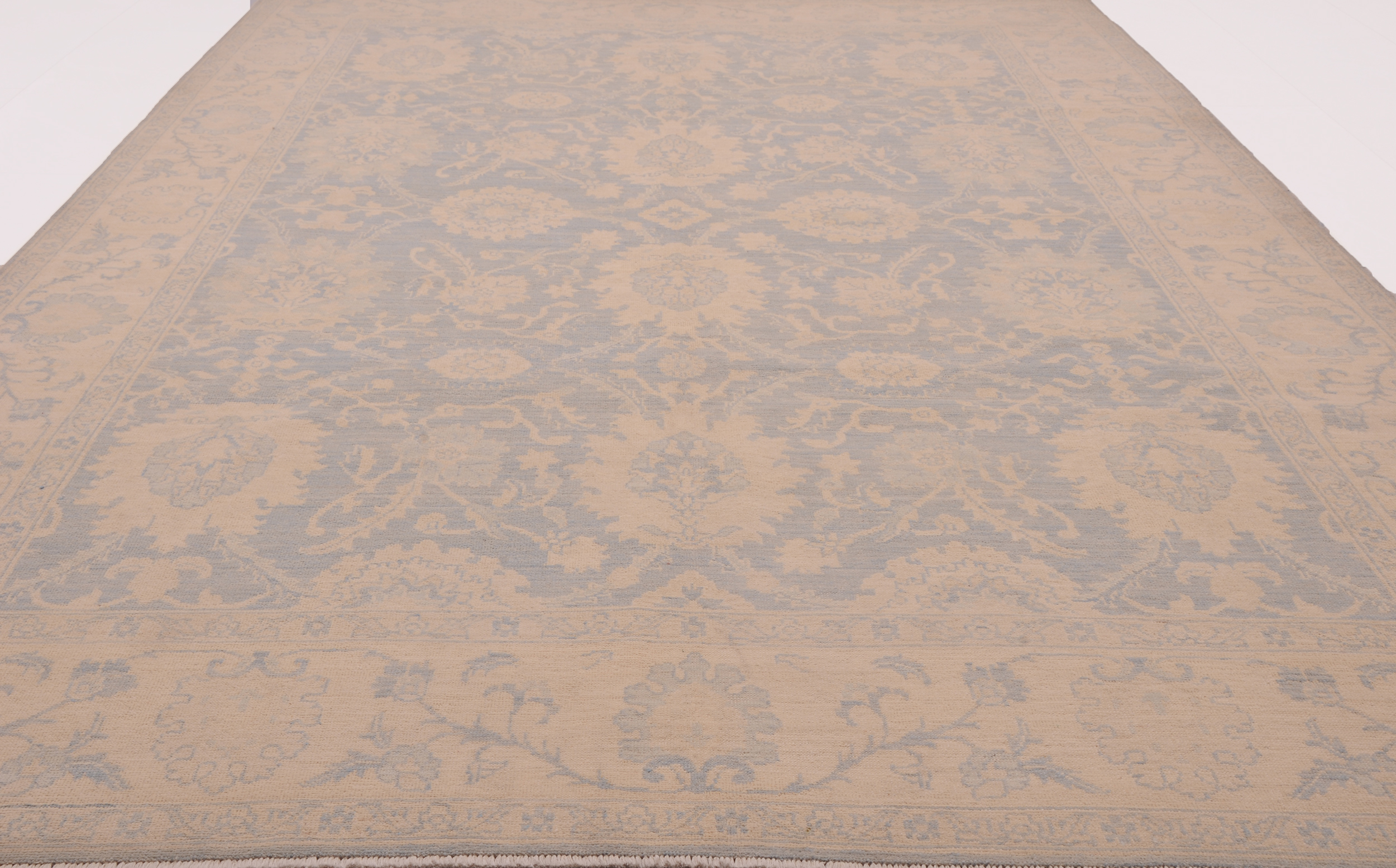 Authentic hand-knotted Oushak rug (6’5″ x 9’6″), crafted in Afghanistan/Pakistan. This beautiful blue and beige floral rug features a low-medium pile (1/4″-1/3″), boasts approximately 156 KPSI, and is made from 100% wool with a cotton foundation. Adds classic elegance to any room.