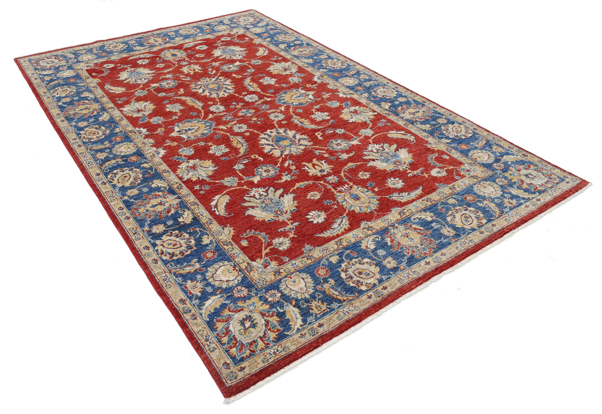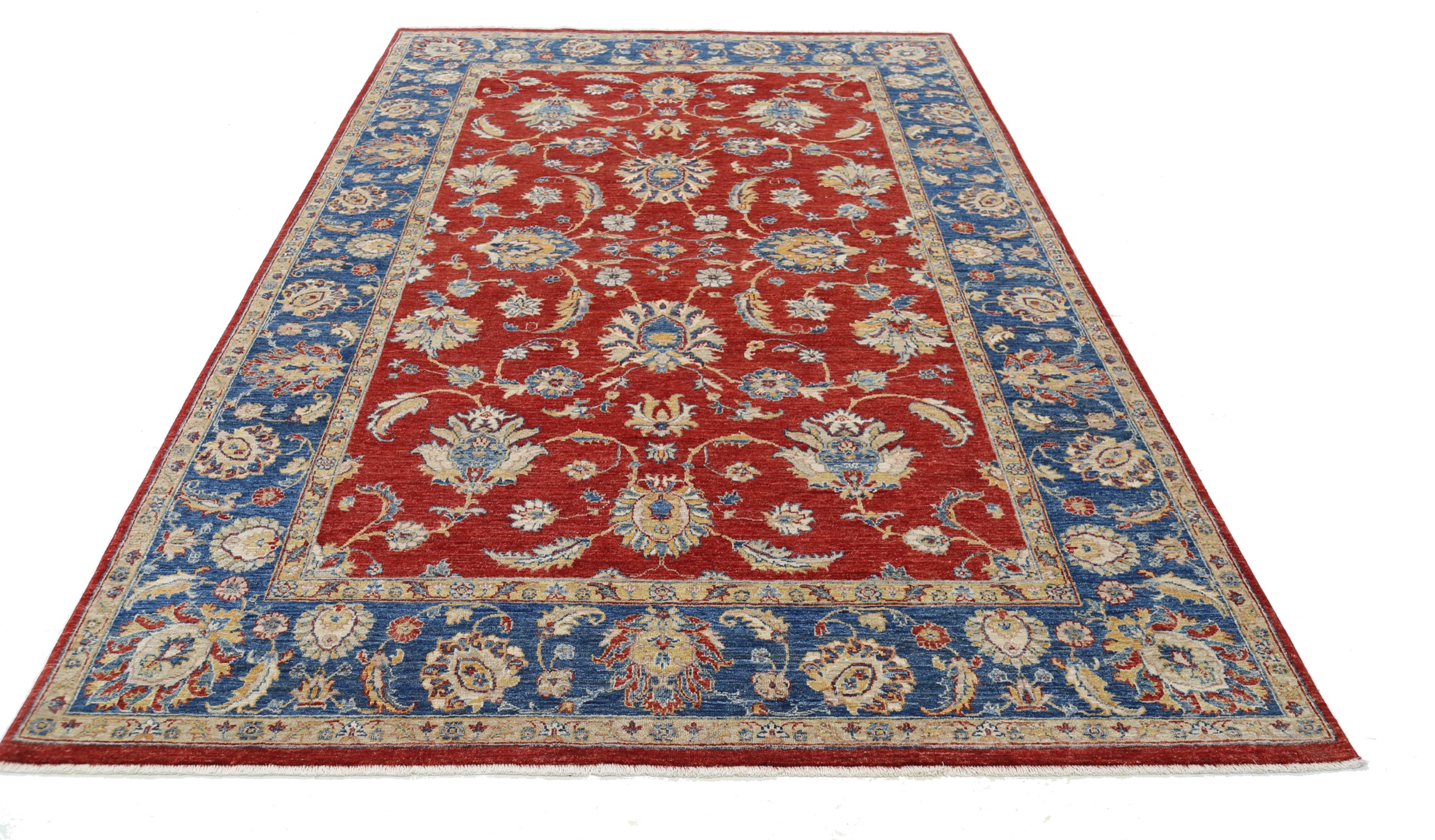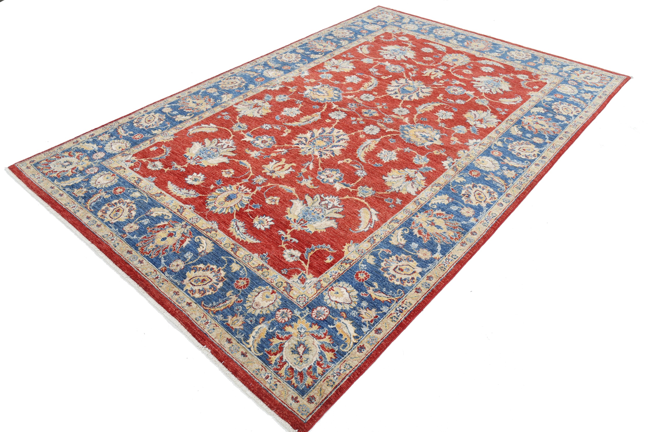 This 6’6″ x 9’10” Oushak rug, hand-knotted in Afghan / Pakistan, features a floral design. Crafted with approx. 156 kpsi, its field color is Red with a Blue border. The rug has a low medium pile 1/4″-1/3″ and a 100% wool pile, in excellent & washed condition.