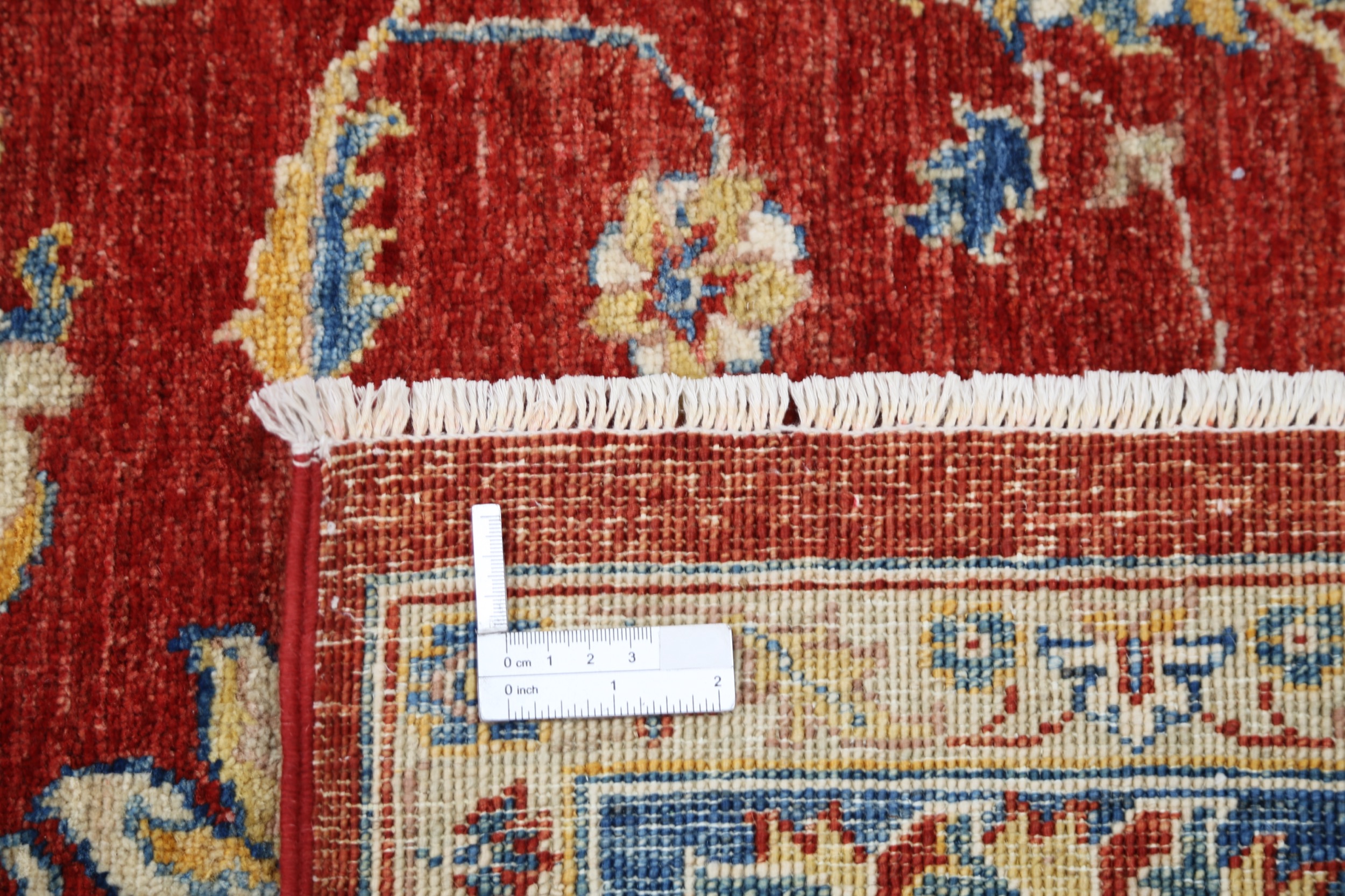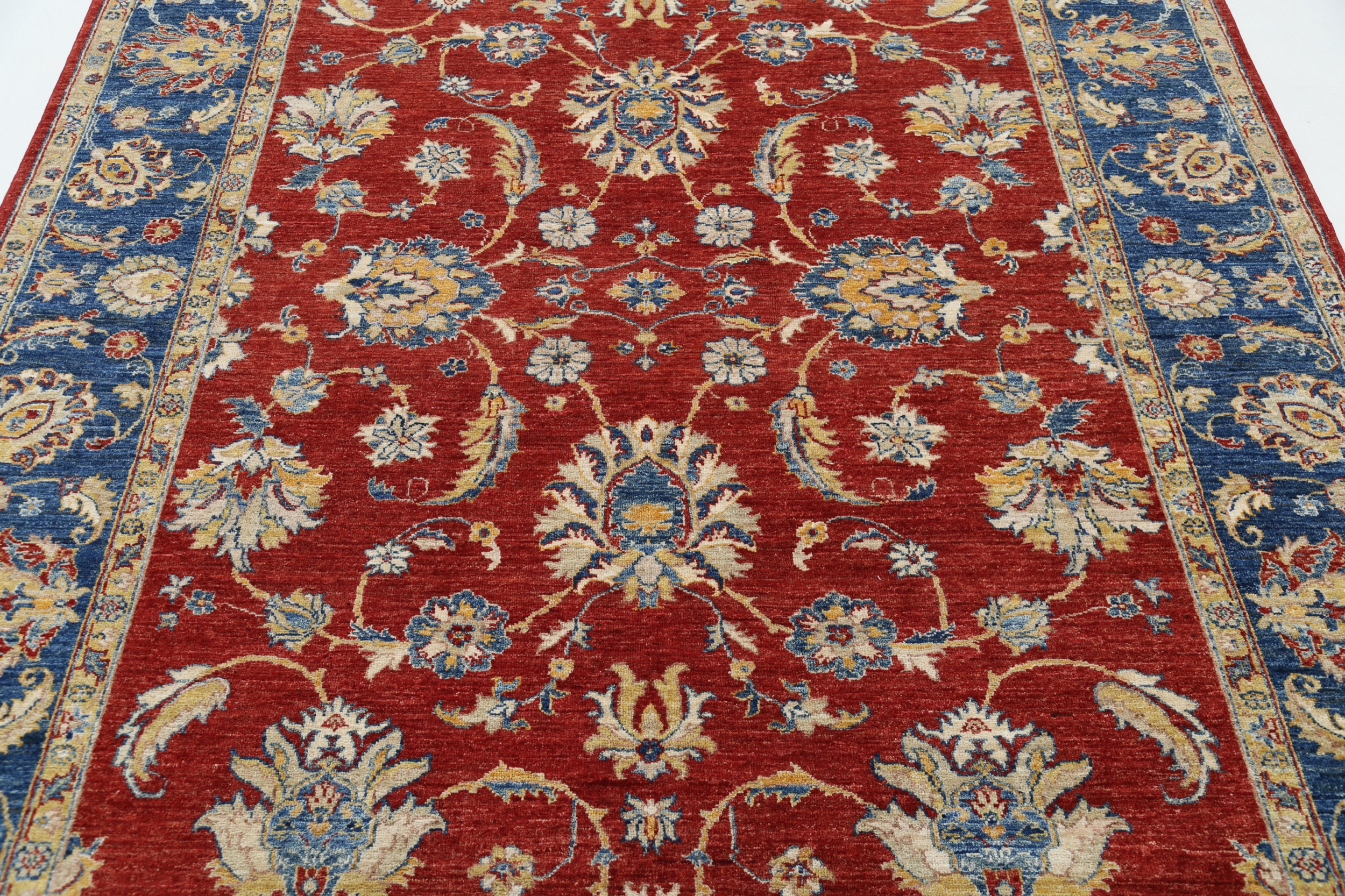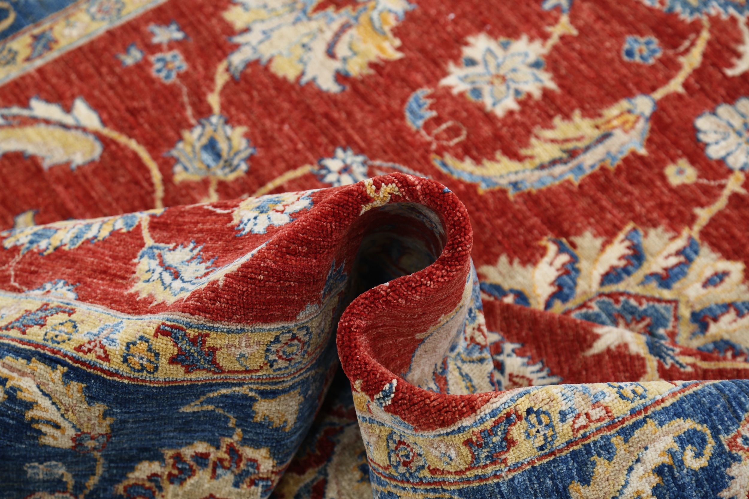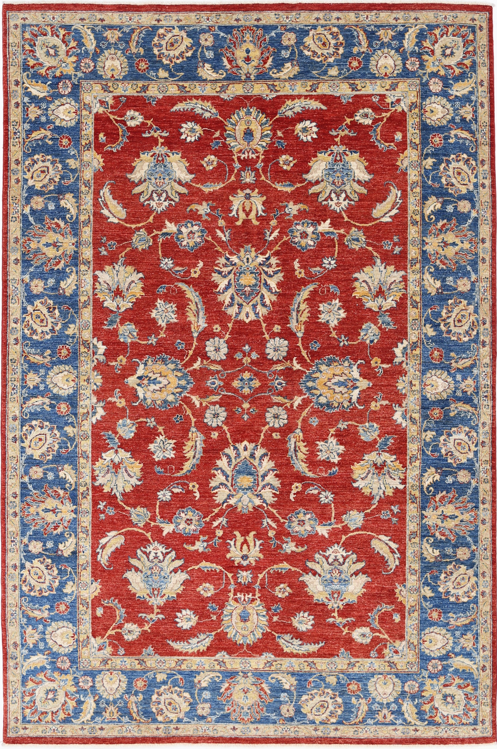 This 6’6″ x 9’10” Oushak rug, hand-knotted in Afghan / Pakistan, features a floral design. Crafted with approx. 156 kpsi, its field color is Red with a Blue border. The rug has a low medium pile 1/4″-1/3″ and a 100% wool pile, in excellent & washed condition.