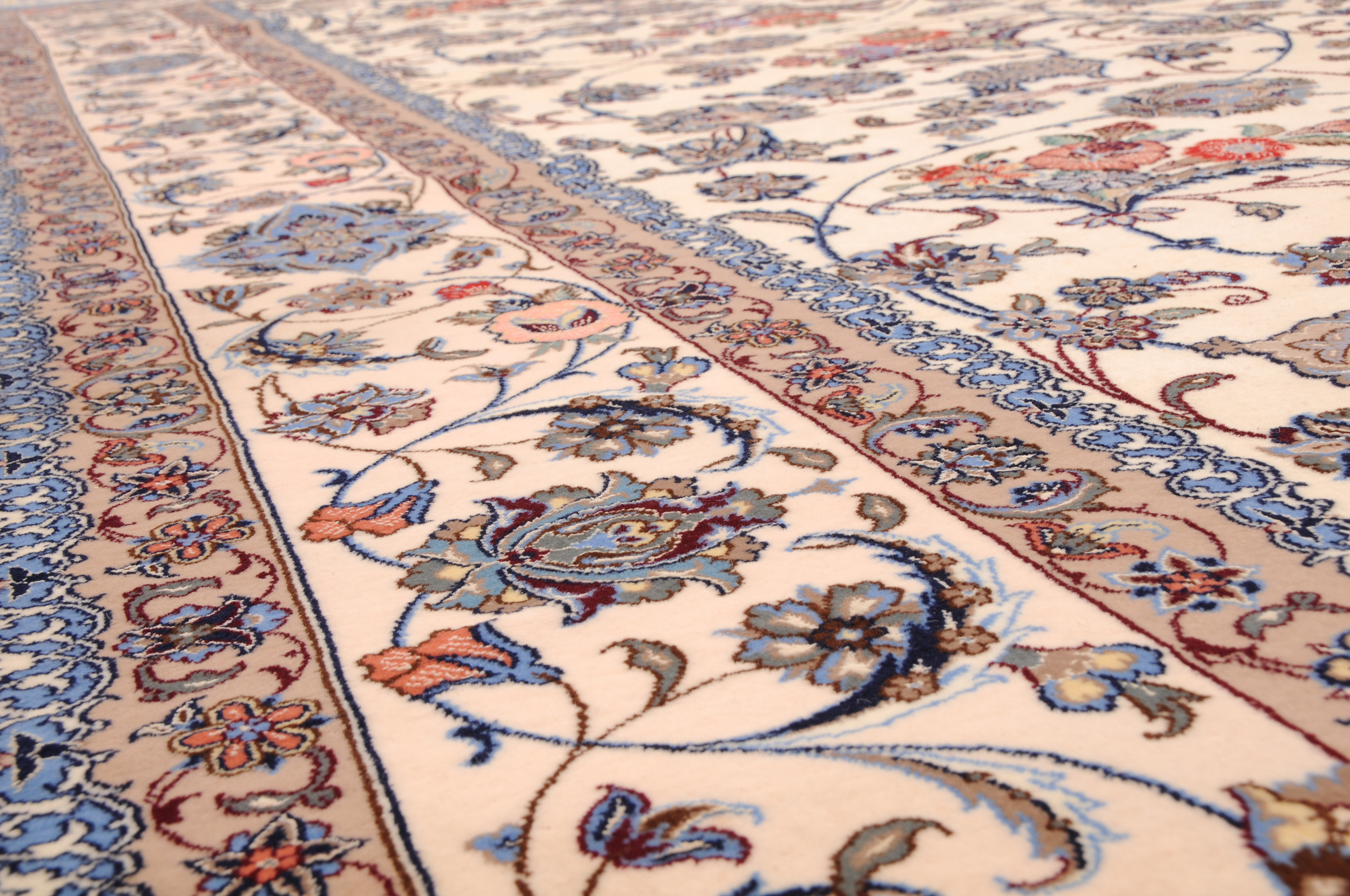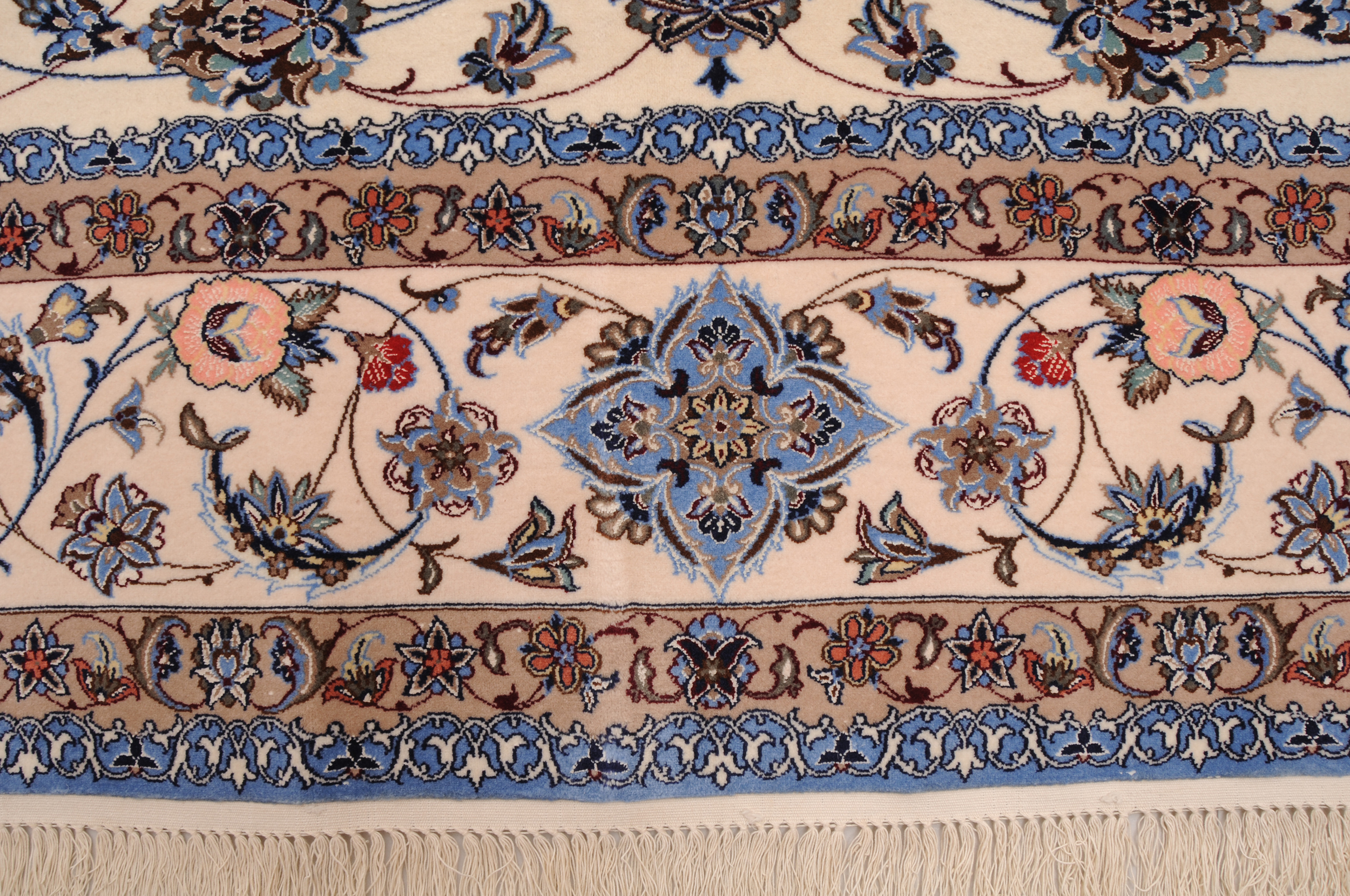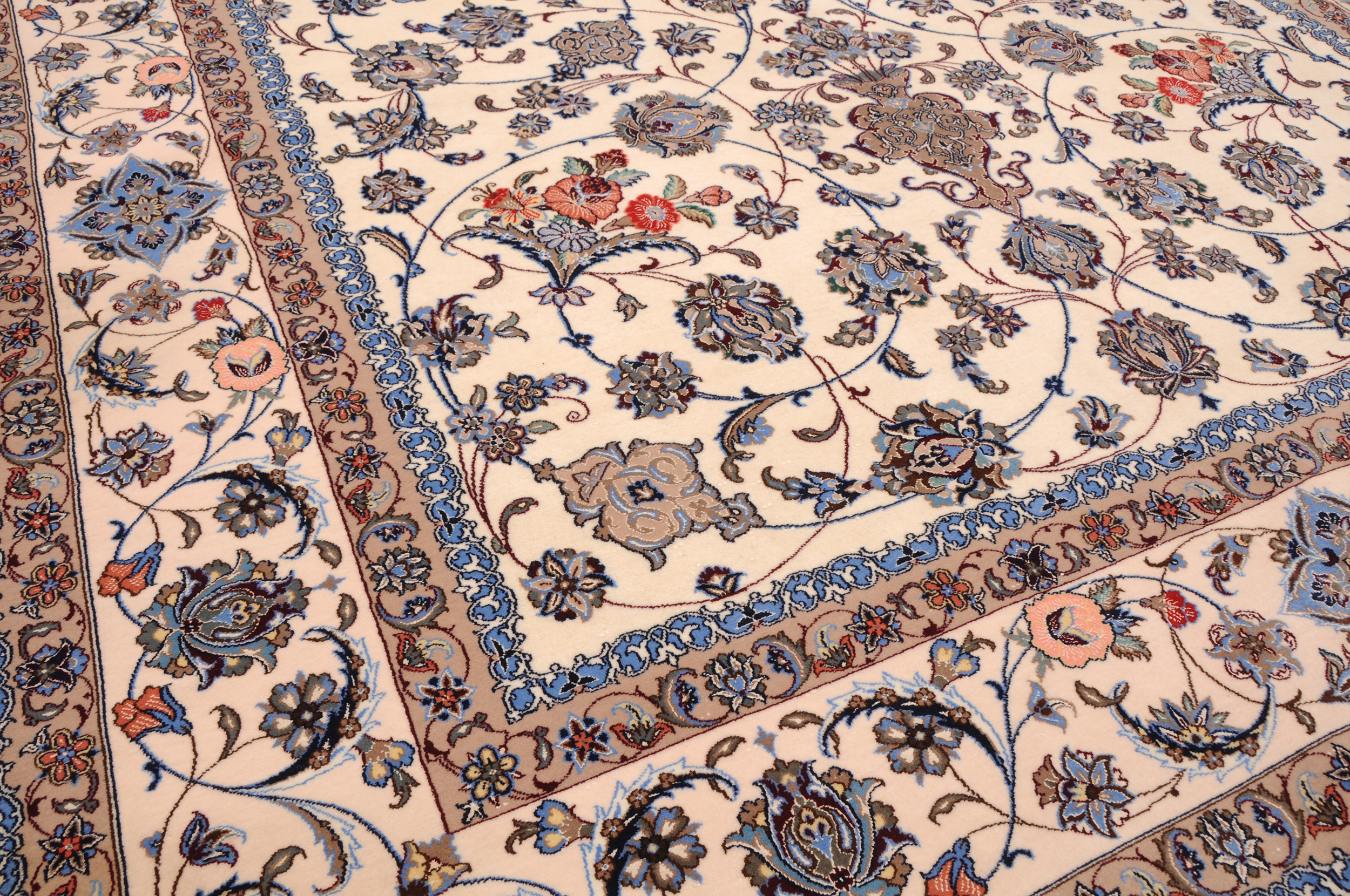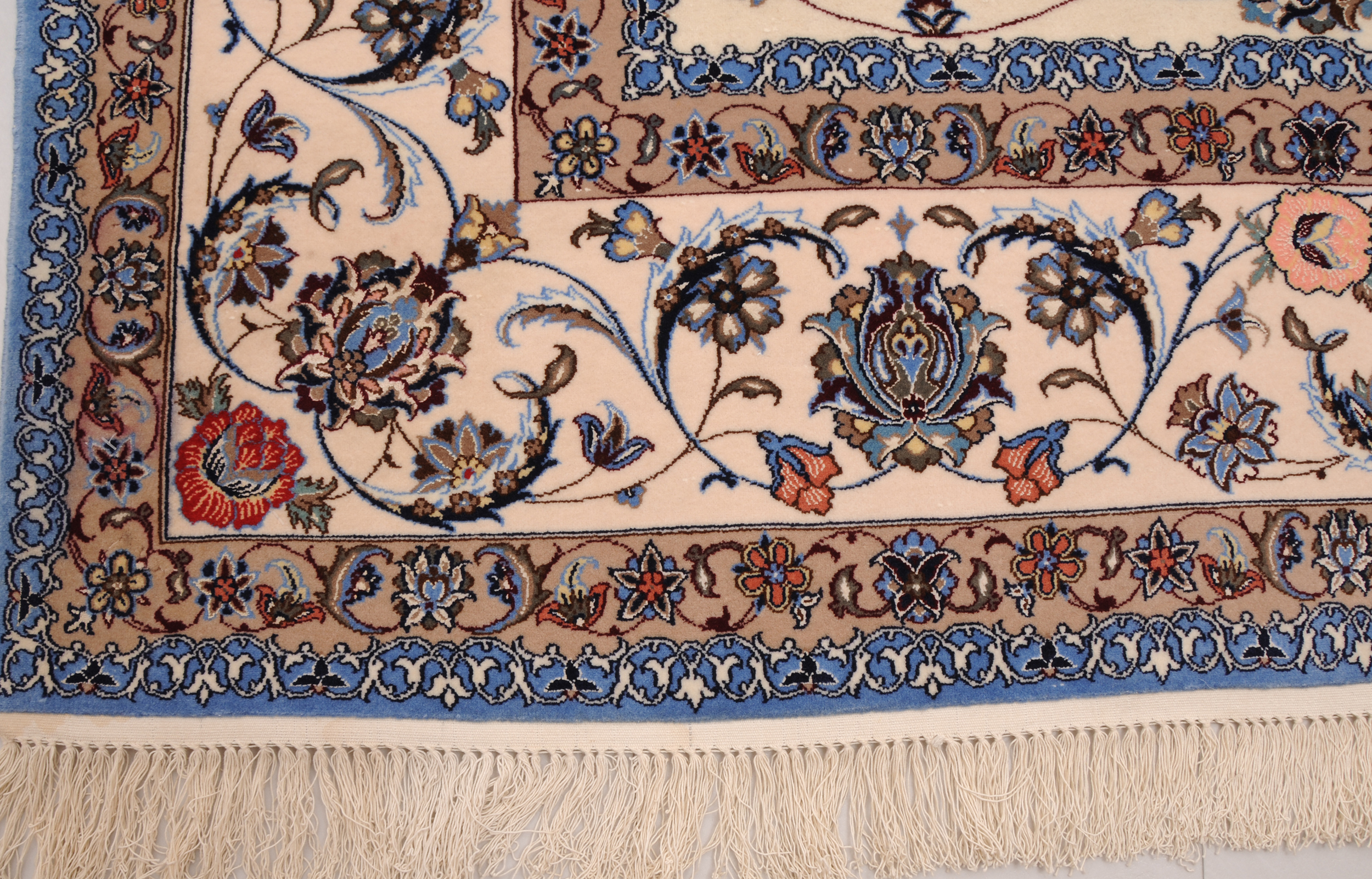 This 6’6″ x 9’7″ Isfahan rug, hand-knotted in Persian, features a meallion design. It is woven with Approx.529 KPS, showcasing a field in Beige and a Blue border. The rug has a Medium Pile and a Silk & Wool pile, and is in excellent condition.