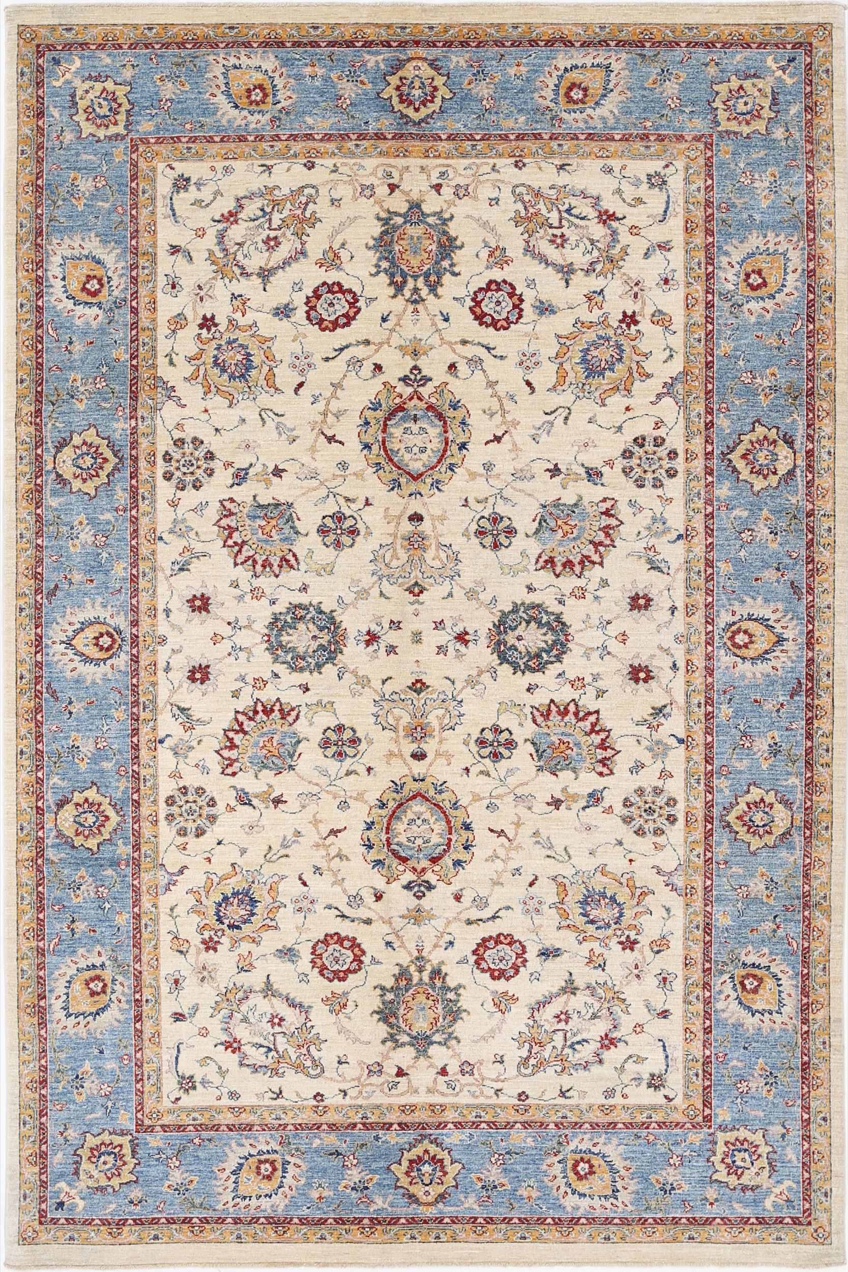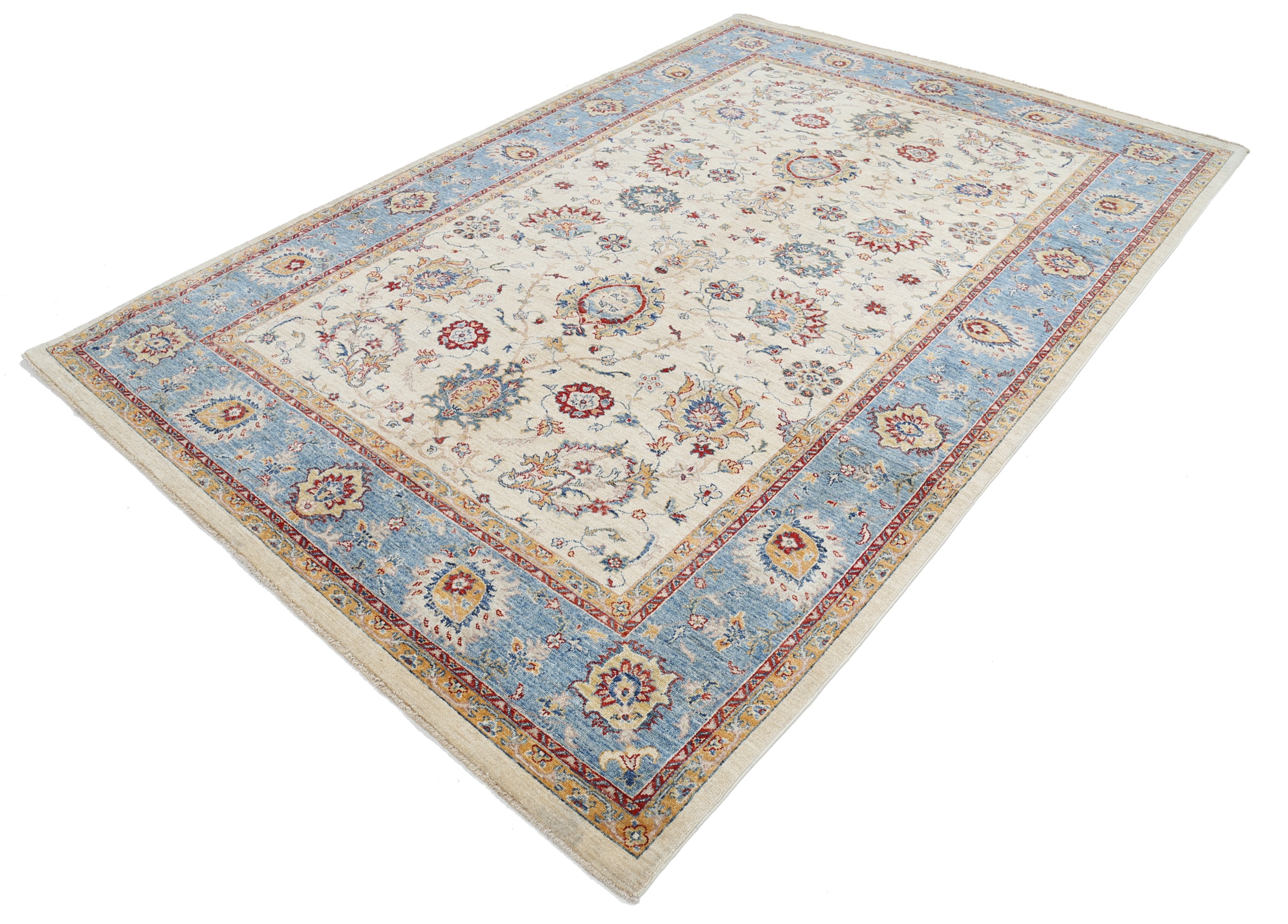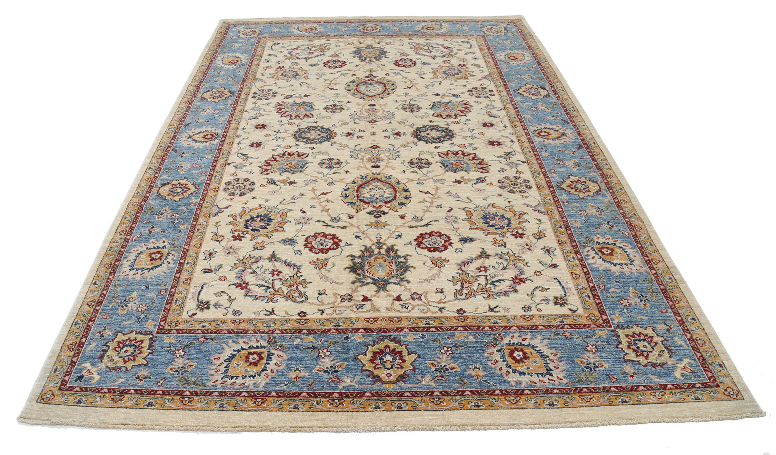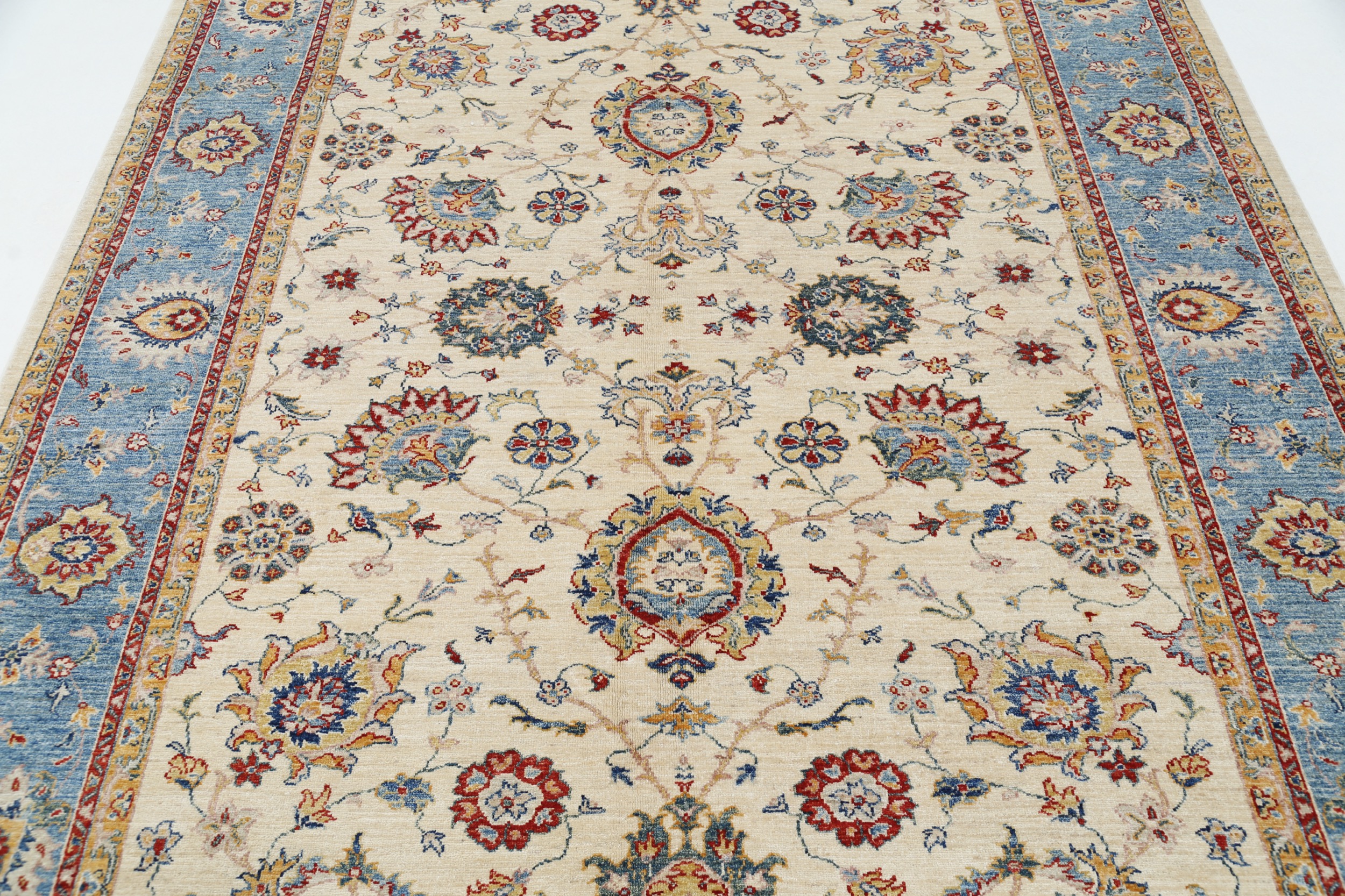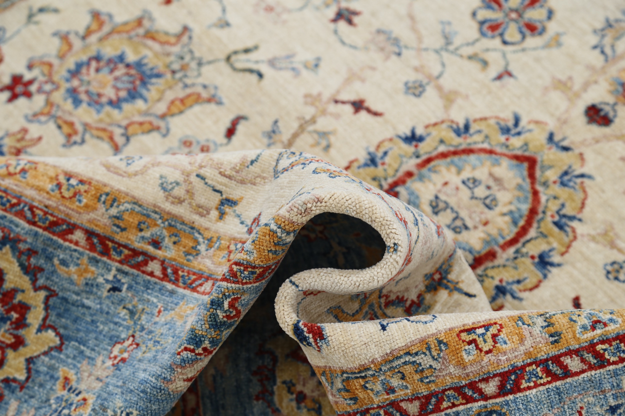 Add timeless beauty to your decor with this 6’7″ x 9’10” Oushak rug, hand-knotted in Afghan / Pakistan from 100% wool. The floral pattern, with a beige field and blue border, is a hallmark of the Oushak style. Approx. Approx. 156 KPSI and a low medium pile 1/4″-1/3″ pile make it a true heirloom piece.