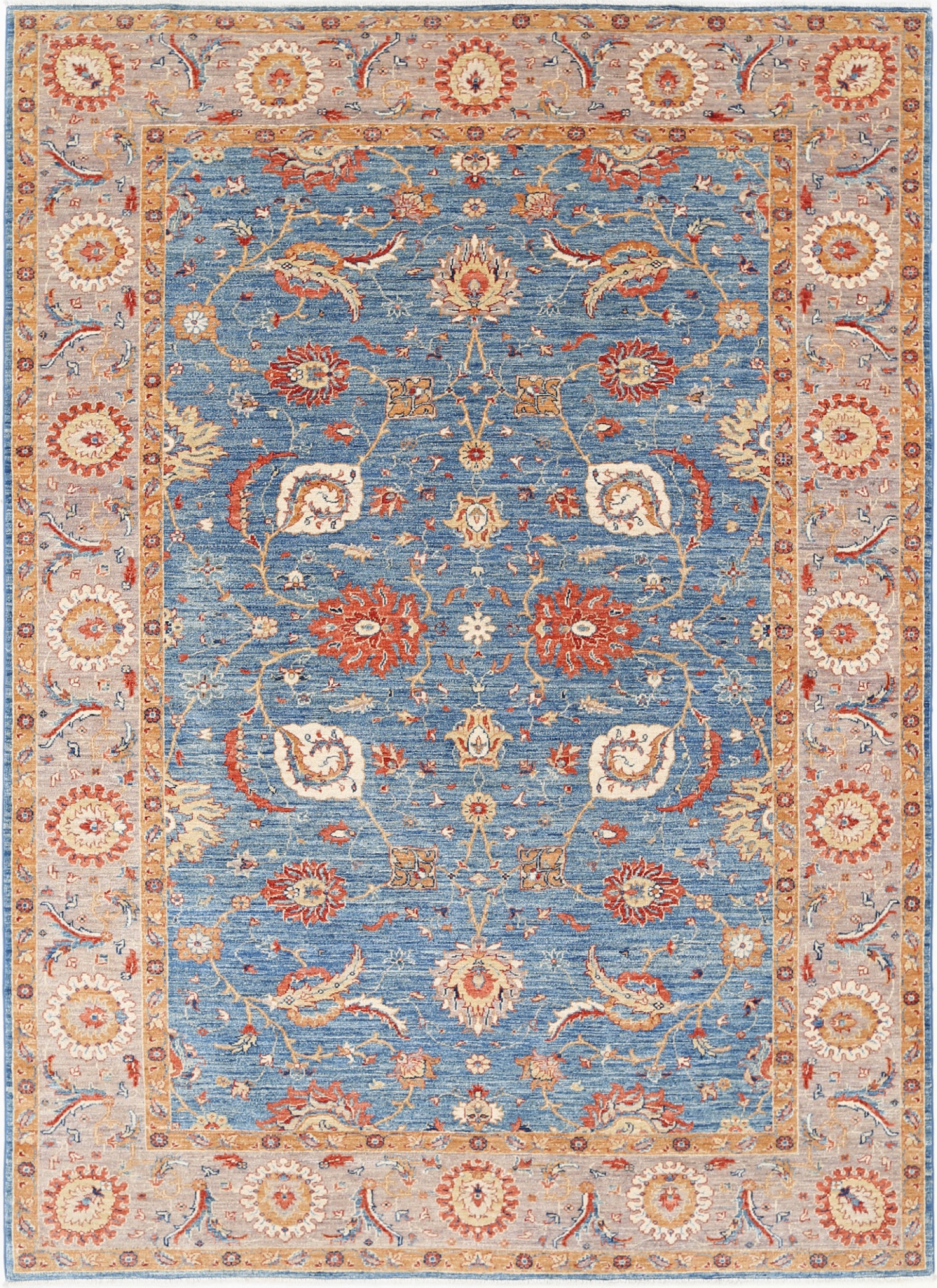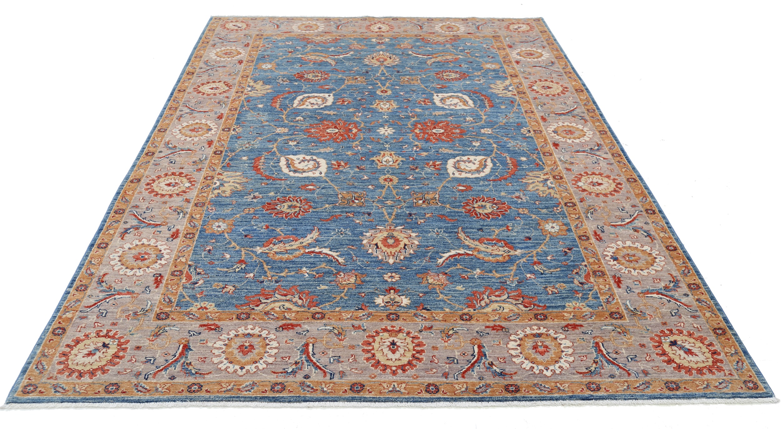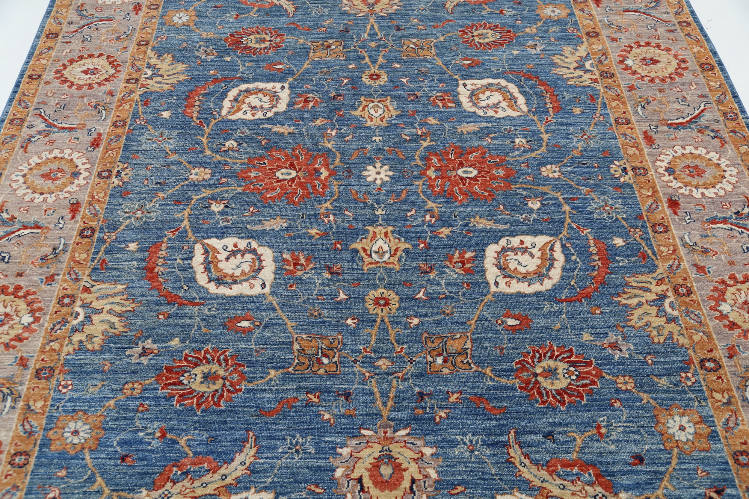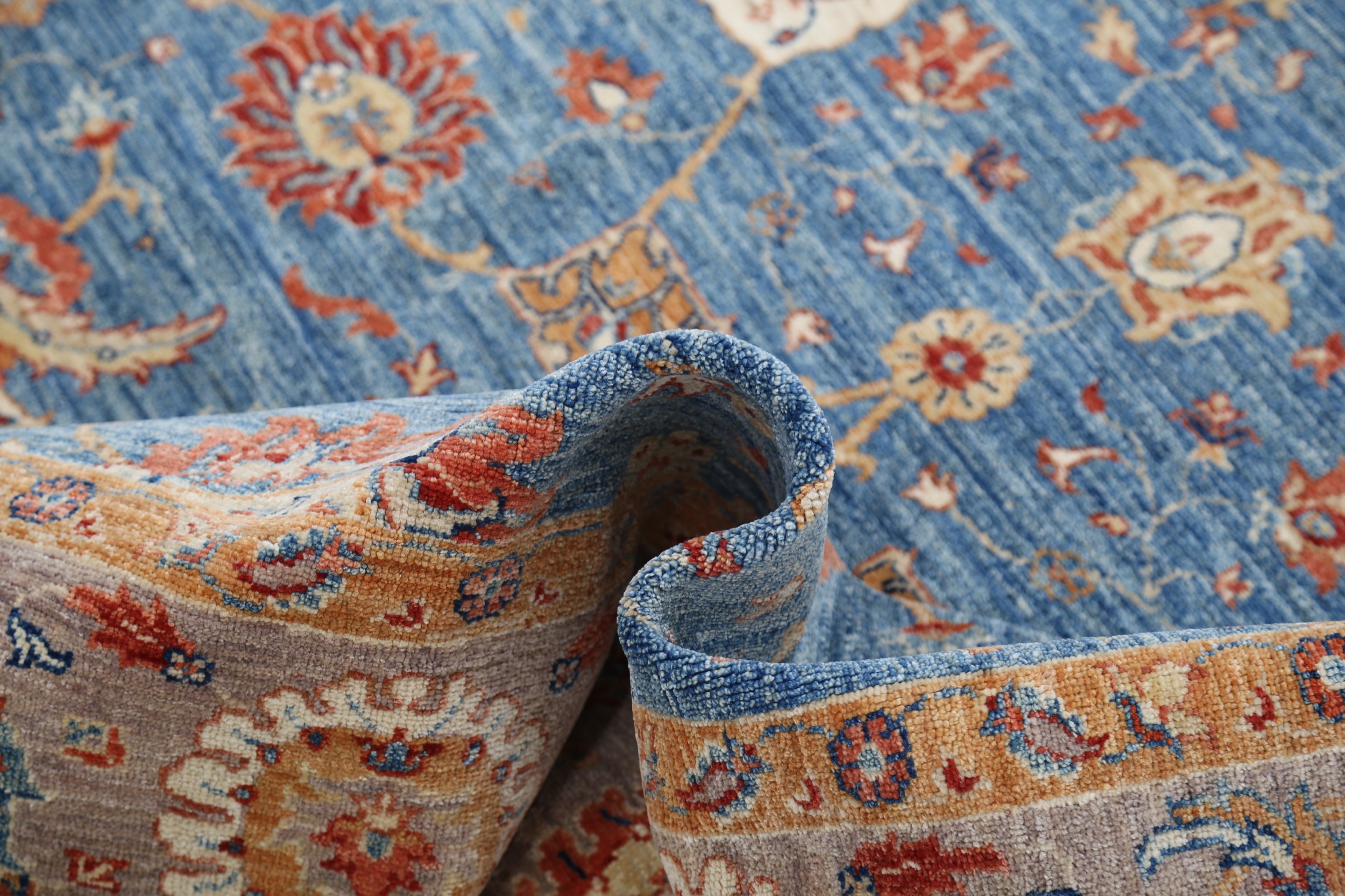This 6’7″ x 9’3″ Oushak rug, hand-knotted in Afghan / Pakistan, features a floral design. Crafted with approx. 156 kpsi, its field color is Blue with a Purpel border. The rug has a low medium pile 1/4″-1/3″ and a 100% wool pile, in excellent & washed condition.