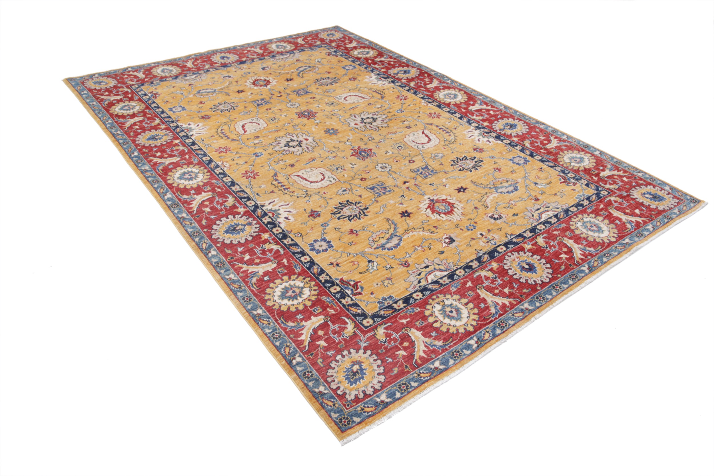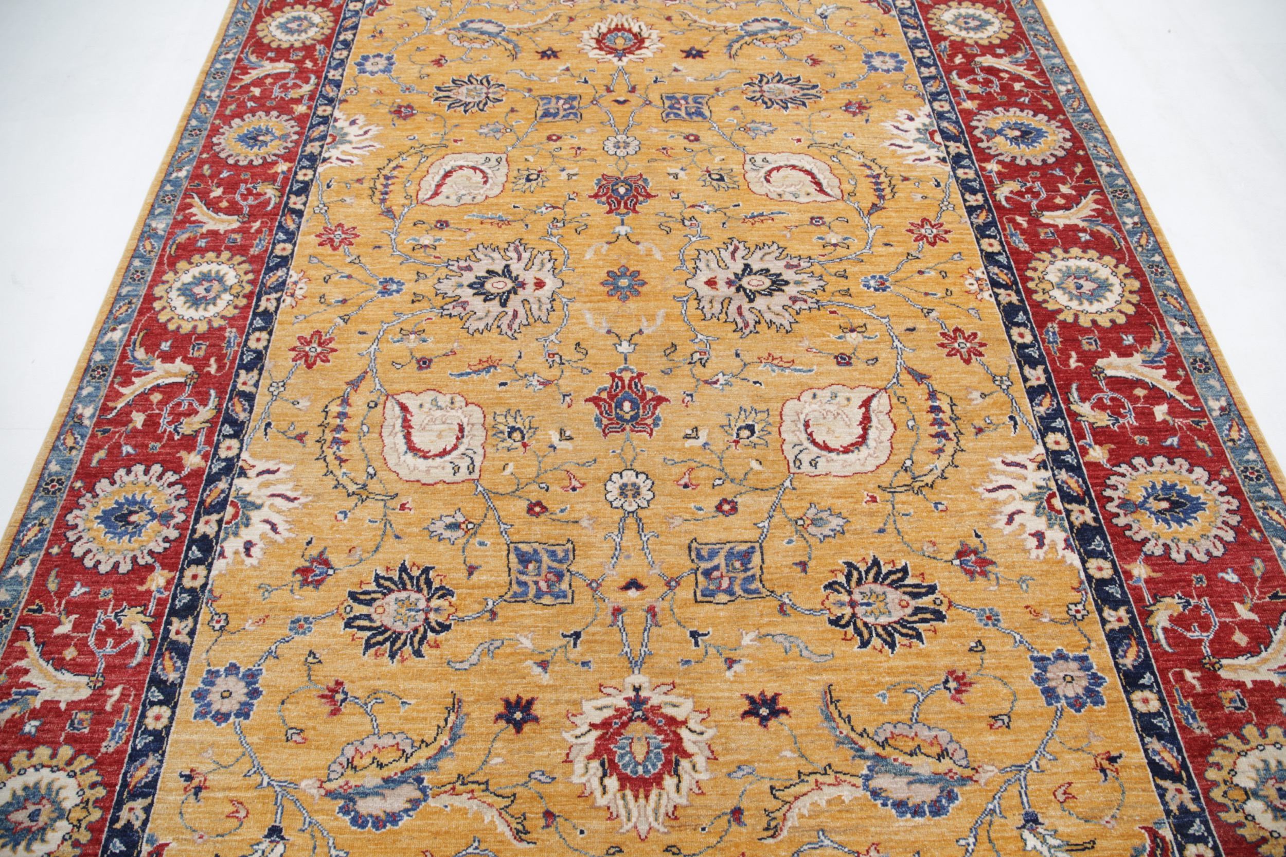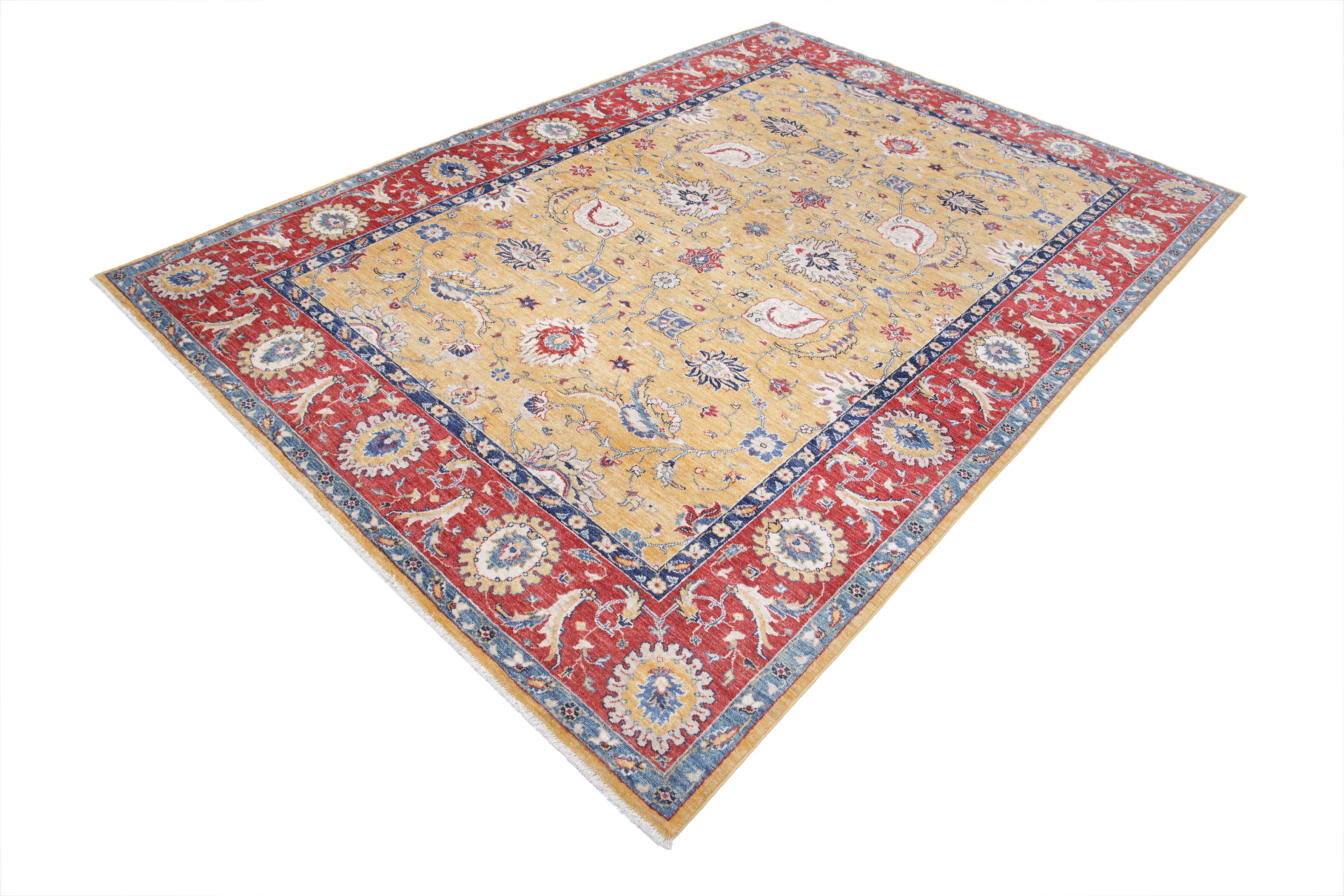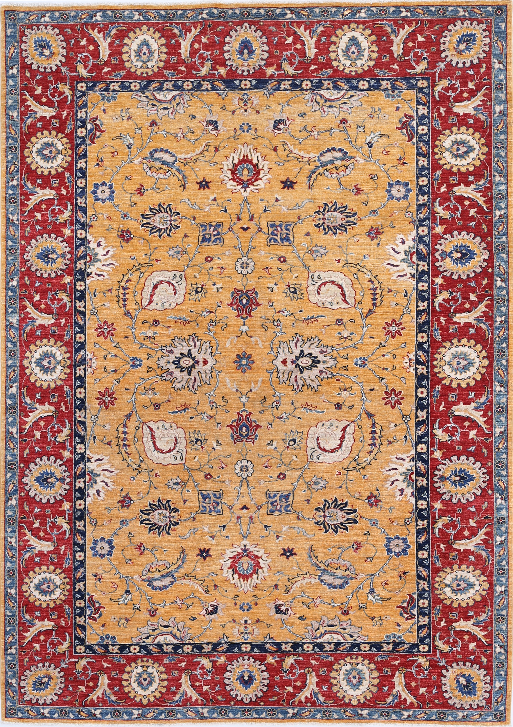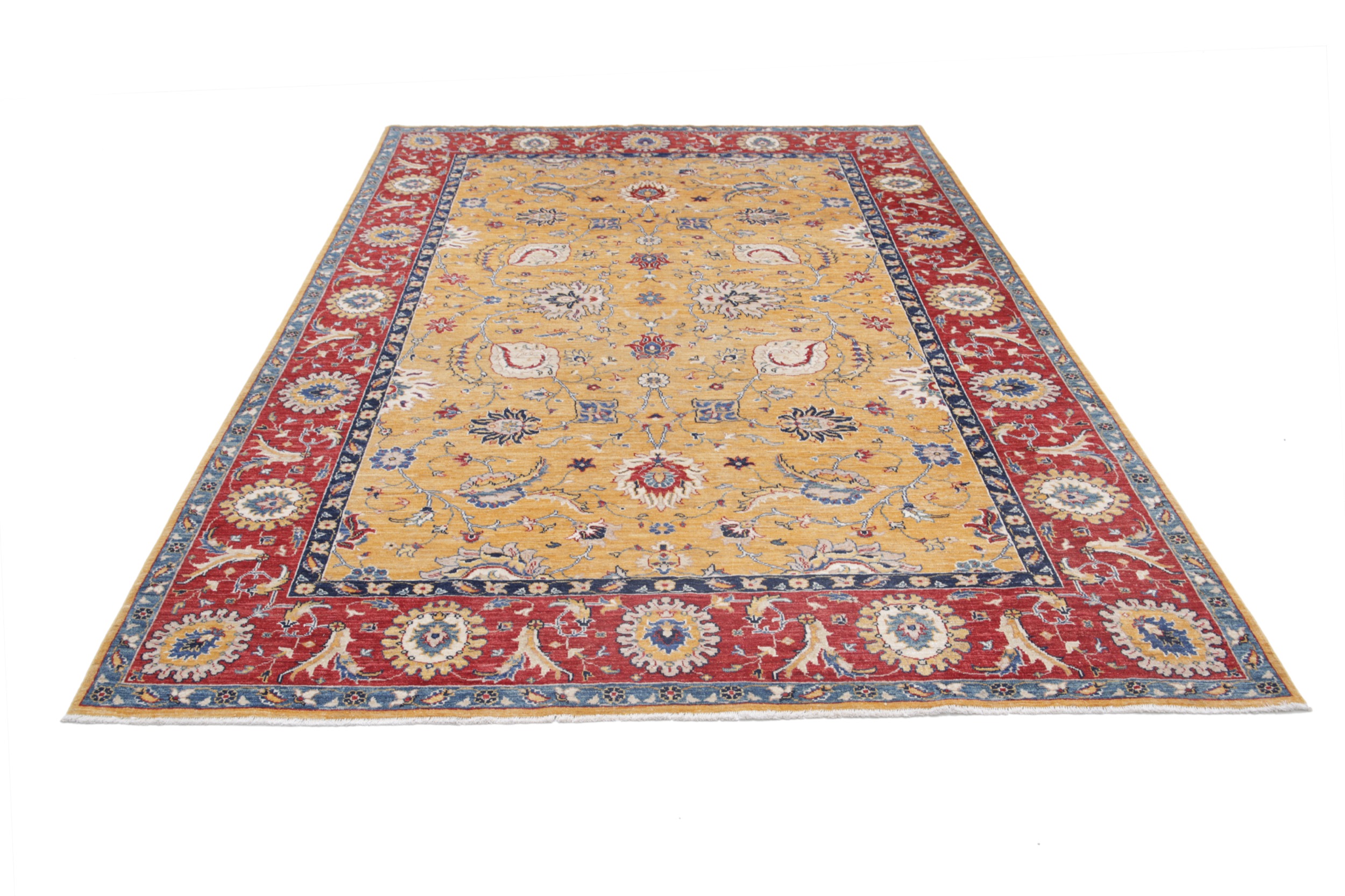 This exquisite 6’7″ x 9’4″ Oushak rug from Afghan / Pakistan showcases a timeless floral pattern. Hand-knotted with 100% wool on a cotton foundation, it features a yellow field and red border. The floral design adds an elegant character to any space.
