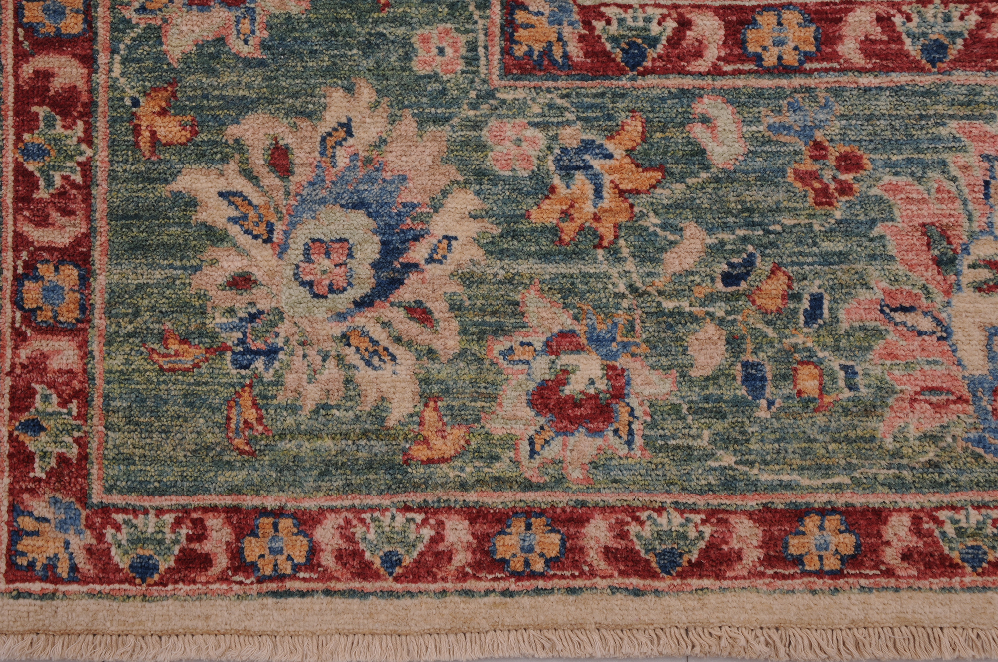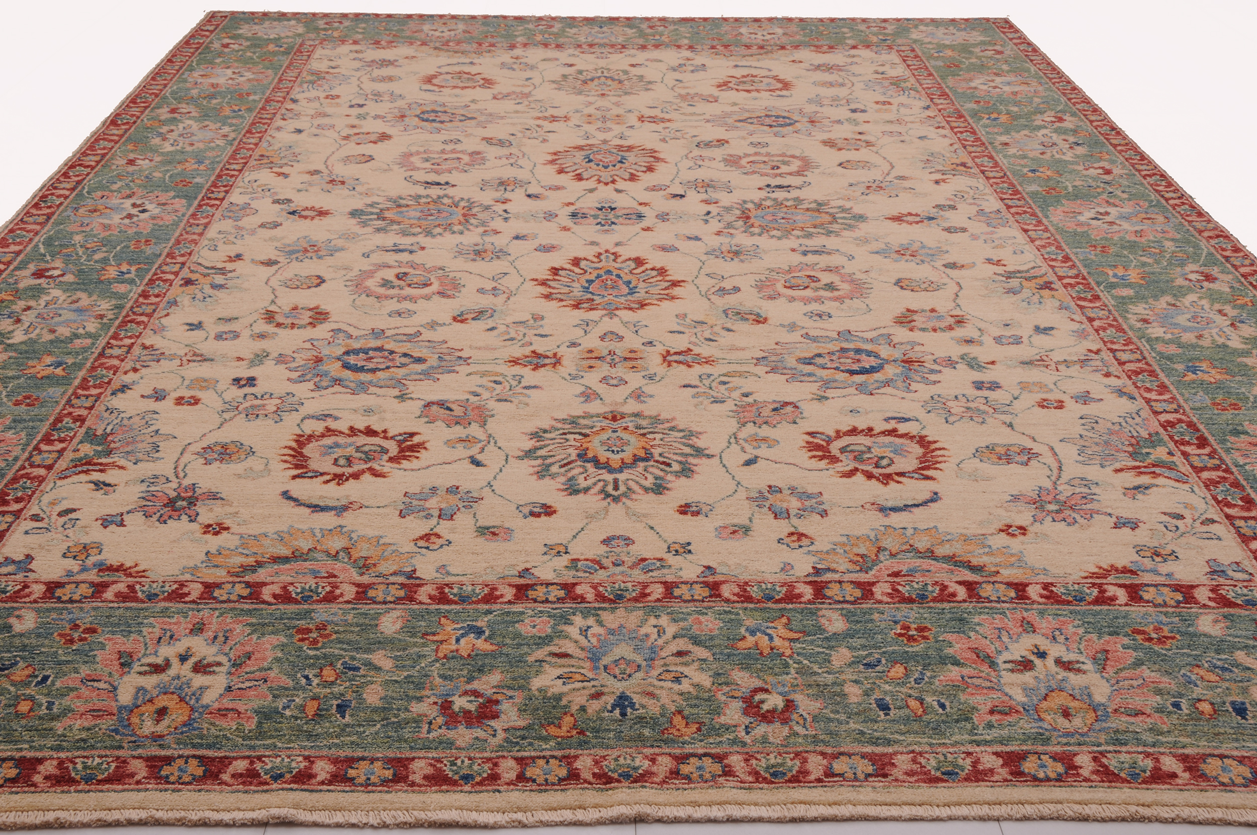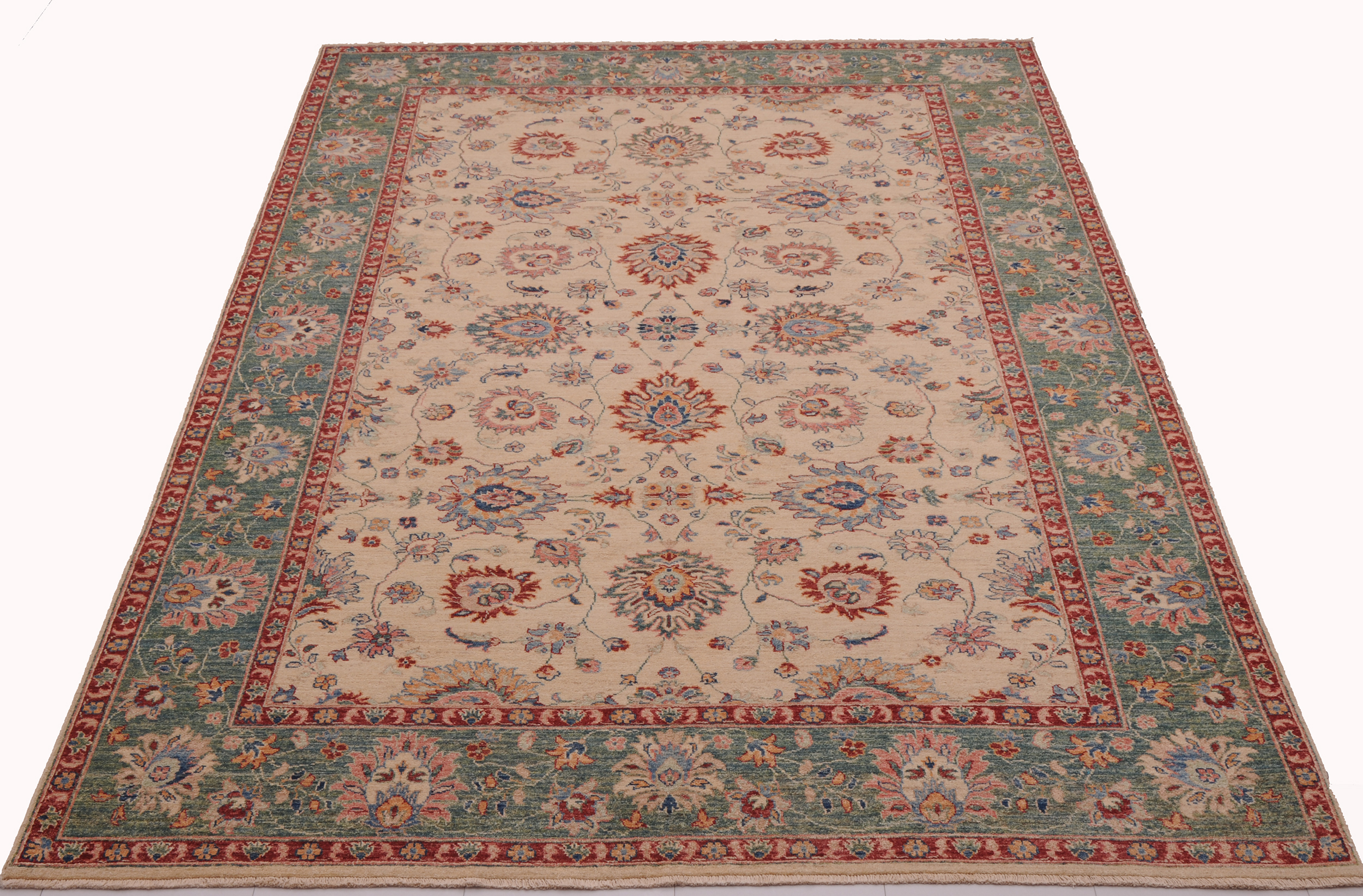 Introducing the Oushak Oriental rug, a stunning addition to any space. Hand-knotted with meticulous craftsmanship, this rug features a 6’7” x 9’2” size and a beautiful beige green floral design. With a density of approximately 156 knots per square inch (KPSI), it is made of 100% wool and cotton, ensuring both quality and comfort. The low to medium pile height of 1/4″ to 1/3″ adds to its luxurious feel. This rug is in excellent condition and has been thoroughly washed, making it an exceptional choice for style and practicality.