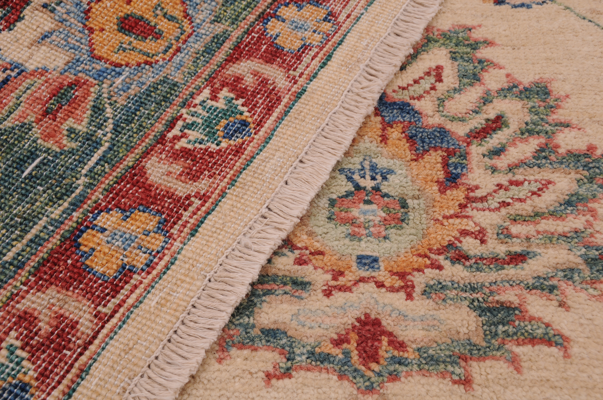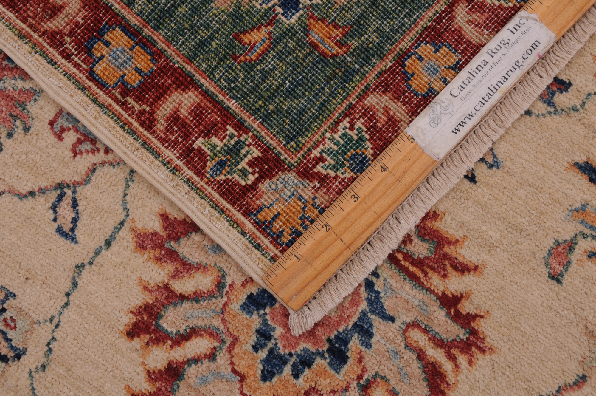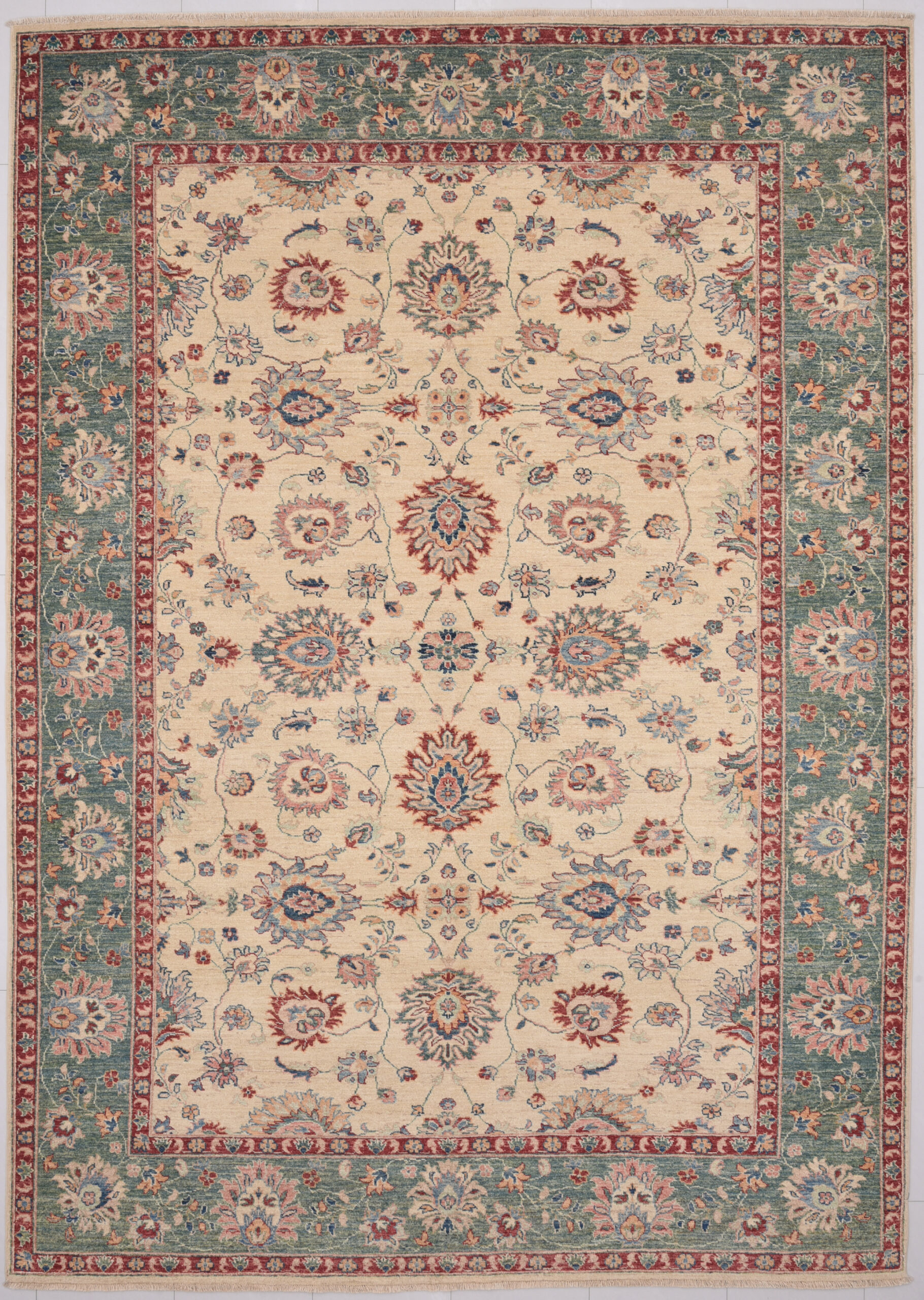 Introducing the Oushak Oriental rug, a stunning addition to any space. Hand-knotted with meticulous craftsmanship, this rug features a 6’7” x 9’2” size and a beautiful beige green floral design. With a density of approximately 156 knots per square inch (KPSI), it is made of 100% wool and cotton, ensuring both quality and comfort. The low to medium pile height of 1/4″ to 1/3″ adds to its luxurious feel. This rug is in excellent condition and has been thoroughly washed, making it an exceptional choice for style and practicality.