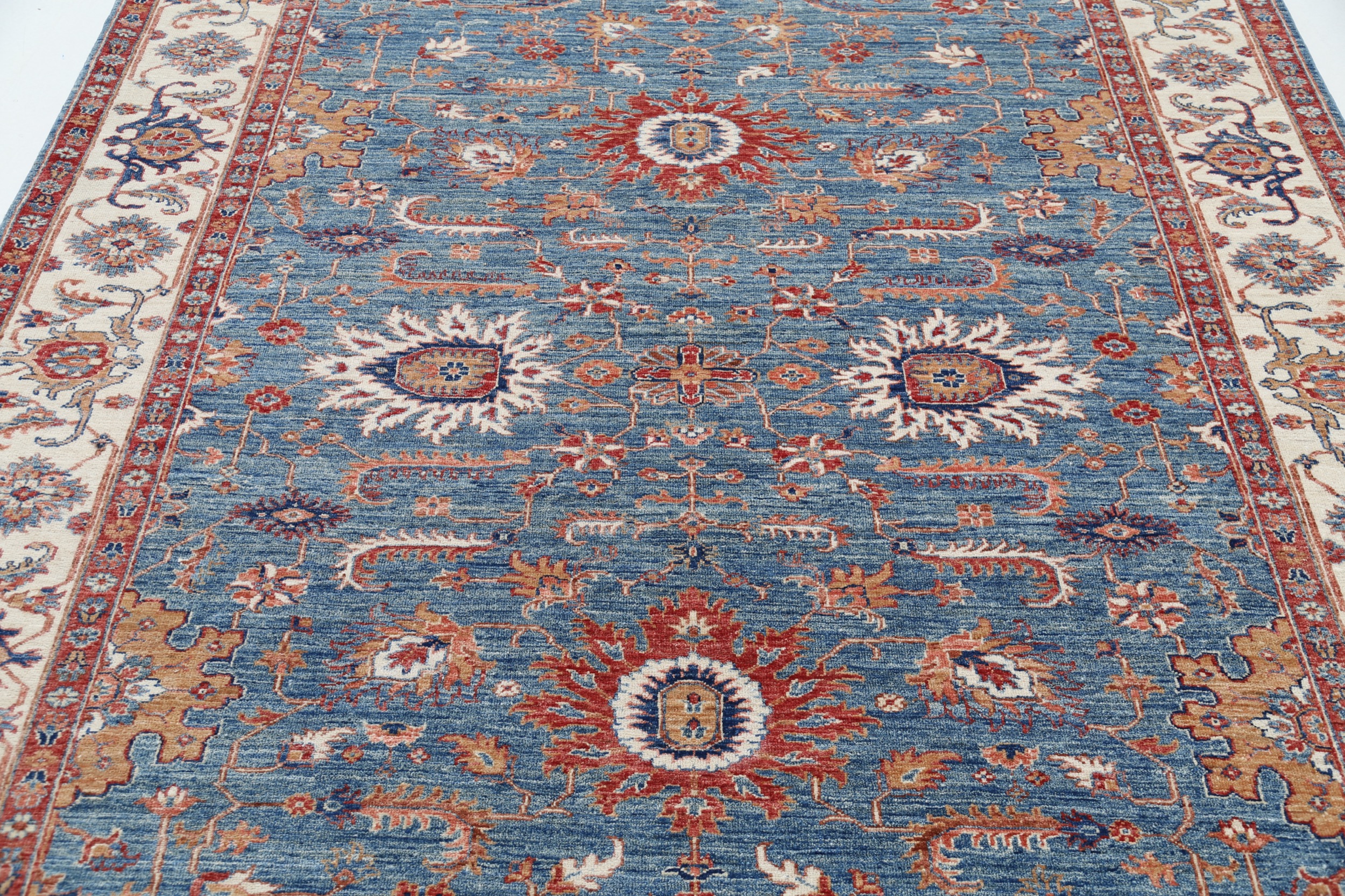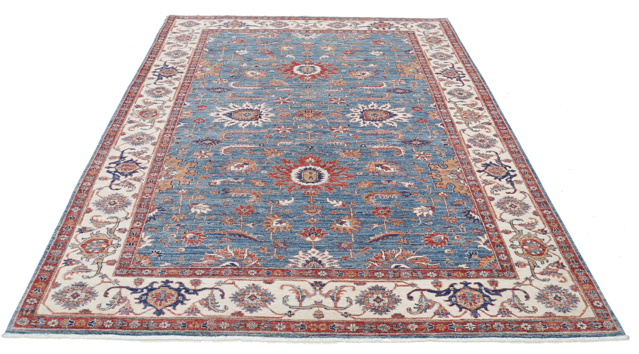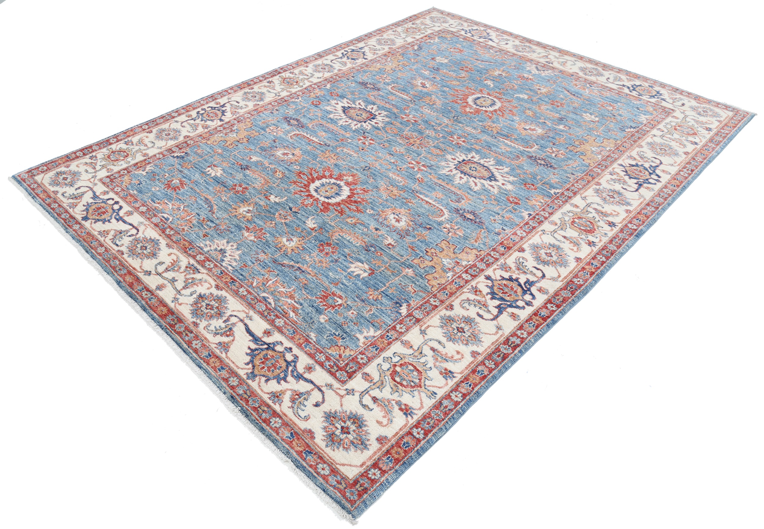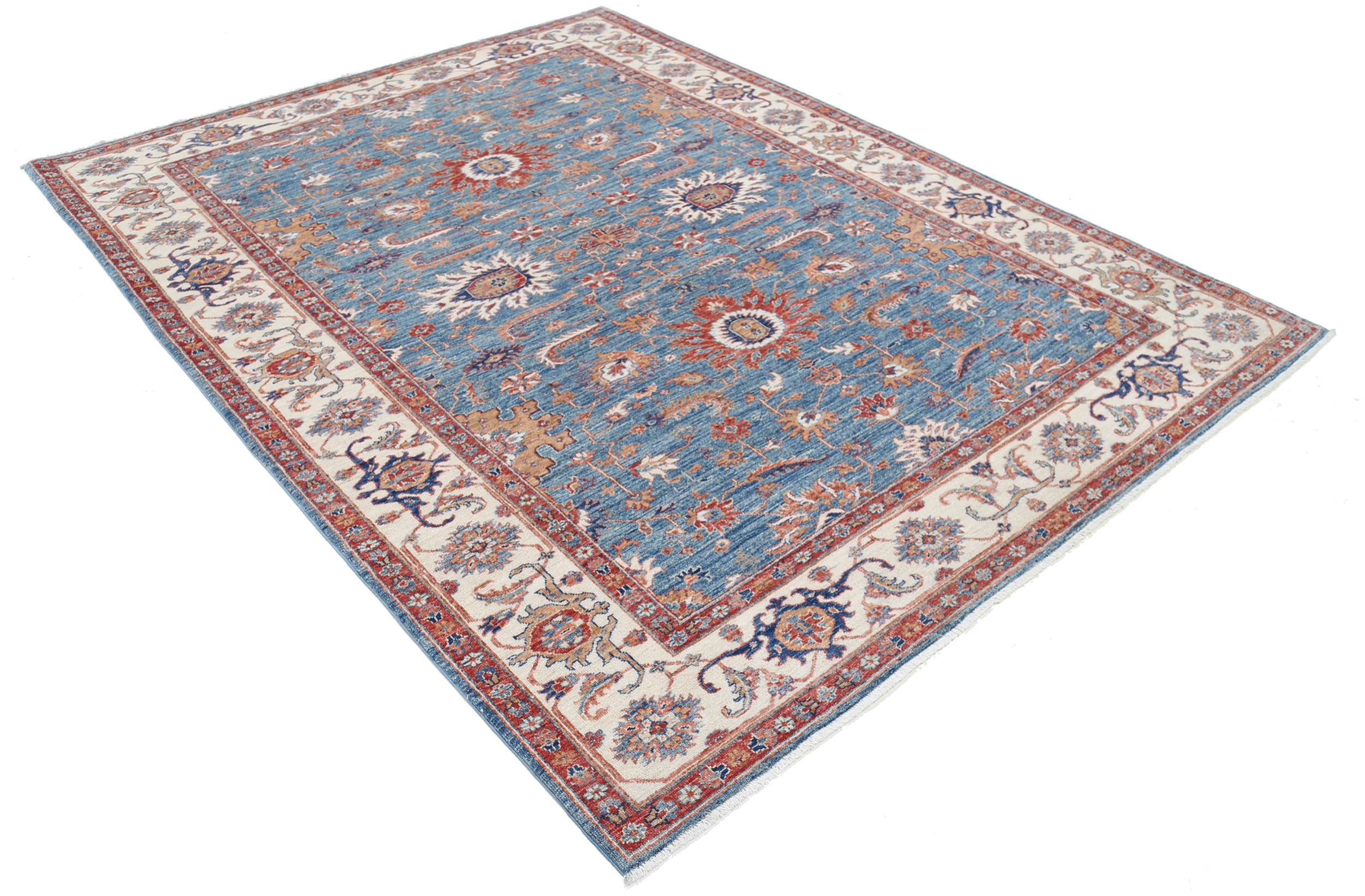 Introducing our exquisite Oriental rug, the Oushak. This hand-knotted beauty measures 6’8” x 8’9” and features a stunning blue and beige floral design. With an approximate KPSI of 156, this rug is meticulously crafted using 100% wool and cotton. Its low to medium pile height of 1/4″-1/3″ offers a comfortable and luxurious feel underfoot. Rest assured, this rug is in excellent condition and has been professionally washed for optimal cleanliness. Bring elegance and timeless charm to your space with this remarkable Oushak Oriental rug.