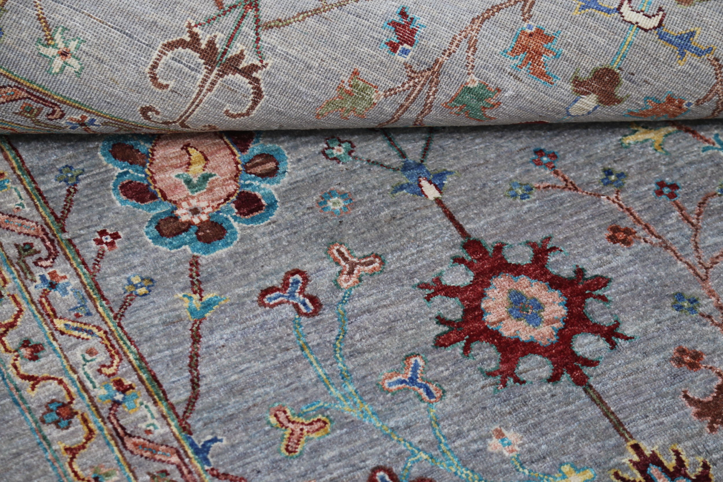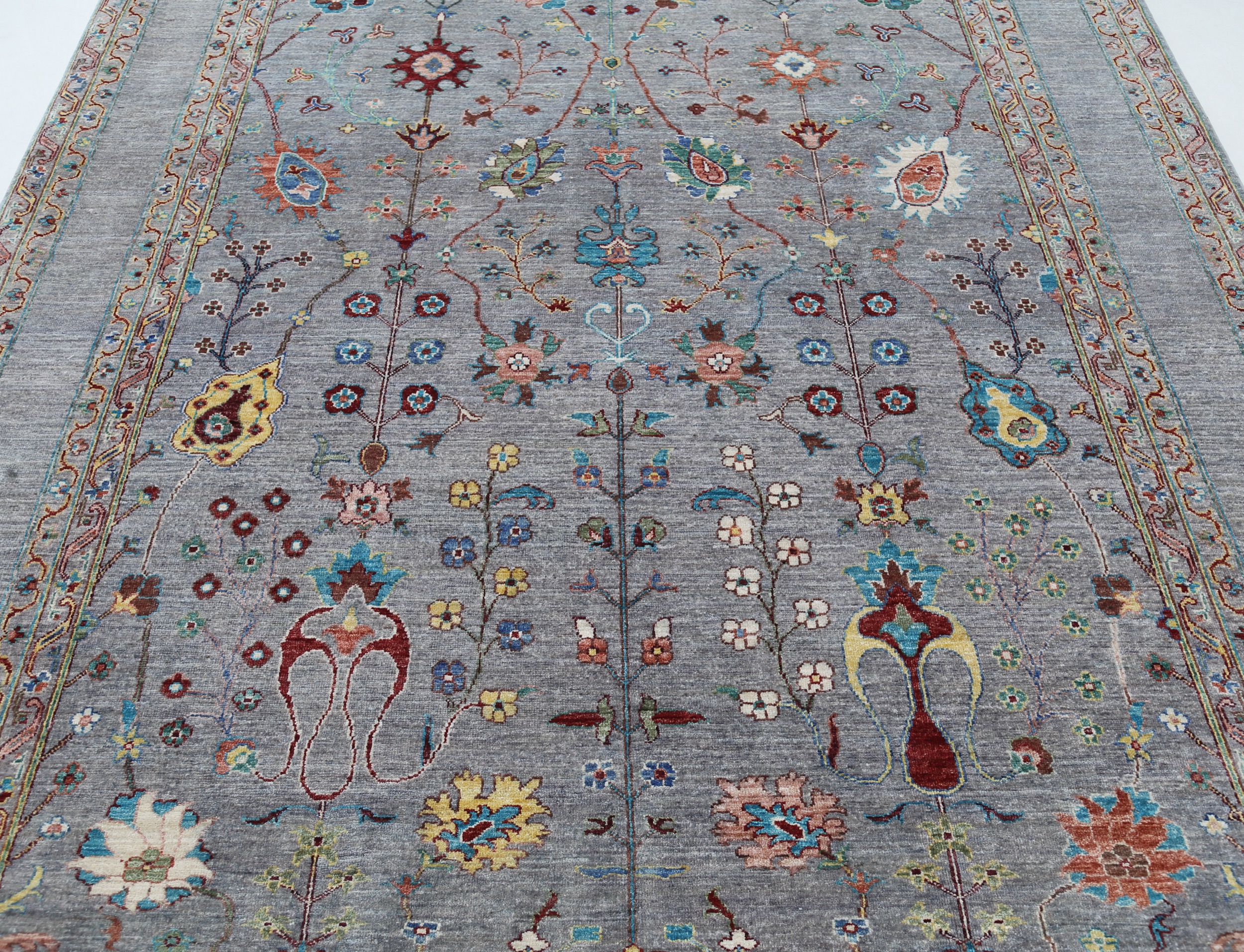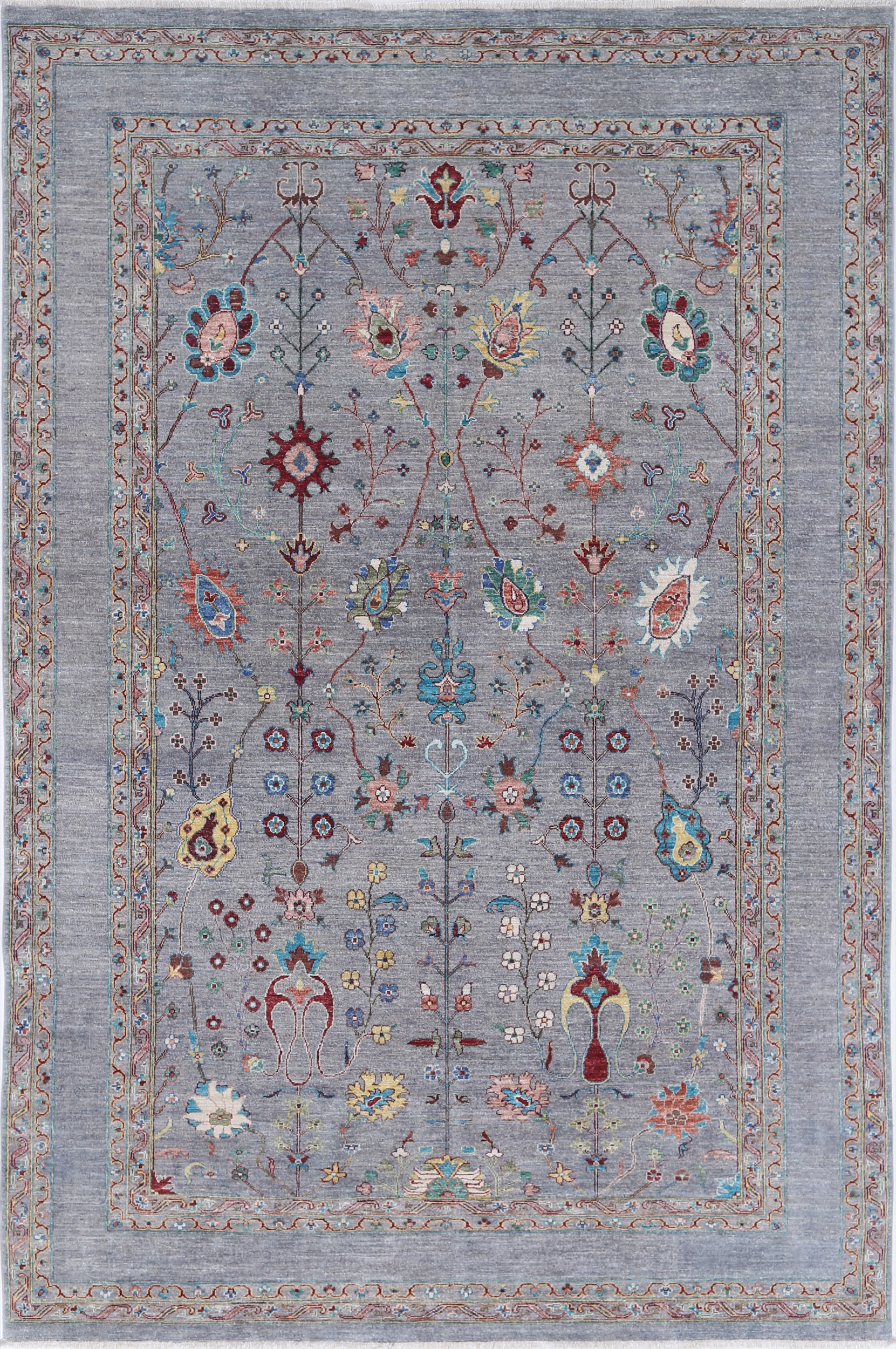 A stunning example of Oriental craftsmanship, this 6’9″ x 10’2″ Oushak rug is hand-knotted in Afghan / Pakistan. Its gray field and gray border frame a detailed floral design, known for its refined, traditional aesthetics. Durable and beautifully textured with a low medium pile 1/4″-1/3″ pile.