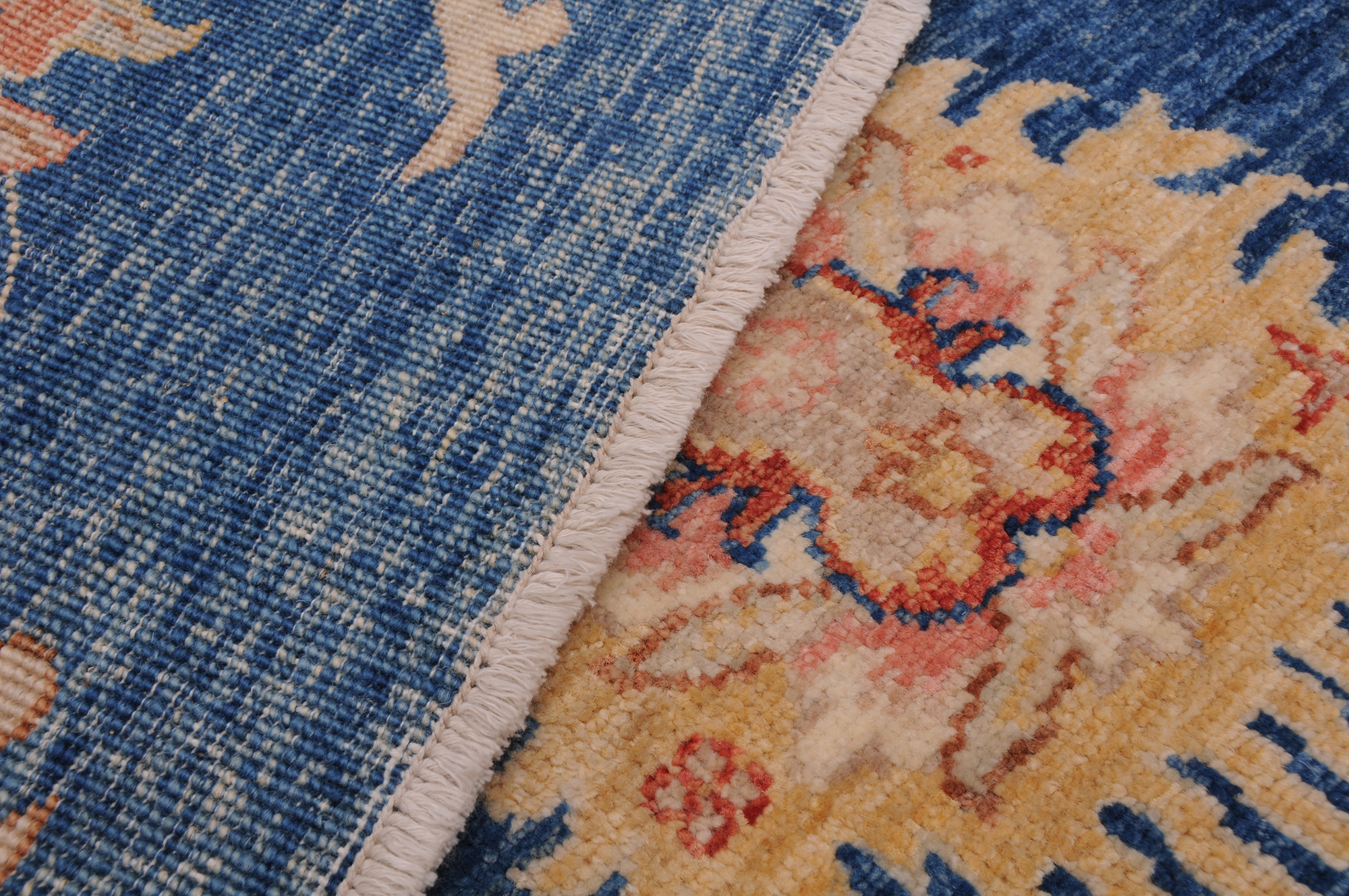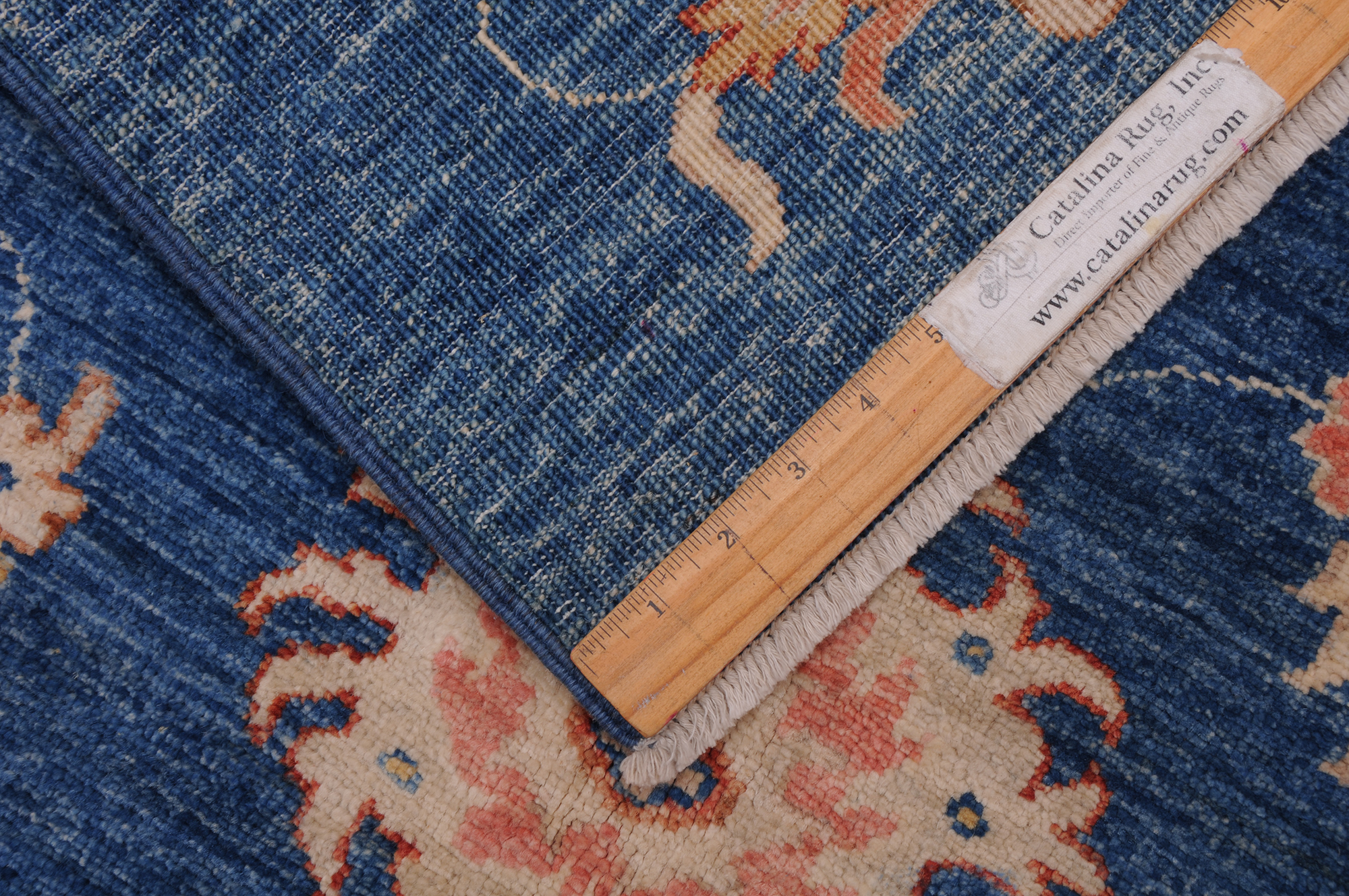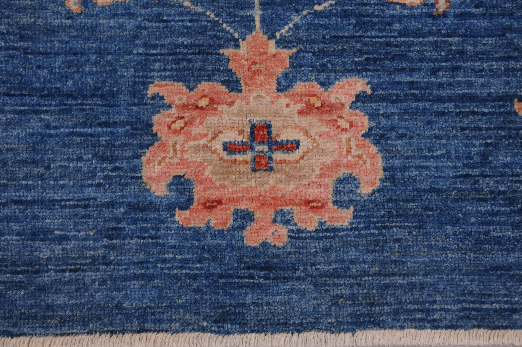 This 6’9″ x 7’10” Oushak rug, hand-knotted in Afghan / Pakistan, features a floral design. Crafted with approx. 156 kpsi, its field color is Blue with a Blue border. The rug has a low medium pile 1/4″-1/3″ and a 100% wool pile, in excellent & washed condition.