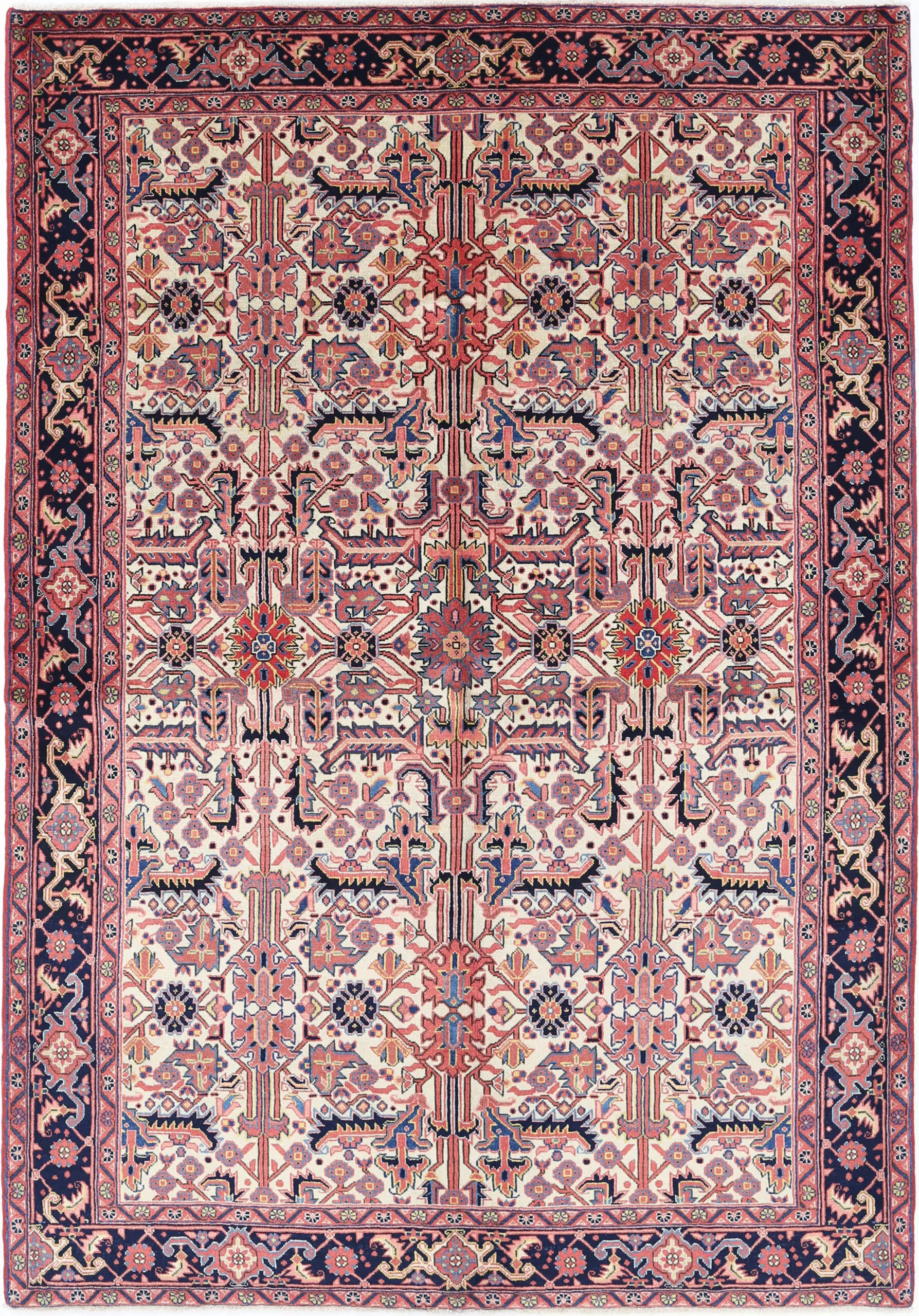 This Persian rug is a stunning piece with a rich history. Aged 40-50 years, it features a beautiful combination of green, pink, yellow, and peach colors. Made from 100% wool with a high pile of 1/2″-5/8″, it has a knot density of approximately 144 KPSI. The allover design and beige background add to its timeless appeal. Measuring 6’9″ x 9’9″, this Heriz rug is a true masterpiece.