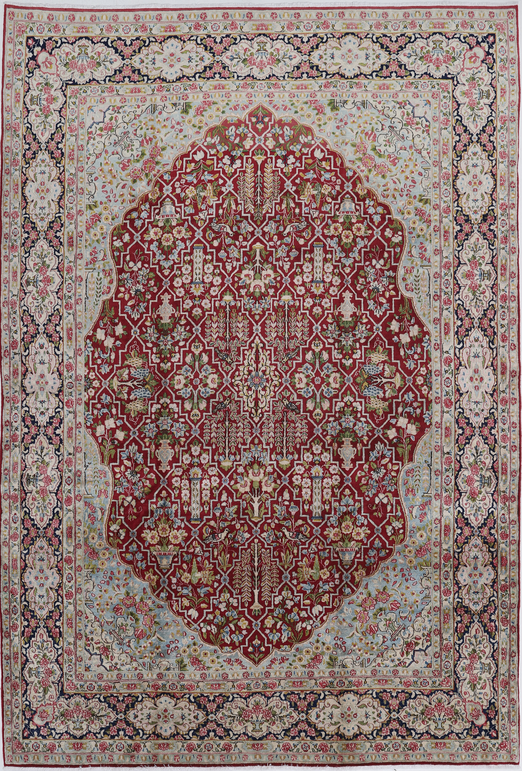This 7’10” x 11’10” Kerman rug, hand-knotted in Persian, features a floral design. It is woven with Approx.289 KPS, showcasing a field in Red and a Blue border. The rug has a Medium Pile and a 100% Wool pile, and is in excellent condition.