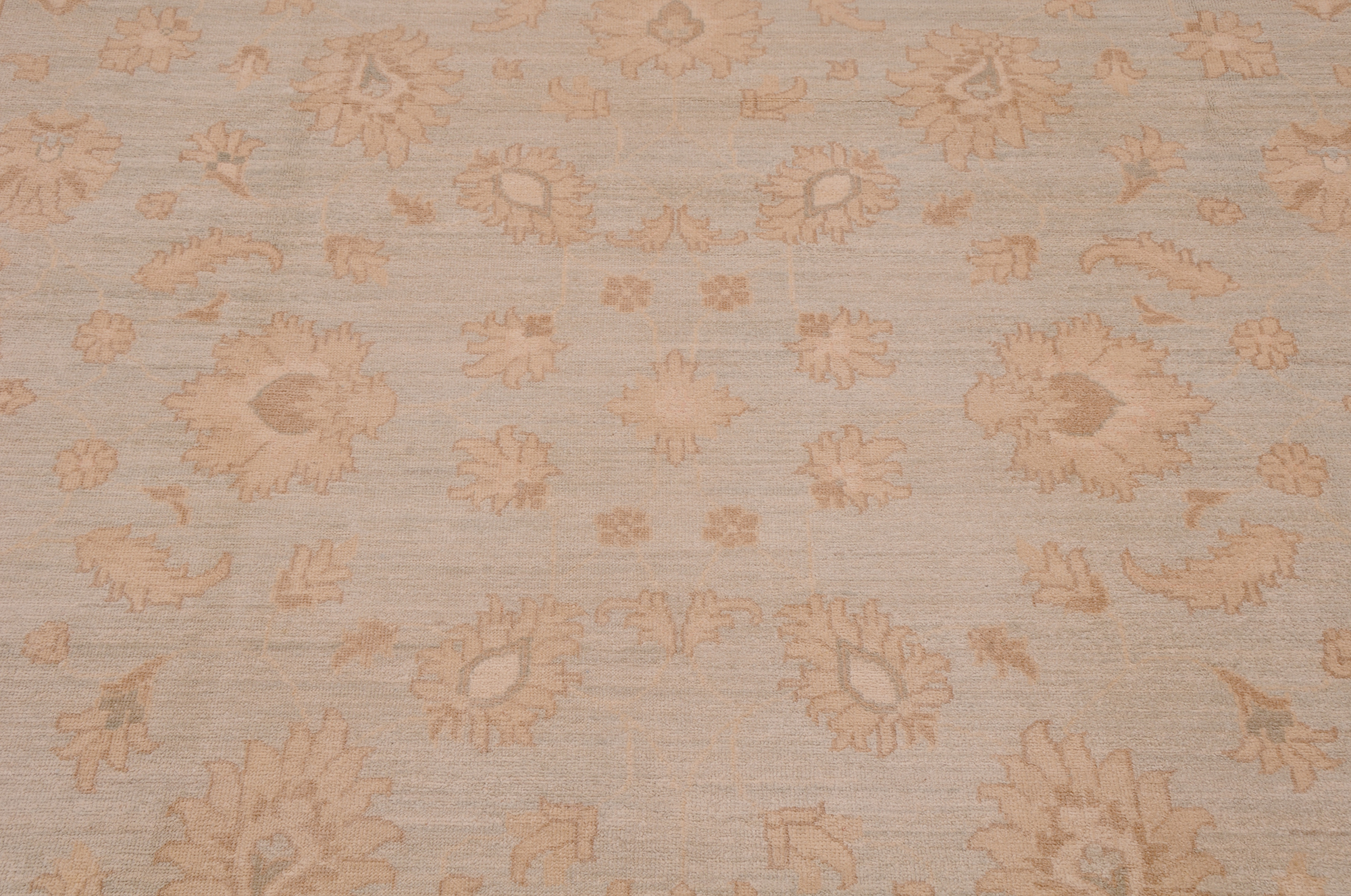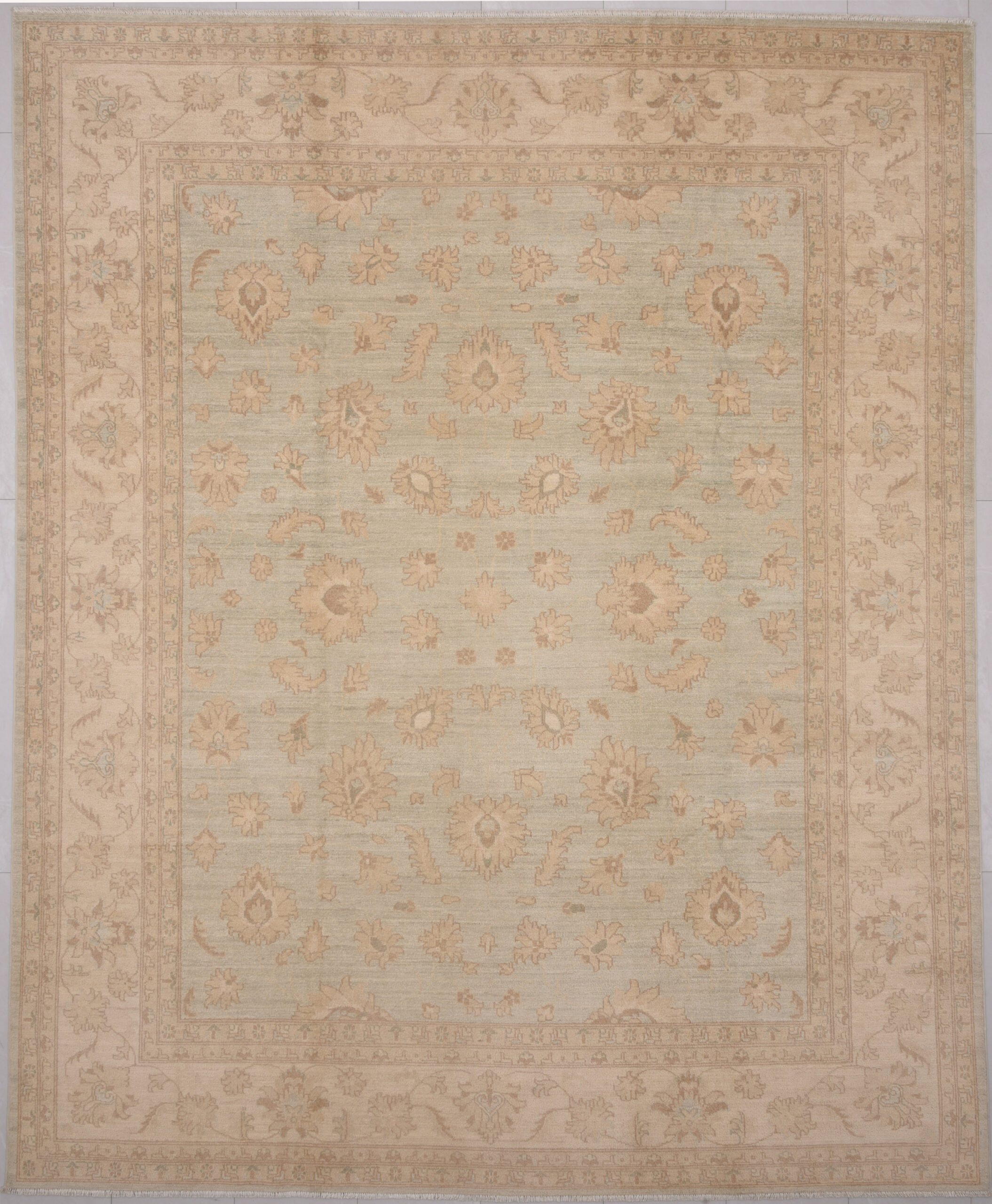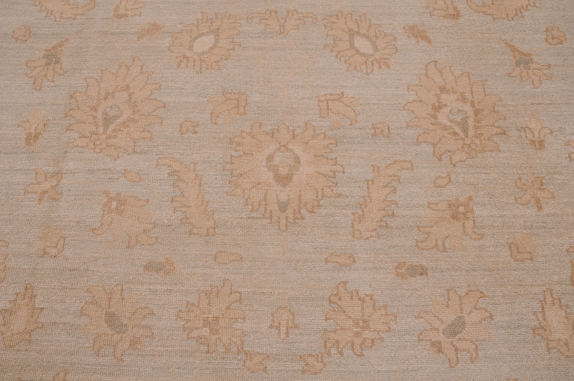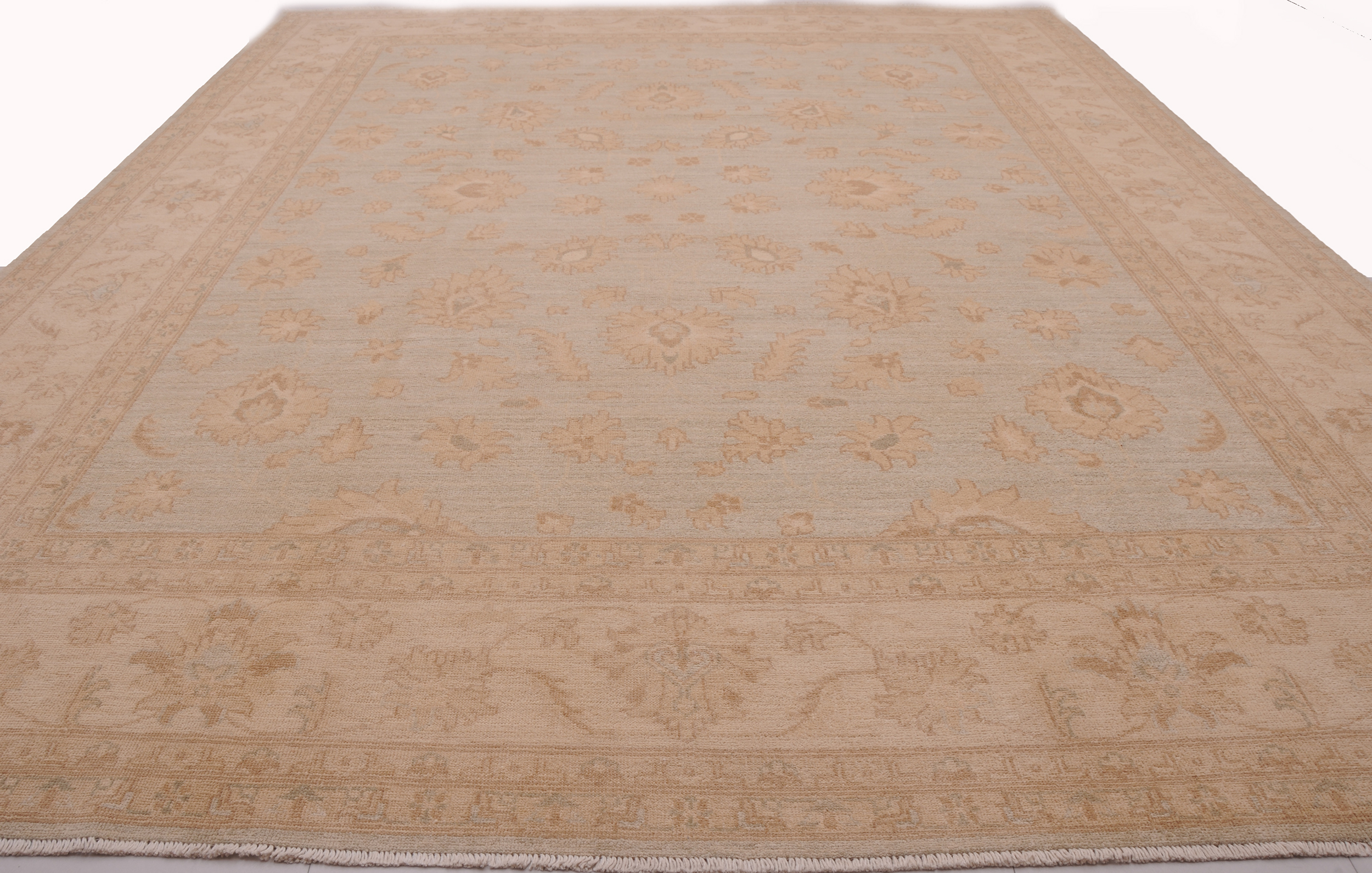 Authentic Oushak hand-knotted rug (7’10” x 9’6″), crafted in Afghanistan/Pakistan. This beautiful blue, beige, and brown floral rug features a low-medium pile (1/4″-1/3″) and boasts approximately 156 KPSI. 100% wool with a cotton foundation.