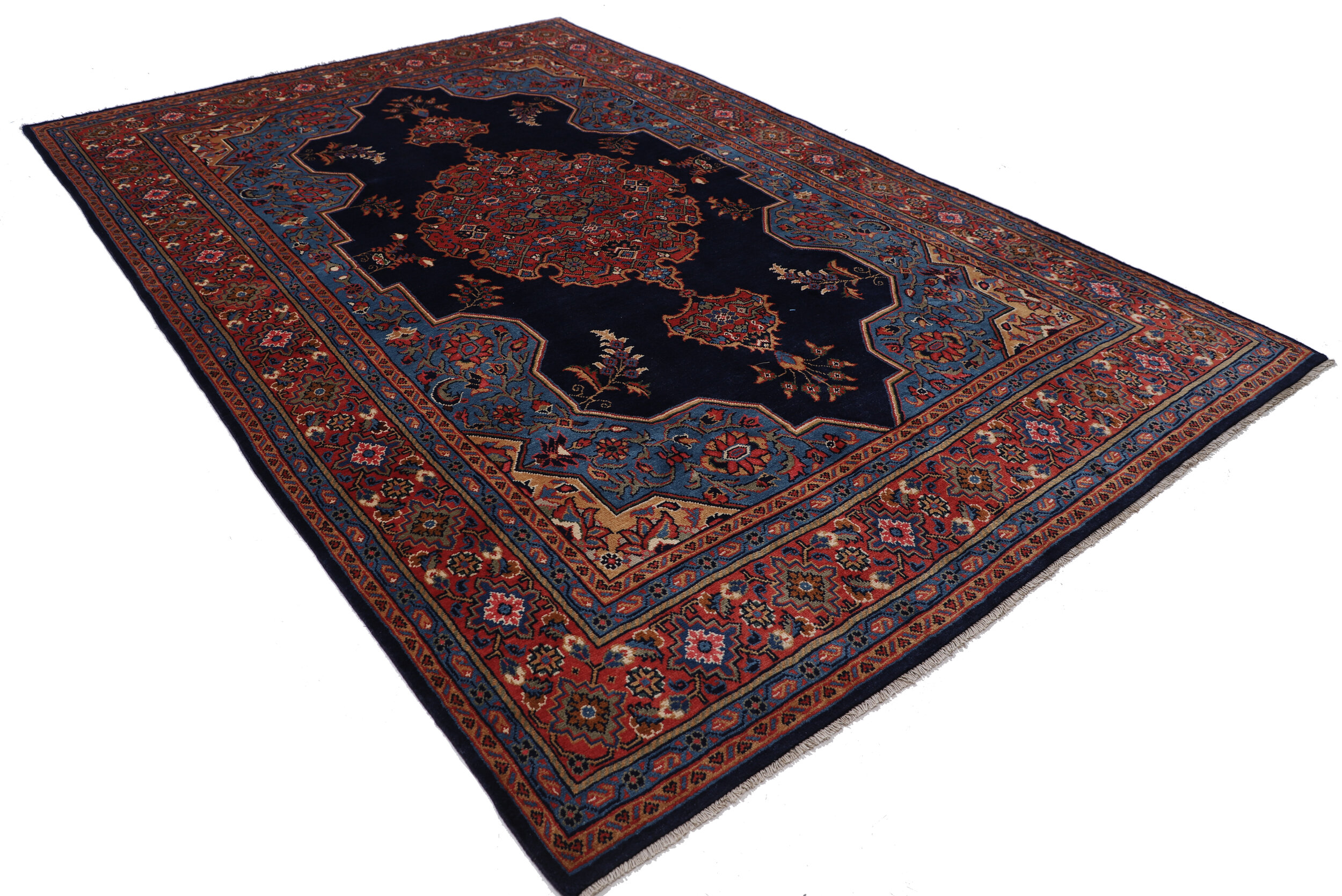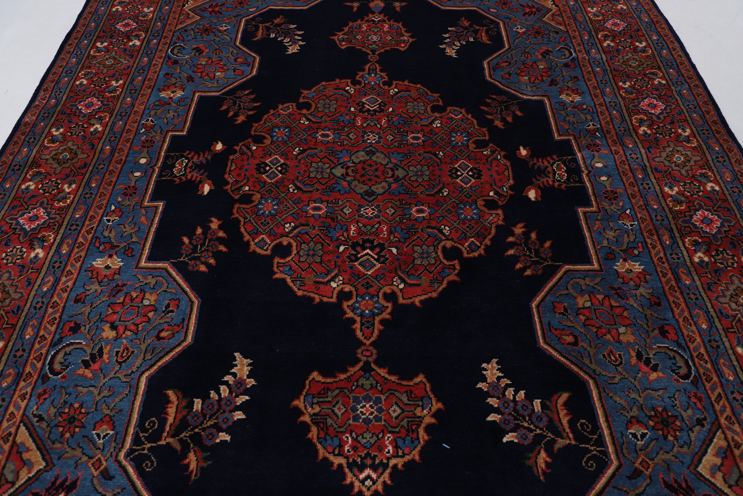 This Mahal rug has a  Blue border with a Red Field featuring a Medallion design. Made with 100% Wool with Cotton foundation. It has a knot density of 120 kpsi.