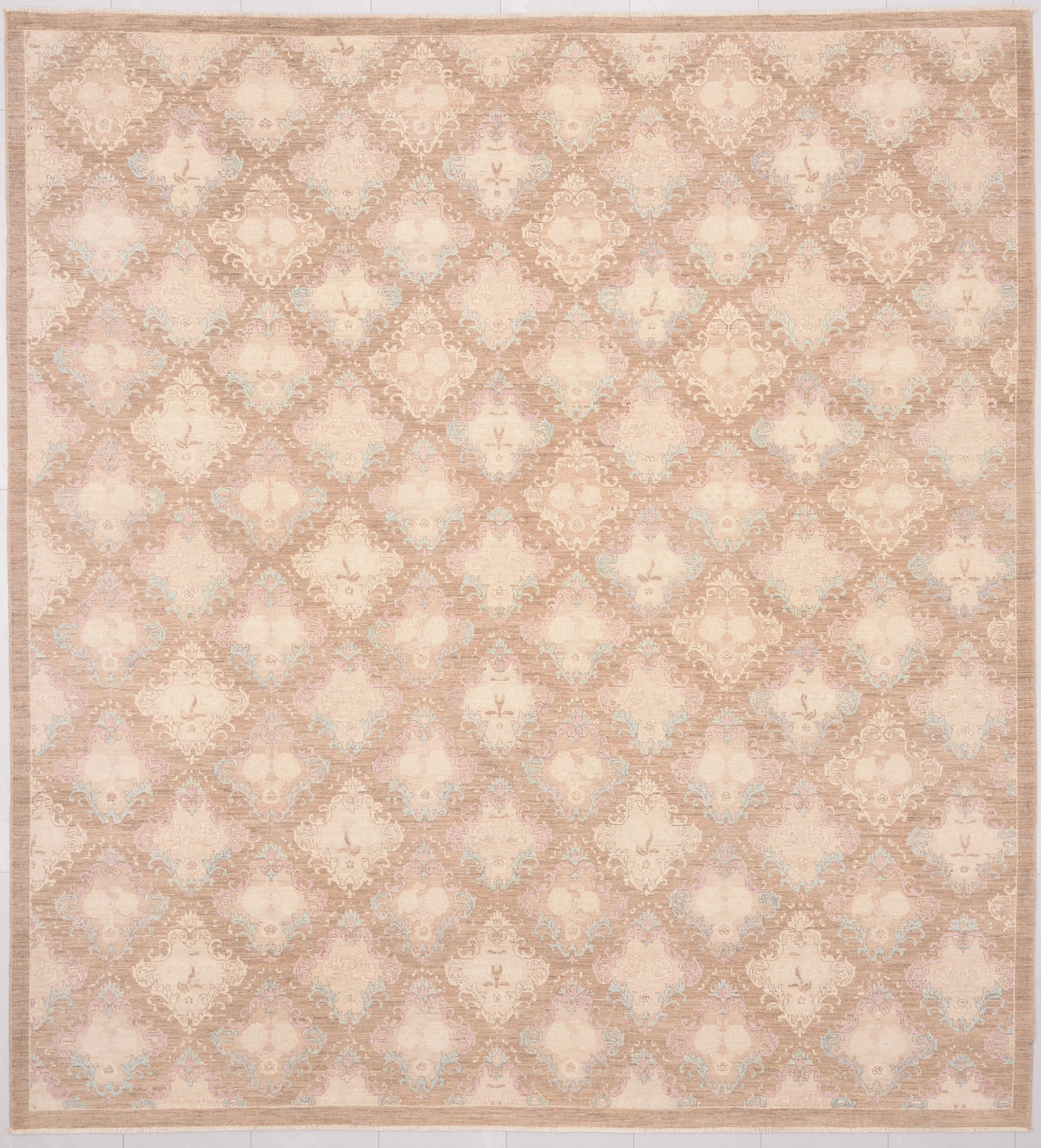 This 8’0″ x 8’9″ Oushak rug, hand-knotted in Afghan / Pakistan, features a allover design. It is woven with Approx. 169 KPSI, showcasing a field in Brown and a Beige border. The rug has a Low Medium Pile and a 100% Wool pile, and is in excellent condition.