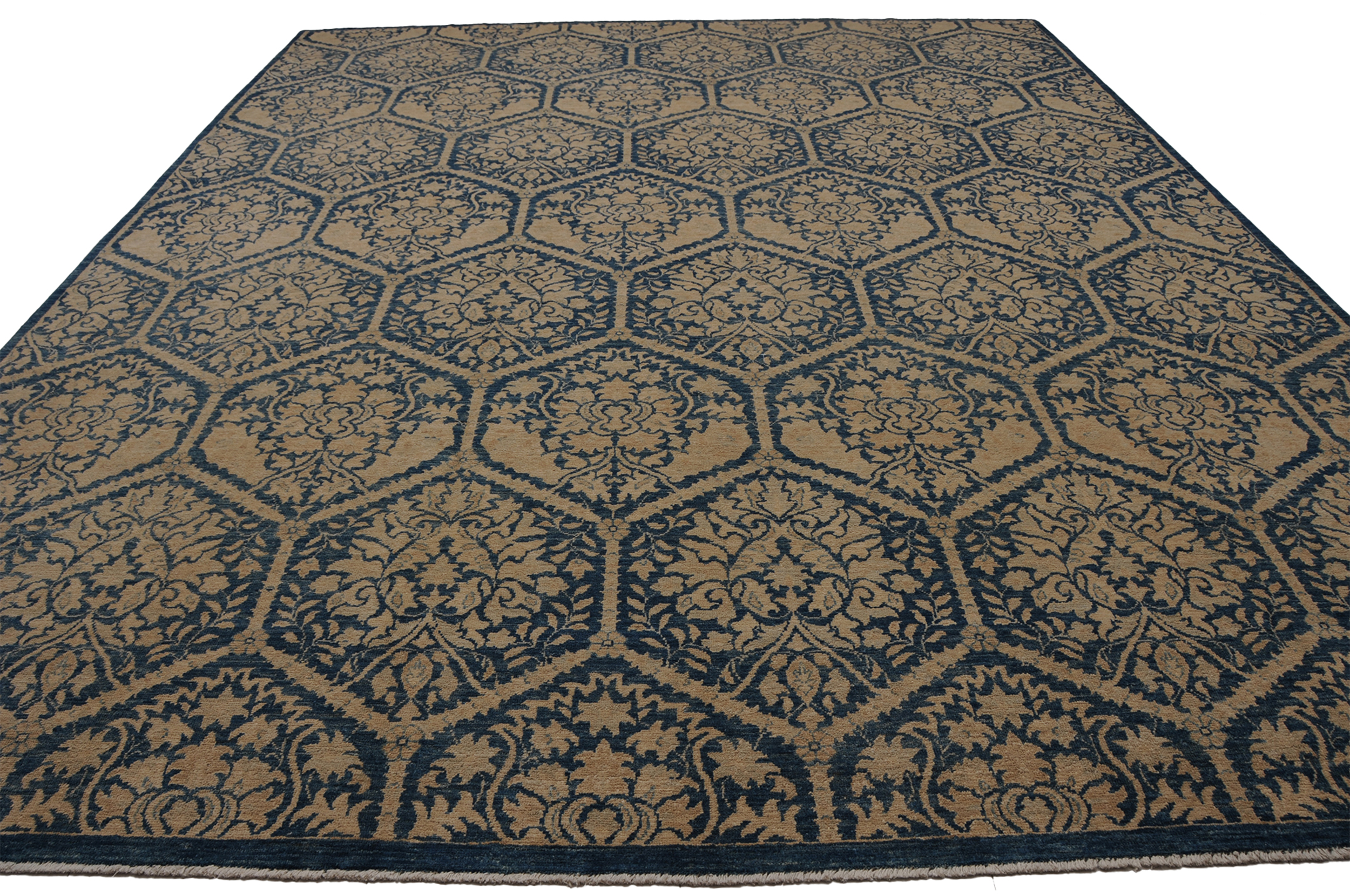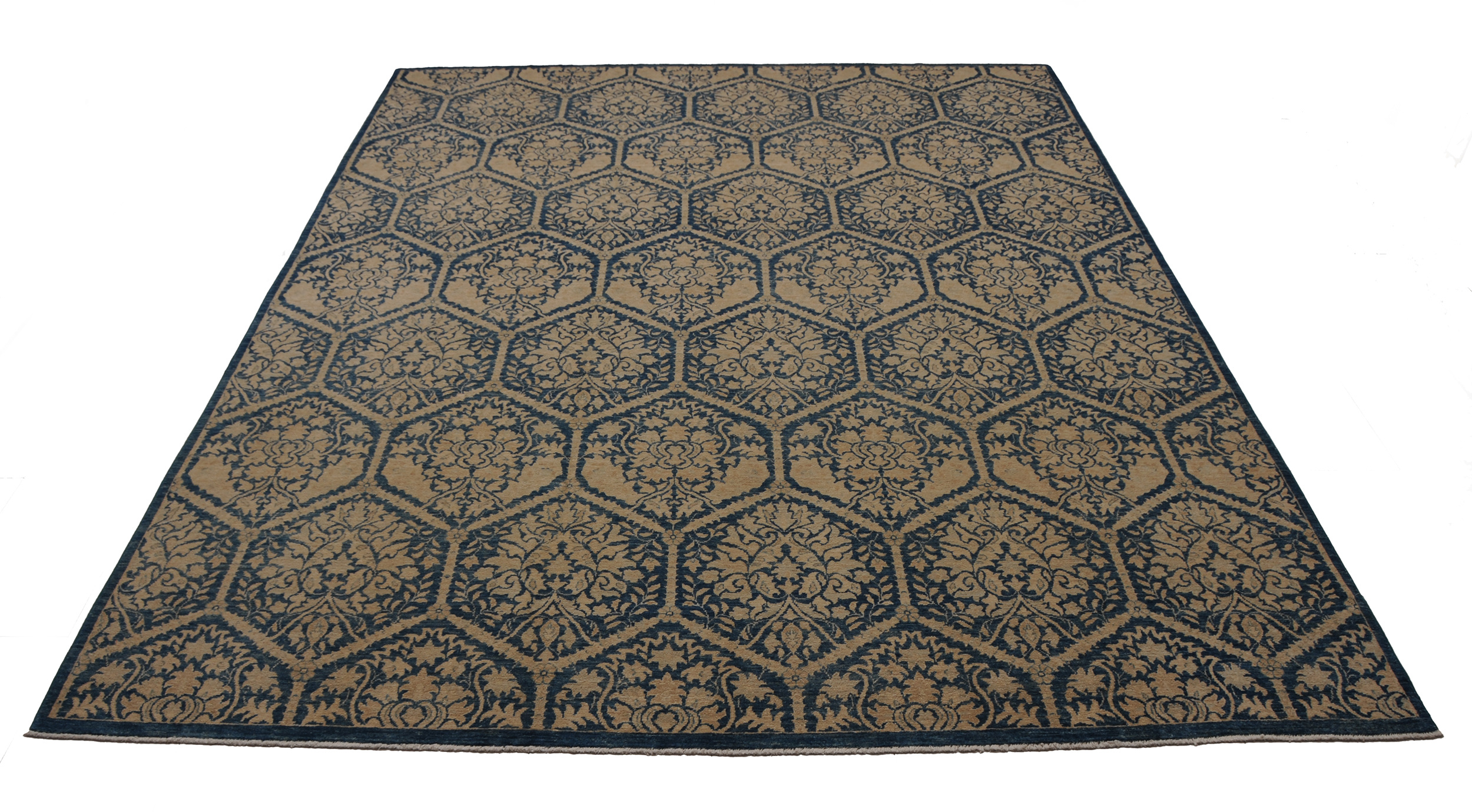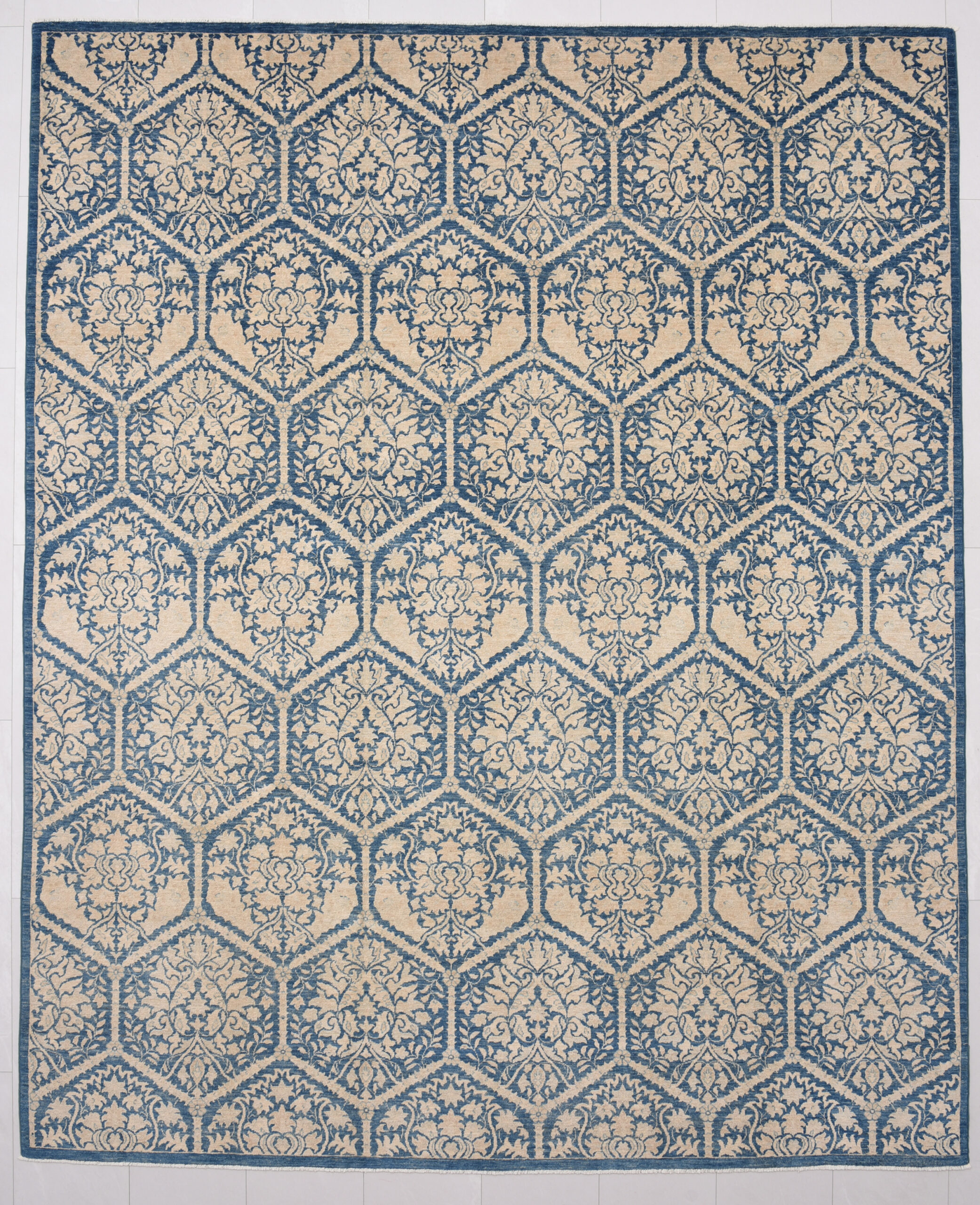 This 8’0″ x 9’9″ Oushak rug, hand-knotted in Afghan / Pakistan, features a panel design. It is woven with Approx. 196KPSI, showcasing a field in Blue and a Blue border. The rug has a Low Medium Pile and a 100% Wool pile, and is in excellent condition.