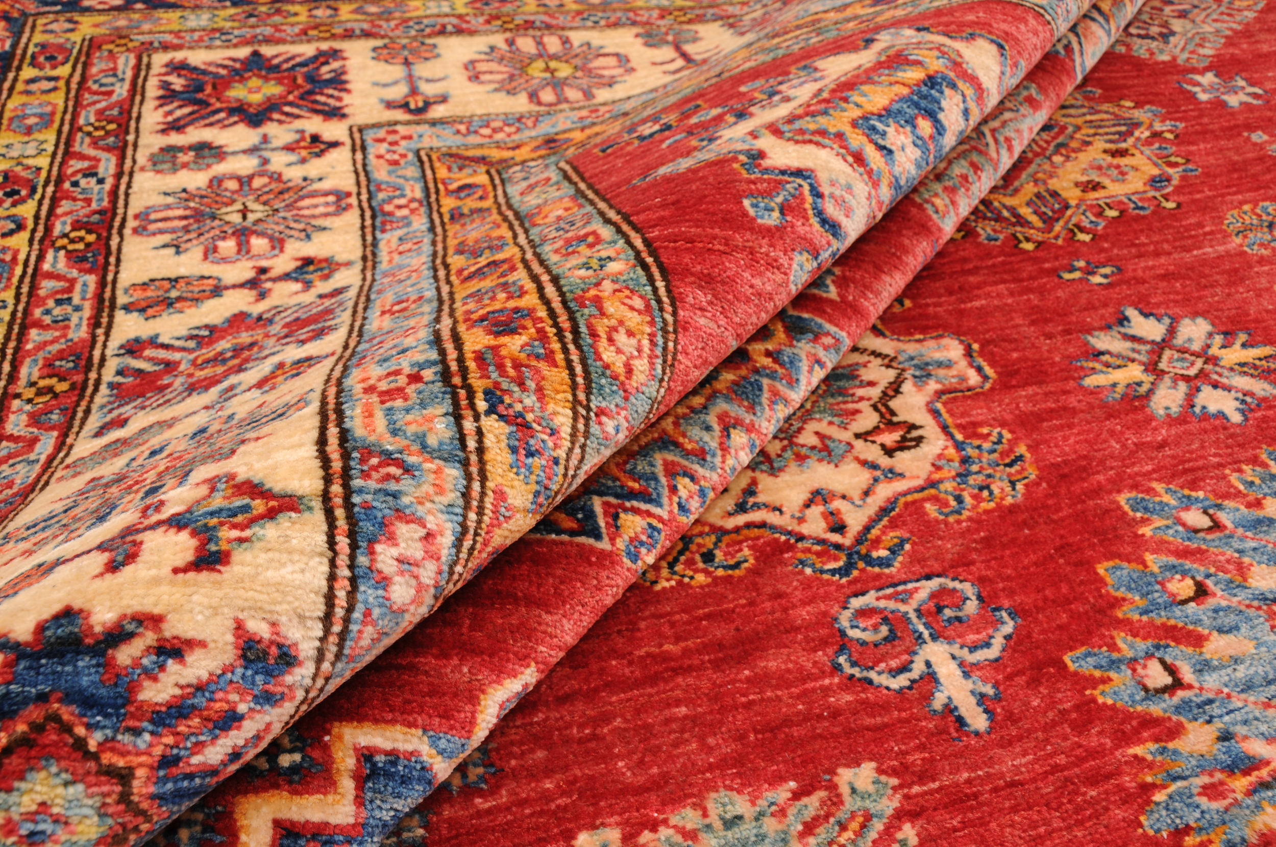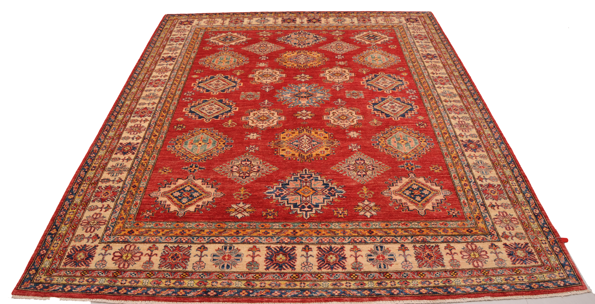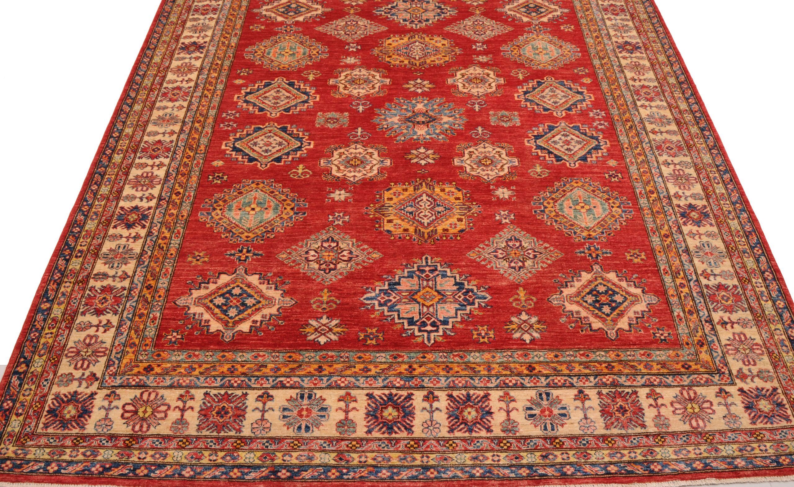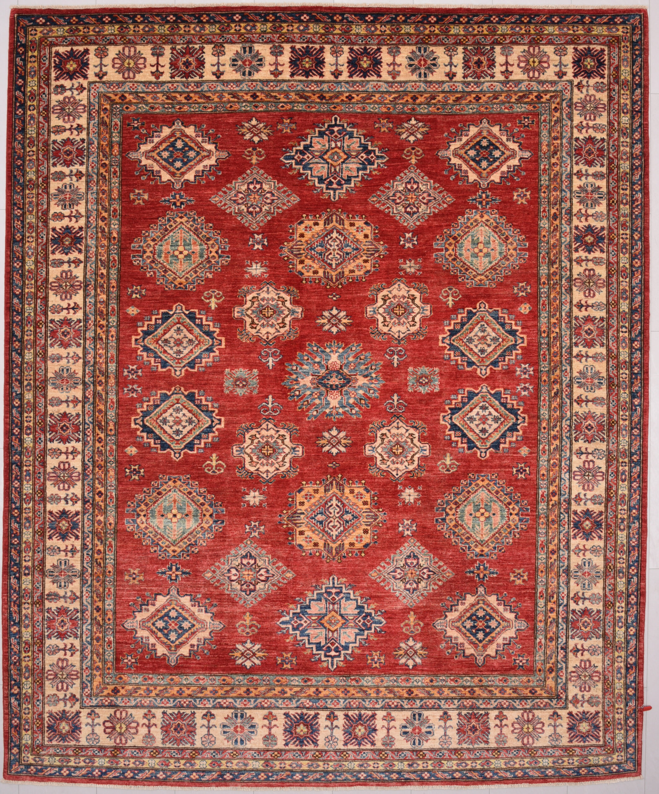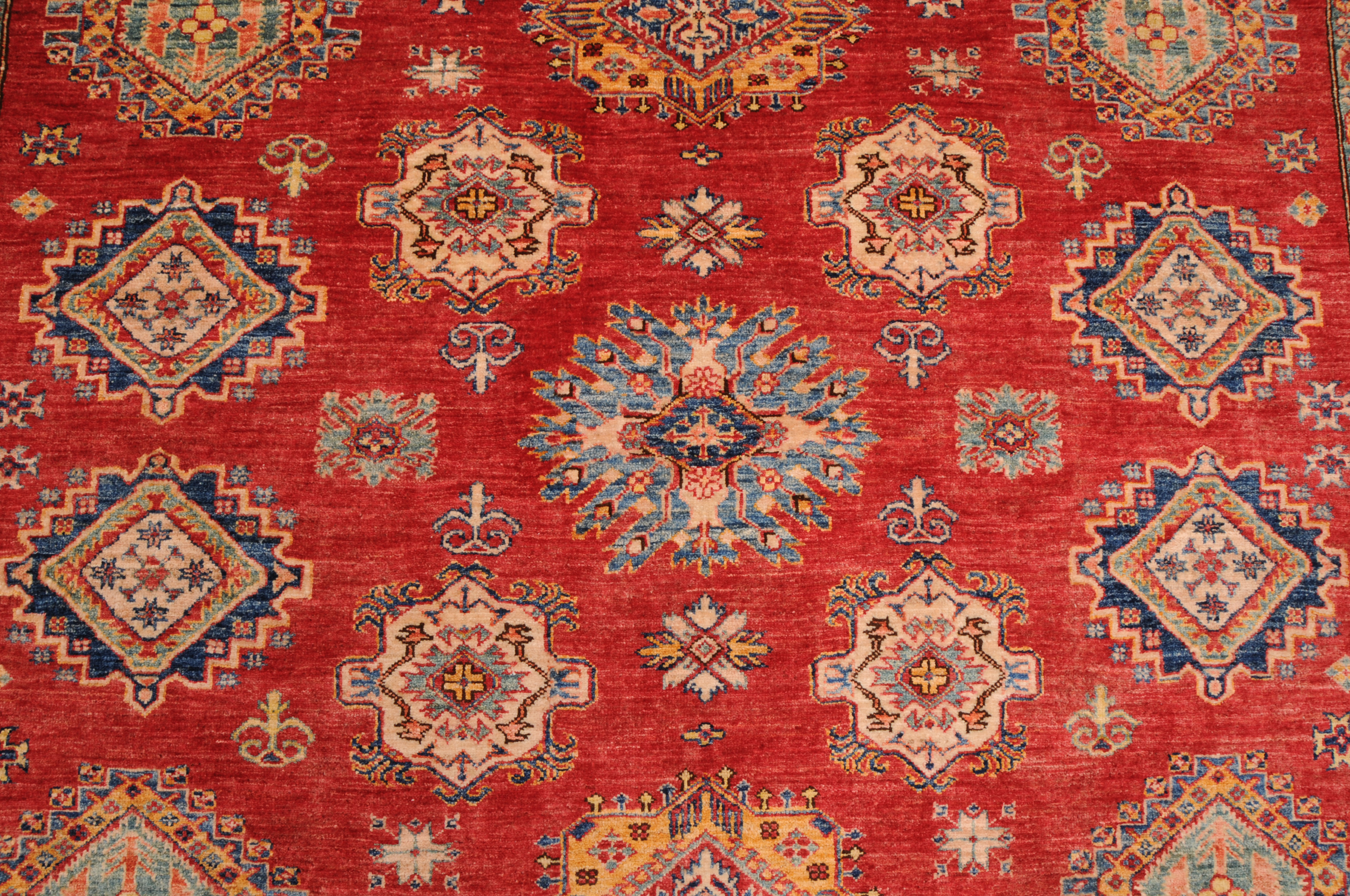 Authentic hand-knotted Kazak rug (8’1″ x 9’10”), crafted in Afghanistan/Pakistan. This vibrant rug features a geometrical design in red, beige, orange, green, and blue on a wool foundation with a low-medium pile. Approx. 156 KPSI. New condition.