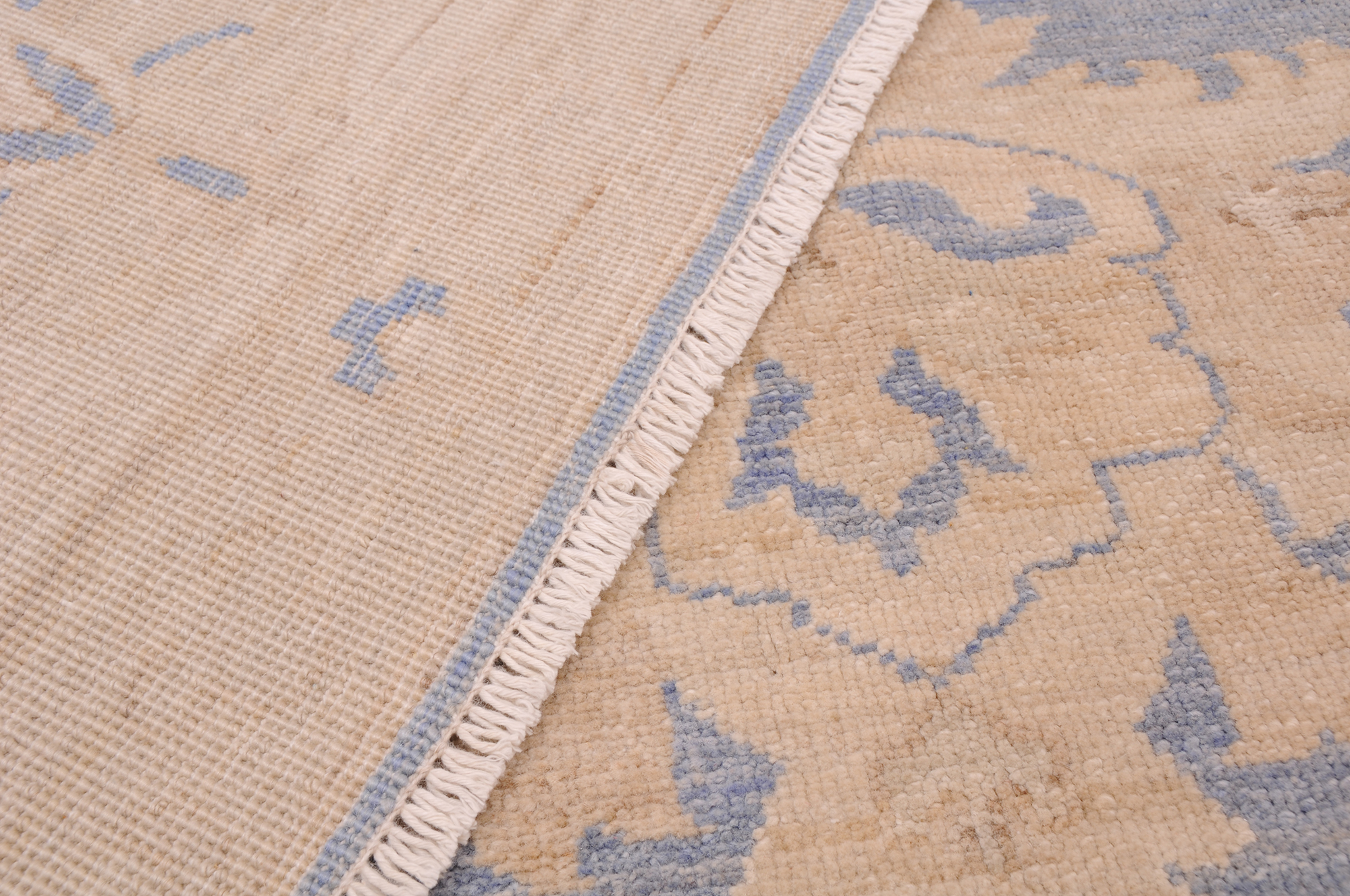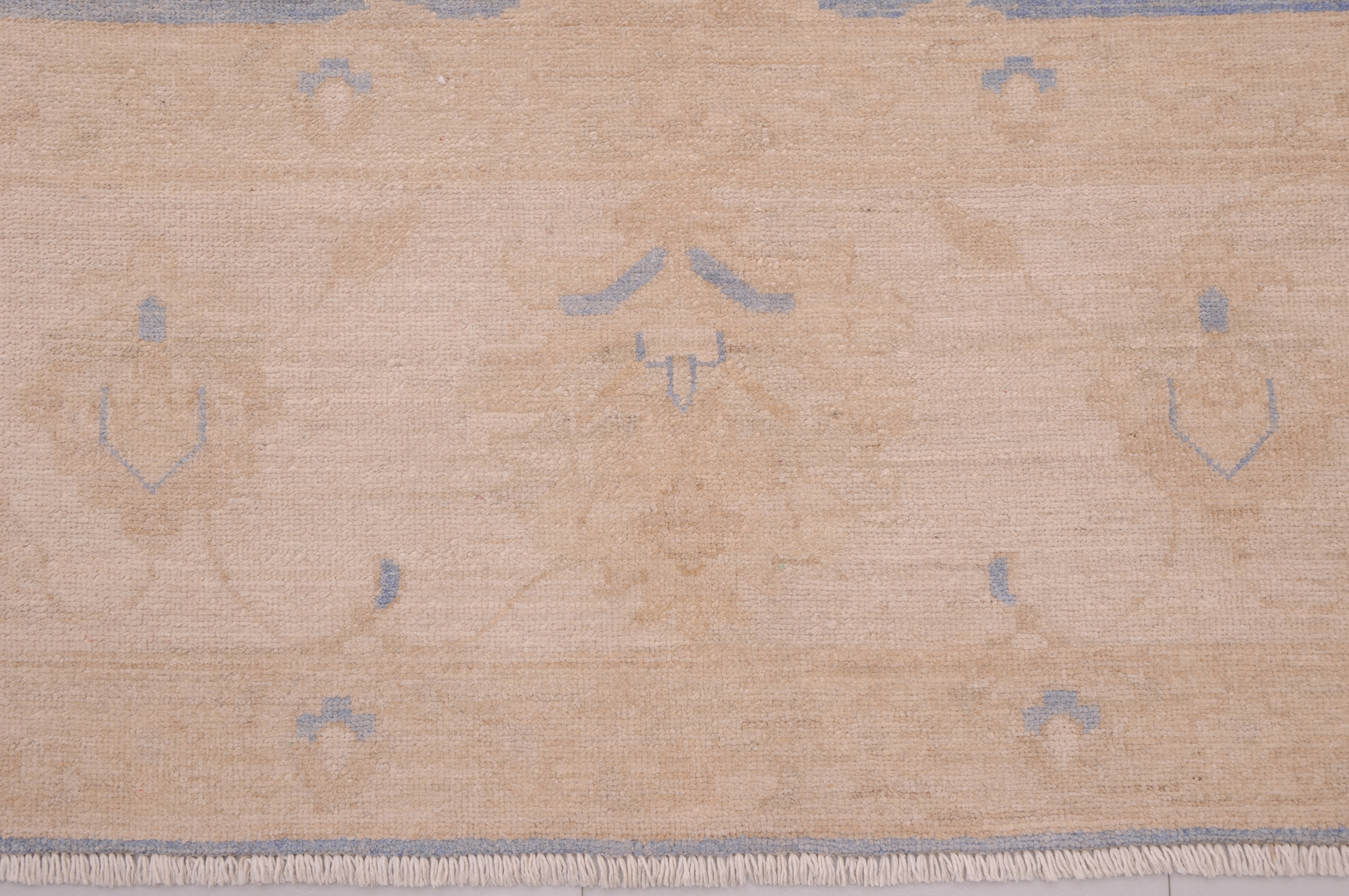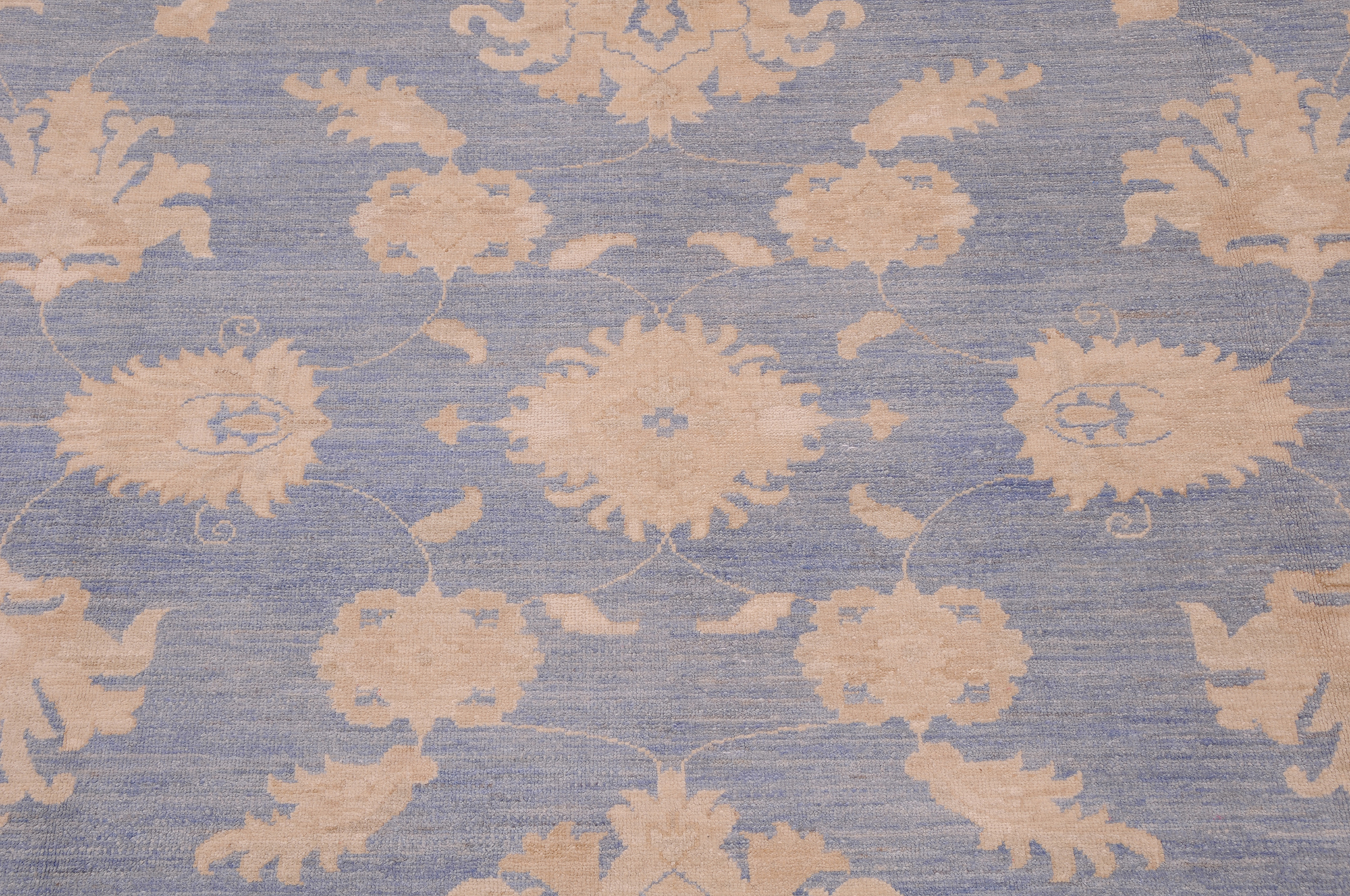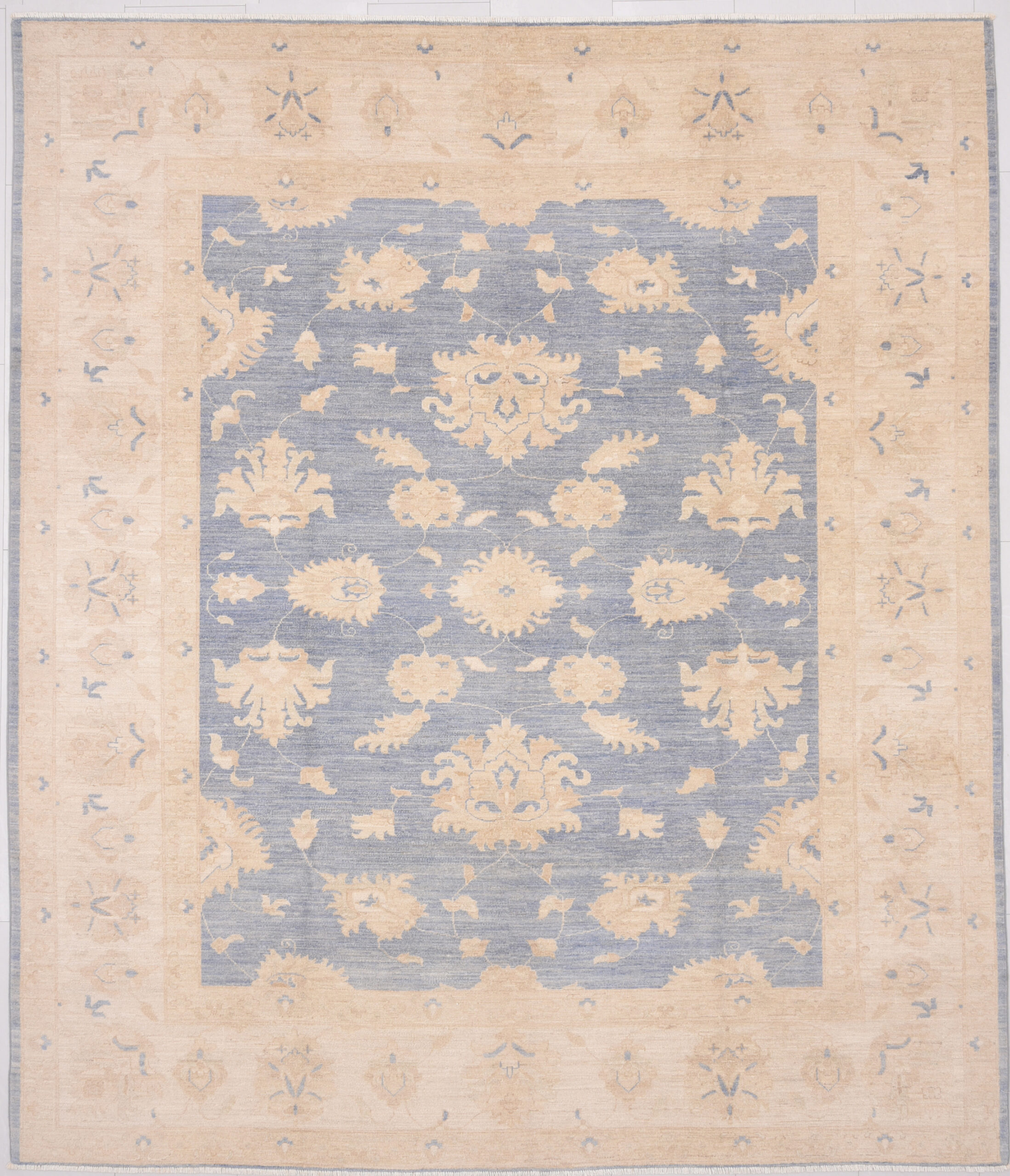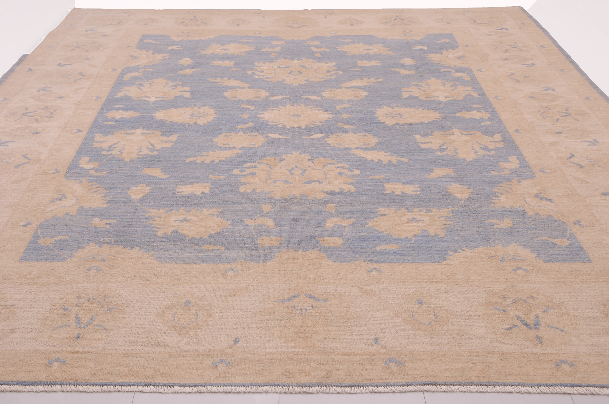 This 8’1″ x 9’4″ Oushak rug, hand-knotted in Afghan / Pakistan, features a floral design. Crafted with approx. 156 kpsi, its field color is Green with a Beige border. The rug has a low medium pile 1/4″-1/3″ and a 100% wool pile, in excellent & washed condition.