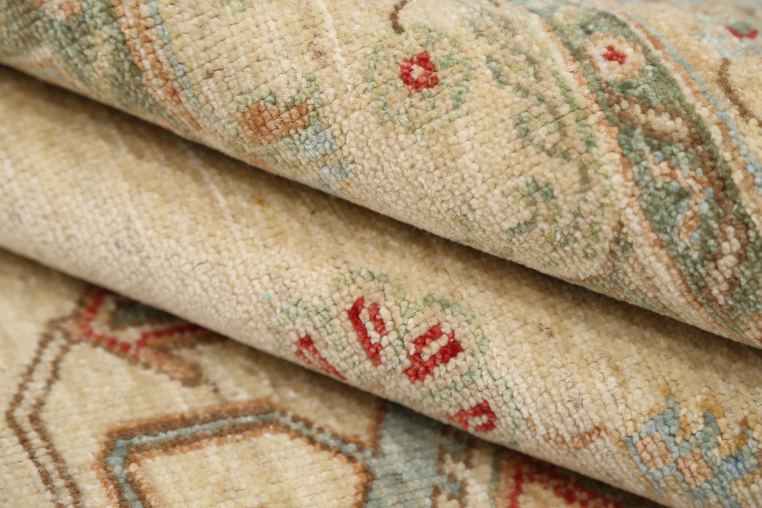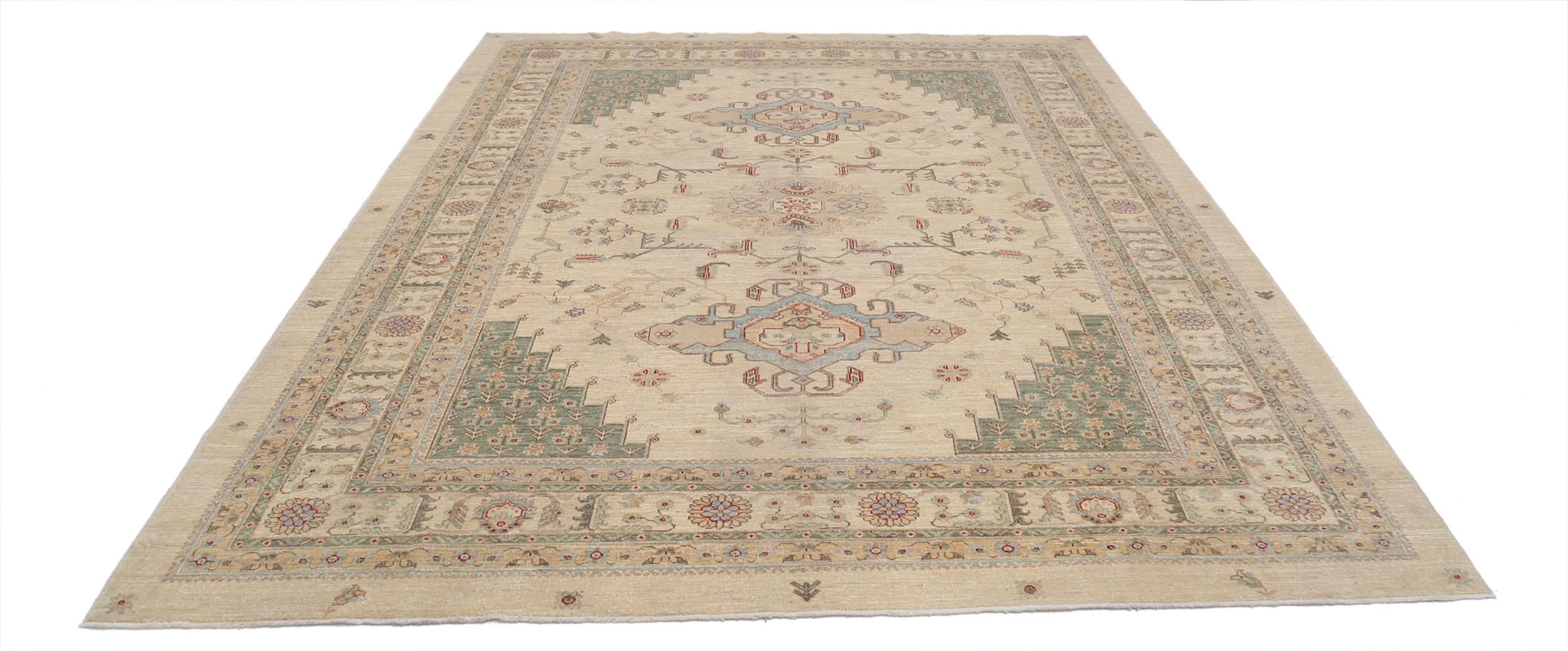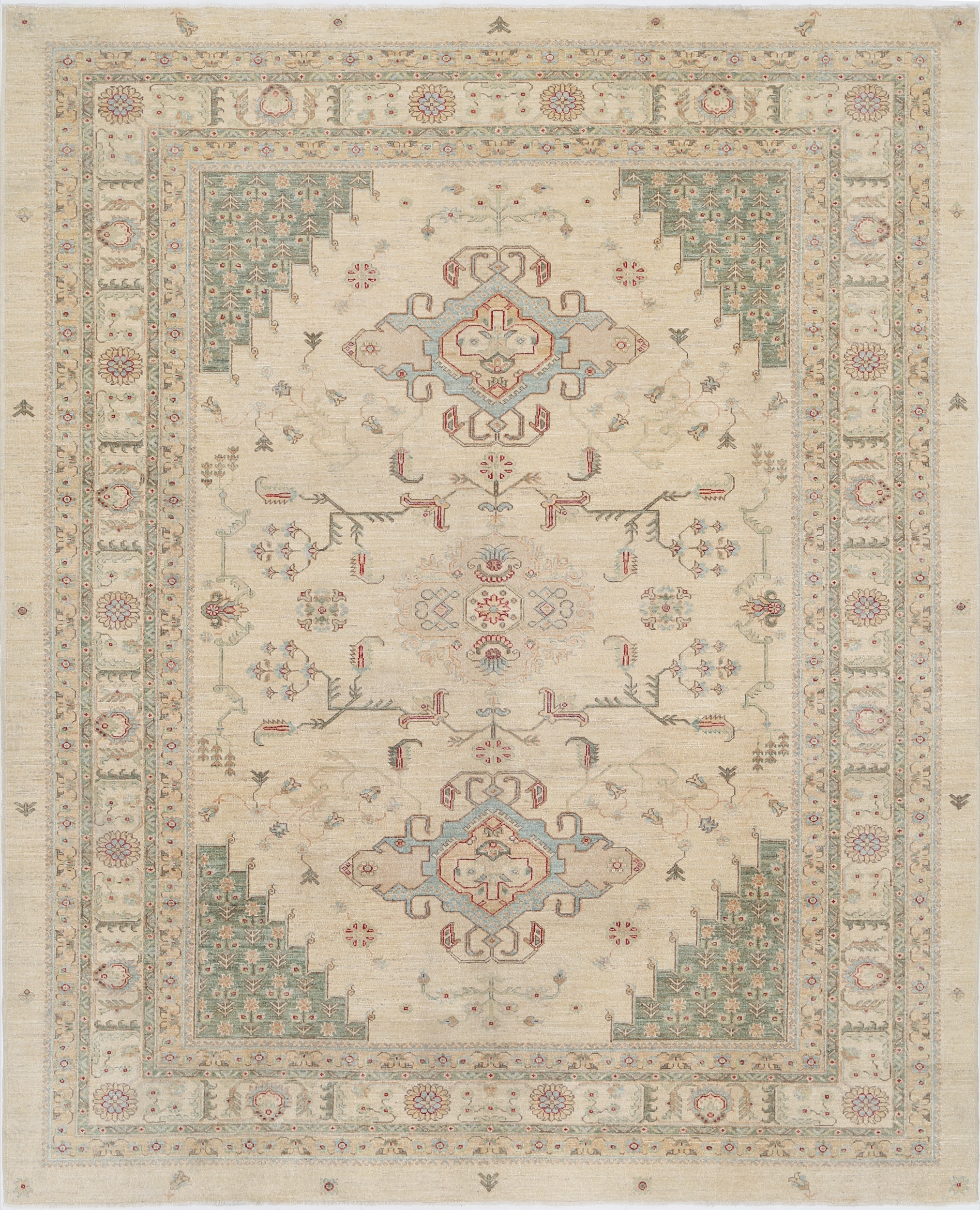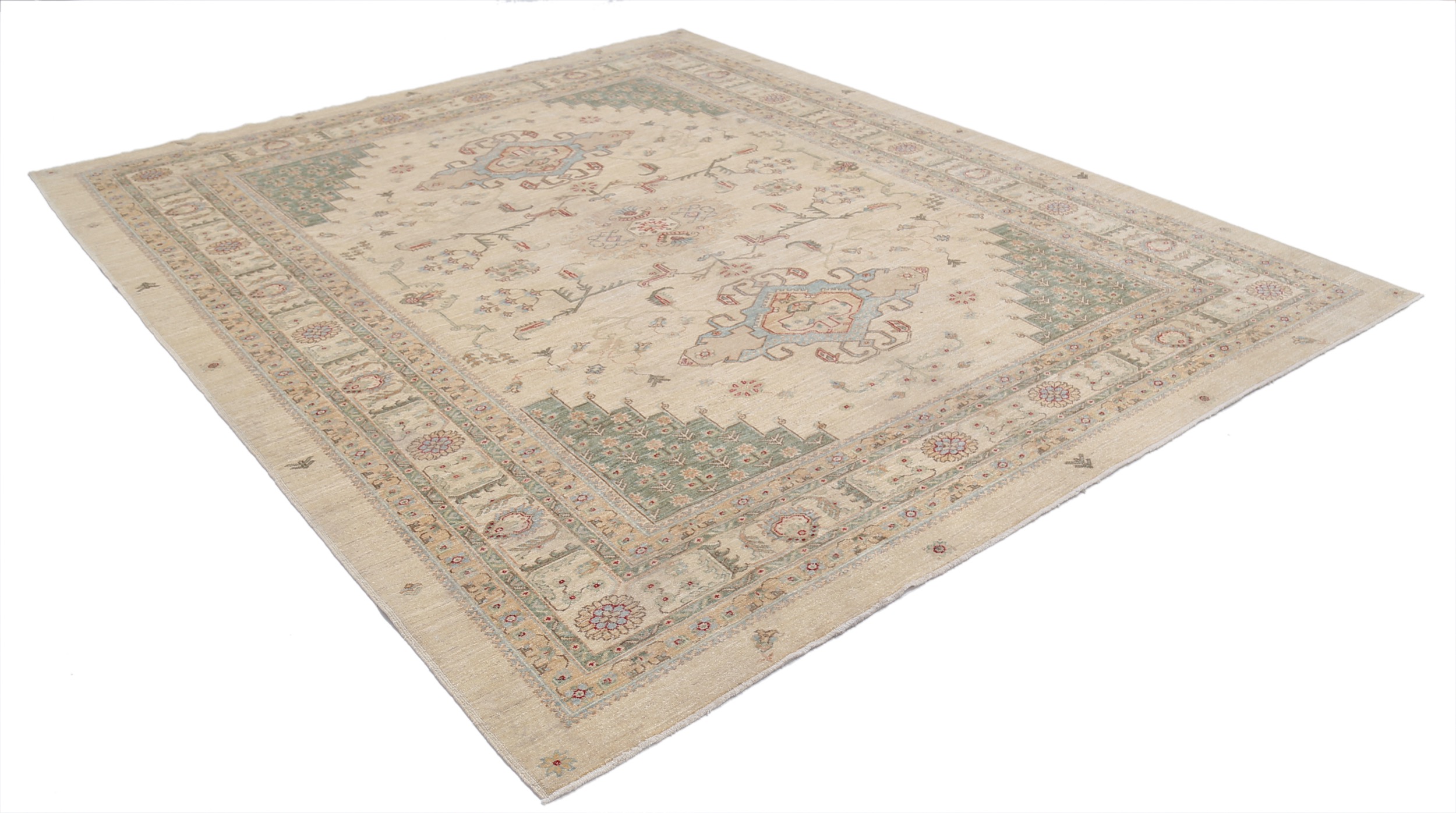 Authentic hand-knotted Oushak rug (8’1″ x 9’9″), crafted in Afghanistan/Pakistan. This beautiful beige rug features a geometric design in shades of green, red, and blue, boasting approximately 156 KPSI and a low-medium pile (1/4″-1/3″). 100% wool with a cotton foundation. New.