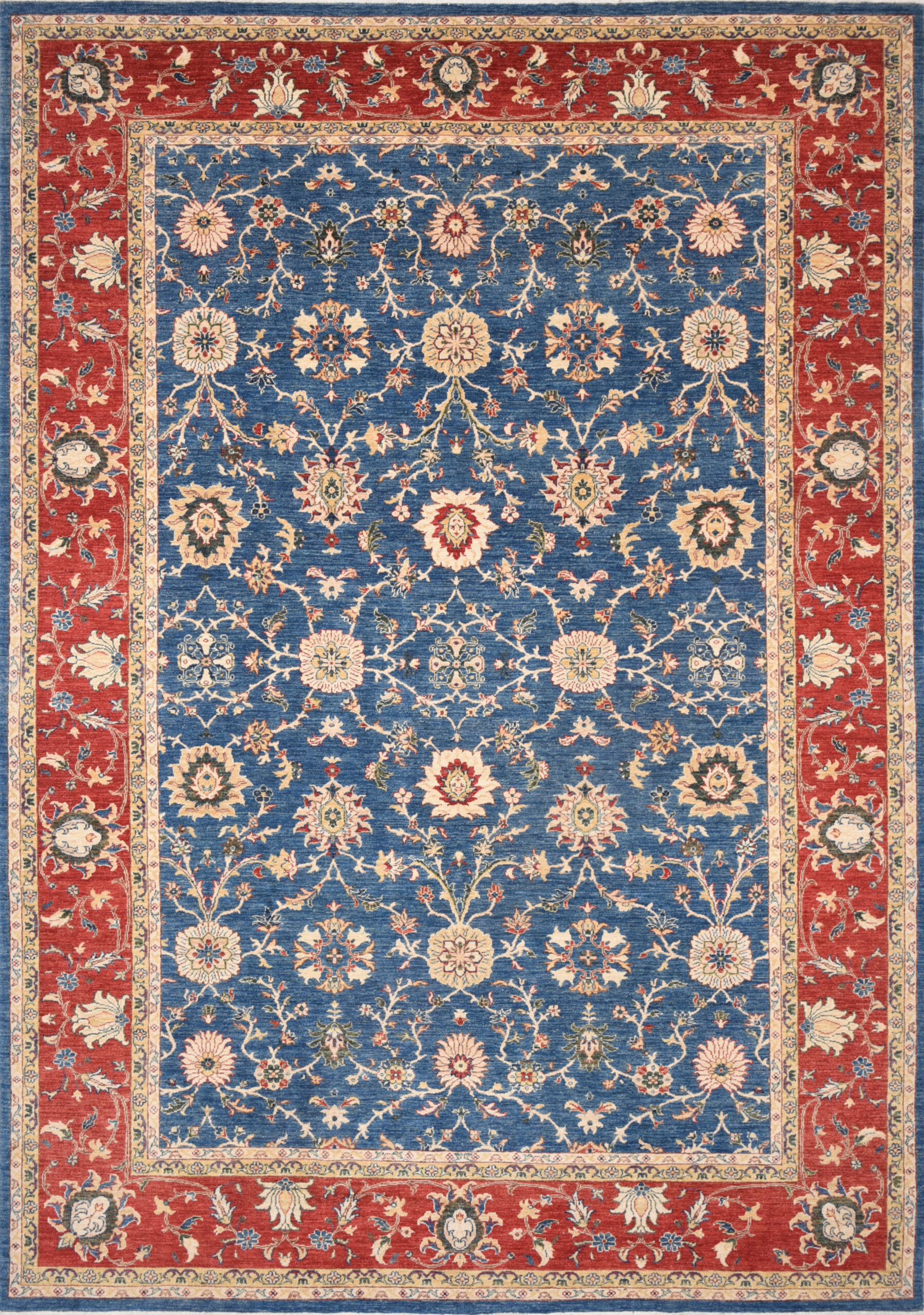 This 8’1″ x 11’6″ Oushak rug, hand-knotted in Afghan / Pakistan, features a allover design. It is woven with Approx. 169KPSI, showcasing a field in Blue and a Red border. The rug has a Low Medium Pile and a 100% Wool pile, and is in excellent condition.