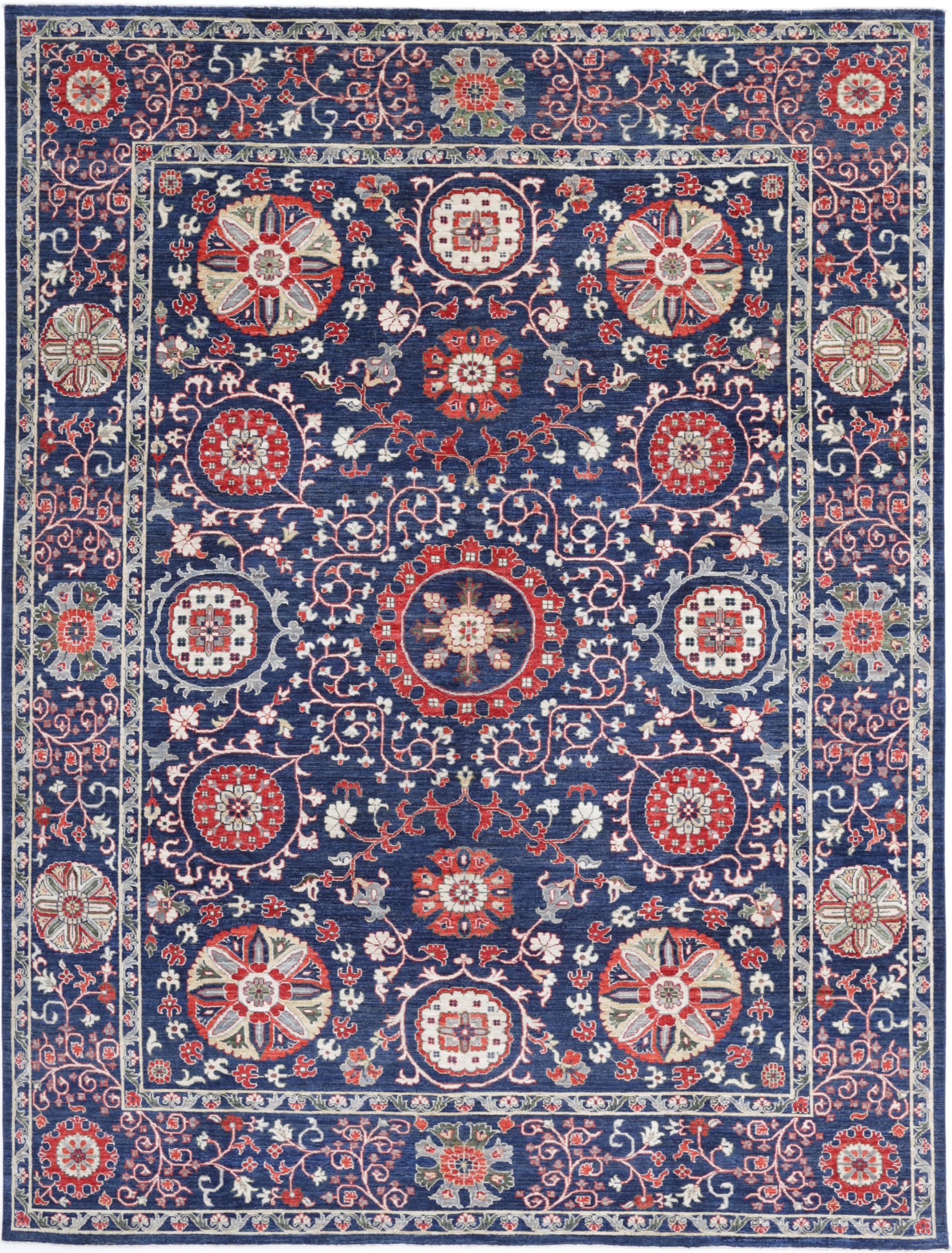This 8’10” x 11’10” Oushak rug, hand-knotted in Afghan / Pakistan, features a allover design. It is woven with Approx. 169 KPSI, showcasing a field in Blue and a Blue border. The rug has a Low Medium Pile and a 100% Wool pile, and is in excellent condition.