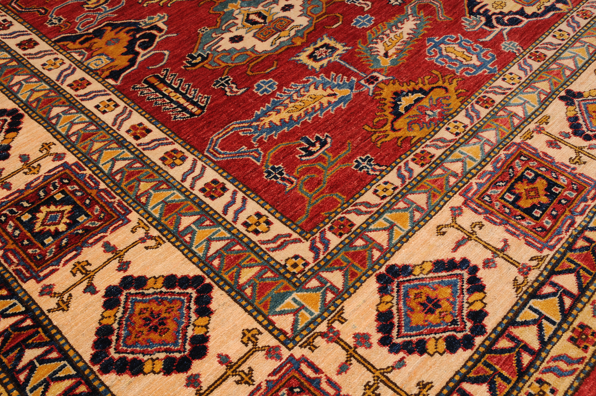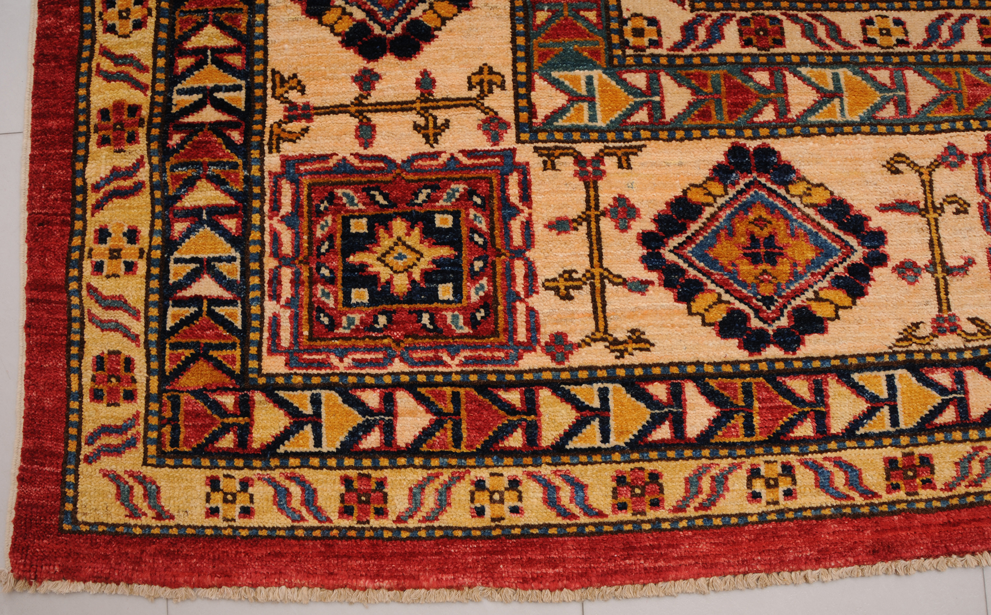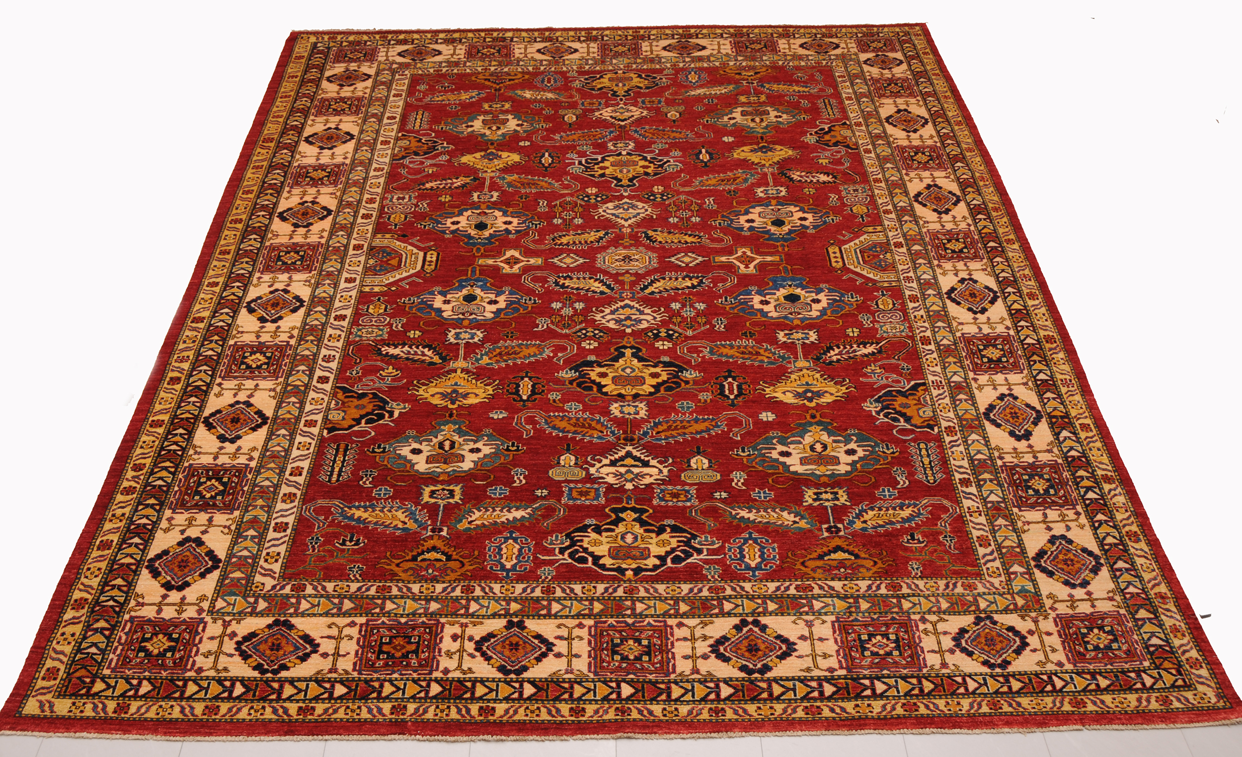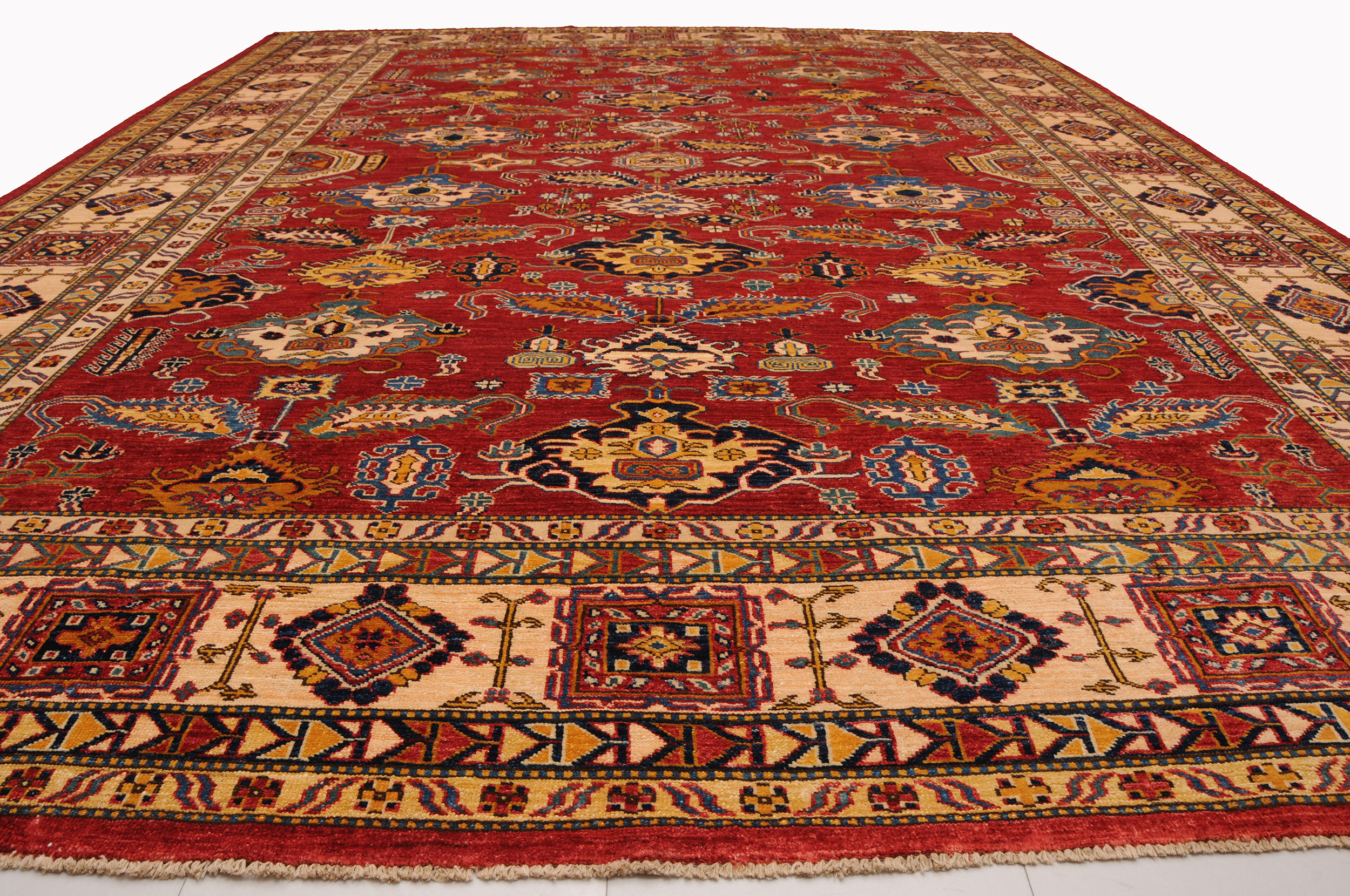 This 8’10” x 11’4″ Super Kazak rug, hand-knotted in Afghan / Pakistan, features a geometric design. It is woven with Approx. 169 KPSI, showcasing a field in Red and a Beige border. The rug has a Low Medium Pile and a 100% Wool pile, and is in excellent condition.