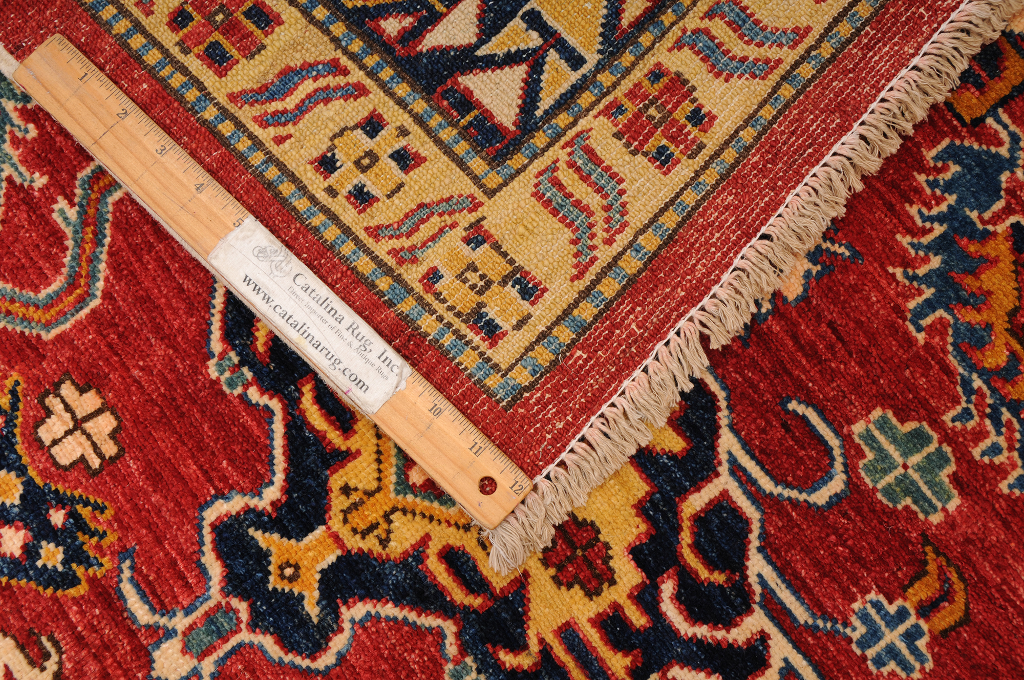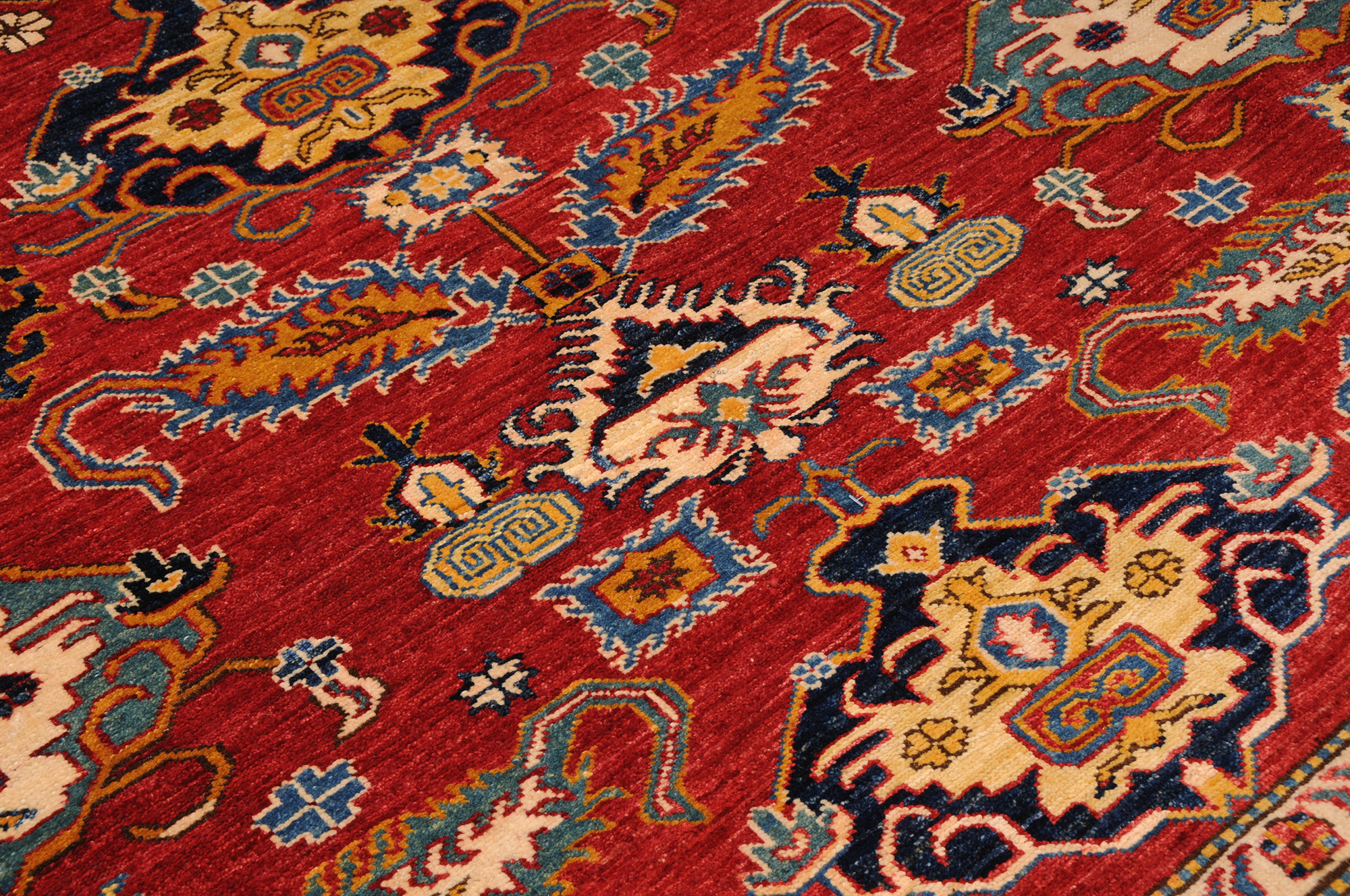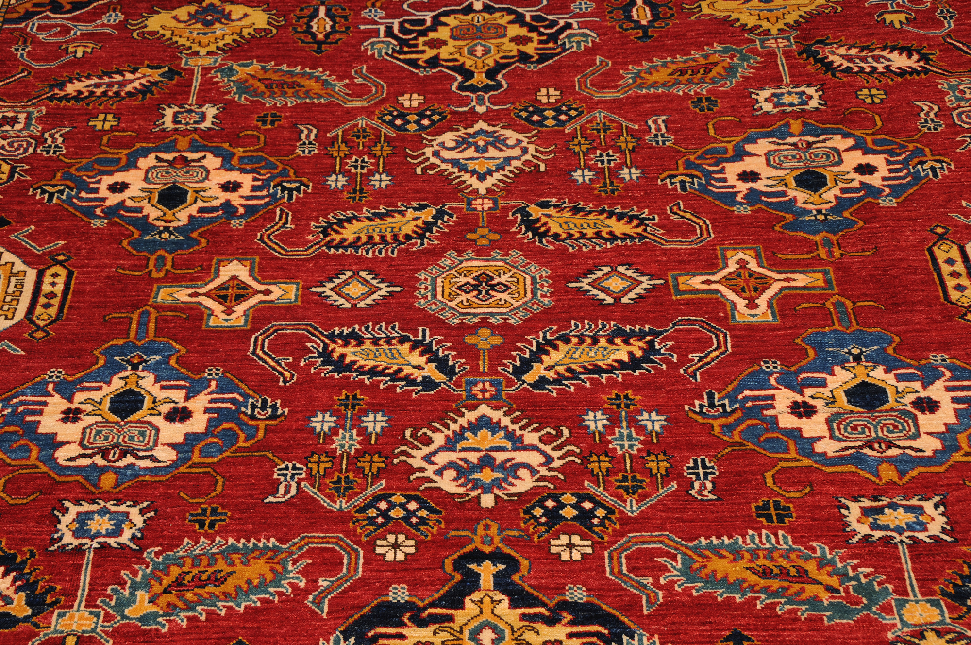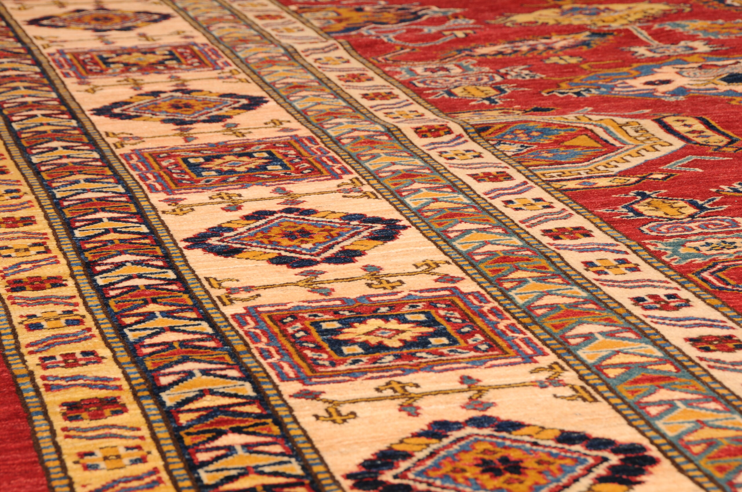 This 8’10” x 11’4″ Super Kazak rug, hand-knotted in Afghan / Pakistan, features a geometric design. It is woven with Approx. 169 KPSI, showcasing a field in Red and a Beige border. The rug has a Low Medium Pile and a 100% Wool pile, and is in excellent condition.