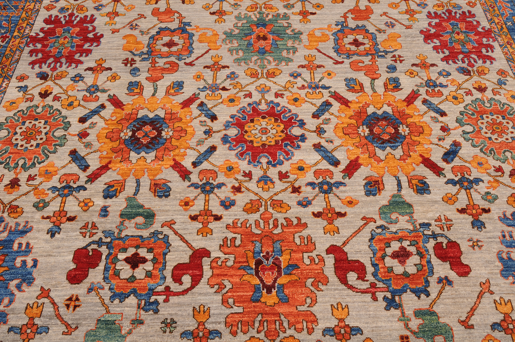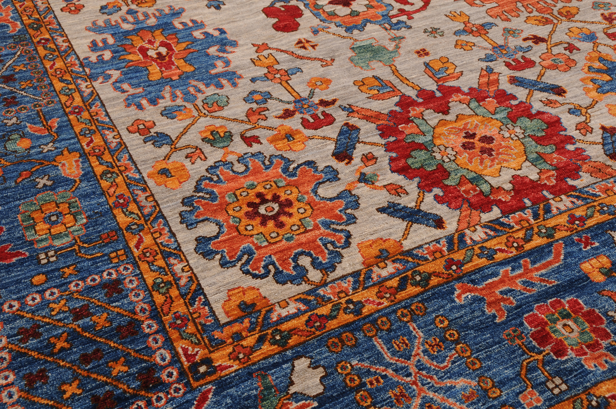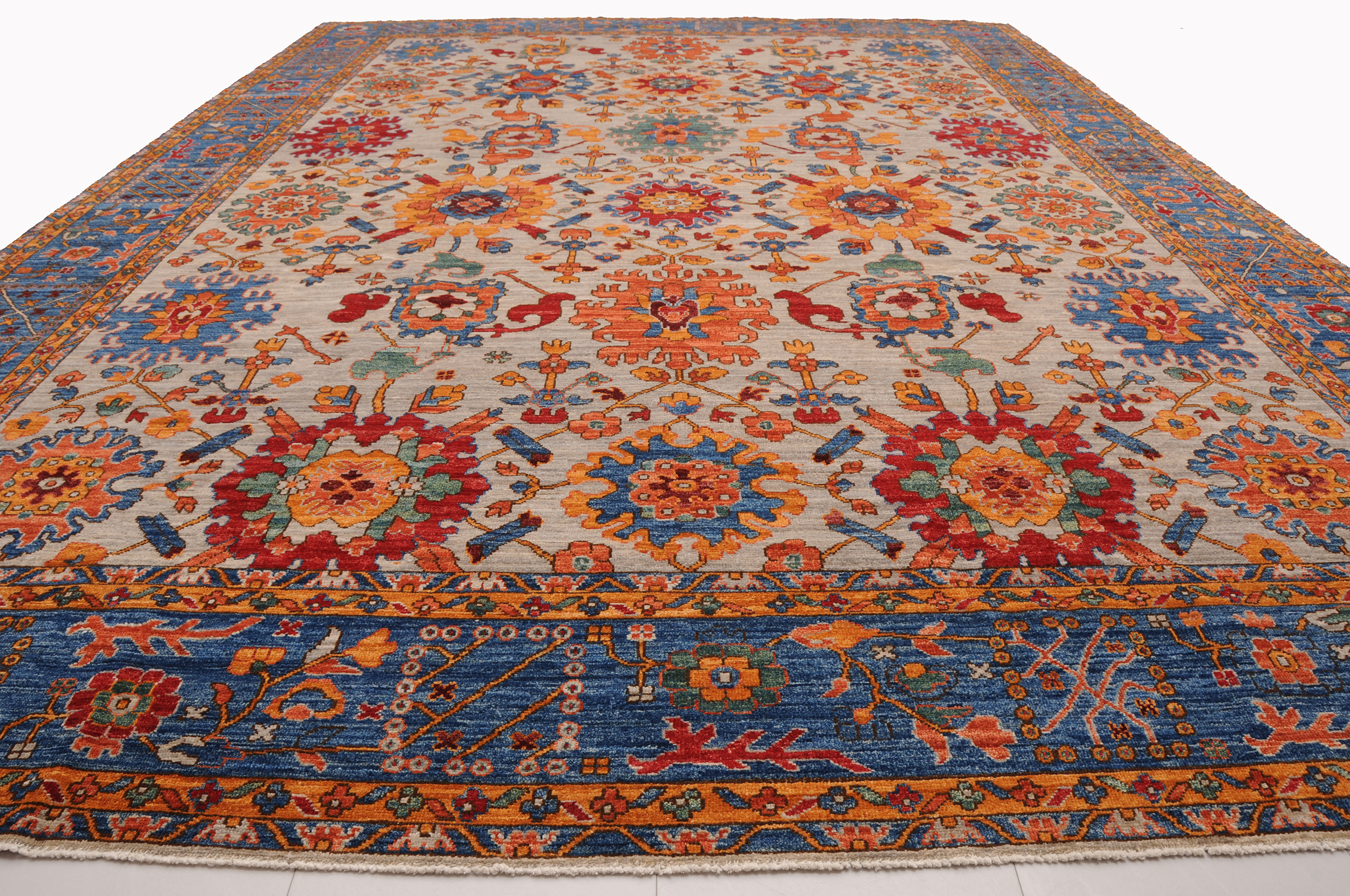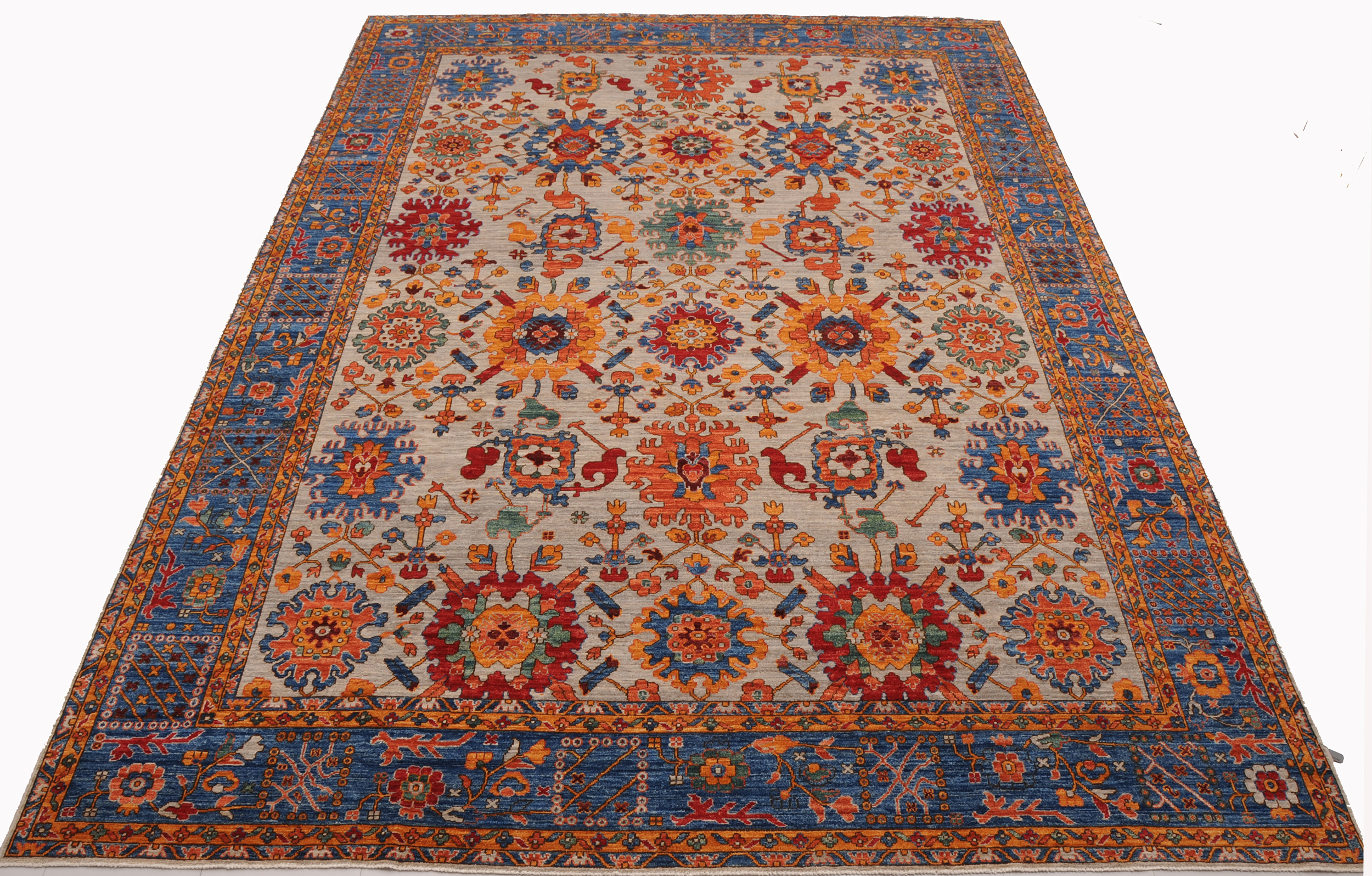 This 8’10” x 12’3″ Oushak rug, hand-knotted in Afghan / Pakistan, features a allover design. It is woven with Approx. 169KPSI, showcasing a field in Grey and a Blue border. The rug has a Low Medium Pile and a 100% Wool pile, and is in excellent condition.