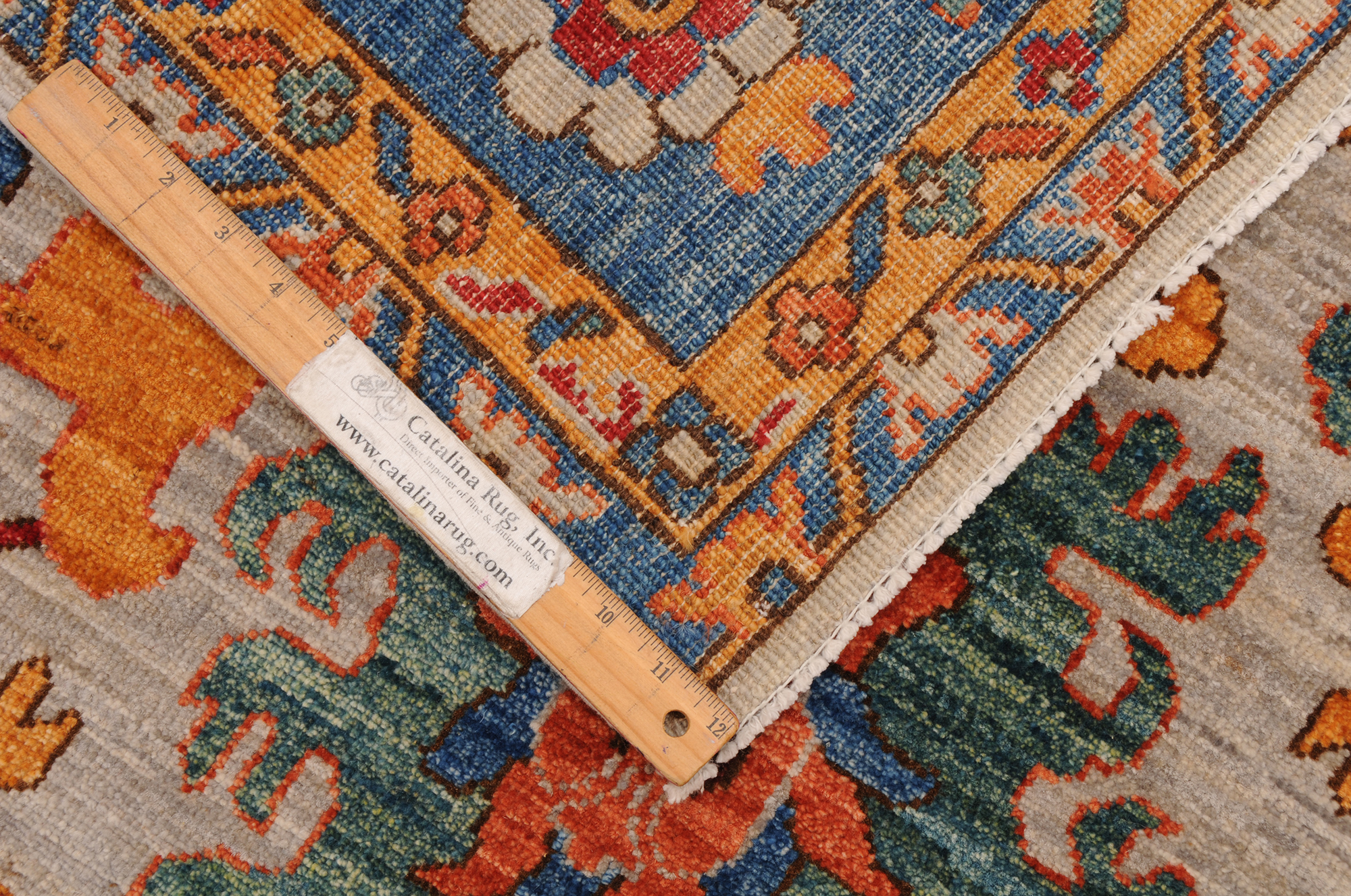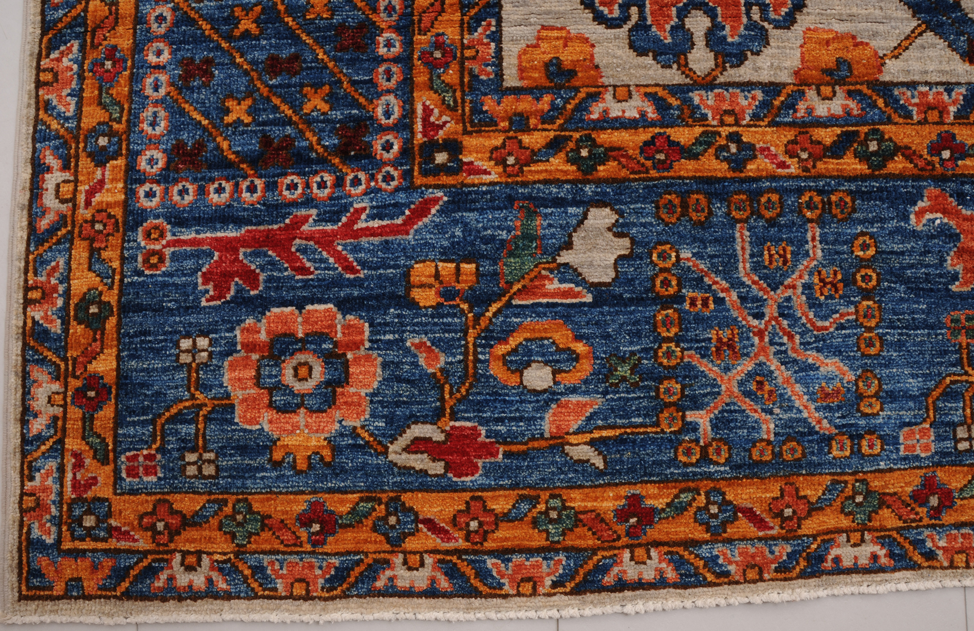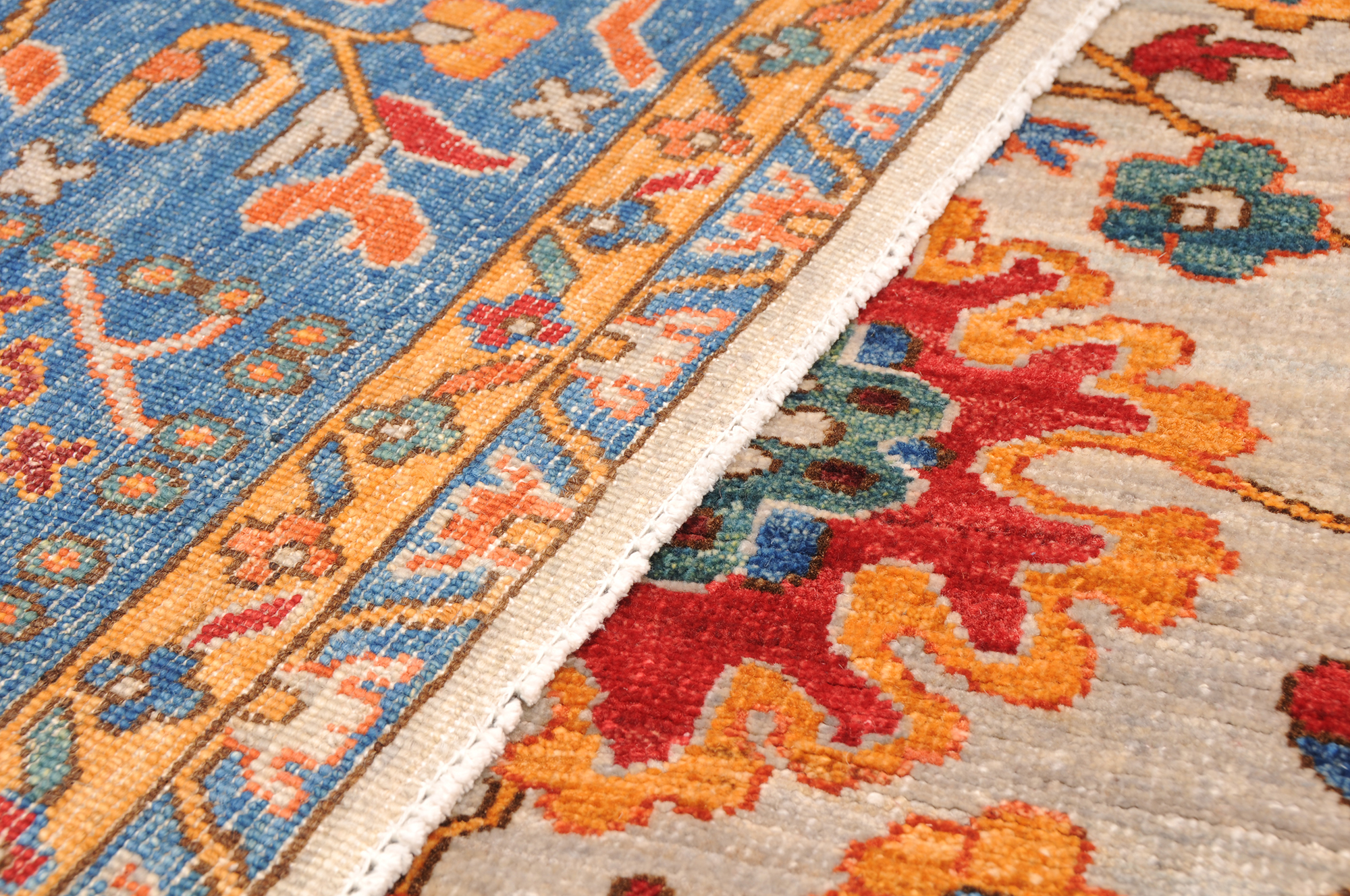 This 8’10” x 12’3″ Oushak rug, hand-knotted in Afghan / Pakistan, features a allover design. It is woven with Approx. 169KPSI, showcasing a field in Grey and a Blue border. The rug has a Low Medium Pile and a 100% Wool pile, and is in excellent condition.