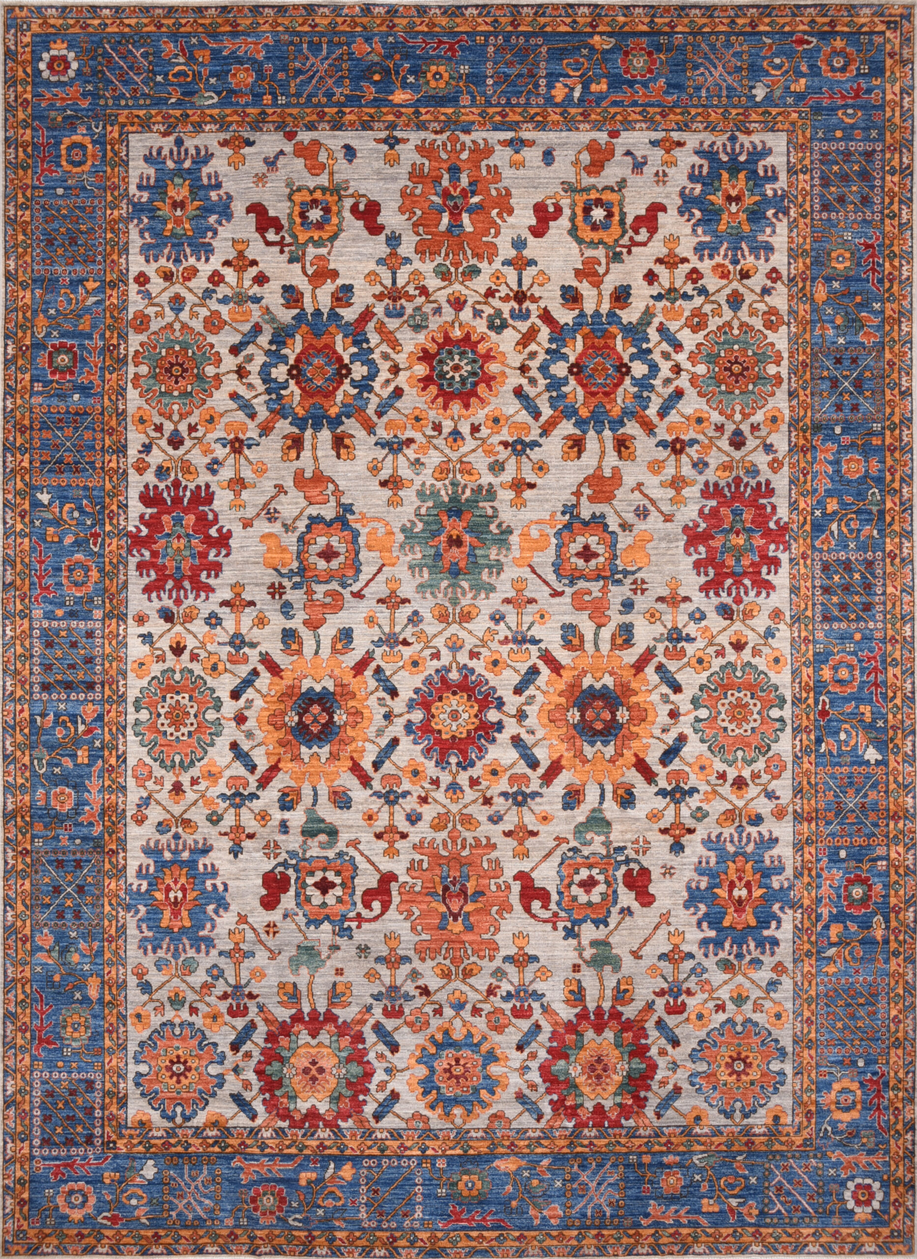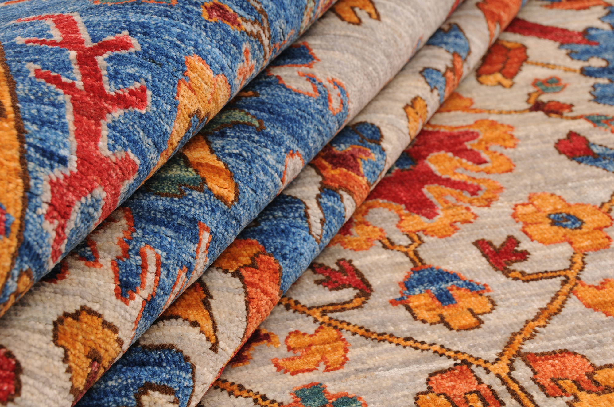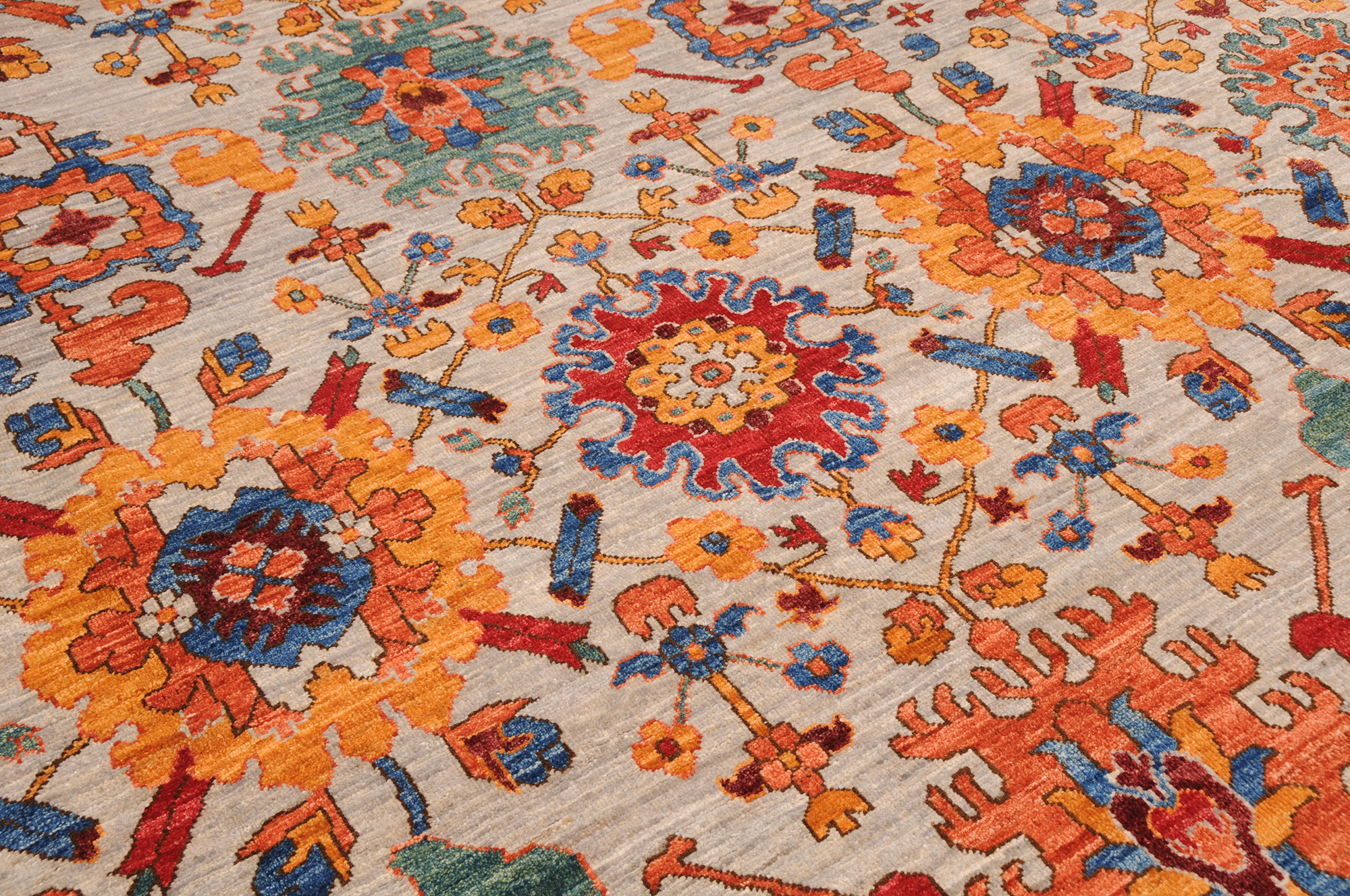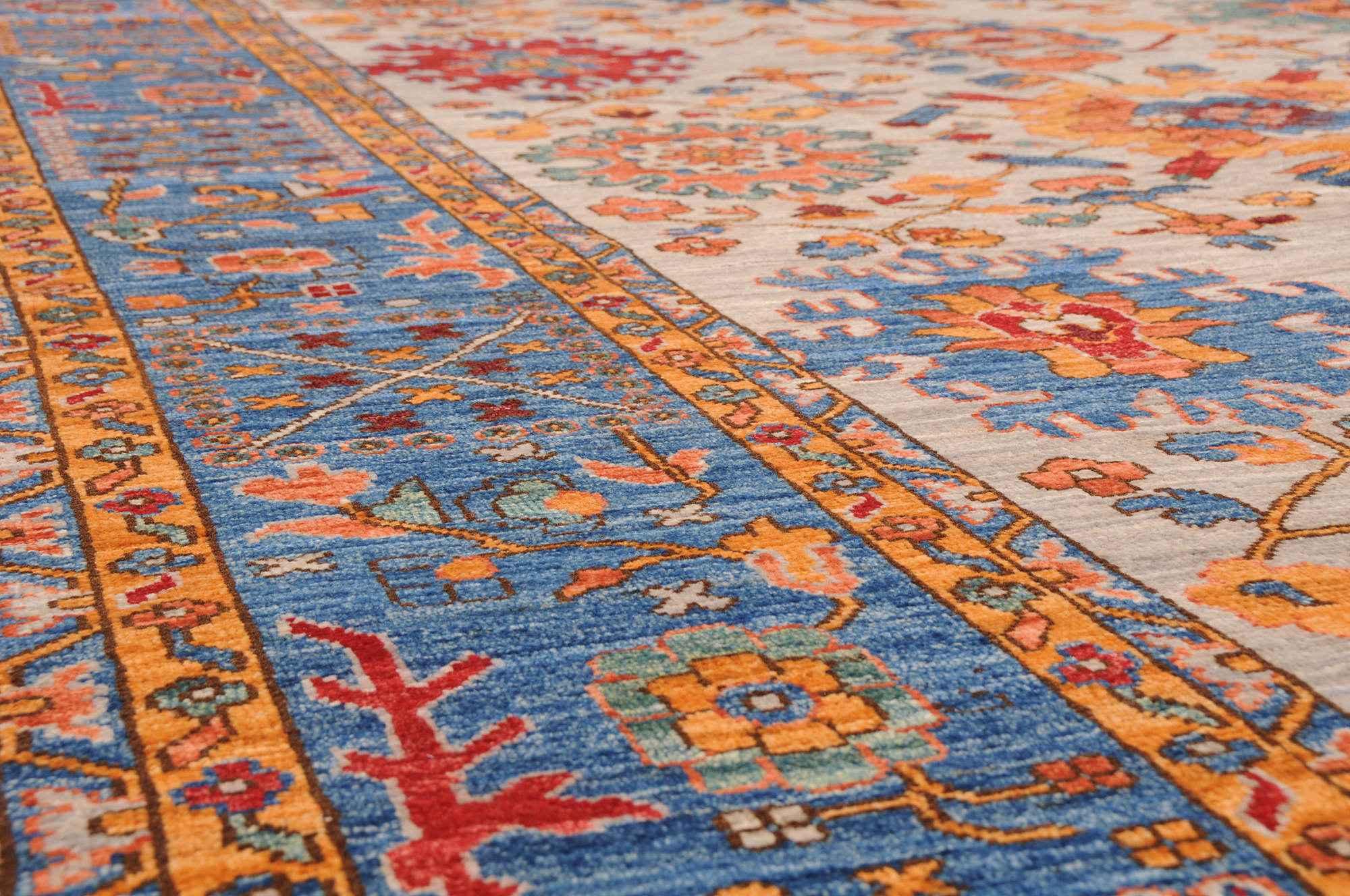This 8’10” x 12’3″ Oushak rug, hand-knotted in Afghan / Pakistan, features a allover design. It is woven with Approx. 169KPSI, showcasing a field in Grey and a Blue border. The rug has a Low Medium Pile and a 100% Wool pile, and is in excellent condition.