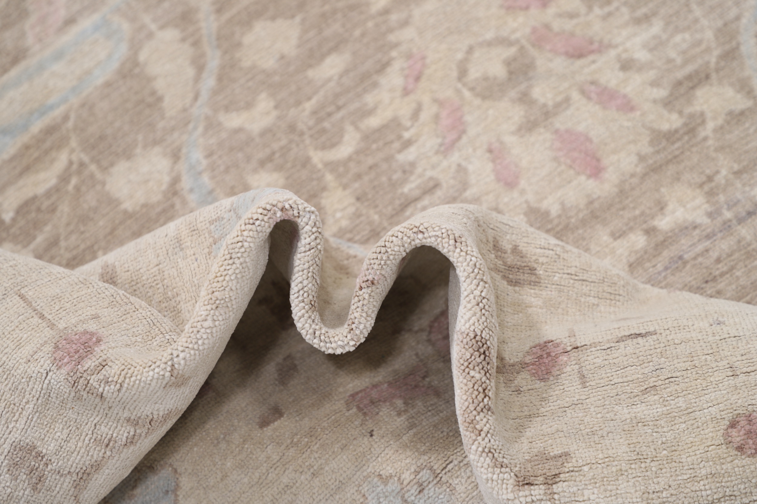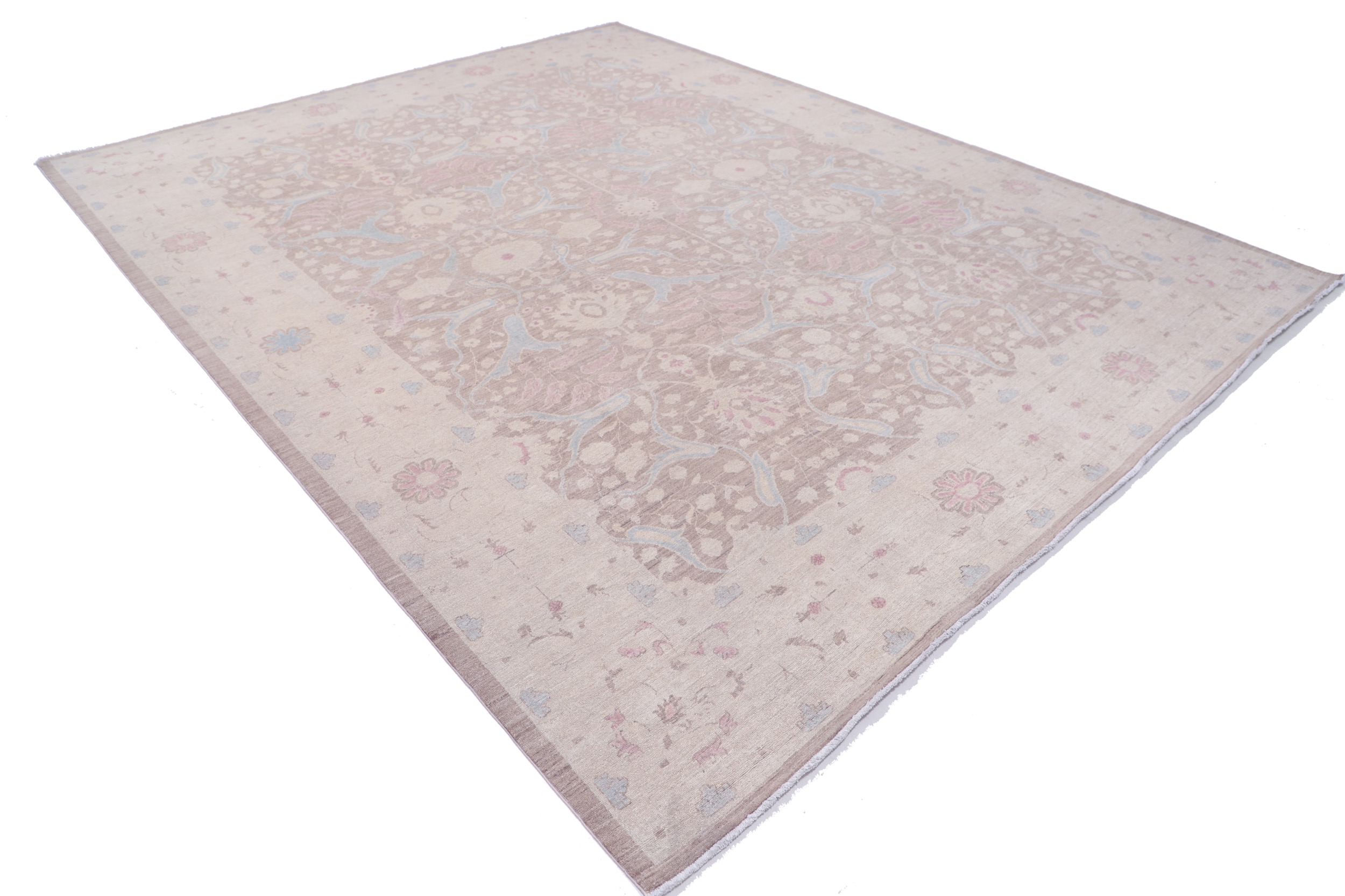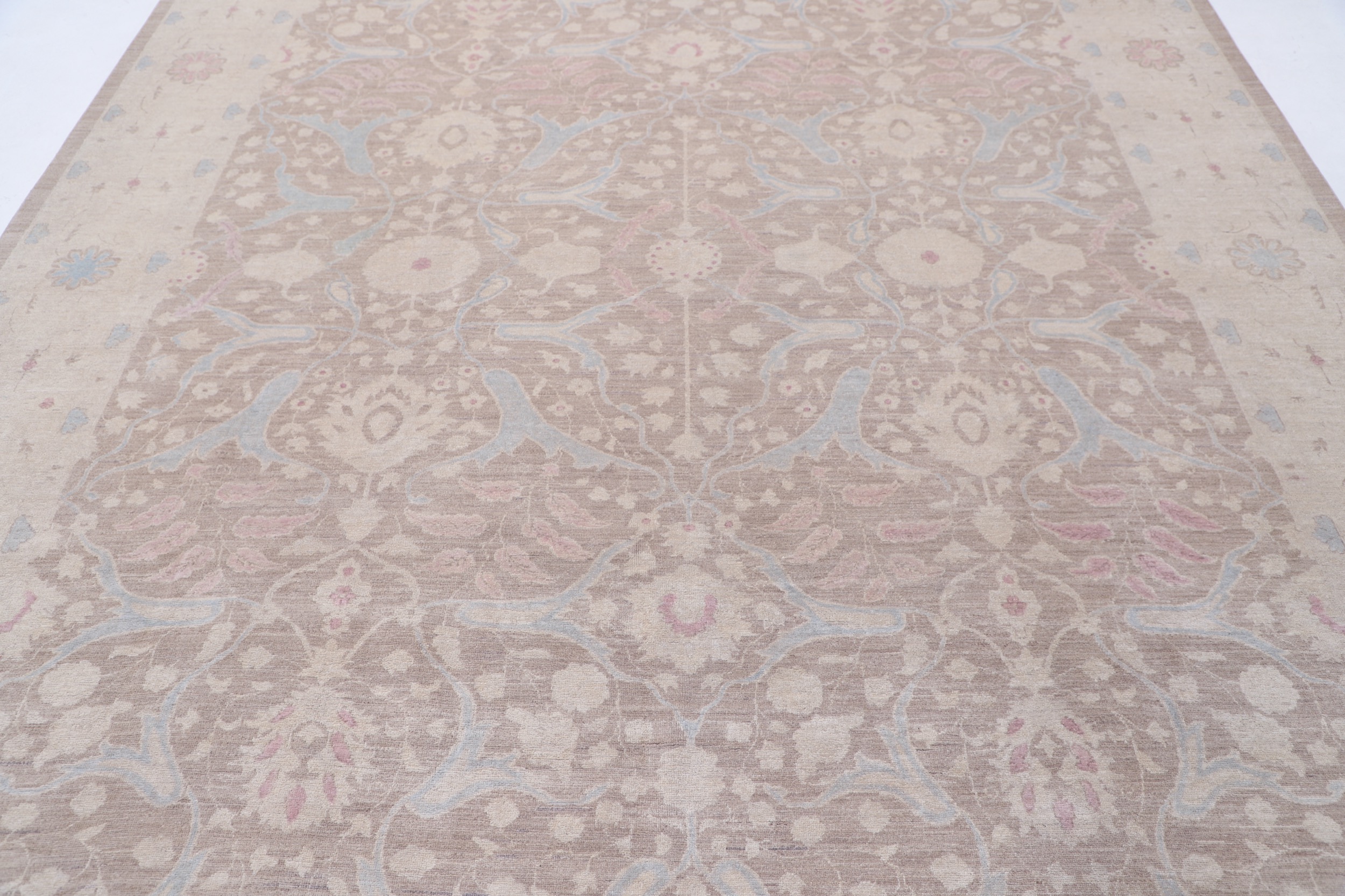 Authentic Oushak hand-knotted Oriental rug (8’11” x 11’4″), made in Afghanistan/Pakistan. Features a beautiful floral design in brown, beige, and blue, with a low-medium pile (1/4″-1/3″). Approx. 196 KPSI, 100% wool with cotton foundation. A stunning addition to any home.