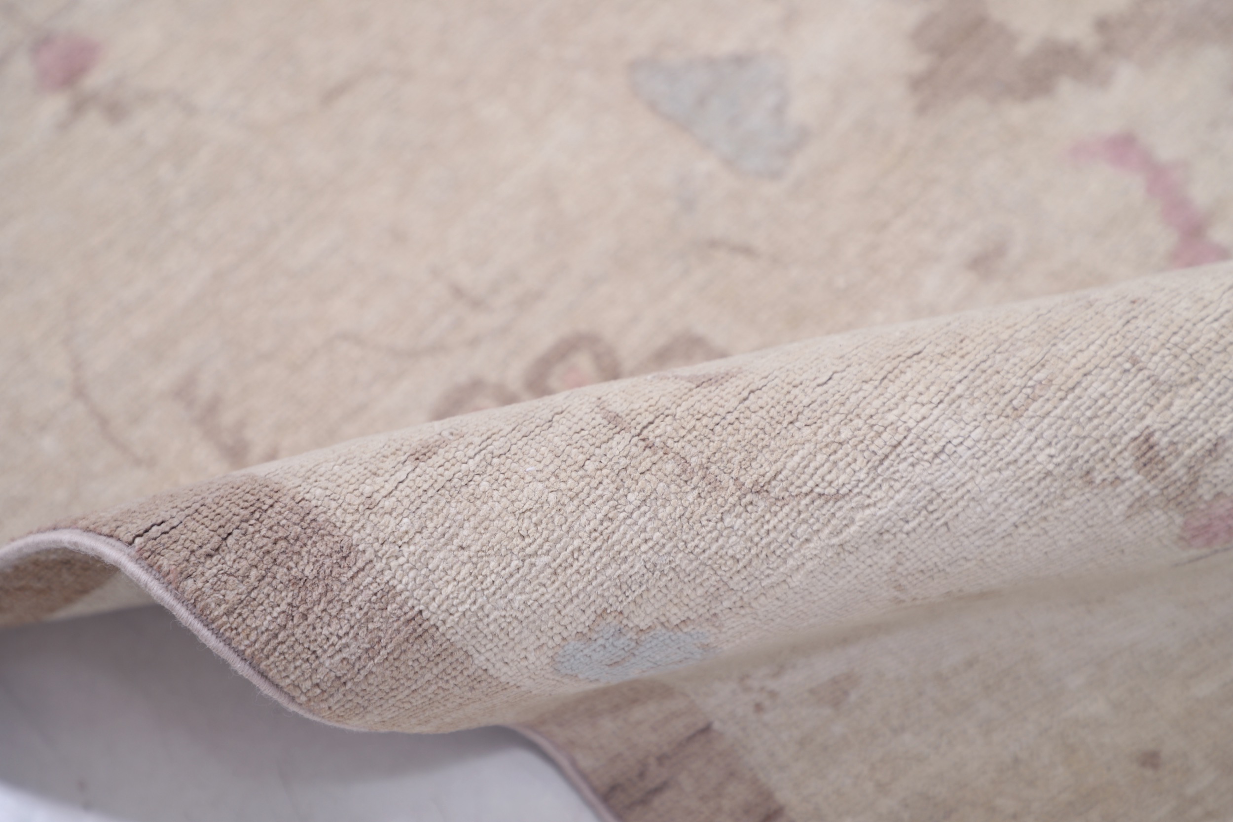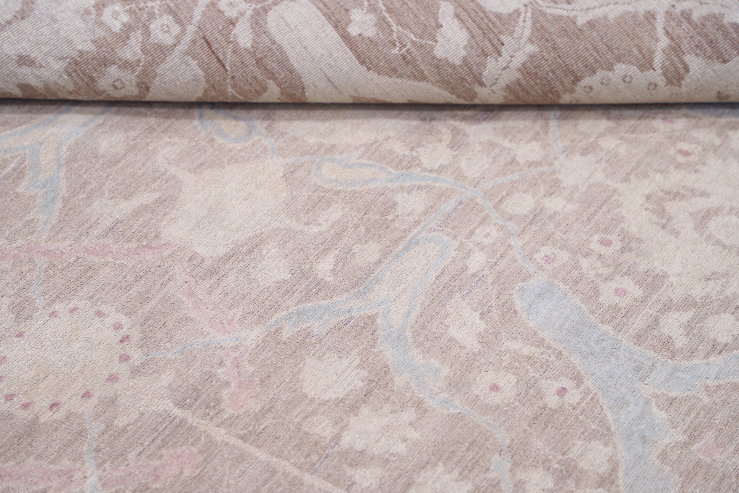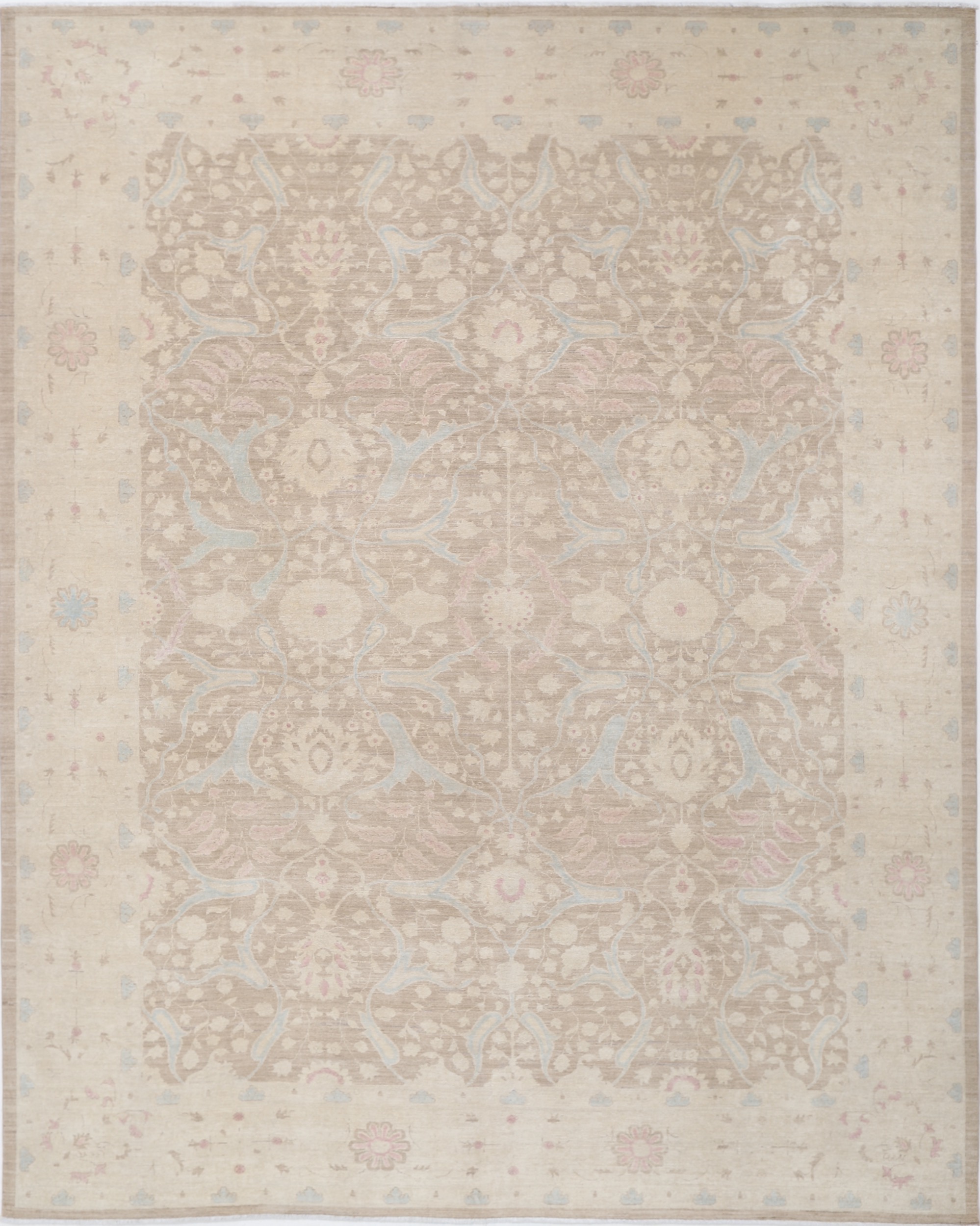 Authentic Oushak hand-knotted Oriental rug (8’11” x 11’4″), made in Afghanistan/Pakistan. Features a beautiful floral design in brown, beige, and blue, with a low-medium pile (1/4″-1/3″). Approx. 196 KPSI, 100% wool with cotton foundation. A stunning addition to any home.