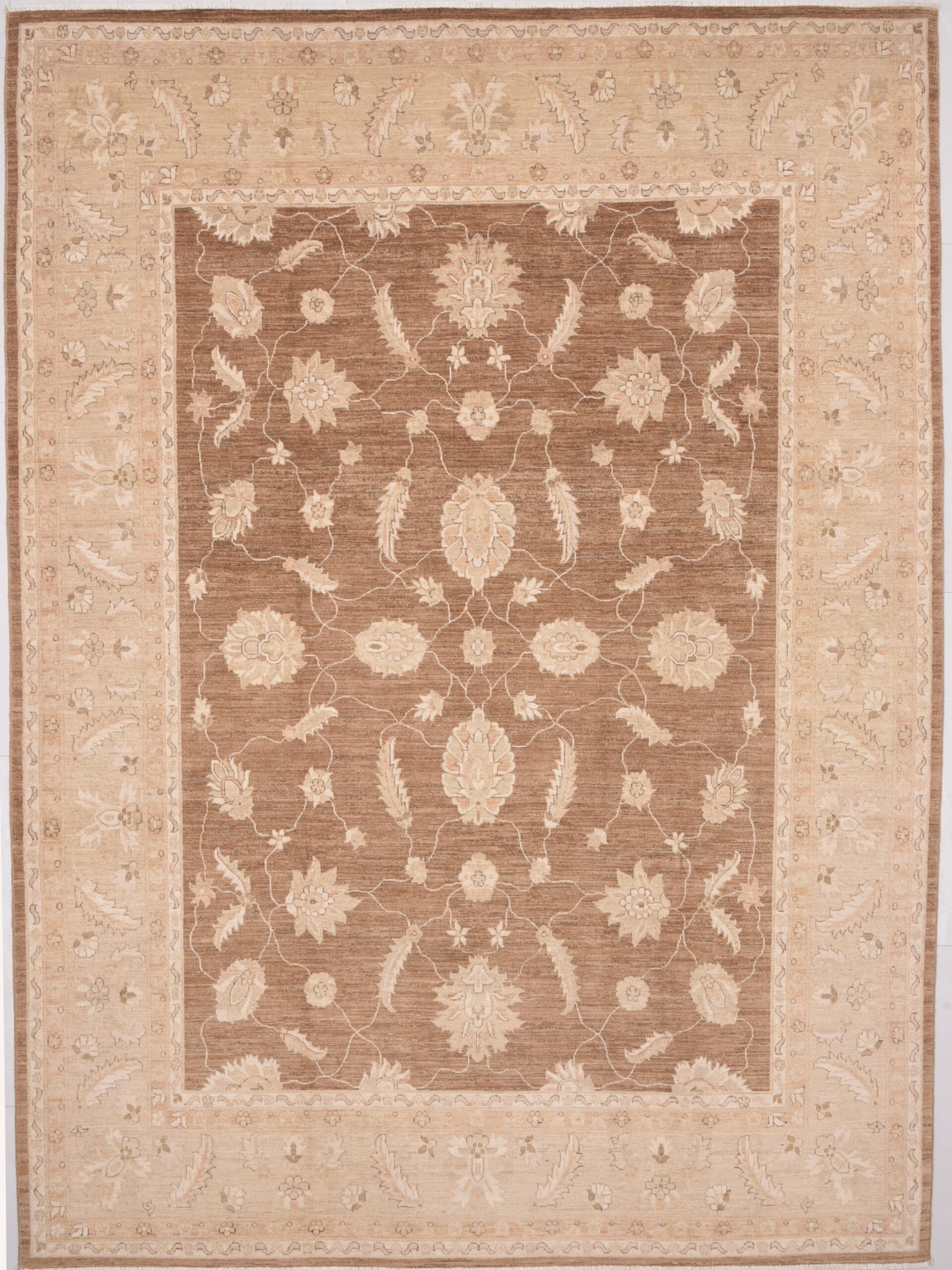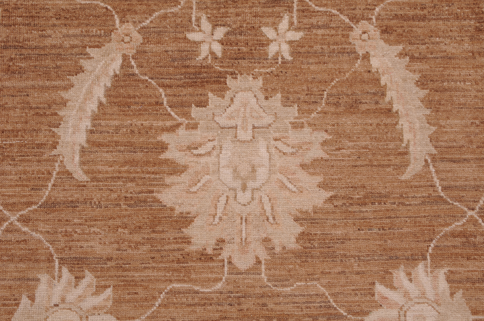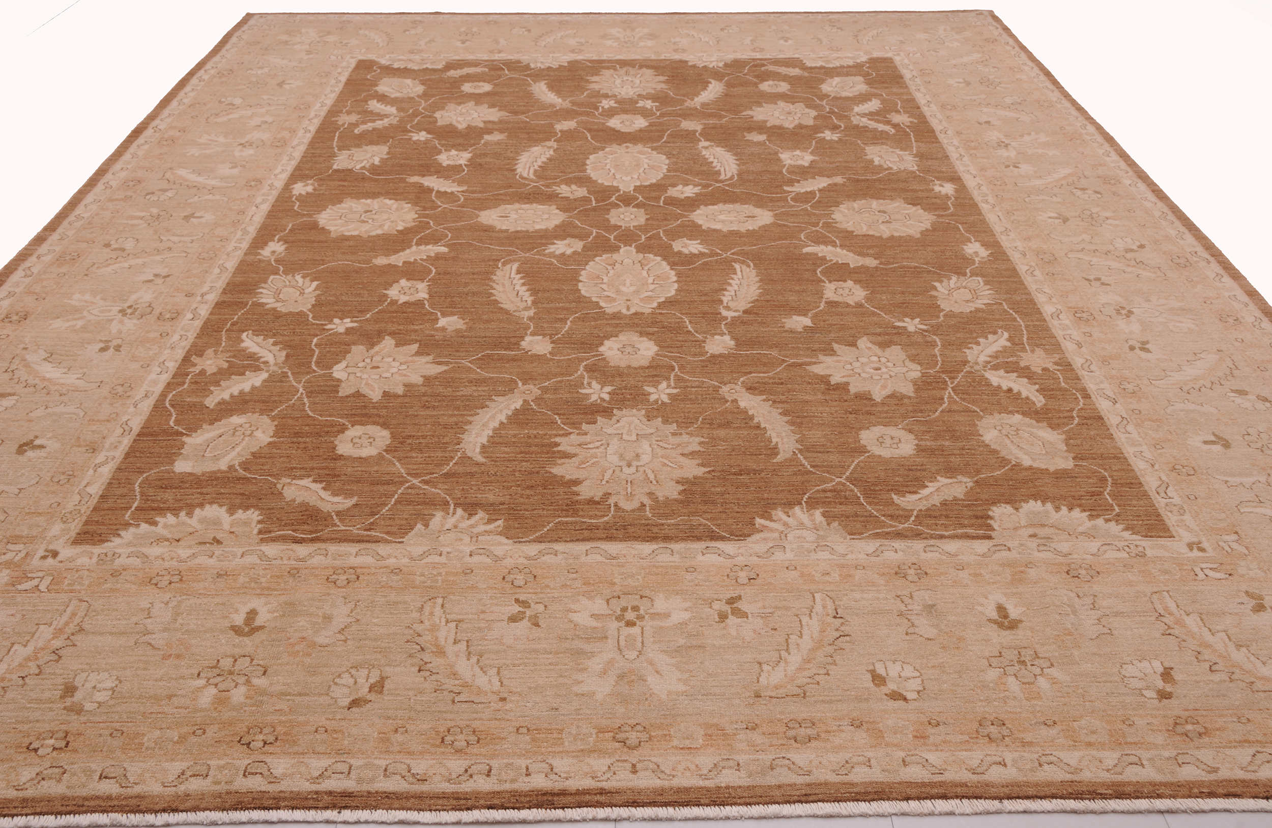 This 8’2″ x 10’10” Oushak rug, hand-knotted in Afghan / Pakistan, features a floral design. Crafted with approx. 156 kpsi, its field color is Brown with a Beige border. The rug has a low medium pile 1/4″-1/3″ and a 100% wool pile, in excellent & washed condition.
