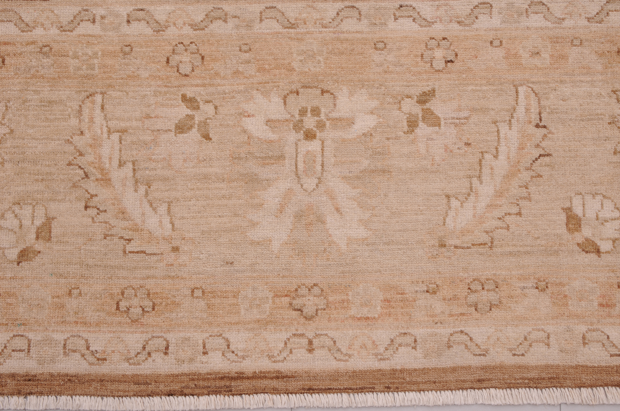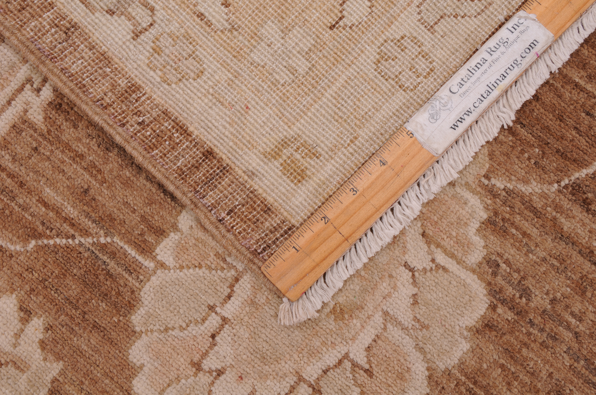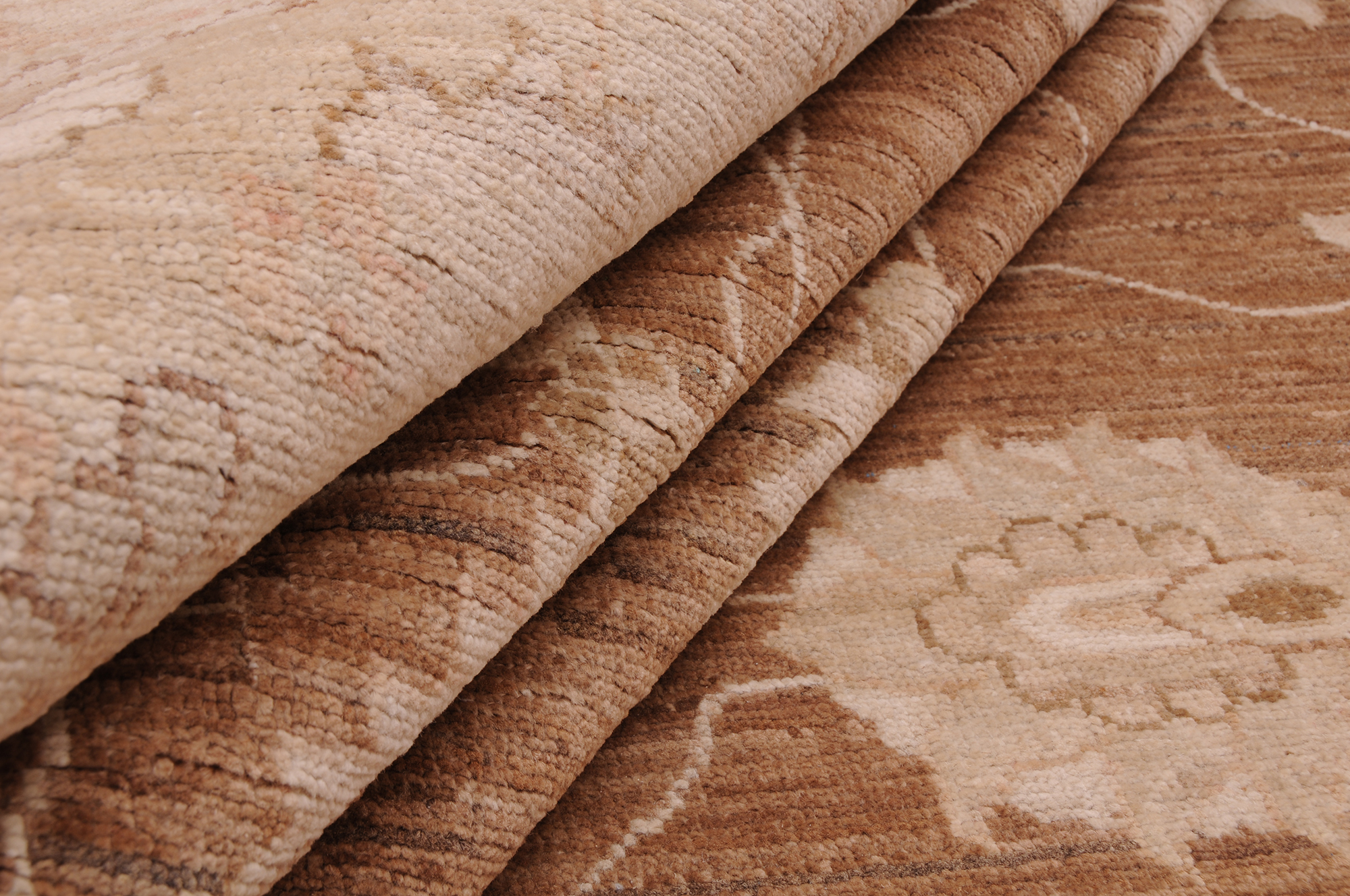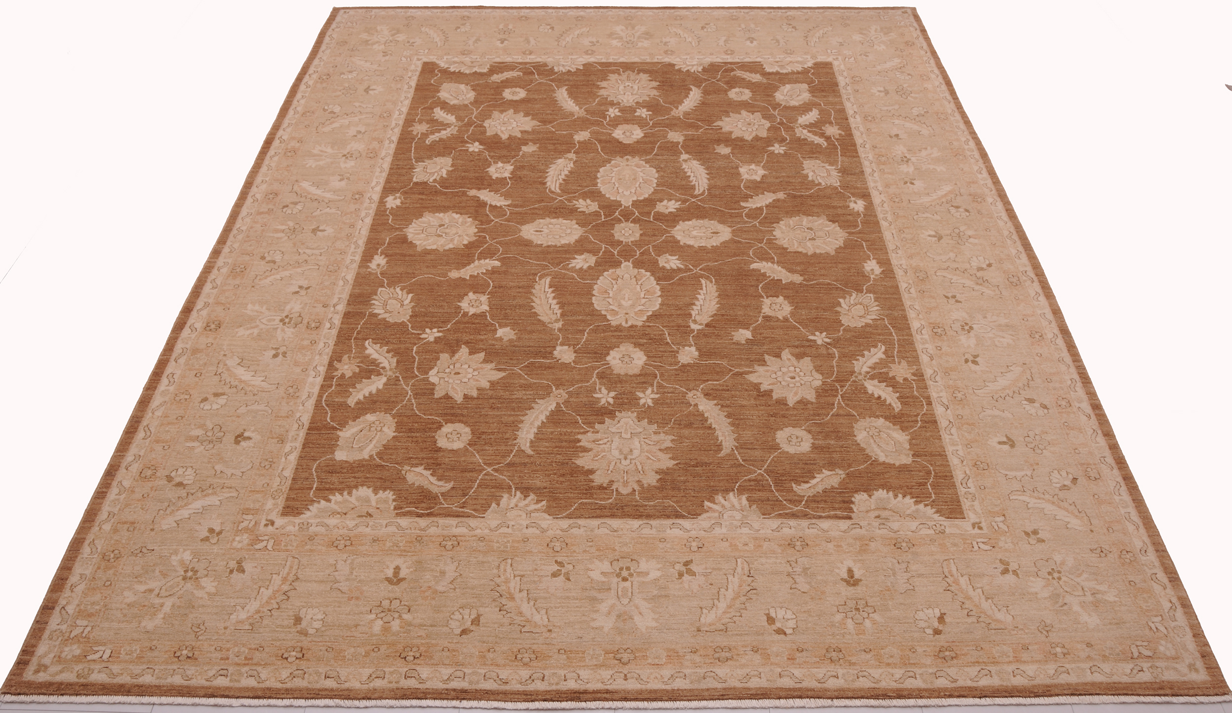 This 8’2″ x 10’10” Oushak rug, hand-knotted in Afghan / Pakistan, features a floral design. Crafted with approx. 156 kpsi, its field color is Brown with a Beige border. The rug has a low medium pile 1/4″-1/3″ and a 100% wool pile, in excellent & washed condition.