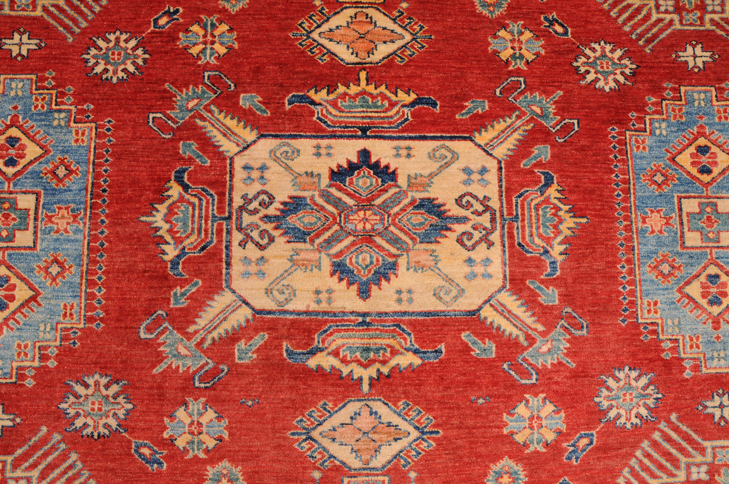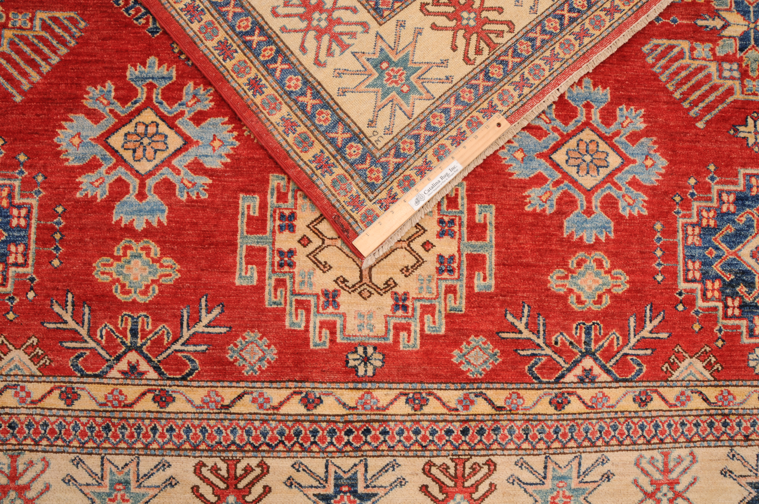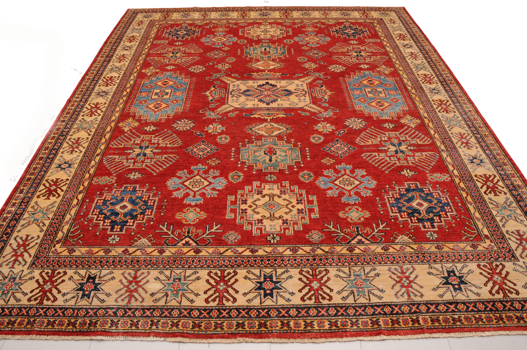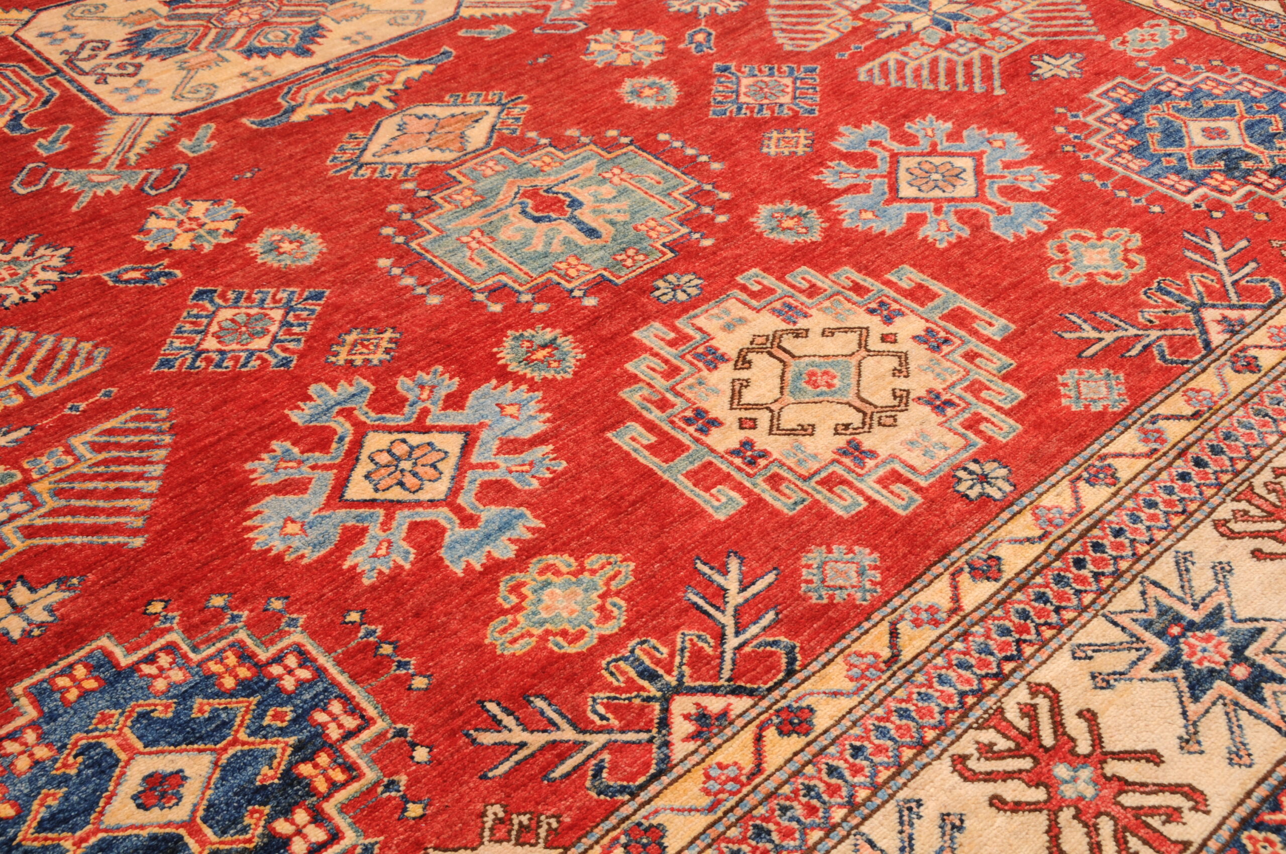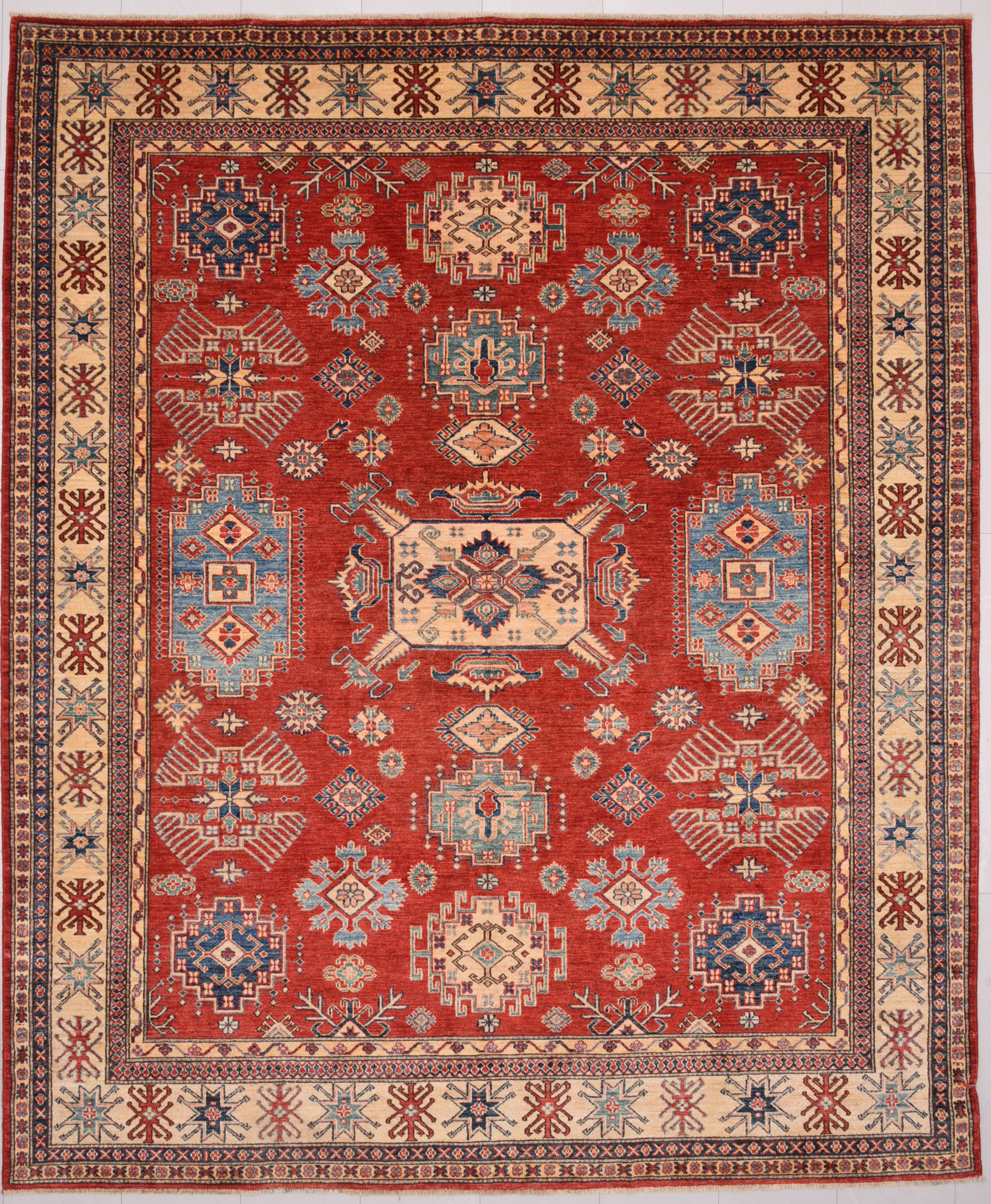 Authentic hand-knotted Kazak rug (8’2″ x 9’9″), crafted in Afghanistan/Pakistan. This vibrant rug features a geometrical design in red, beige, orange, yellow, and green, with a low-medium pile (1/4″-1/3″). Approx. 156 KPSI. 100% wool. A beautiful addition to any home.