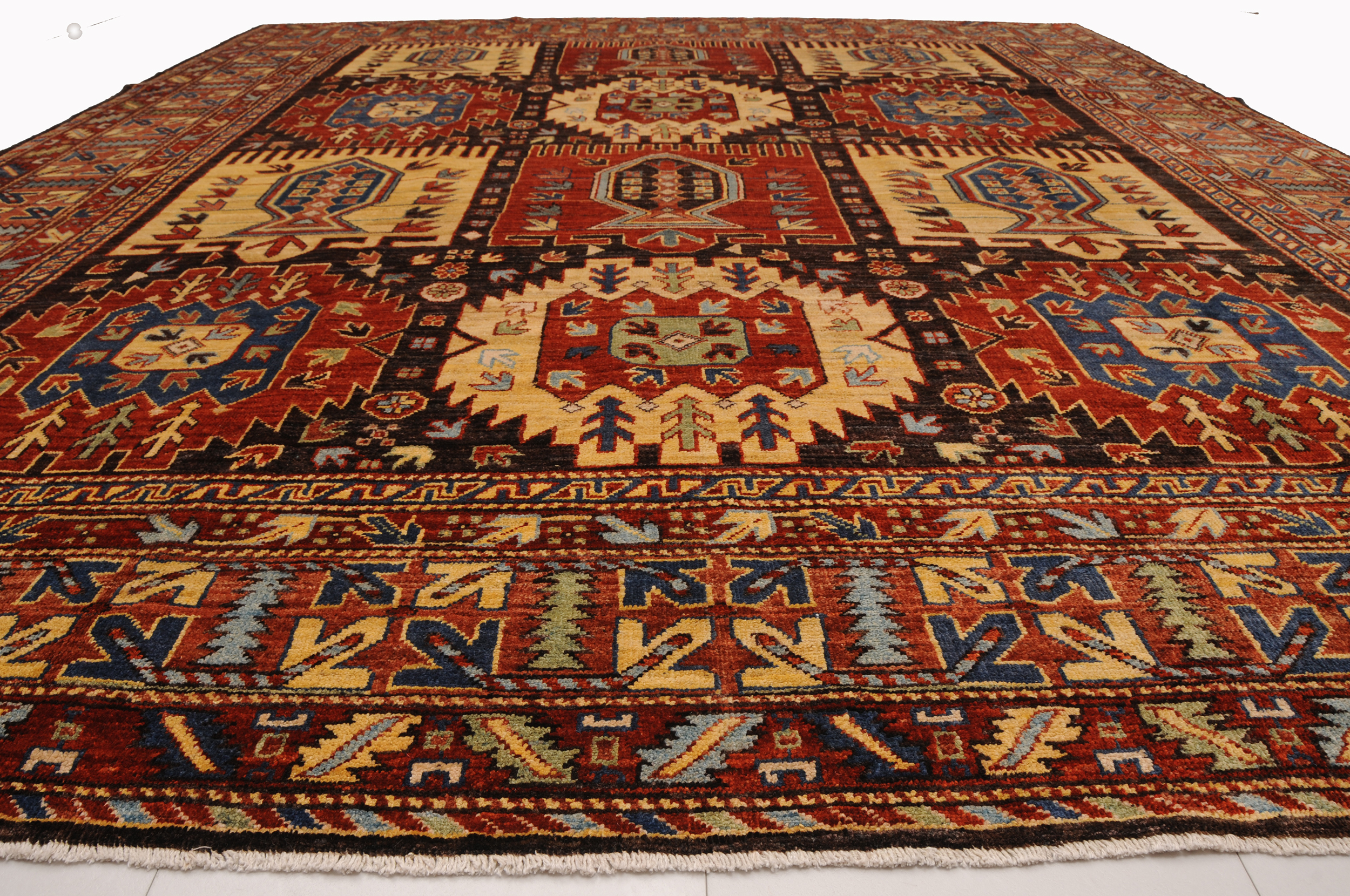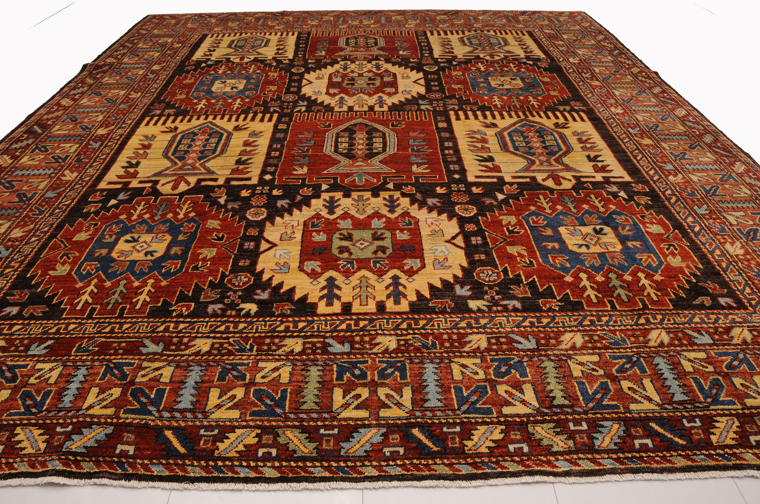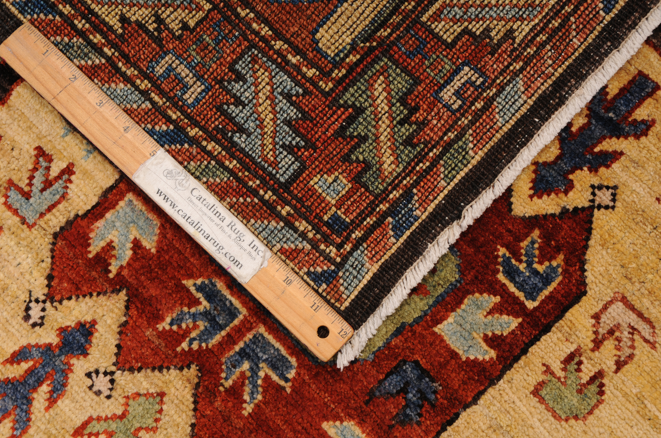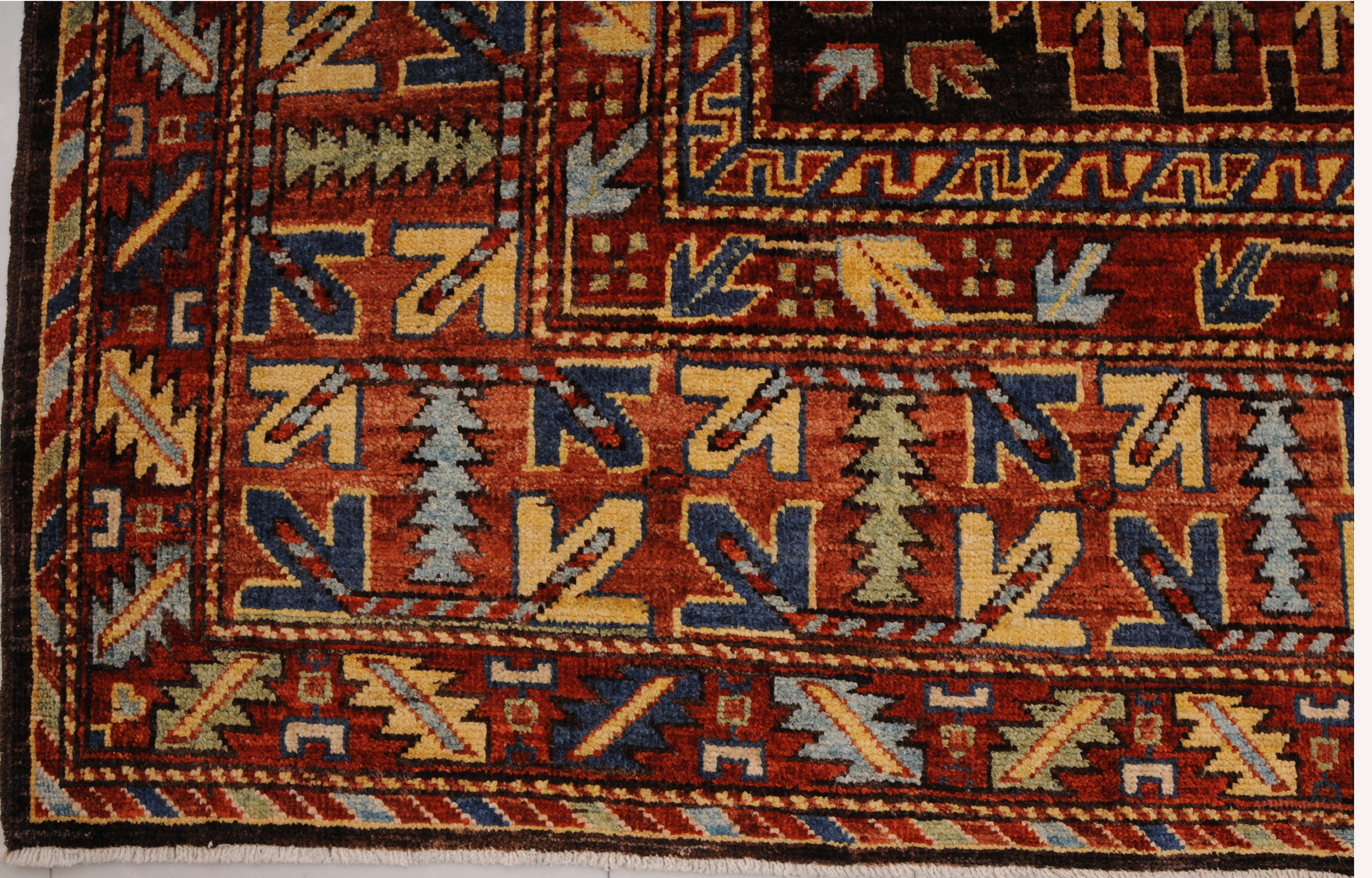 This 8’2″ x 9’7″ Kazak rug, hand-knotted in Afghan / Pakistan, features a geometric design. It is woven with Approx. 169 KPSI, showcasing a field in Brown and a Rust border. The rug has a Low Medium Pile and a 100% Wool pile, and is in excellent condition.