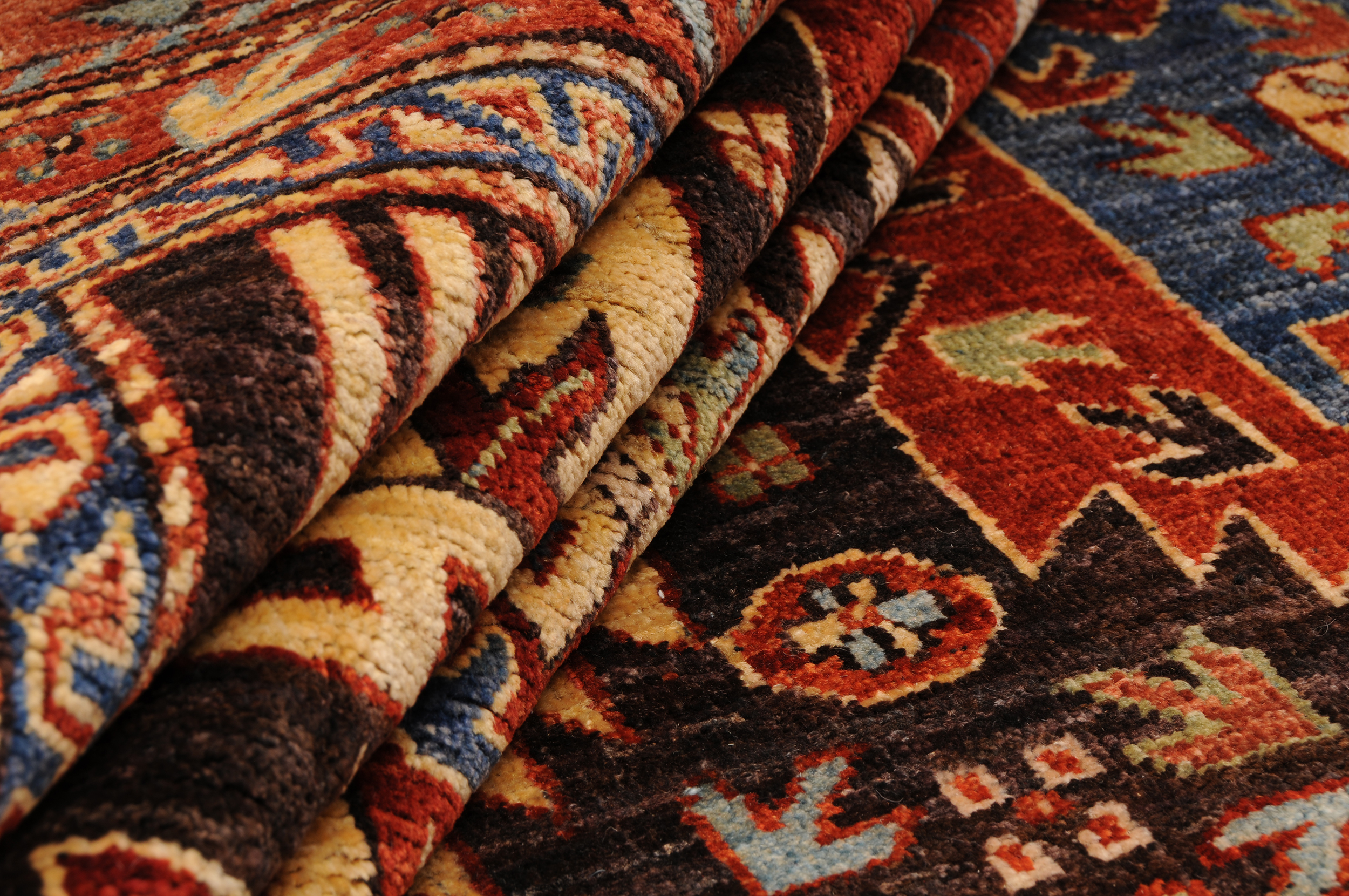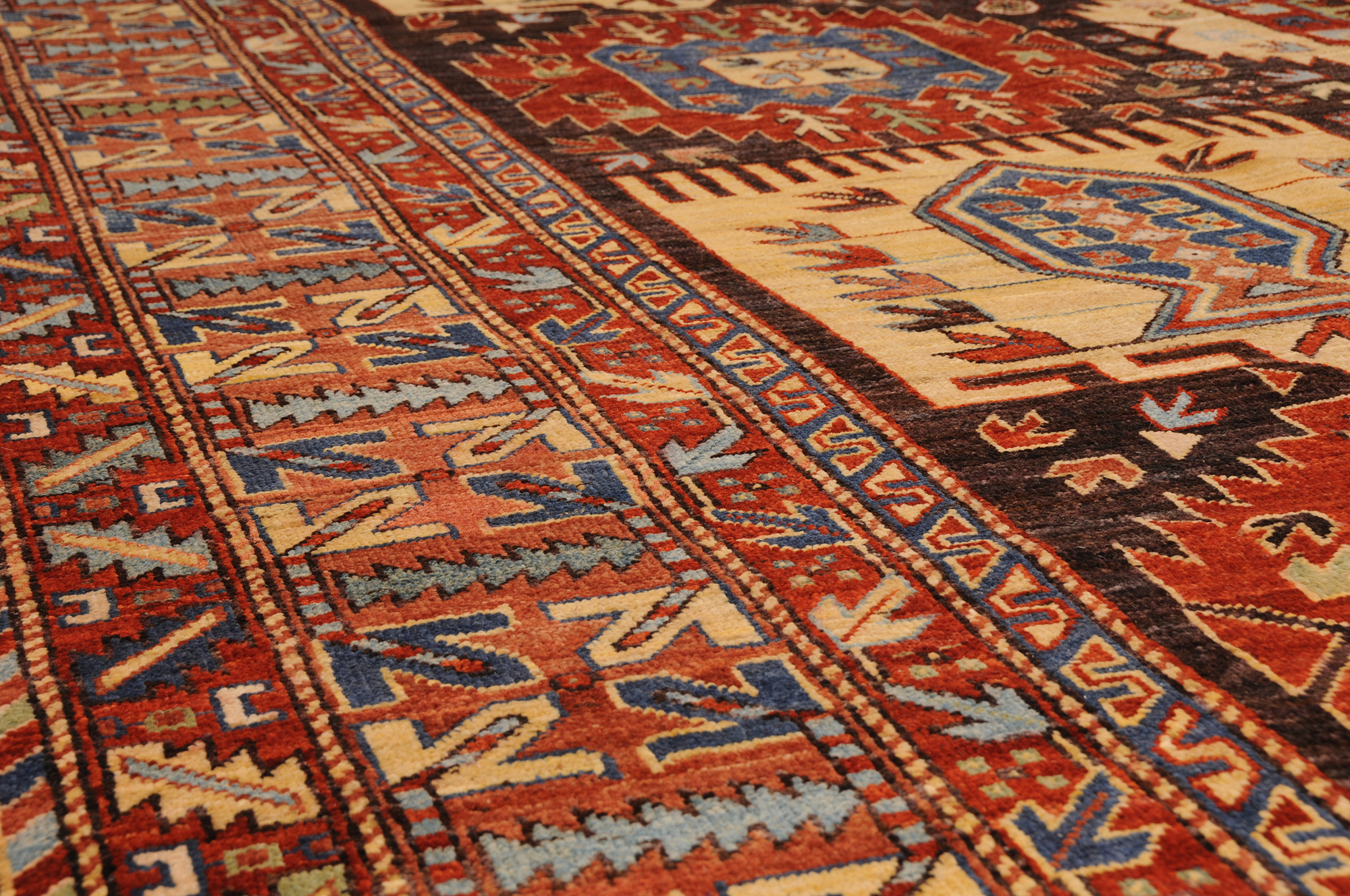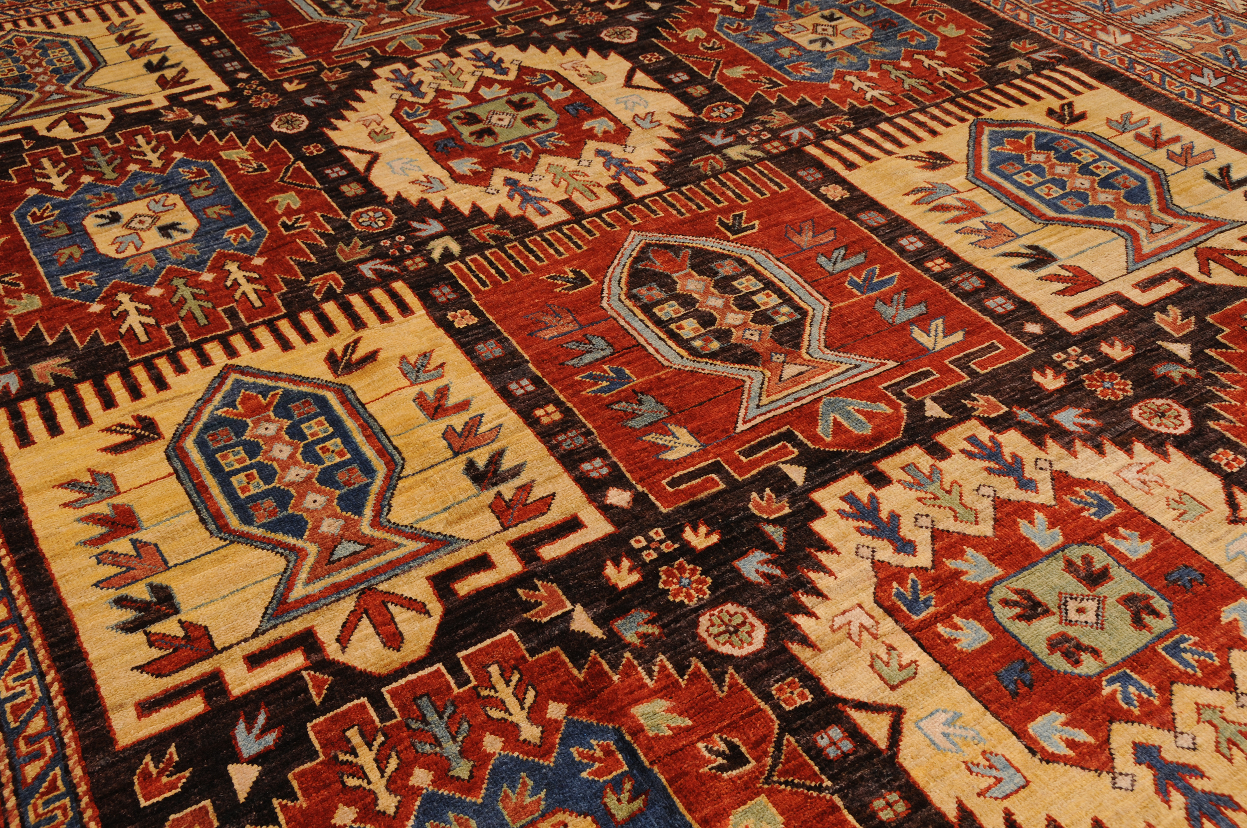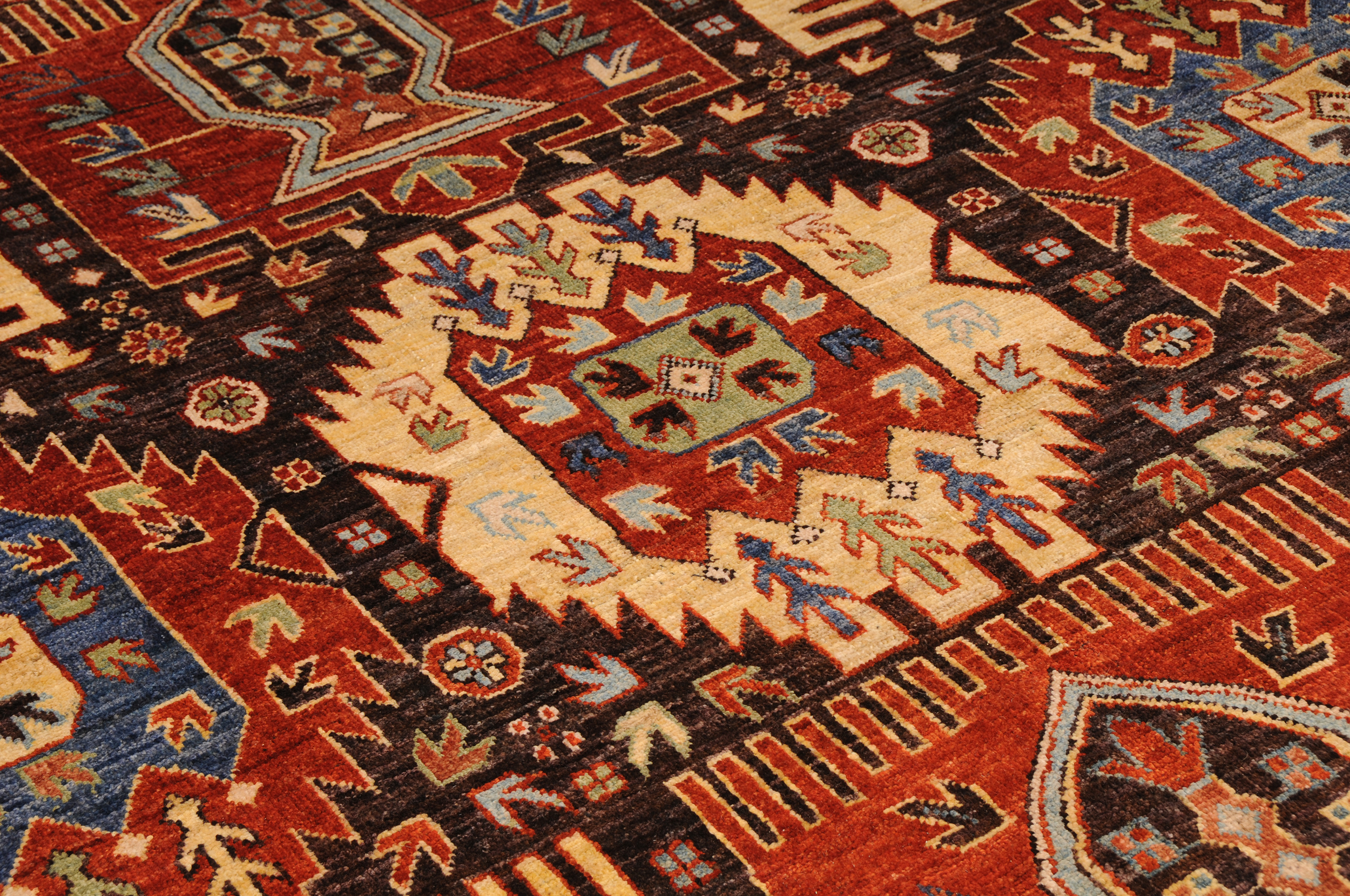 This 8’2″ x 9’7″ Kazak rug, hand-knotted in Afghan / Pakistan, features a geometric design. It is woven with Approx. 169 KPSI, showcasing a field in Brown and a Rust border. The rug has a Low Medium Pile and a 100% Wool pile, and is in excellent condition.