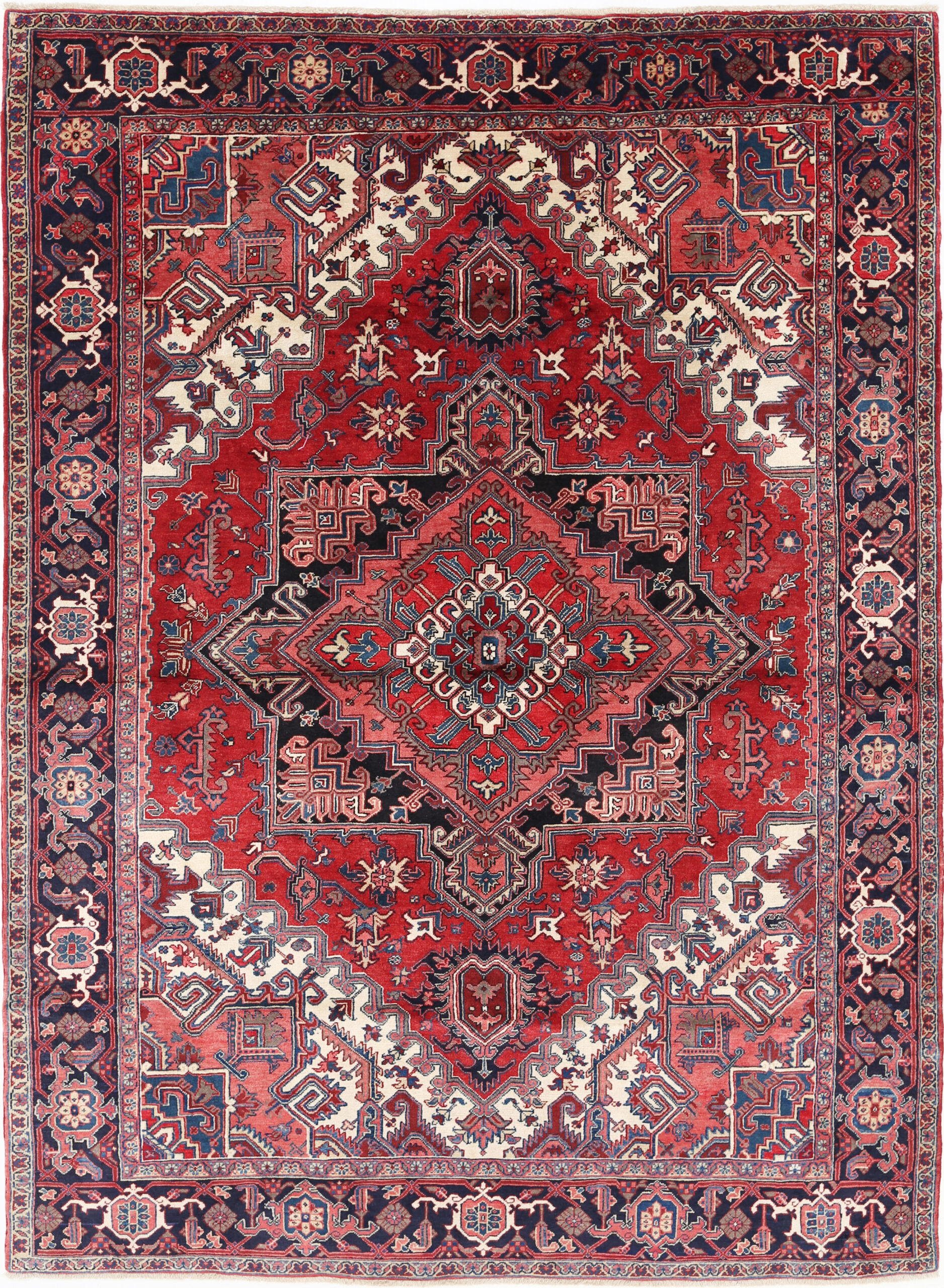 This Persian rug is an exquisite piece with a high pile of 1/2″-5/8″ made of 100% wool. Its dimensions of 8’3″ x 11’4″ showcase a beautiful medallion design in black, beige, blue, green, and red colors. With an approximate knot density of 120 KPSI, it is a perfect addition to any space.