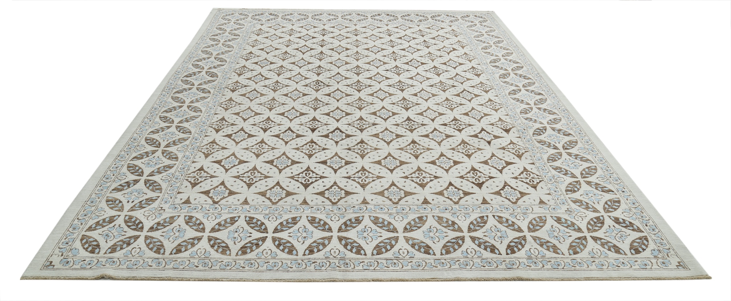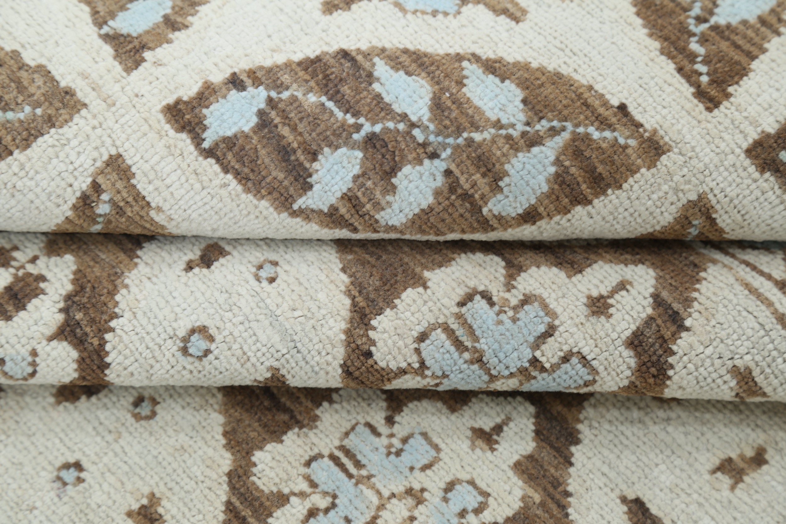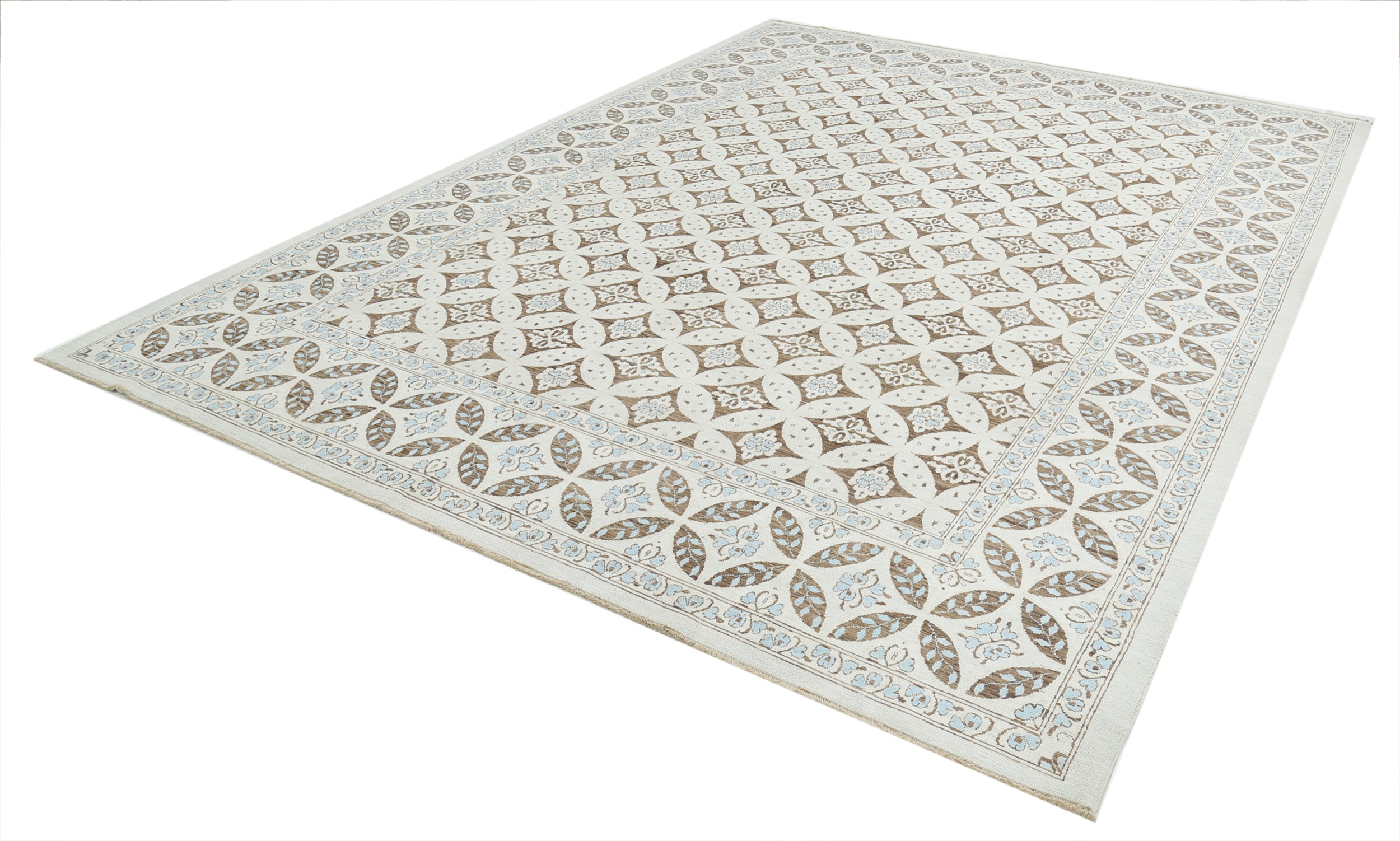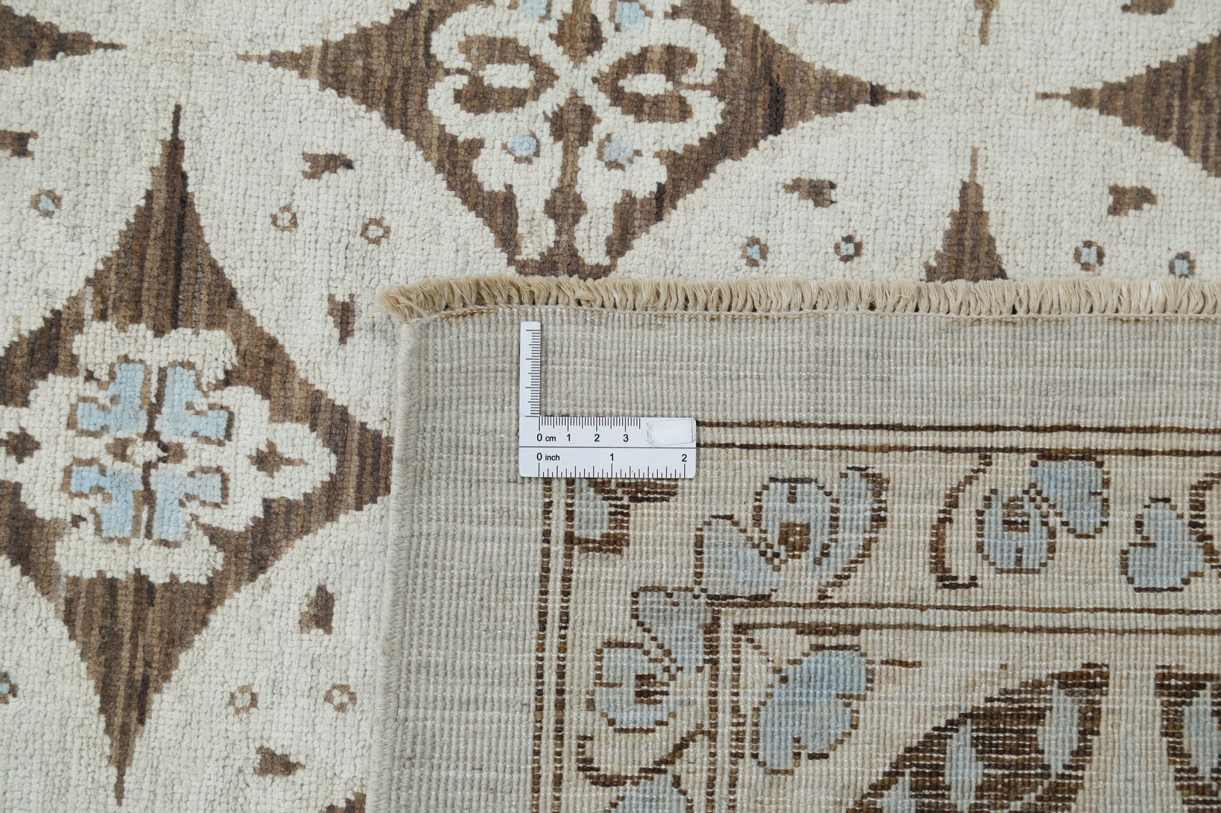 A stunning example of Oriental craftsmanship, this 9′ x 11’10” Oushak rug is hand-knotted in Afghan / Pakistan. Its brown field and beige border frame a detailed panel design, known for its refined, traditional aesthetics. Durable and beautifully textured with a low medium pile 1/4″-1/3″ pile.