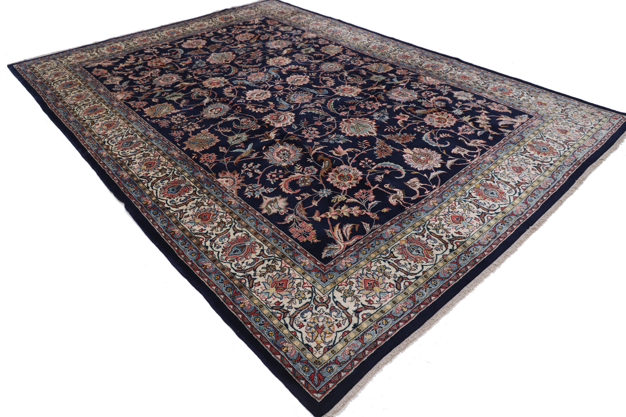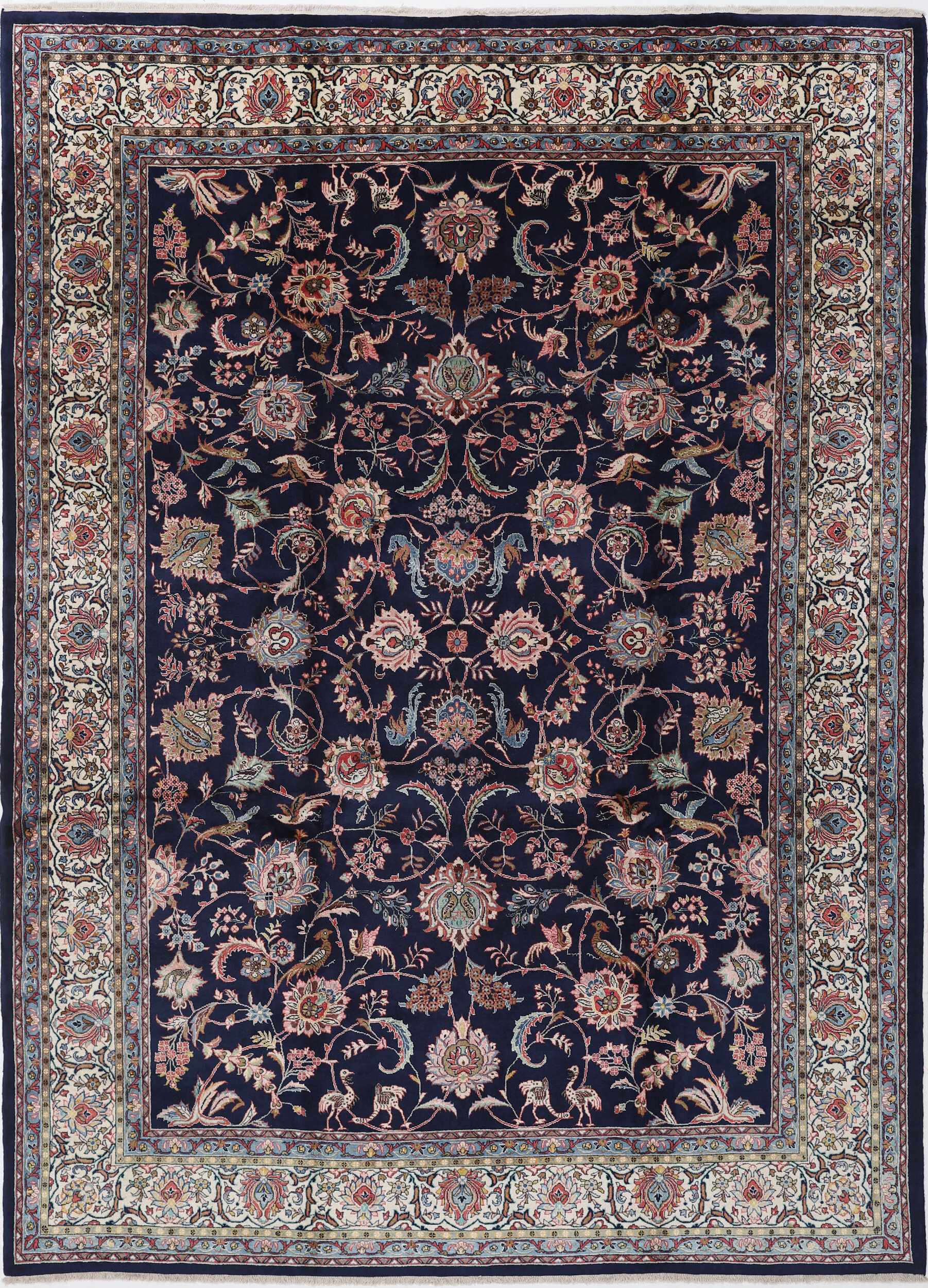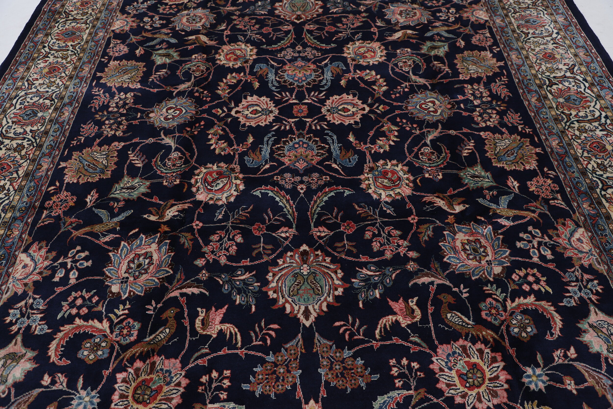 This Persian Rug is hand-knot with 100% Wool Pile and Cotton Foundation. This Rug has a Floral design, and its Main Colors are Blue, Beige, Red, Brown, and Peach.