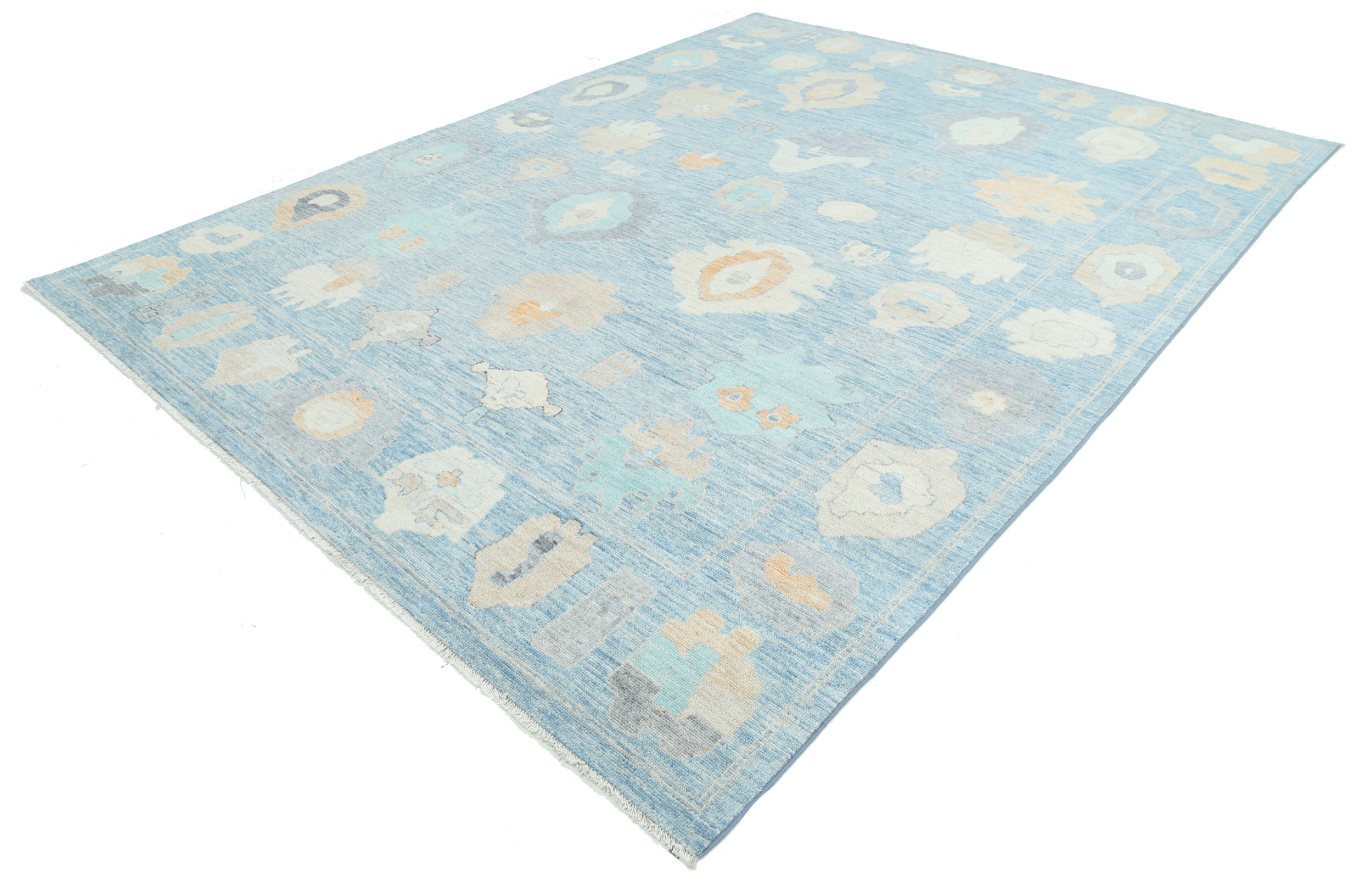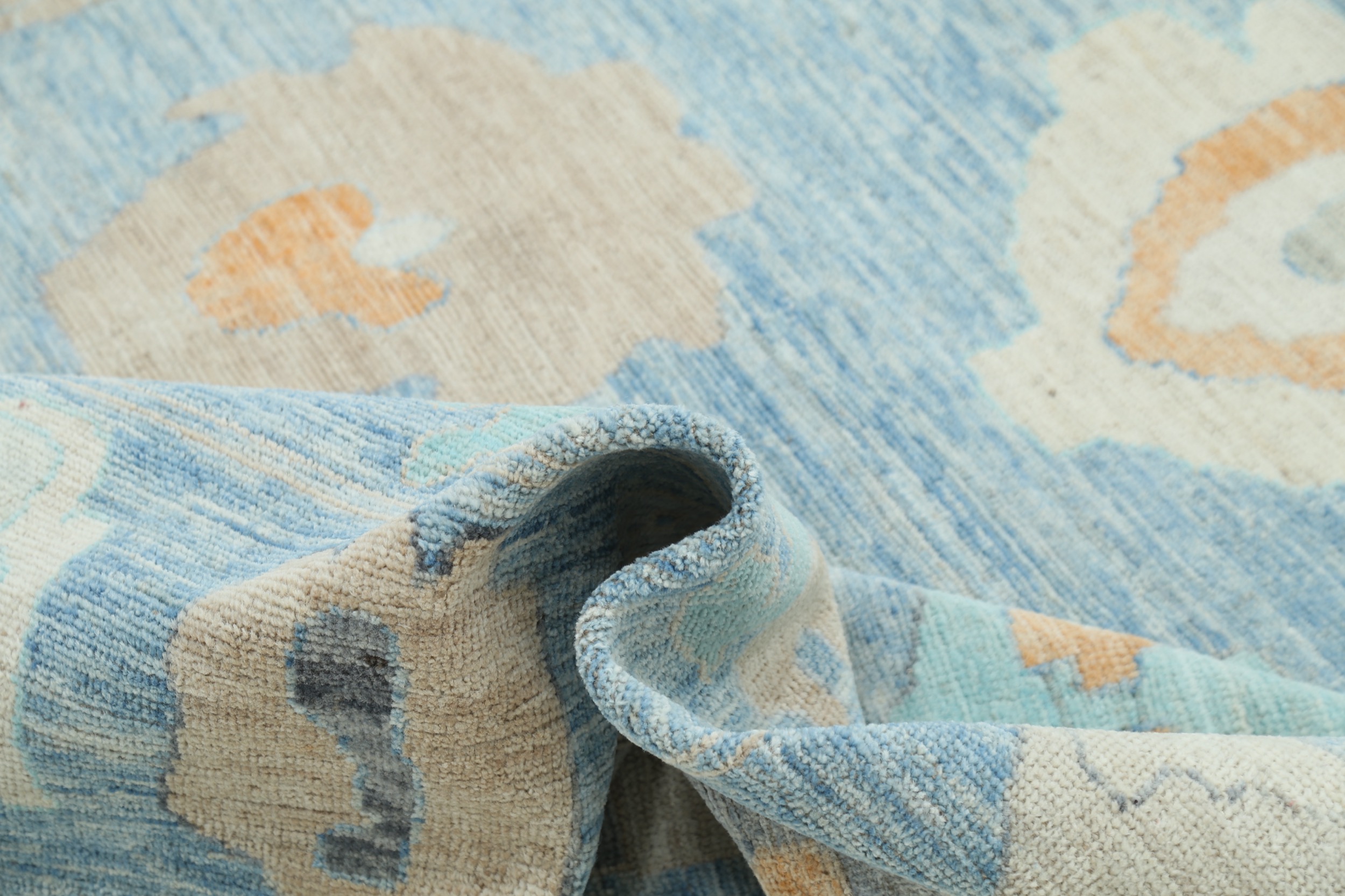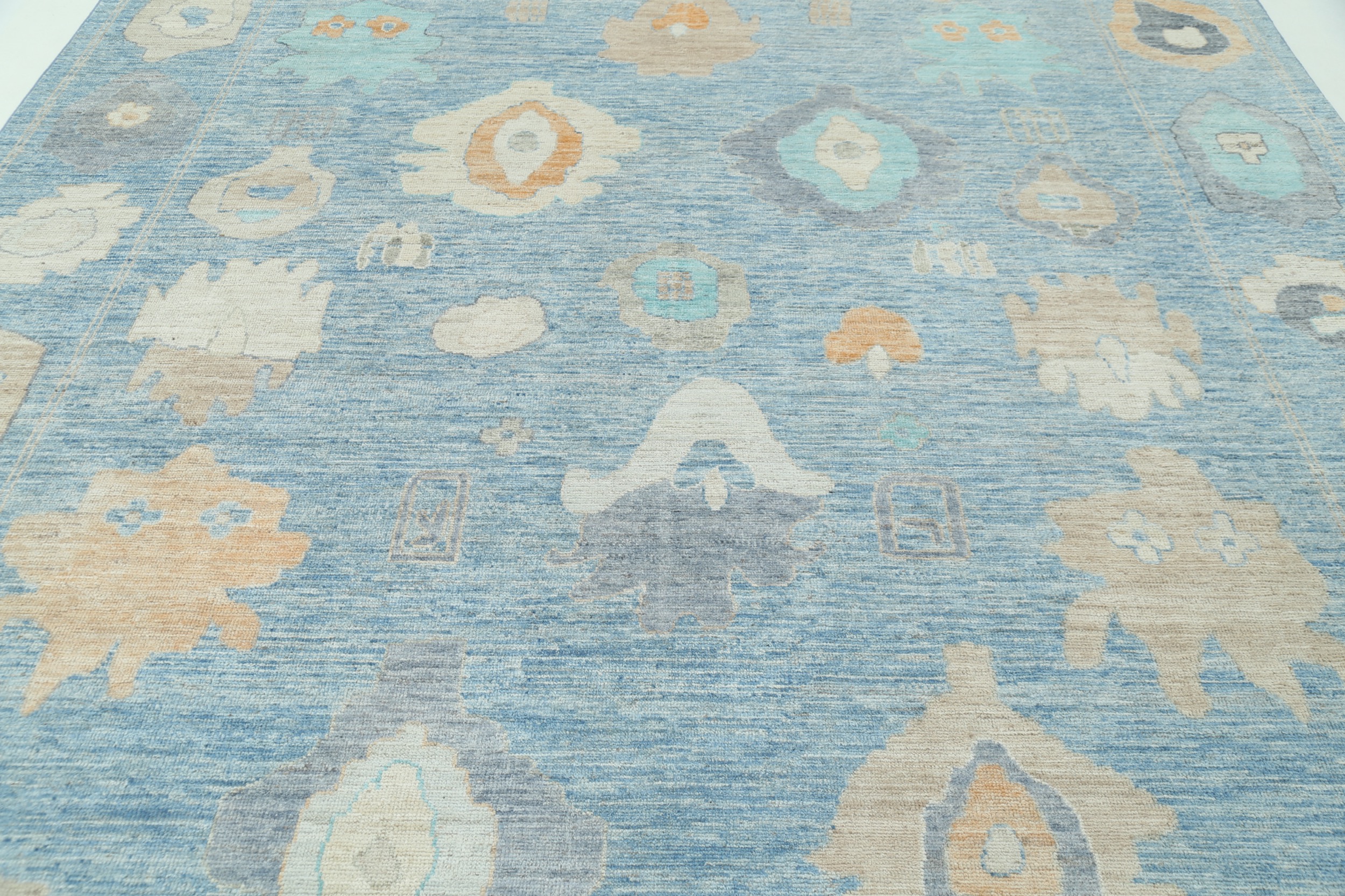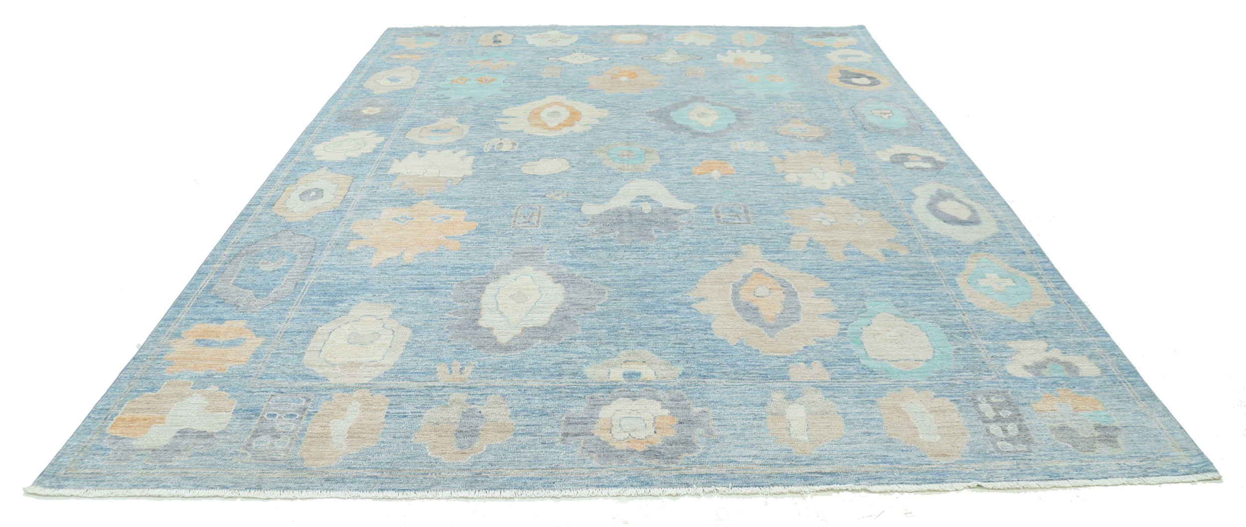 This 9’0″ x 11’11” Oushak rug, hand-knotted in Afghan / Pakistan, features a allover design. It is woven with Approx. 144 KPSI, showcasing a field in Blue and a Beige border. The rug has a Low Medium Pile and a 100% Wool pile, and is in excellent condition.