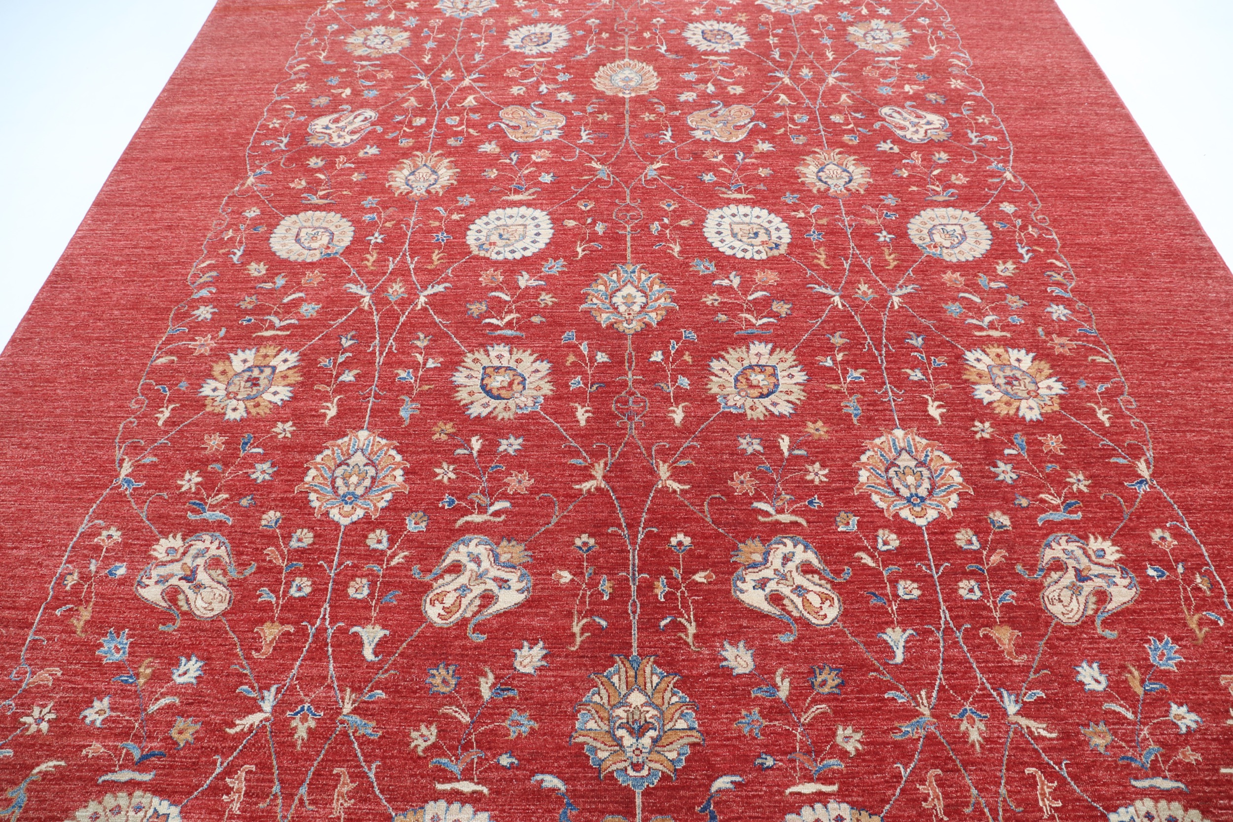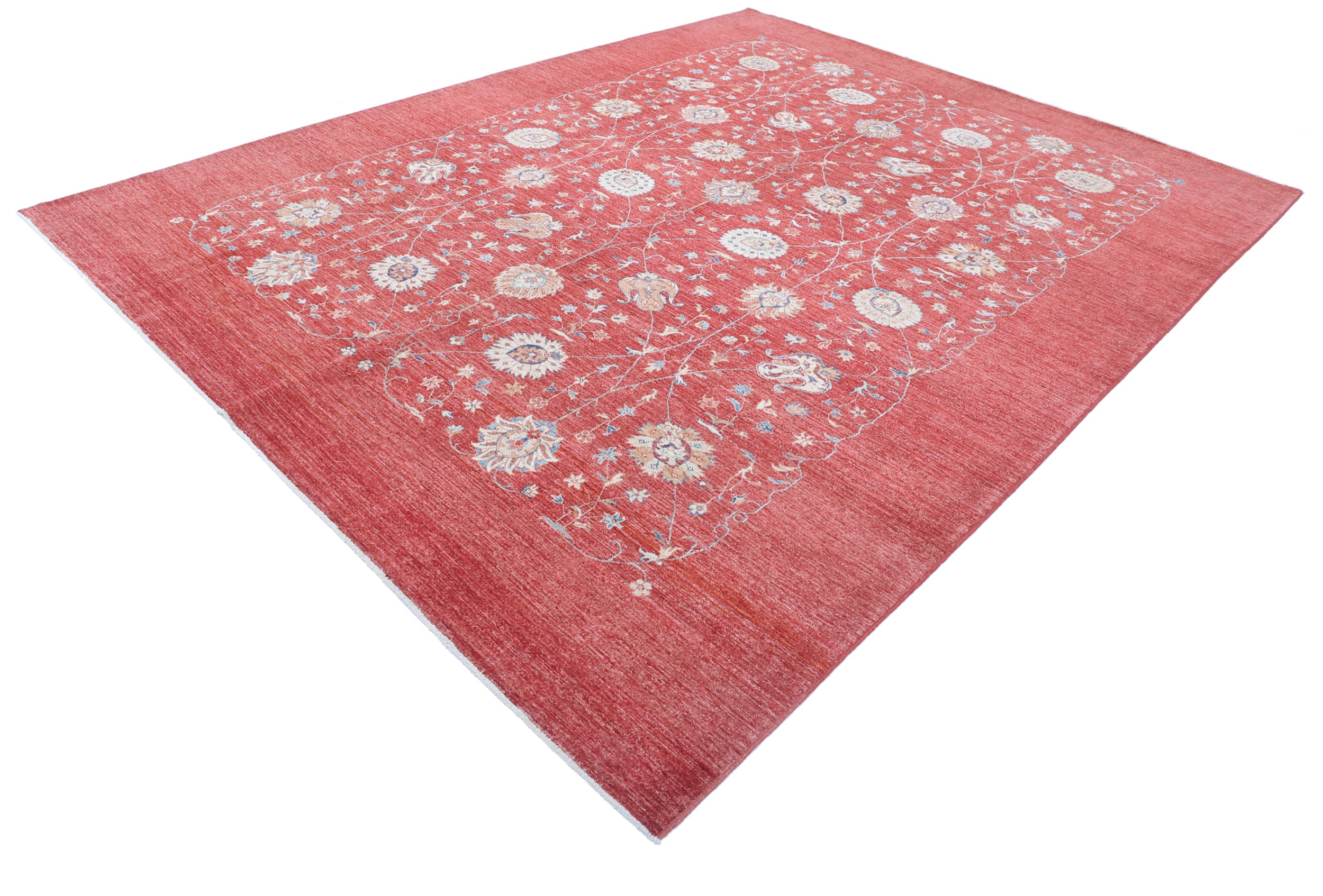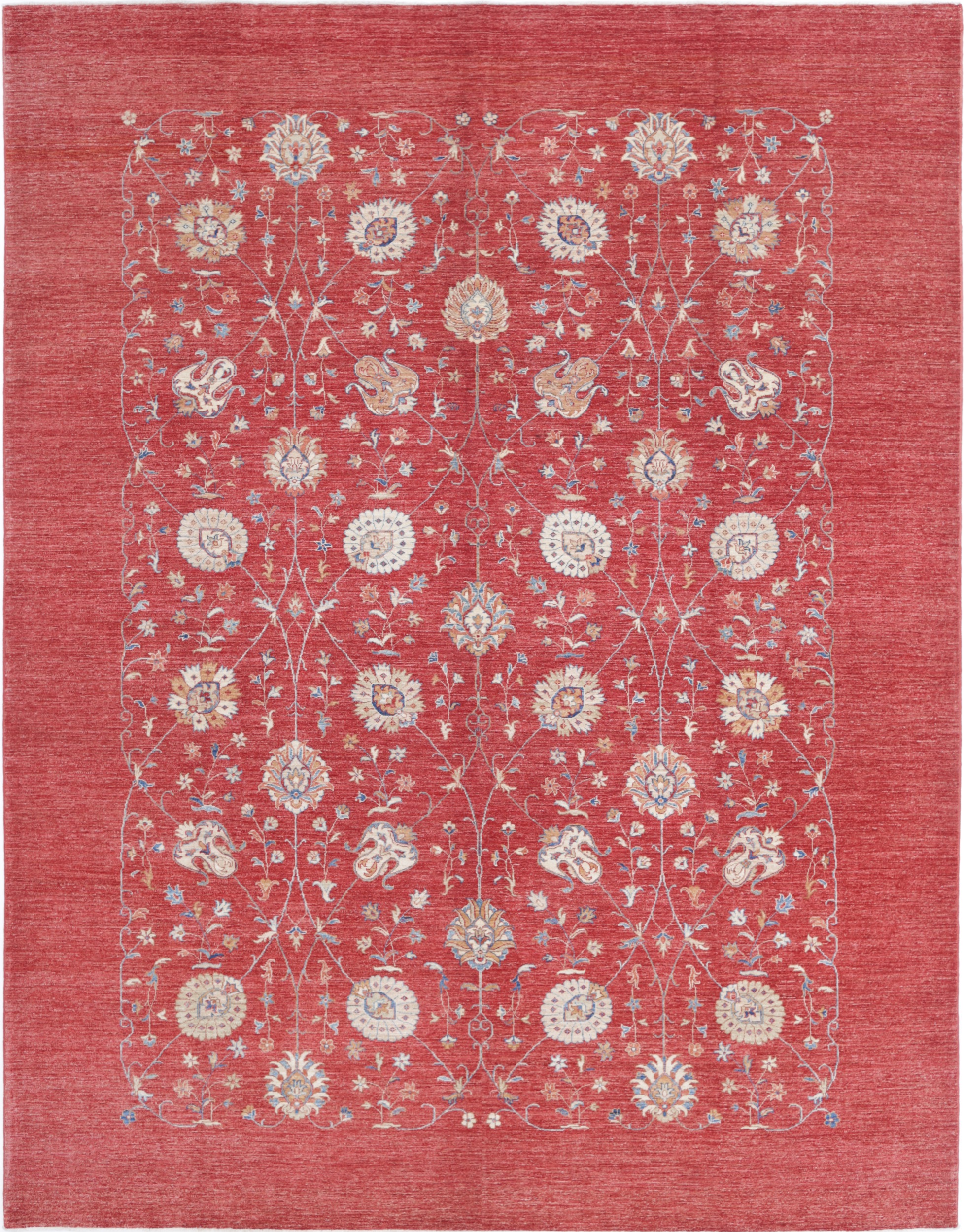 This 9’0″ x 11’6″ Oushak rug, hand-knotted in Afghan / Pakistan, features a allover design. It is woven with Approx. 169 KPSI, showcasing a field in Red and a Red border. The rug has a Low Medium Pile and a 100% Wool pile, and is in excellent condition.