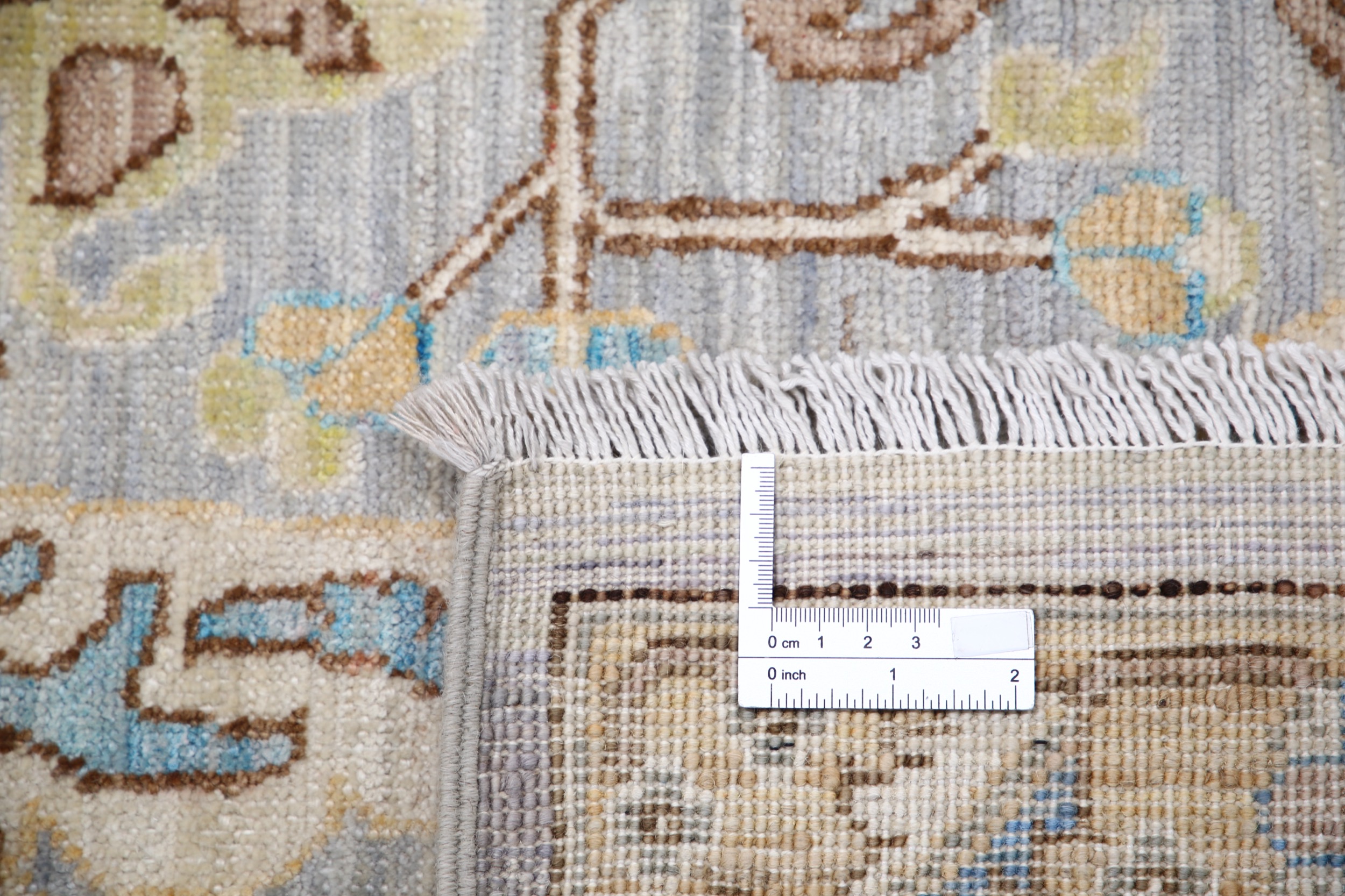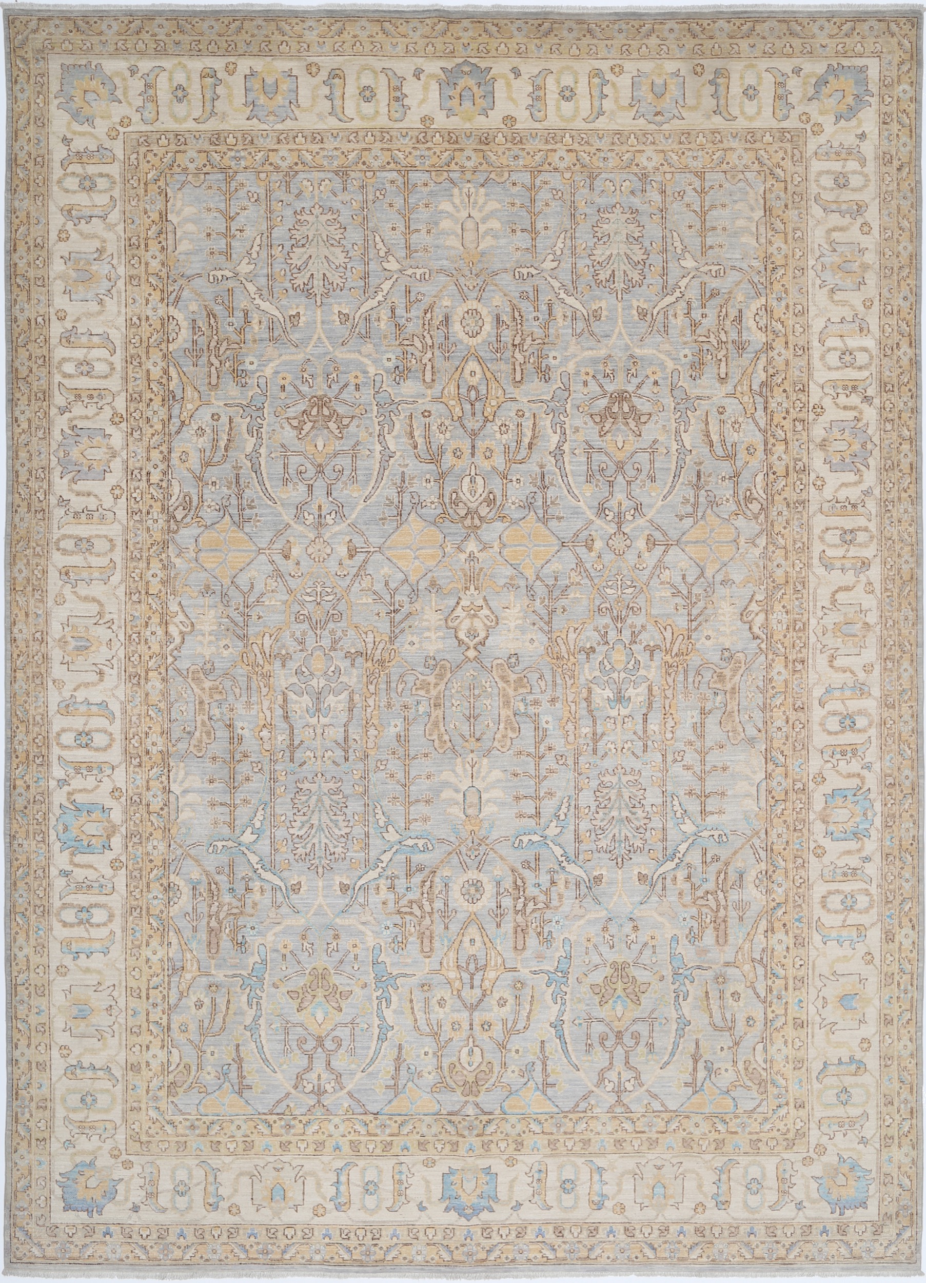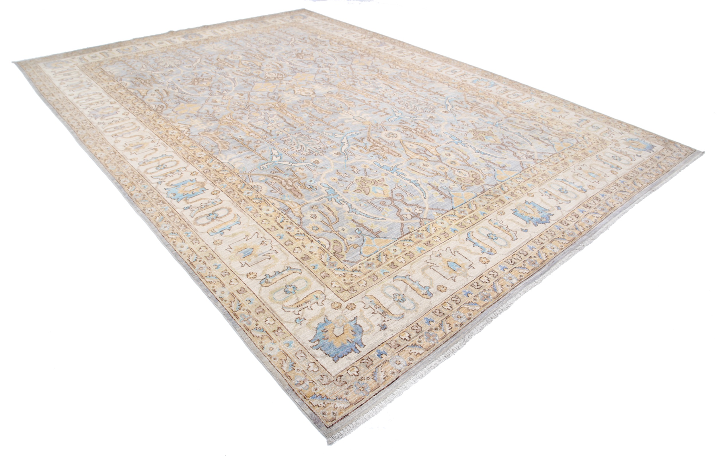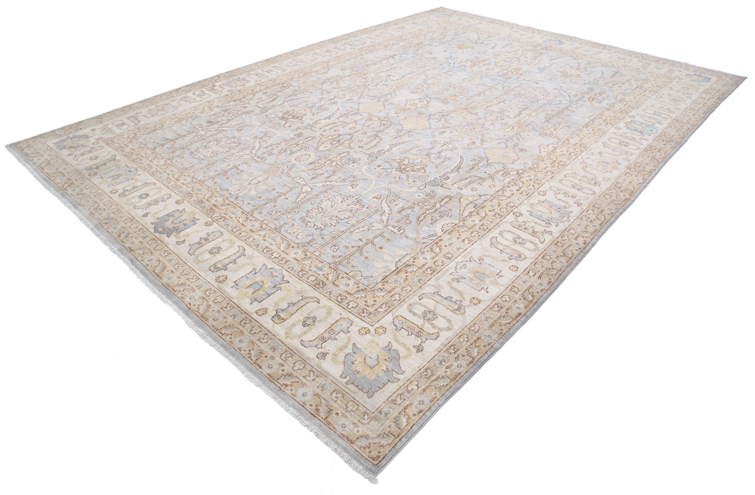 This 9’10” x 13’10” Oushak rug, hand-knotted in Afghan / Pakistan, features a allover design. It is woven with Approx. 156KPSI, showcasing a field in Gray and a Beige border. The rug has a Low Medium Pile and a 100% Wool pile, and is in excellent condition.