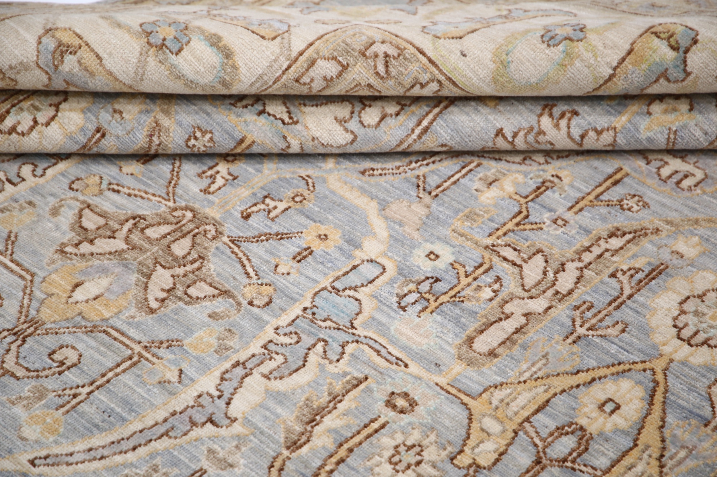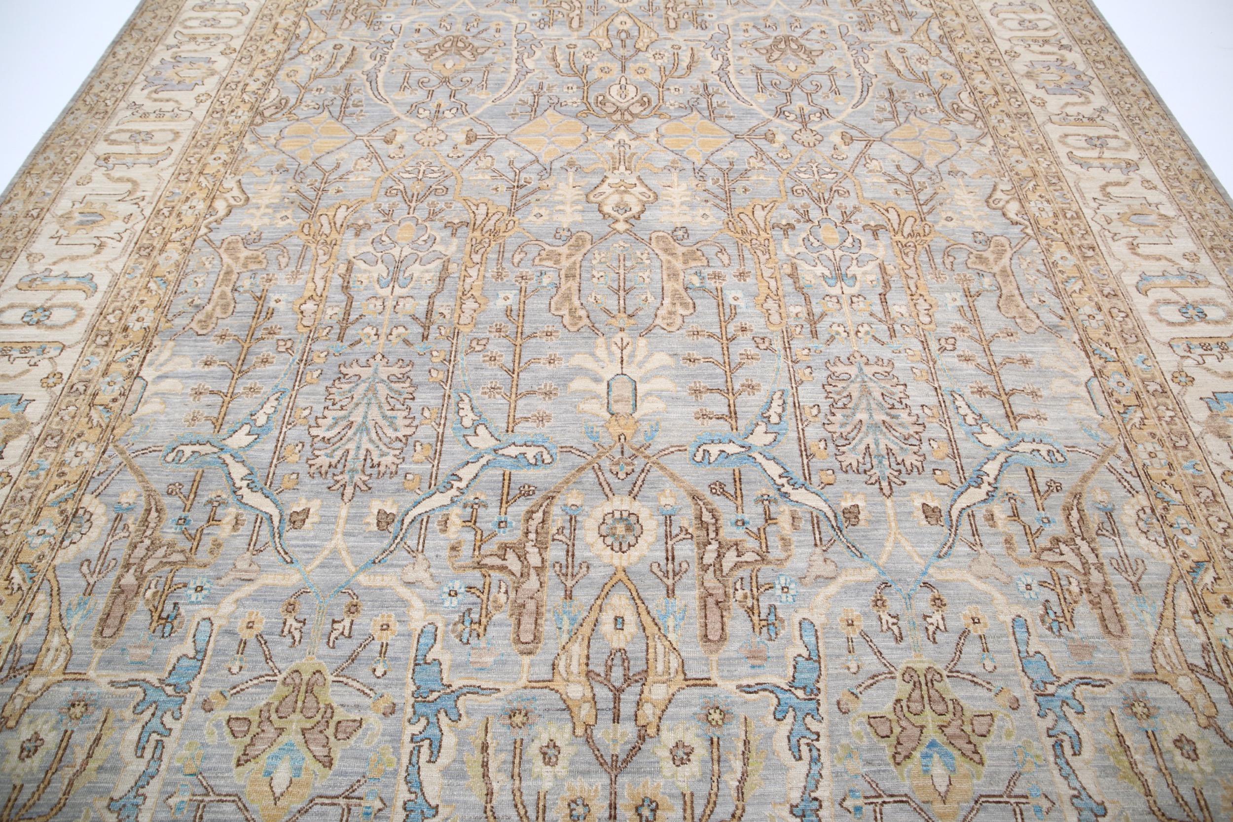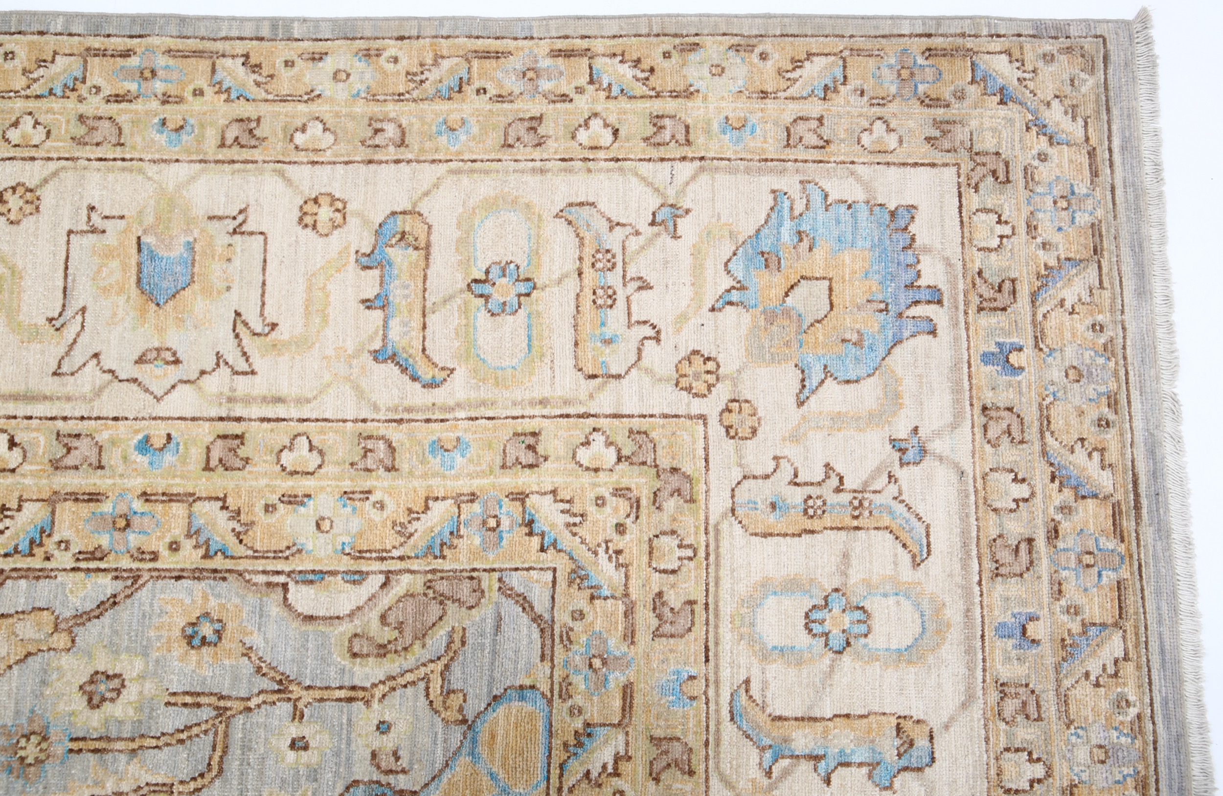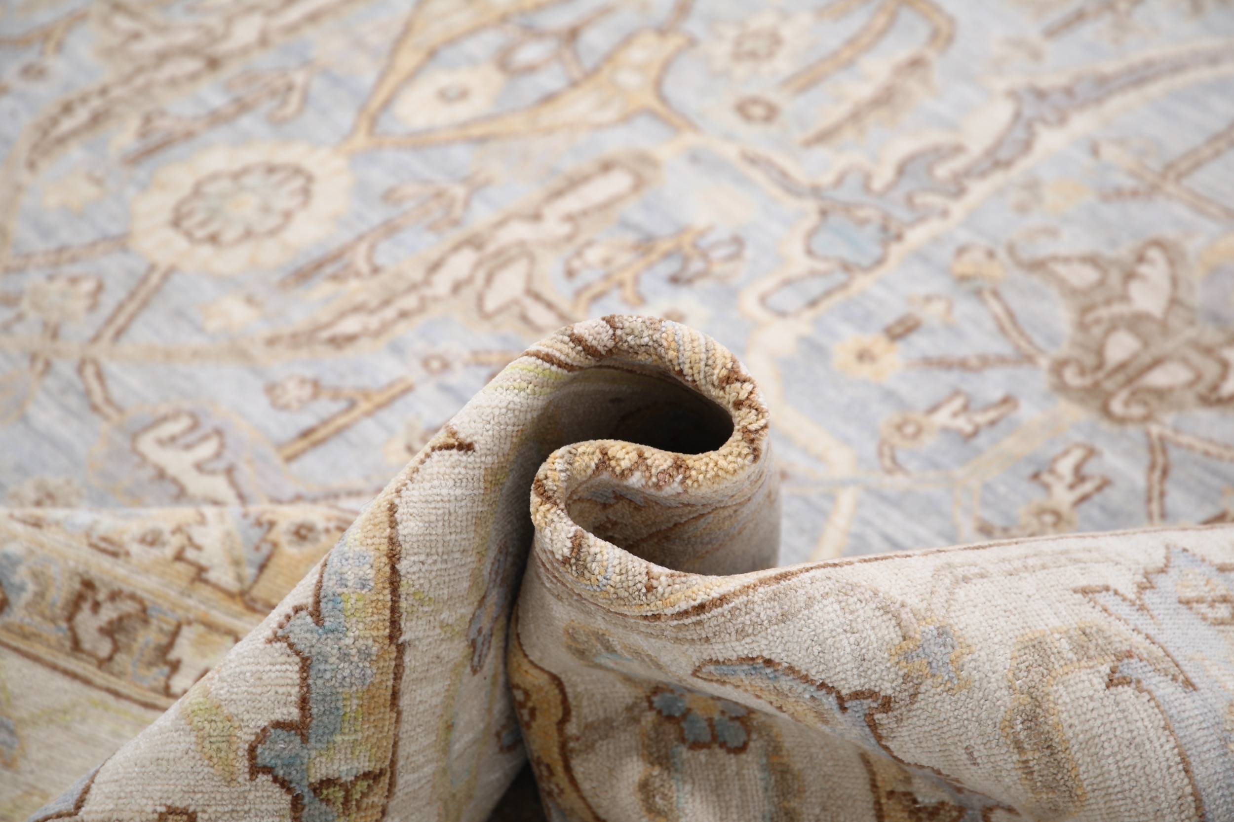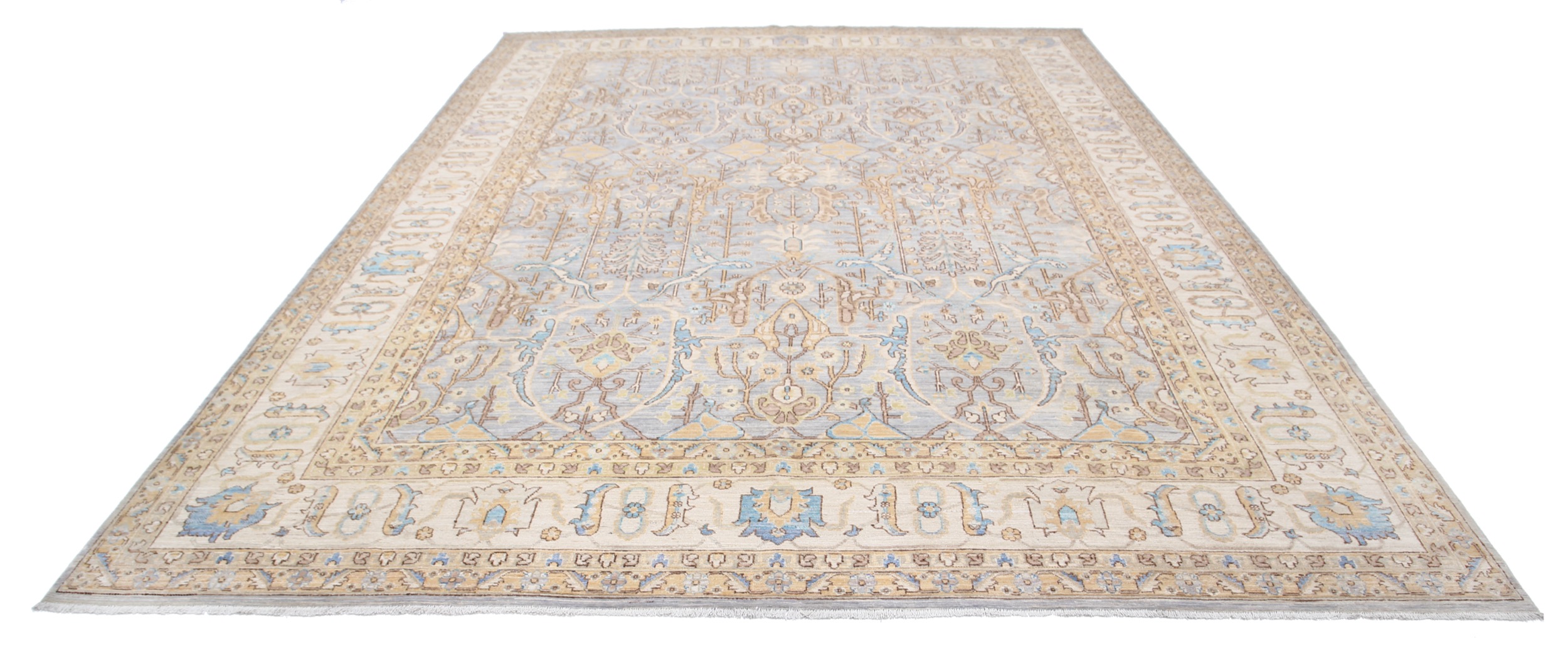 This 9’10” x 13’10” Oushak rug, hand-knotted in Afghan / Pakistan, features a allover design. It is woven with Approx. 156KPSI, showcasing a field in Gray and a Beige border. The rug has a Low Medium Pile and a 100% Wool pile, and is in excellent condition.