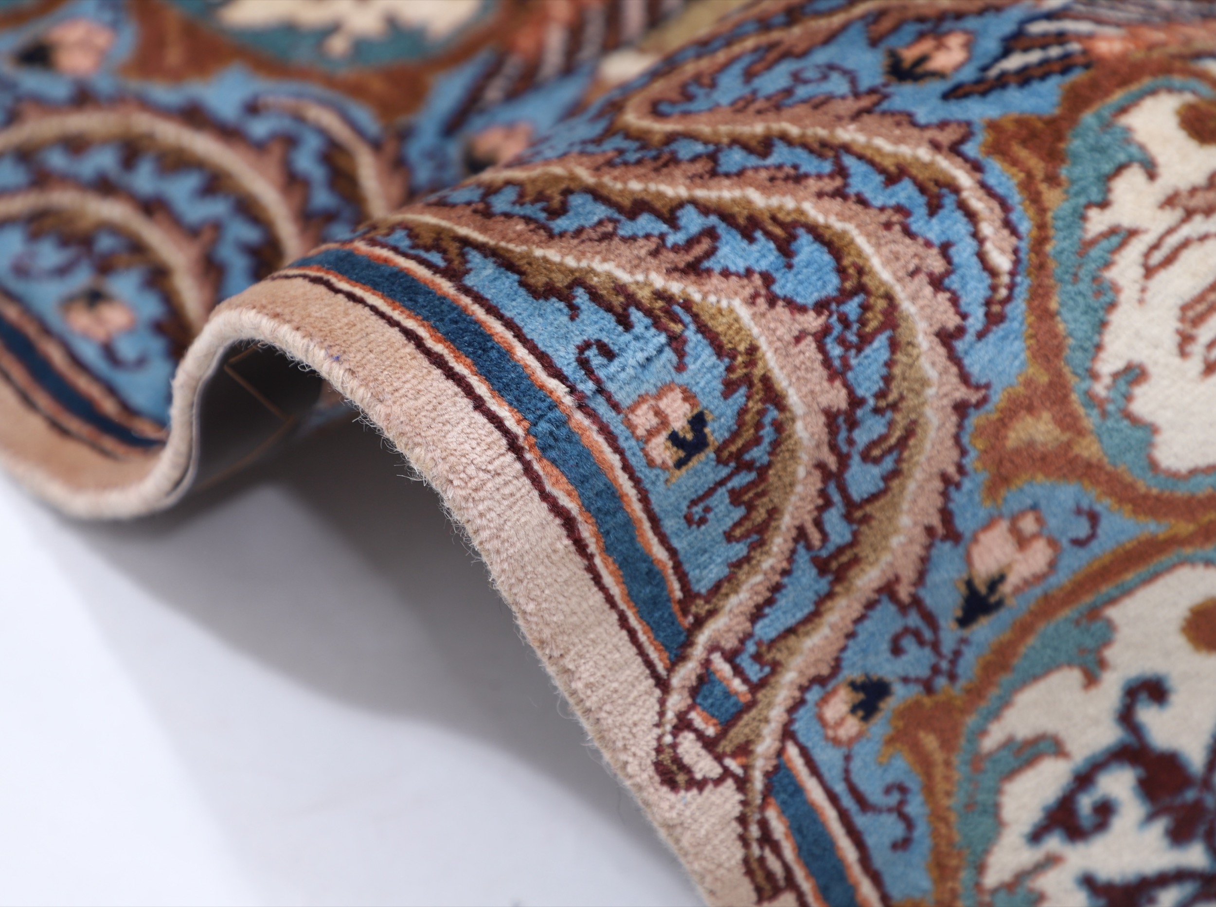 This exquisite Hand Knotted Kashmar Persian rug, boasting a size of 9’10” x 13’2″ and an impressive knot count of approximately 225 KPSI, is a true masterpiece. Aged between 30-40 years, the rug features a beautiful Beige Blue Tree of Life motif that is sure to add a touch of elegance to any interior space. Made from 100% wool and cotton, the rug has a high pile of 1/2″-5’8″, ensuring superior comfort and durability. Its timeless beauty and exceptional quality make it a highly sought-after piece for collectors of fine traditional Persian rugs.