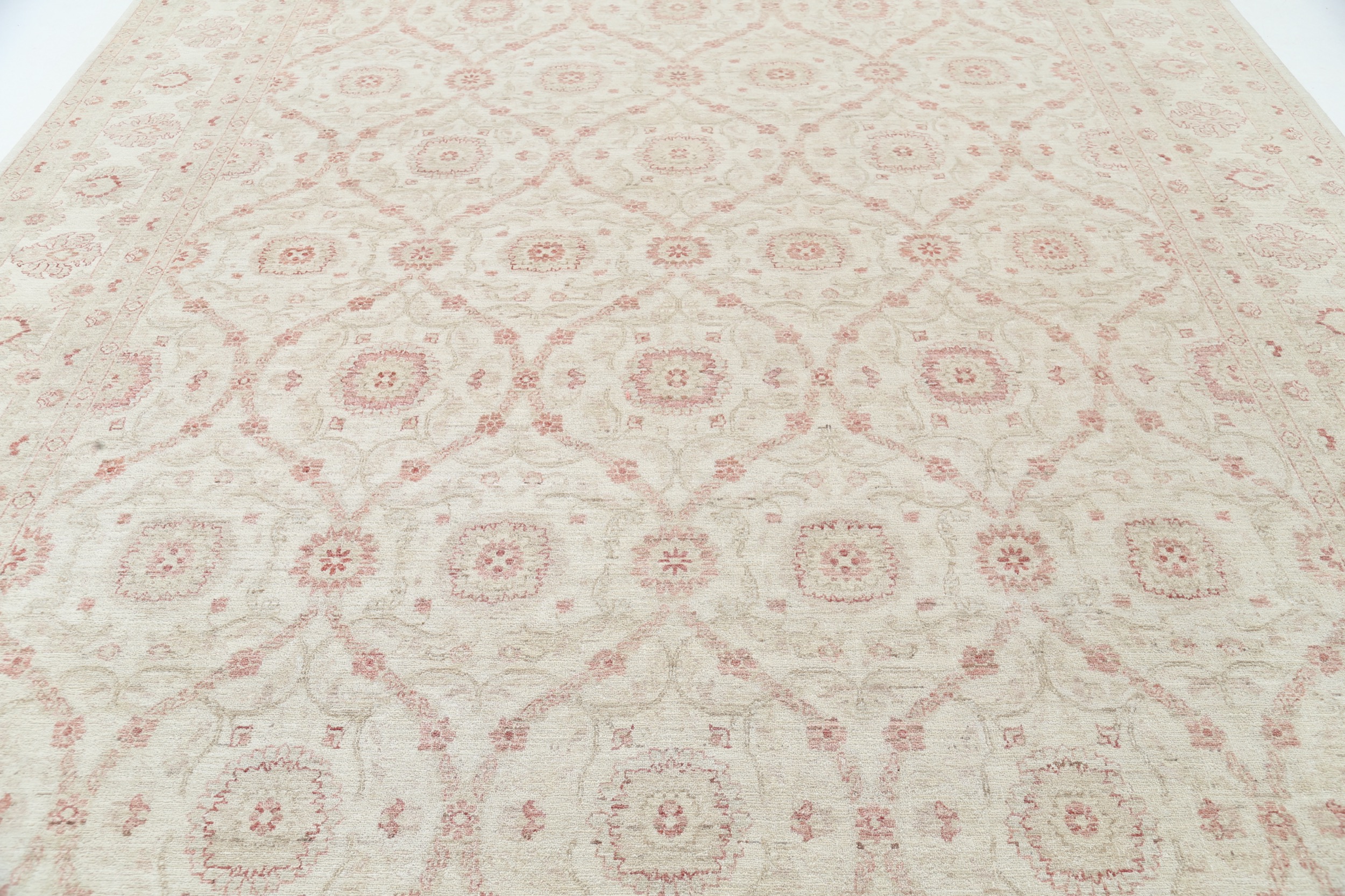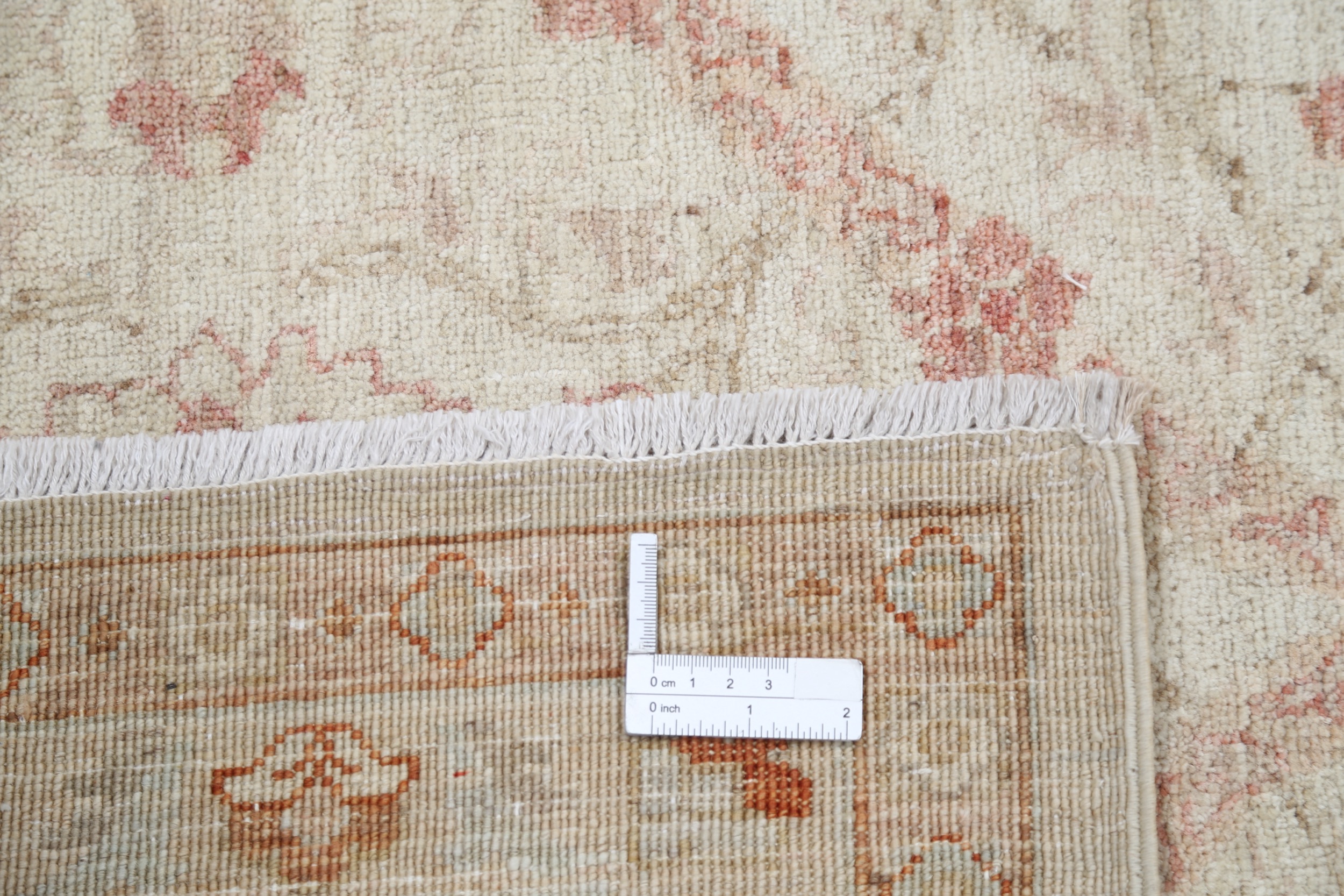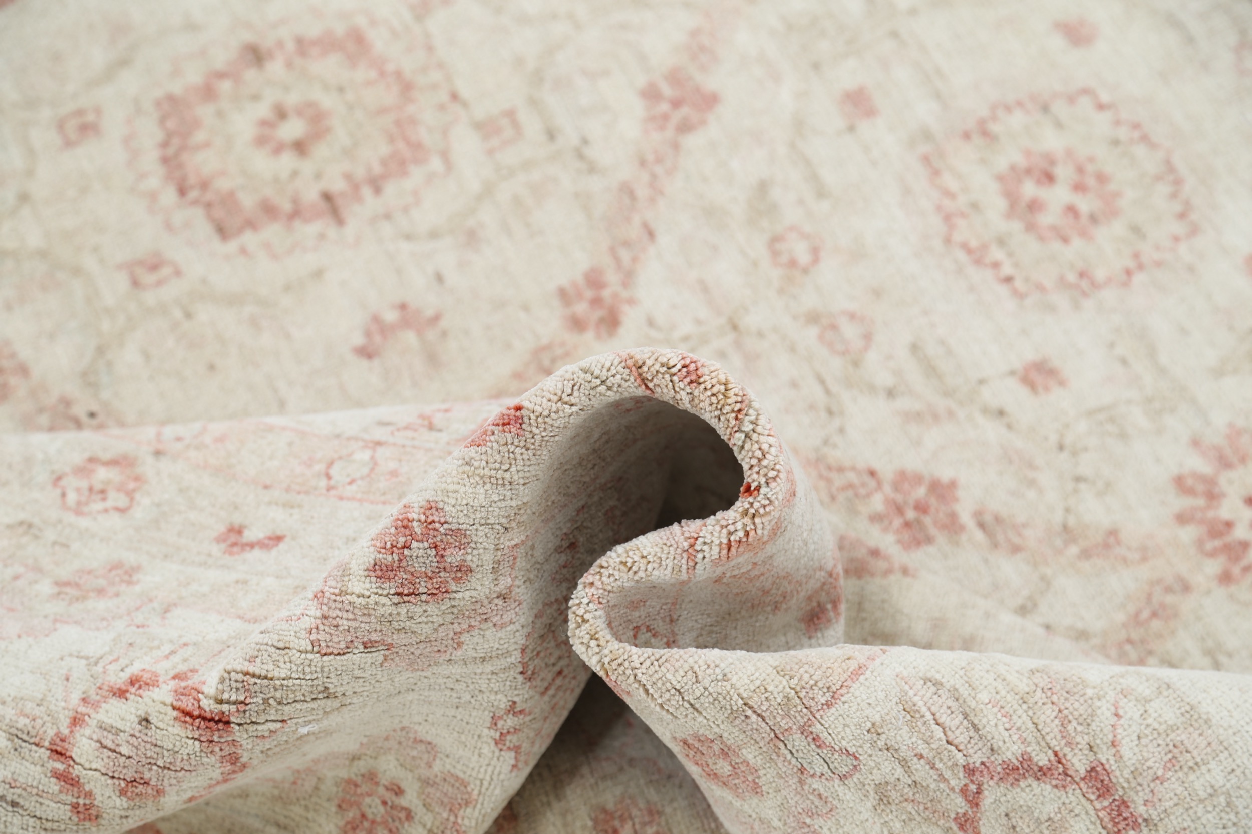 Introducing the Oushak Oriental rug, a masterpiece of hand-knotted craftsmanship. This 9’10” x 13’2” rug features a beautiful beige floral design that adds elegance to any space. With approximately 156 knots per square inch (KPSI), it showcases the attention to detail and quality. Made from 100% wool and cotton blend, it offers durability and softness underfoot. The low to medium pile height of 1/4″-1/3″ ensures easy maintenance and a comfortable feel. This rug is in excellent condition and has been washed carefully, making it a fantastic addition to your home decor.