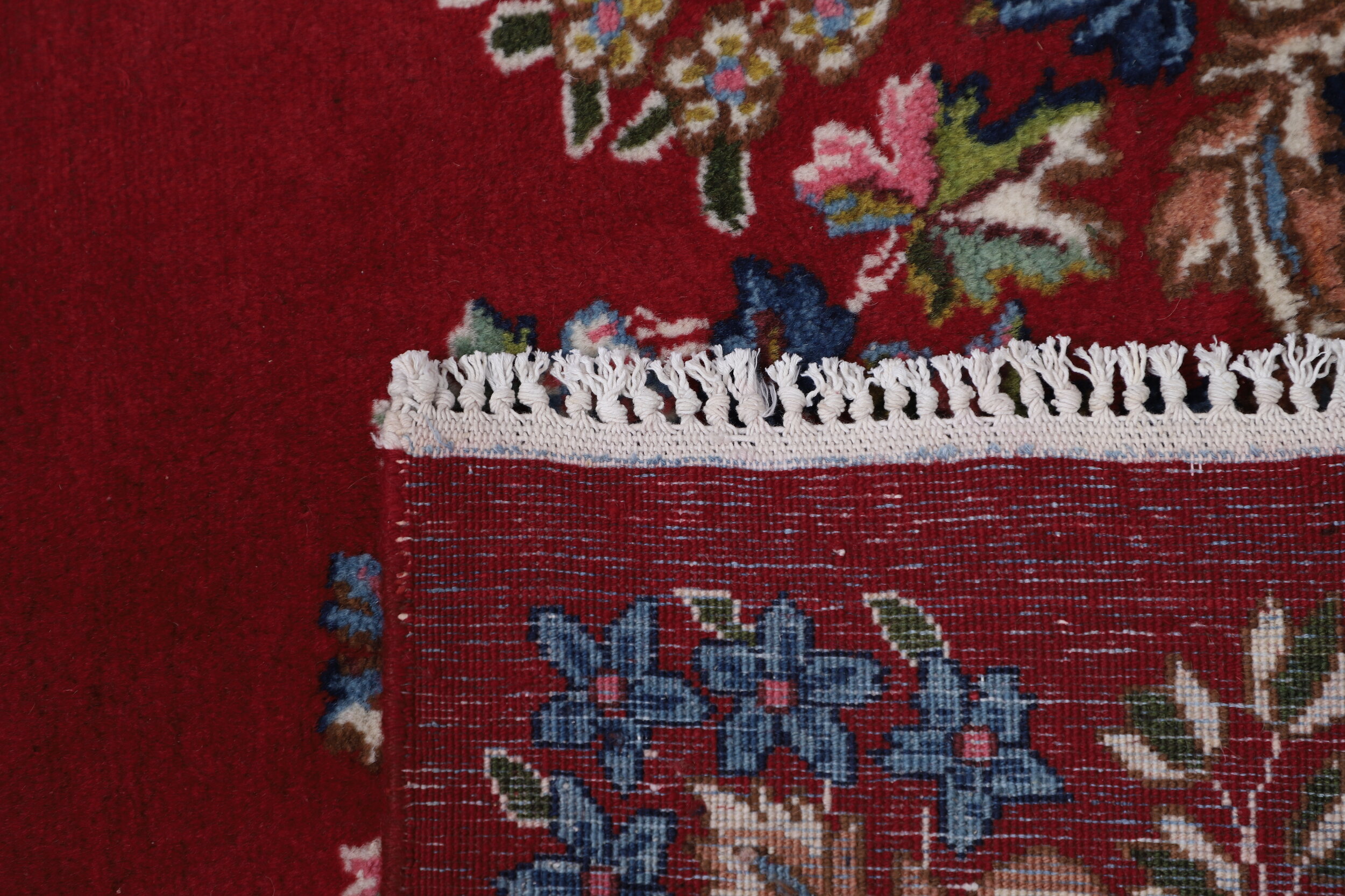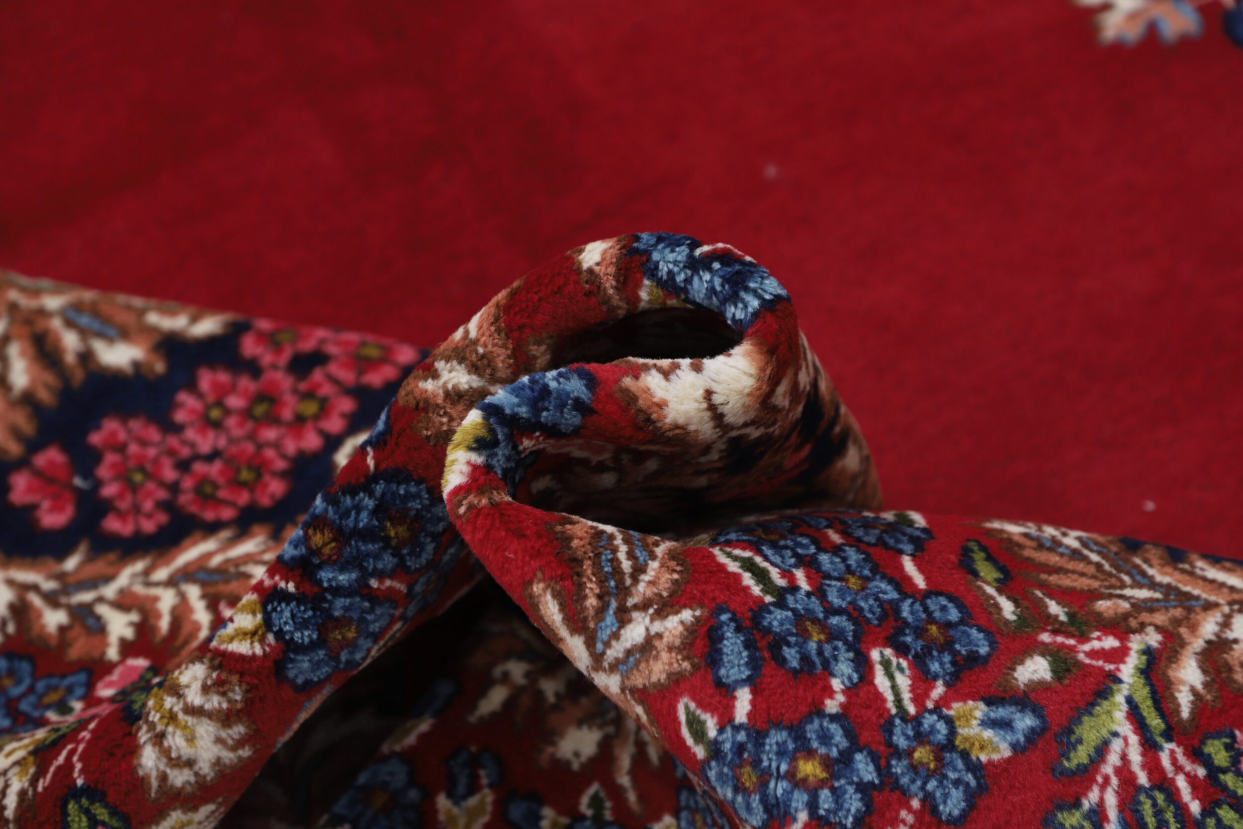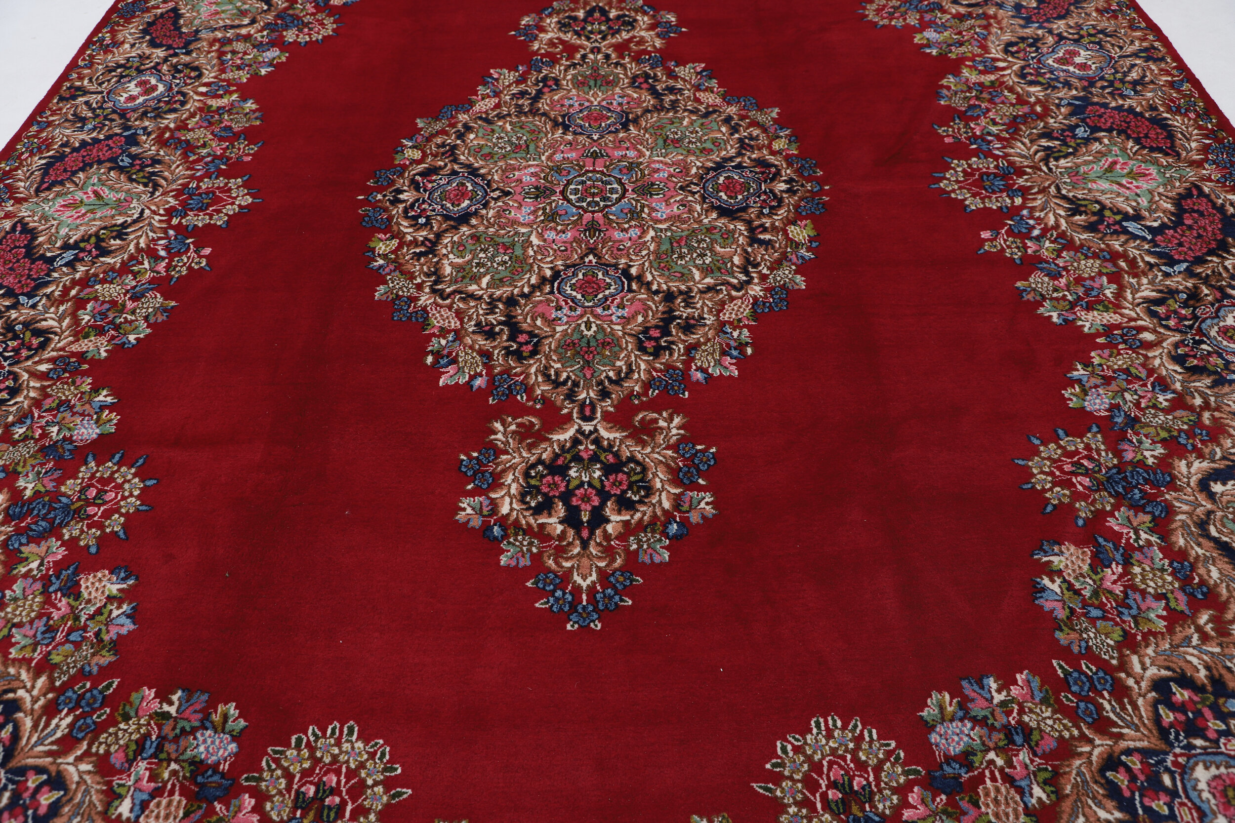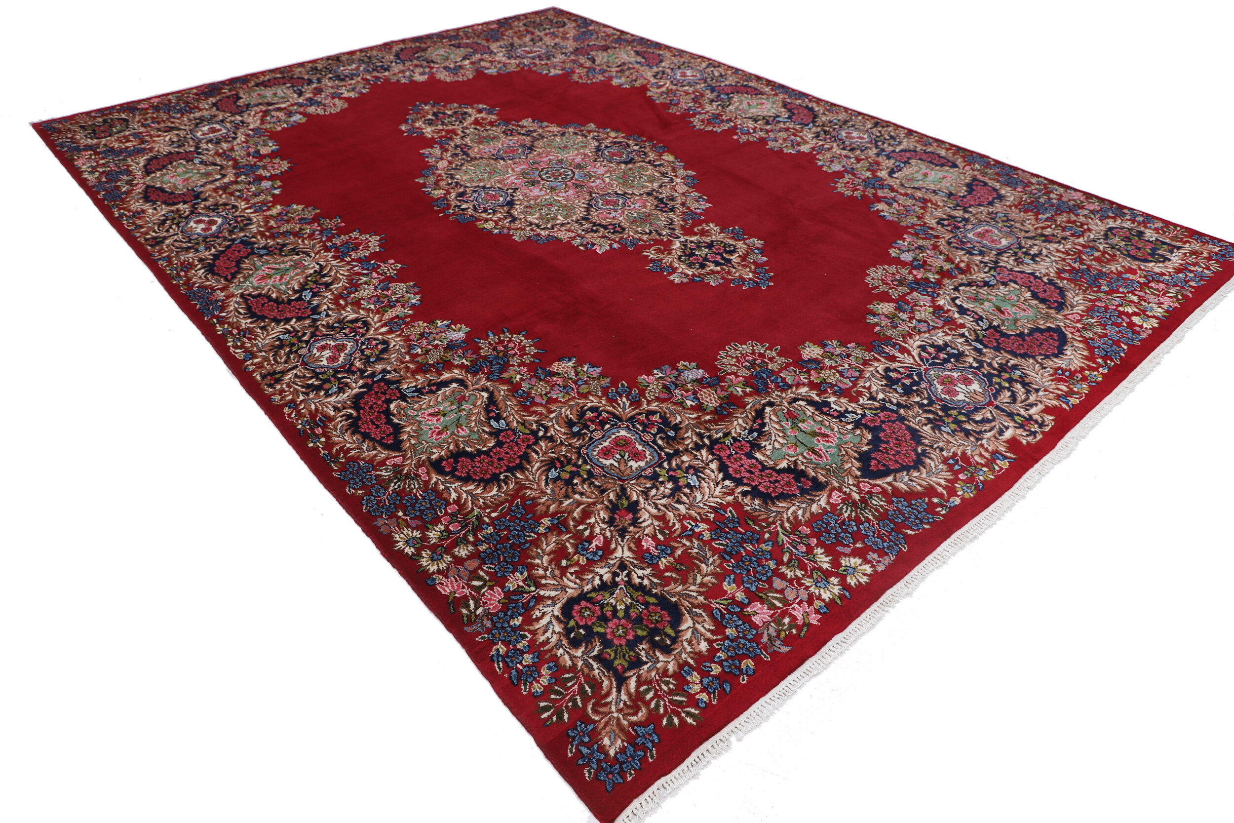 This 9”10″ x 13’6″Kerman rug, hand-knotted in Persian, features a floral design. It is woven with Approx.196 KPS, showcasing a field in Red and a Bluke border. The rug has a Medium Pile and a 100% Wool pile, and is in excellent condition.