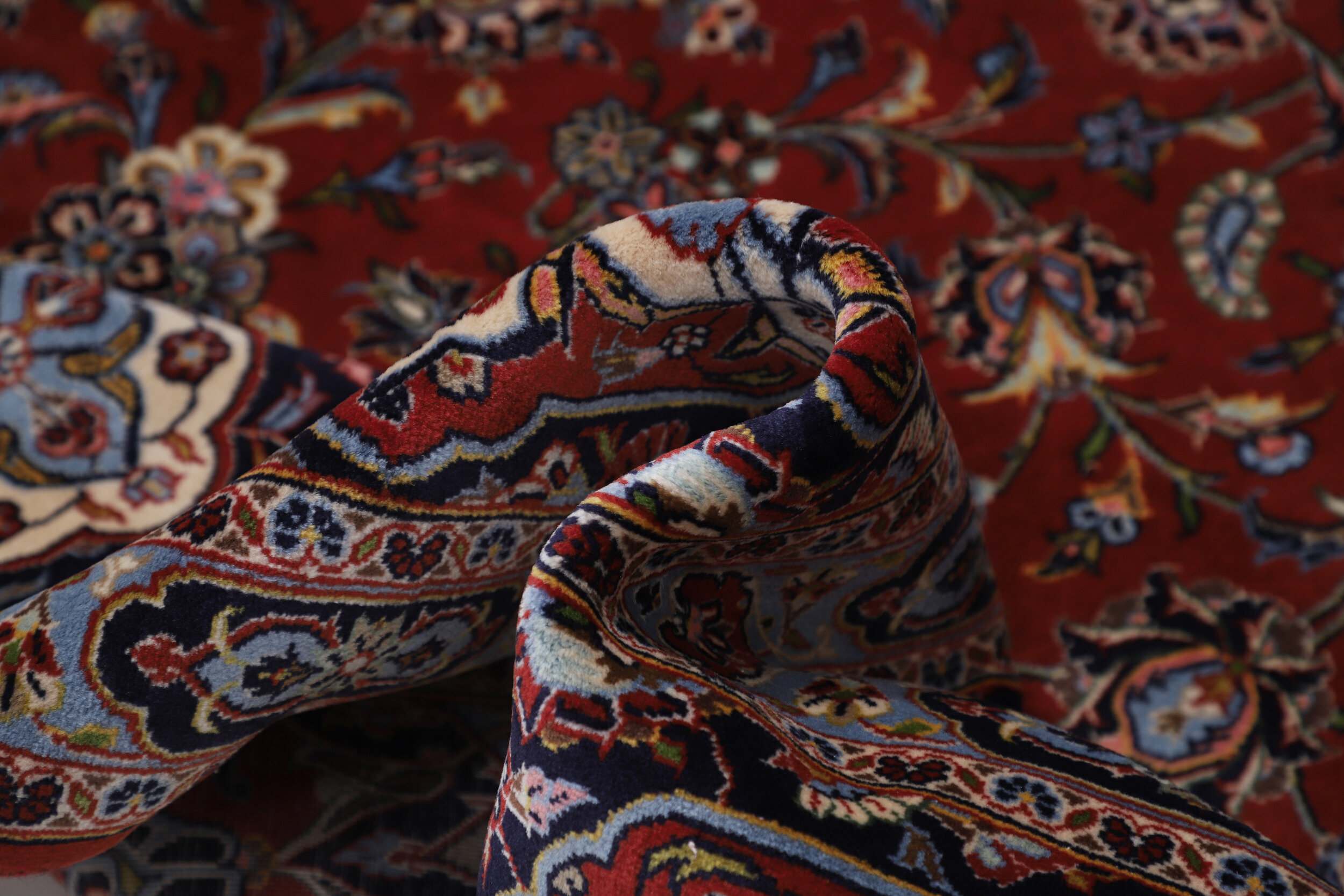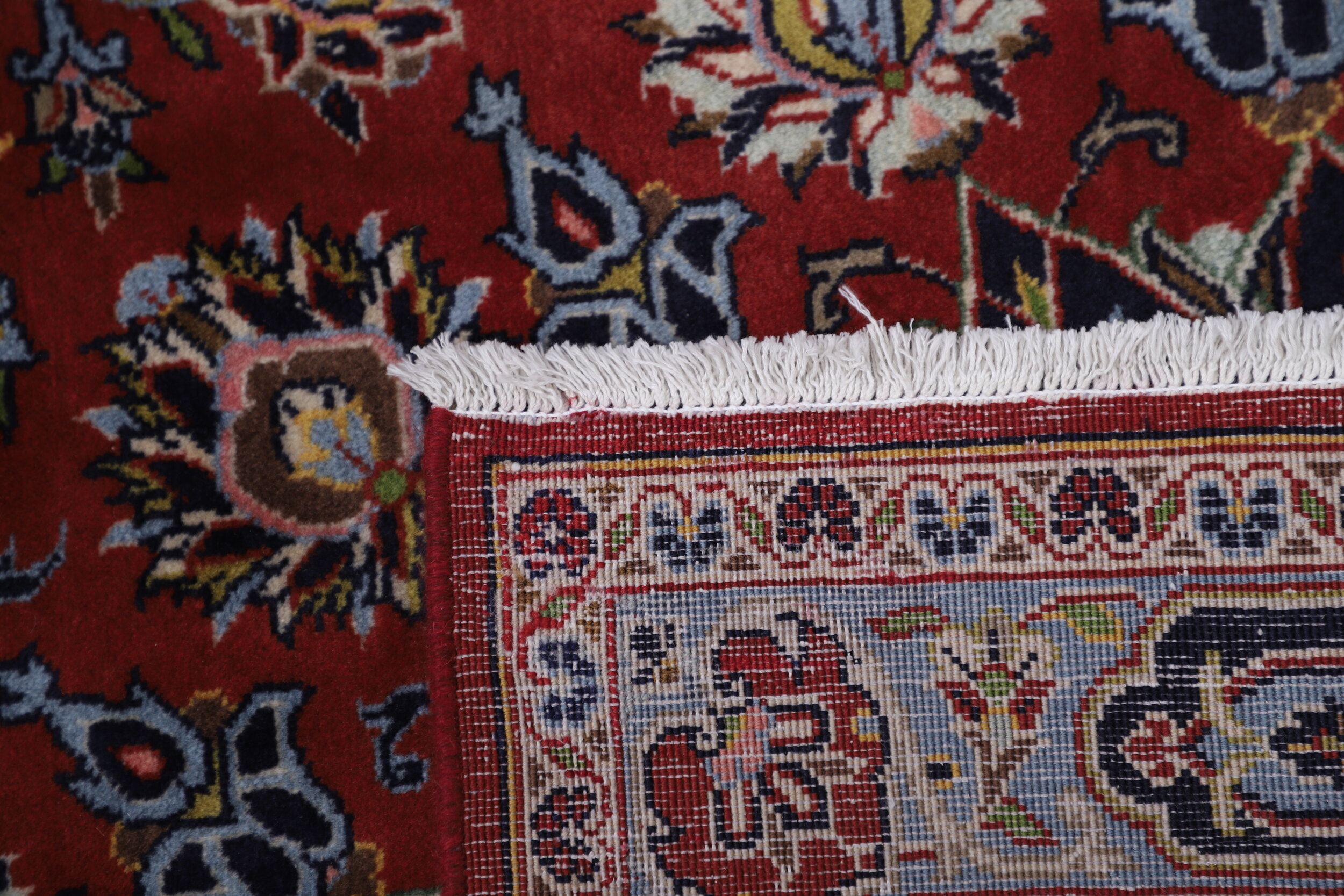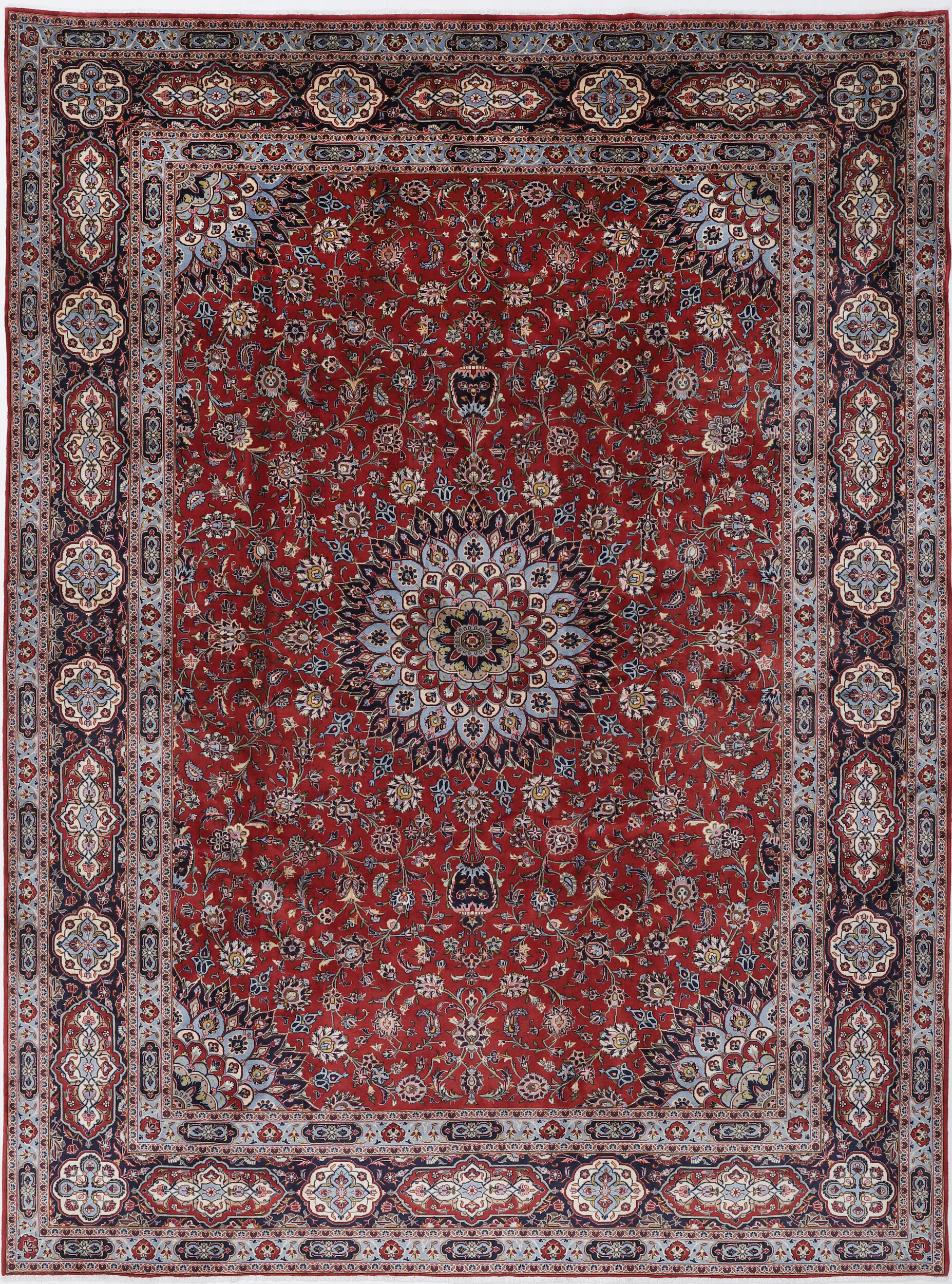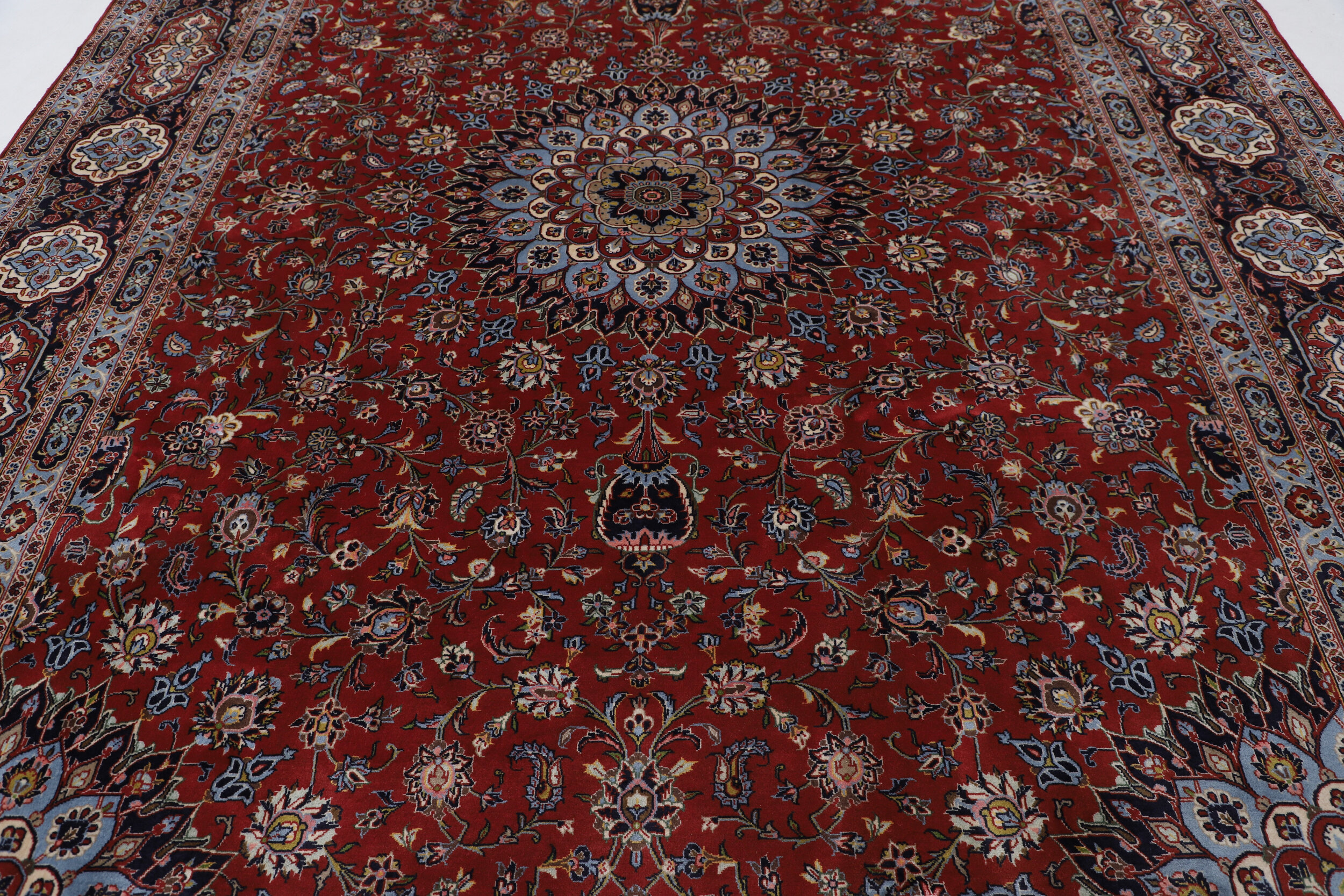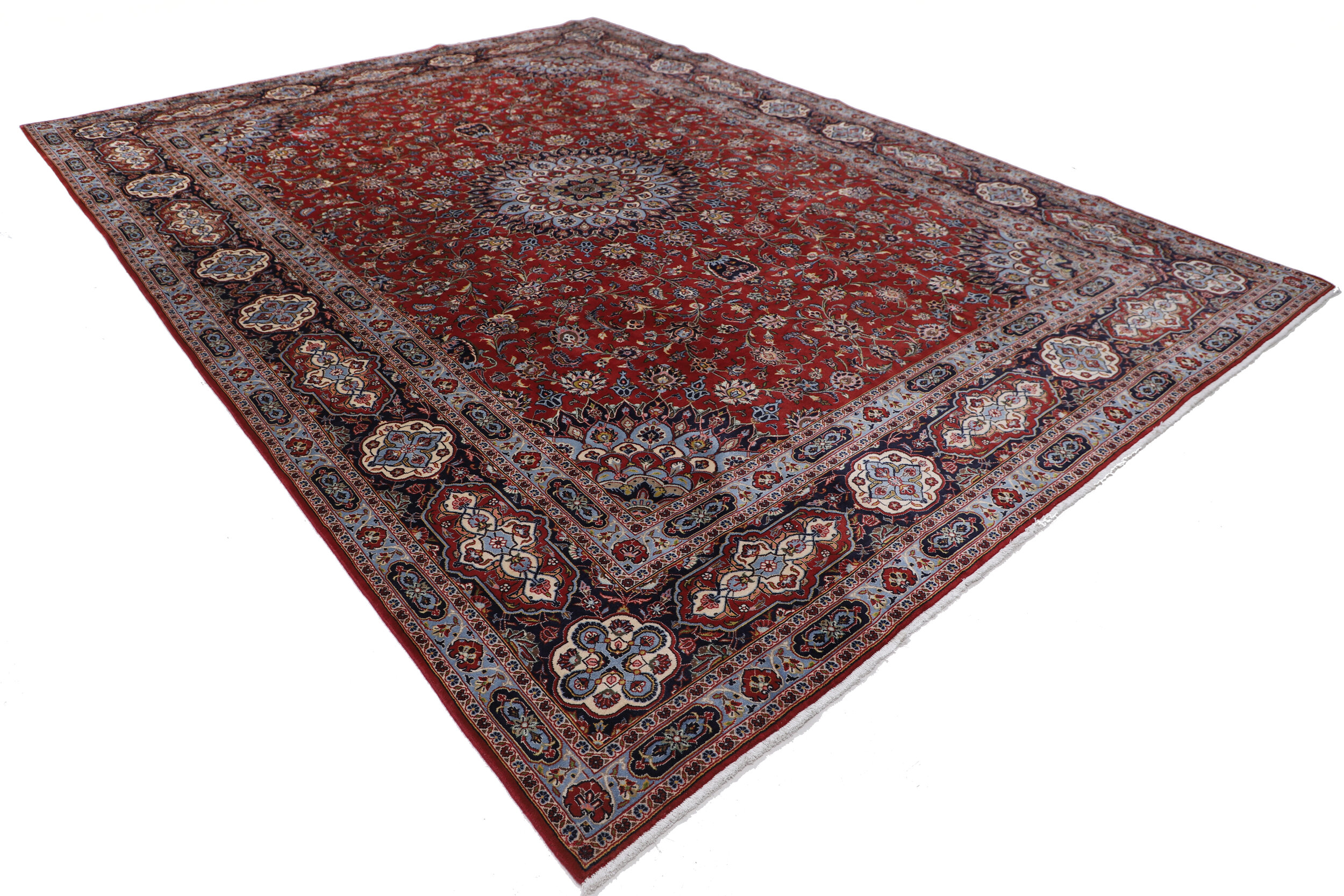 This Hand Knotted Kashan rug measures 9’10” x 13’4″ and features an aged (10-20 years) Red and Blue floral design. With an approximate knot count of 196 KPSI, this rug is made using 100% wool and cotton materials, and has a high pile height ranging from 1/2″ to 5’8″. This rug is perfect for adding warmth and texture to any living space or bedroom.