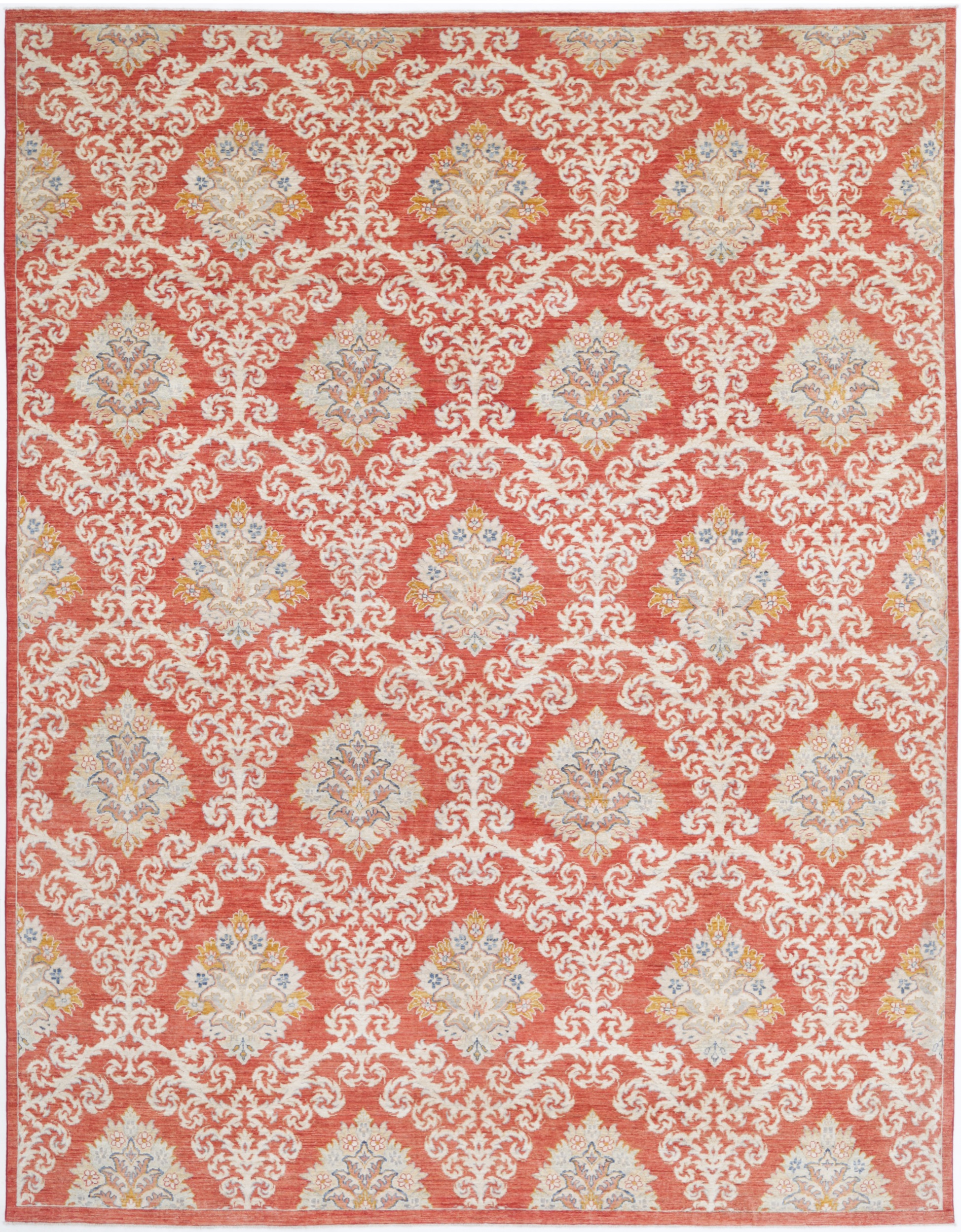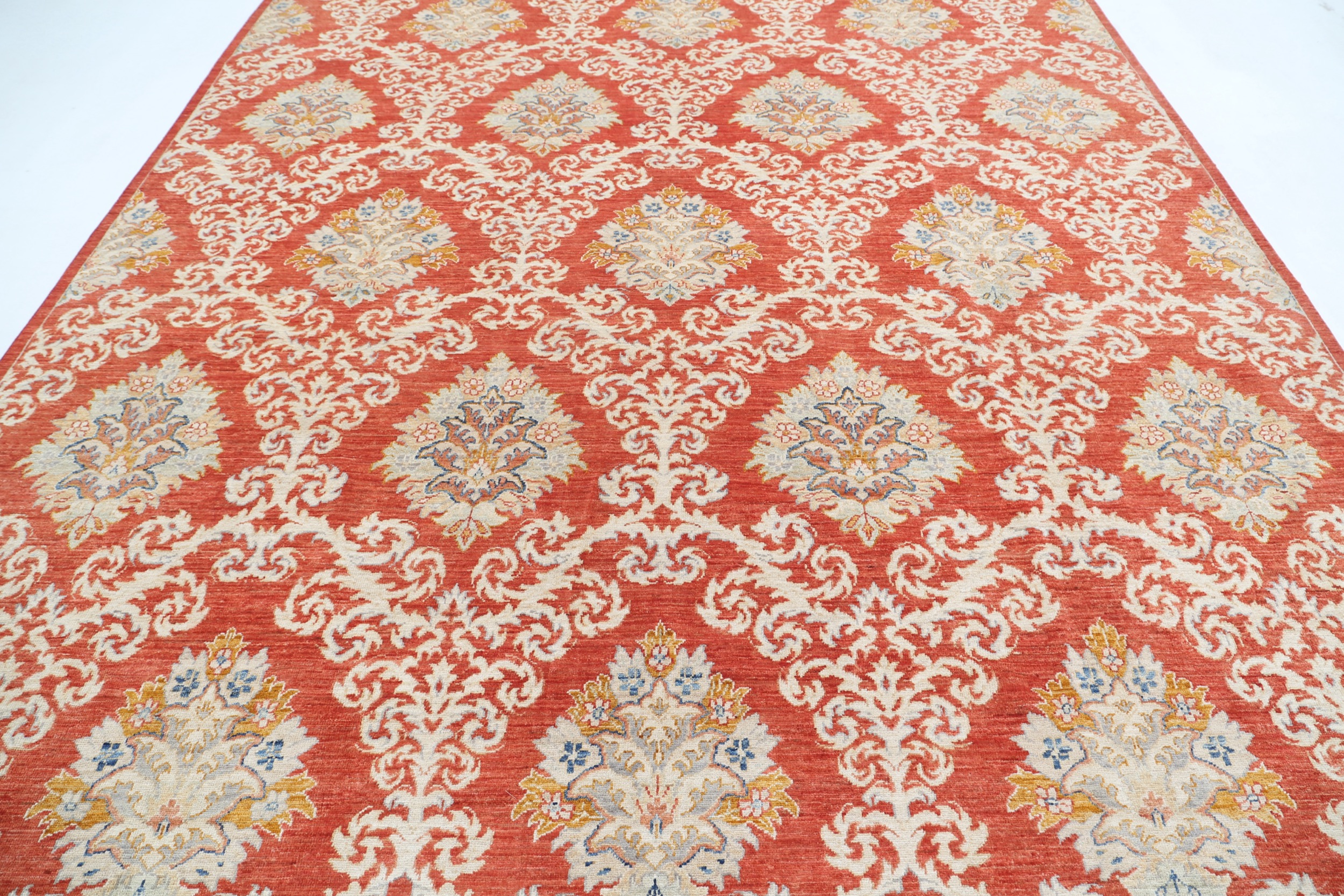 This 9’3″ x 12’2″ Oushak rug, hand-knotted in Afghan / Pakistan, features a floral design. It is woven with Approx. 169 KPSI, showcasing a field in Red and a Red border. The rug has a Low Medium Pile and a 100% Wool pile, and is in excellent condition.