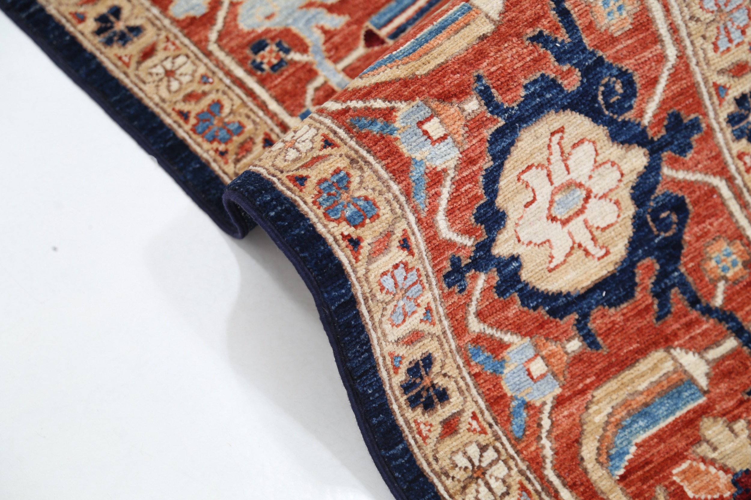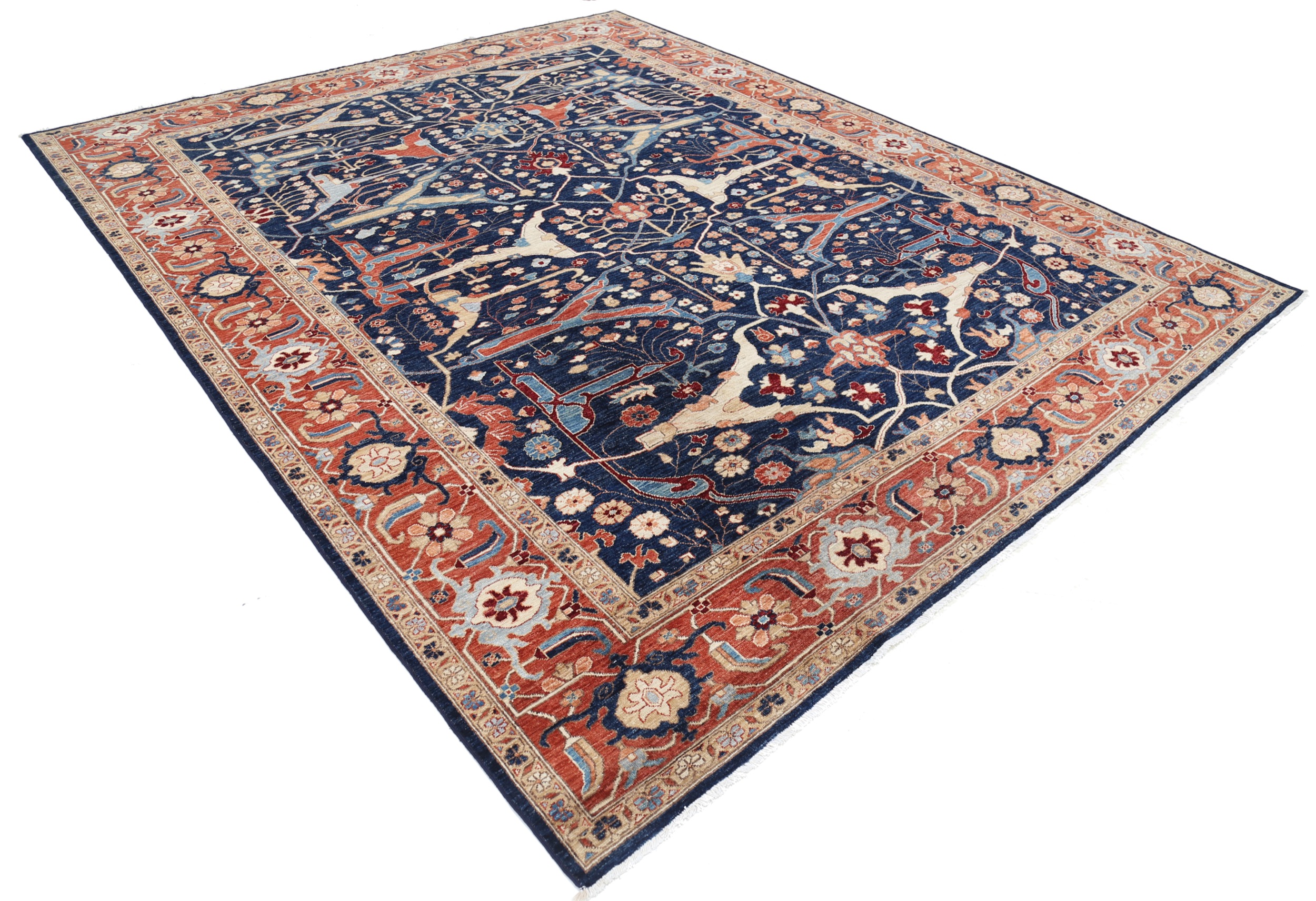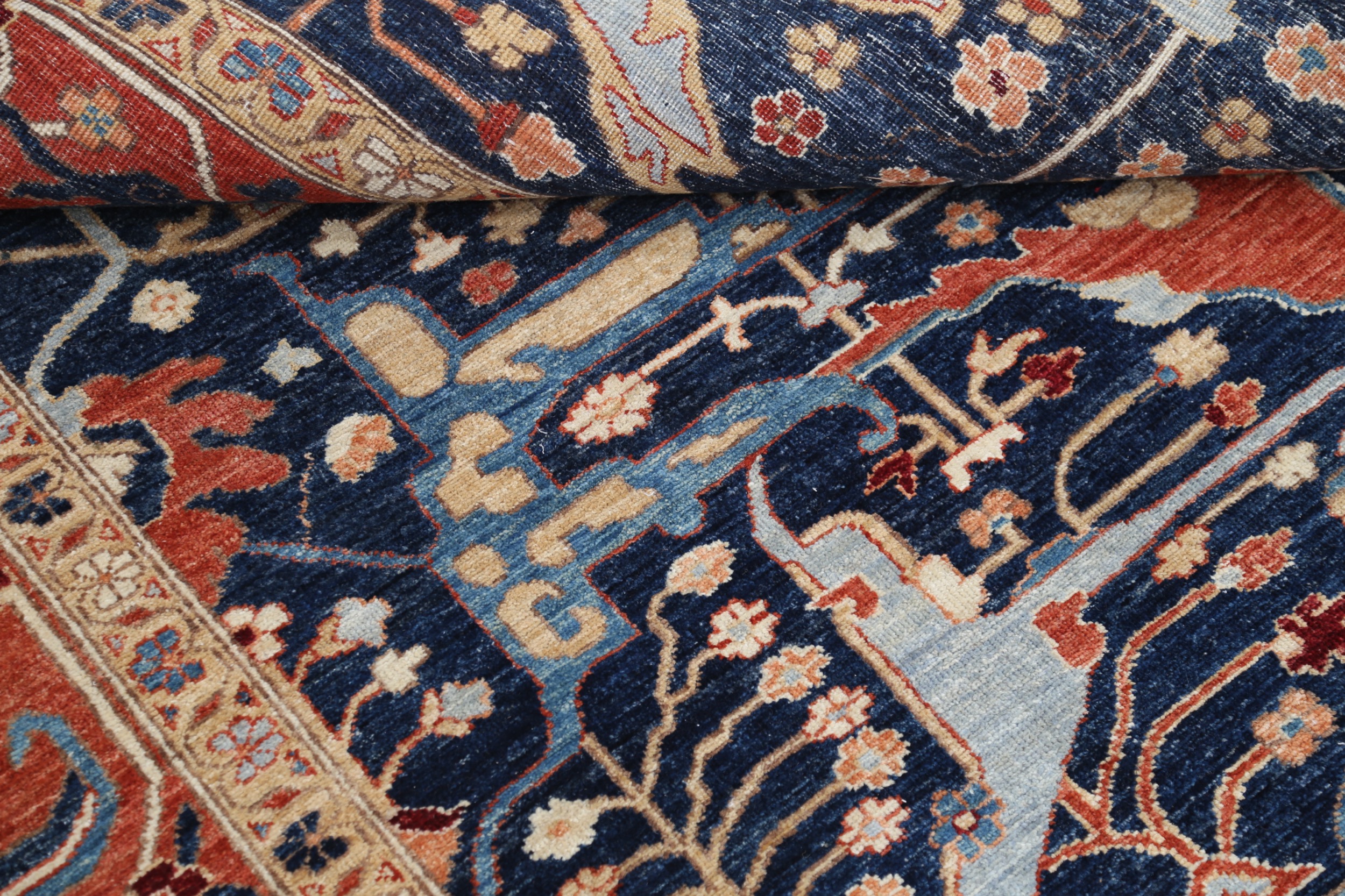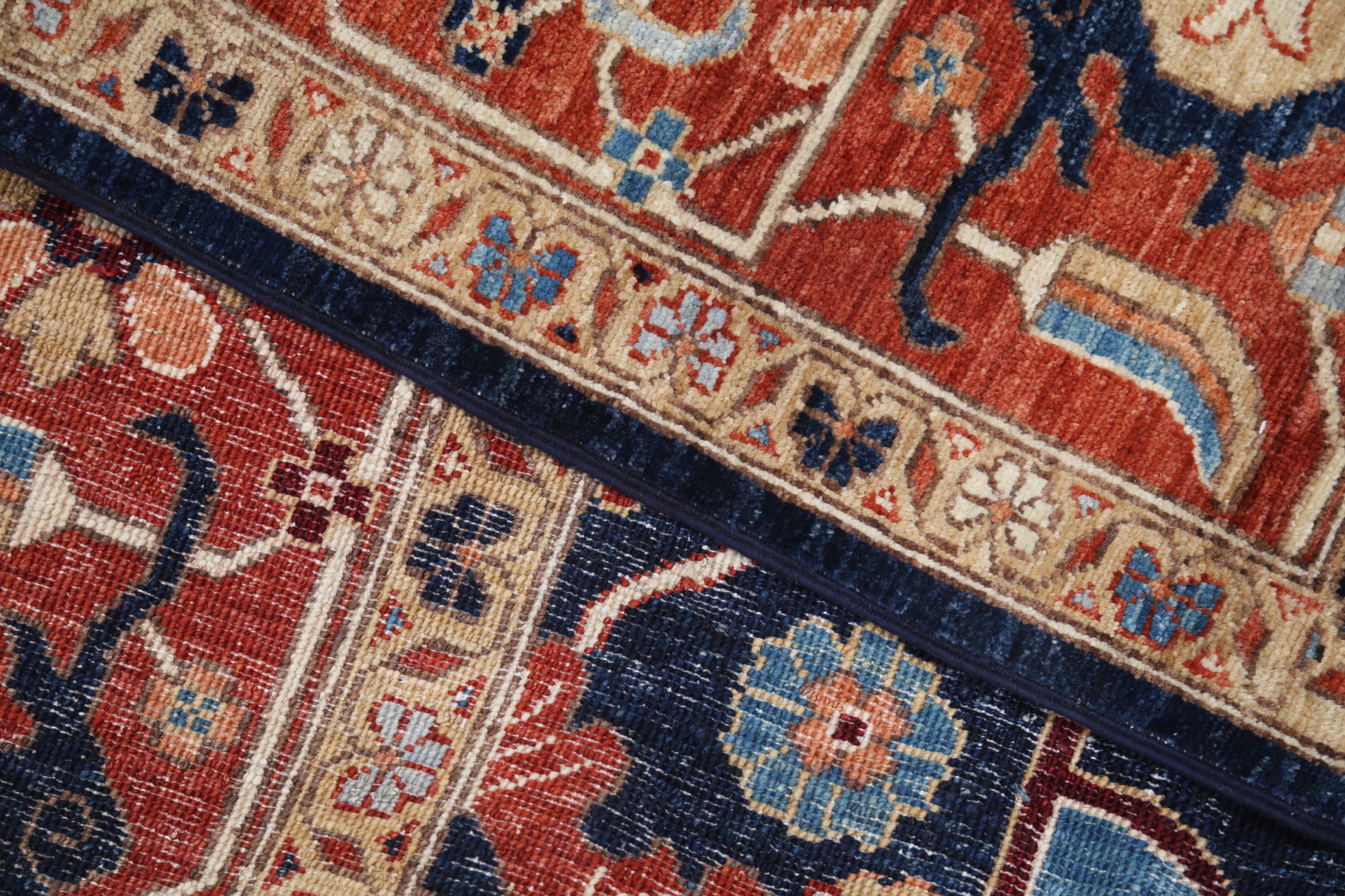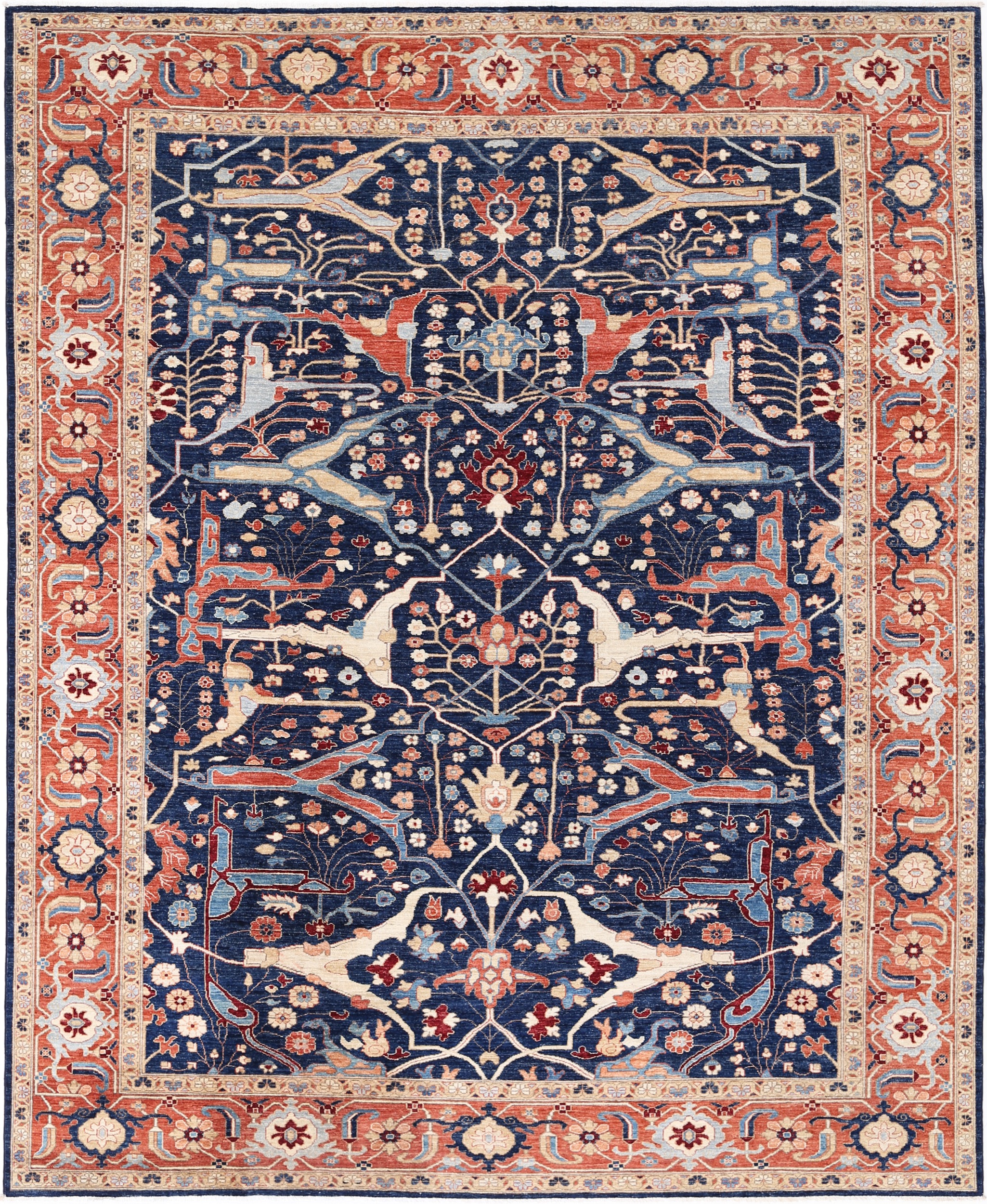 Introducing the Oushak Oriental Rug, a stunning addition to any space. Hand knotted with precision, this 9’4” x 11’6” rug boasts a captivating blue and rust allover design. With an impressive knot count of approximately 156 KPSI, this rug is made from 100% wool cotton for a luxurious feel. The low to medium pile height of 1/4″-1/3″ ensures comfort underfoot. Rest assured, this rug is in excellent condition and has been thoroughly washed. Elevate your decor with this exquisite Oriental rug.