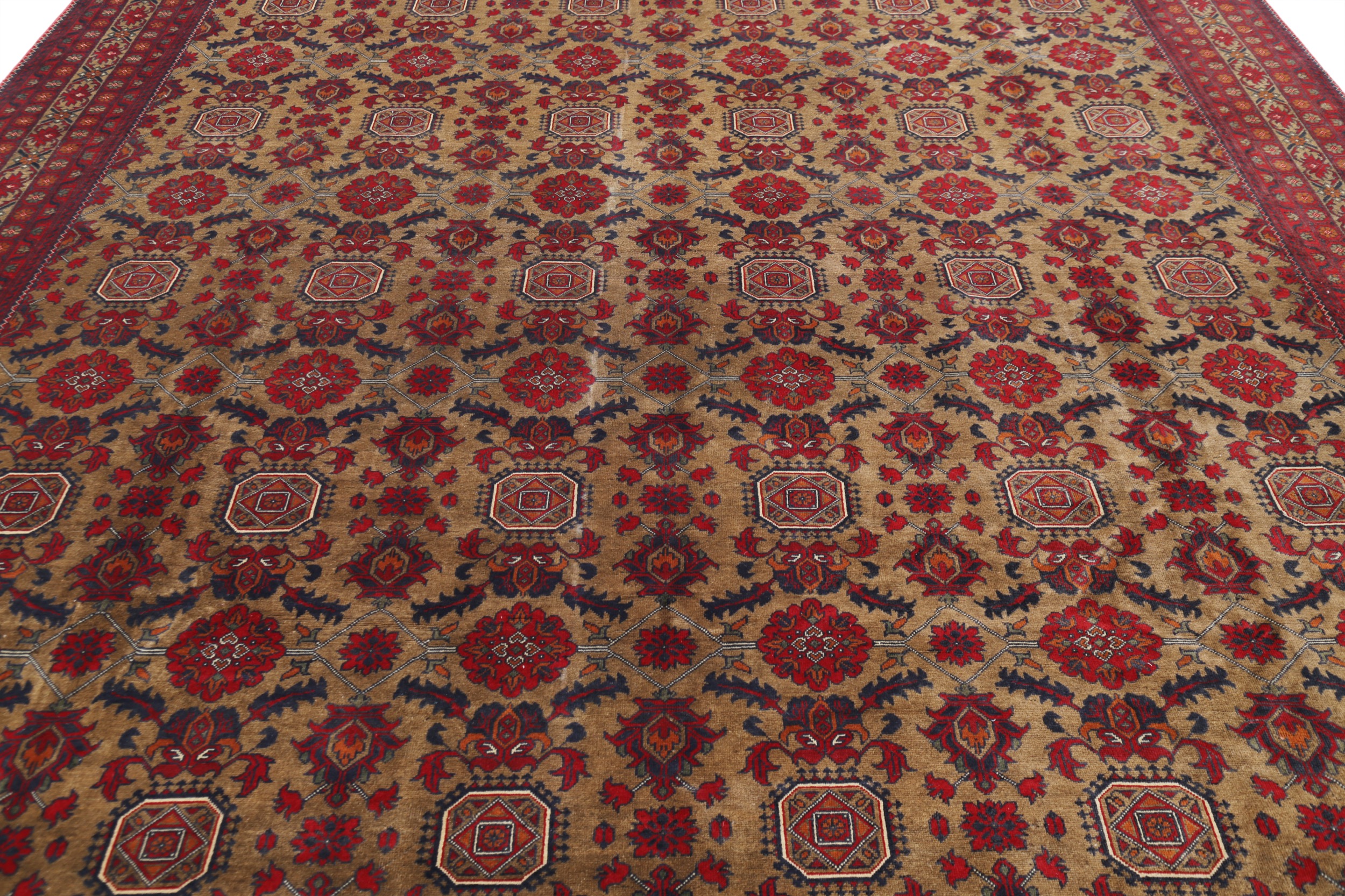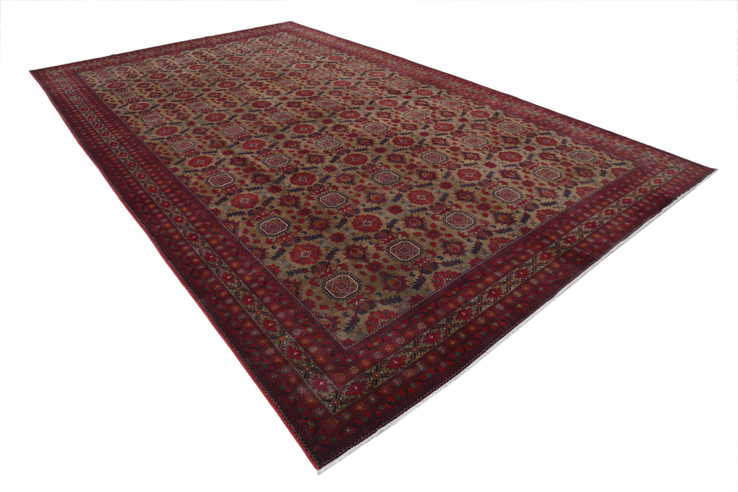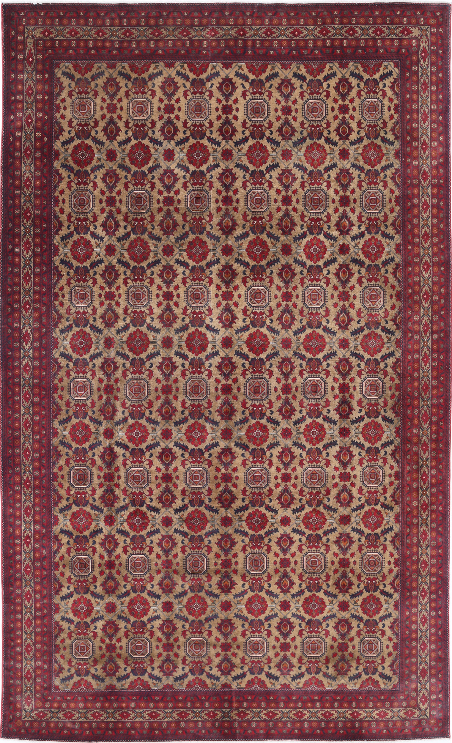 This 9’6″ x 15’7″ Khal Mohammadi rug, hand-knotted in Afghan, features a allover design. It is woven with Approx. 156KPSI, showcasing a field in Red and a Beige border. The rug has a Medium Pile and a 100% Wool pile, and is in excellent condition.