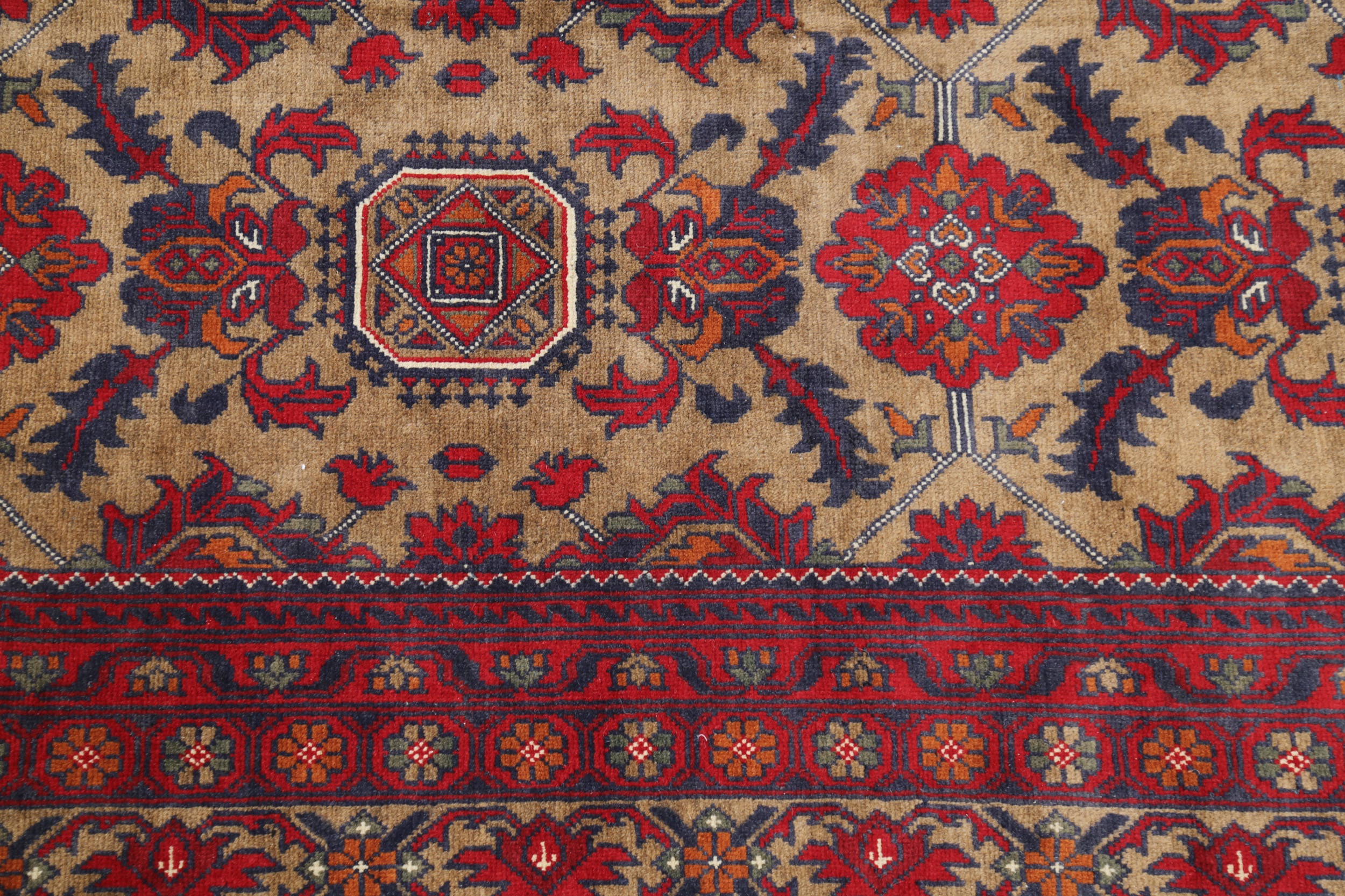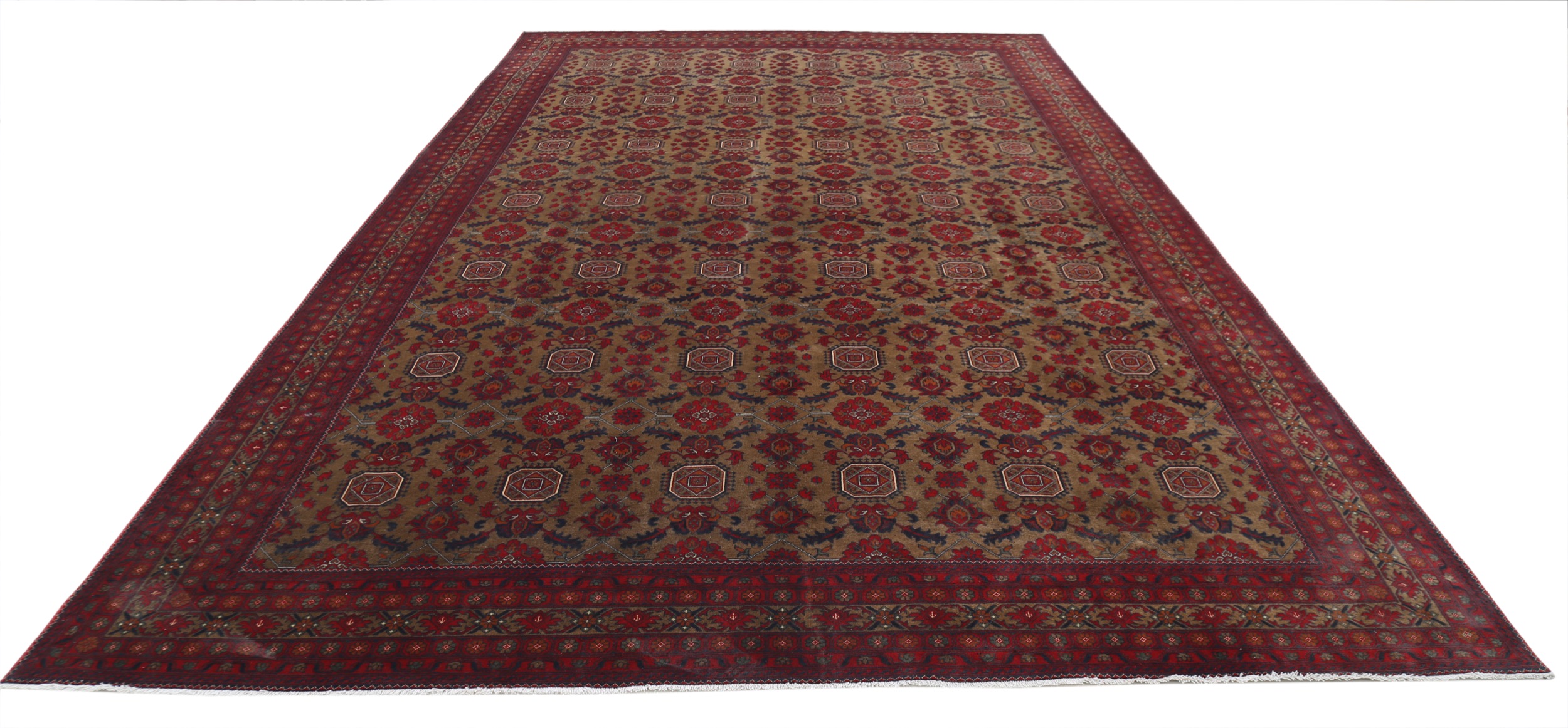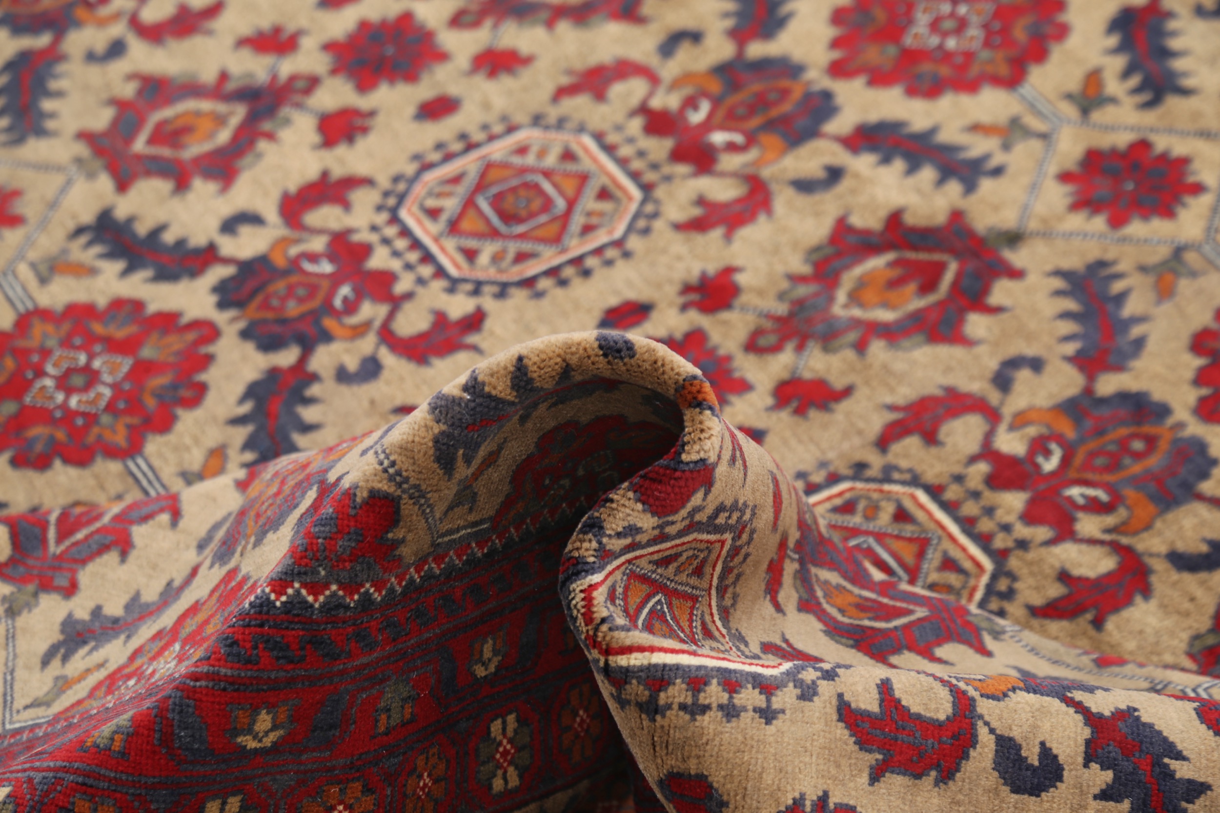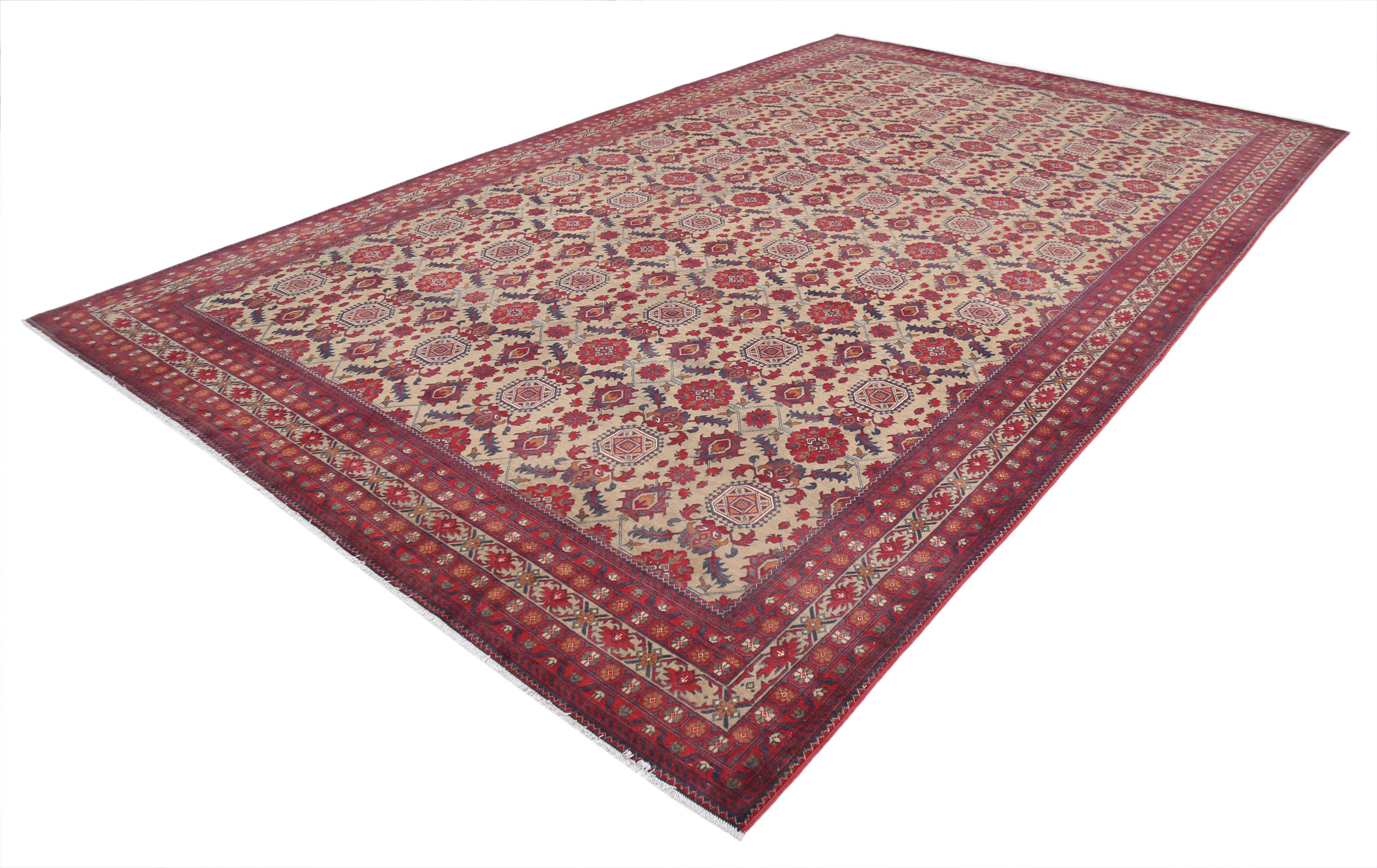 This 9’6″ x 15’7″ Khal Mohammadi rug, hand-knotted in Afghan, features a allover design. It is woven with Approx. 156KPSI, showcasing a field in Red and a Beige border. The rug has a Medium Pile and a 100% Wool pile, and is in excellent condition.